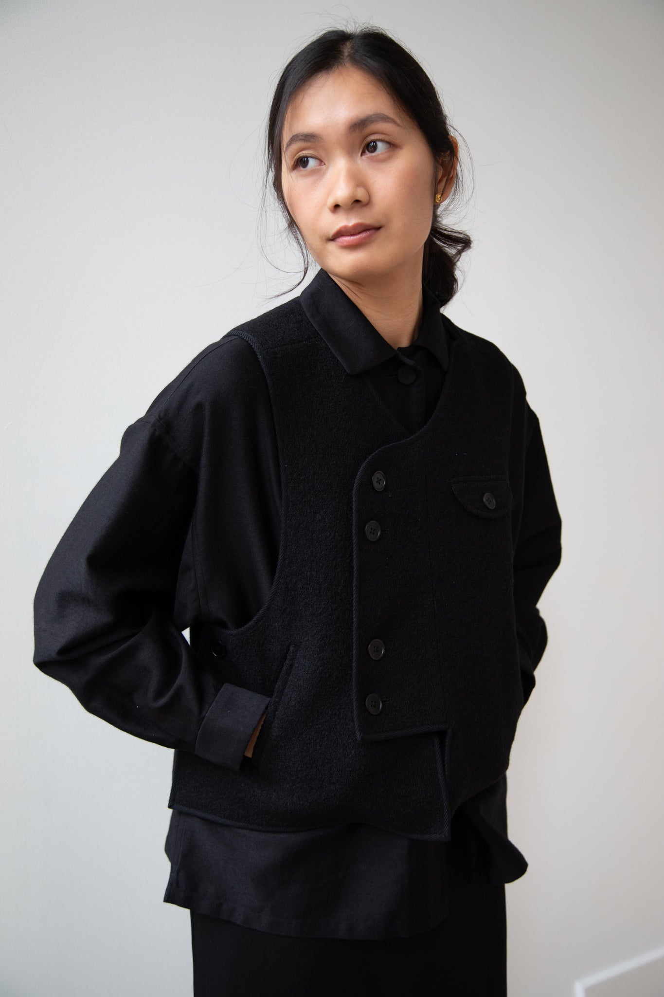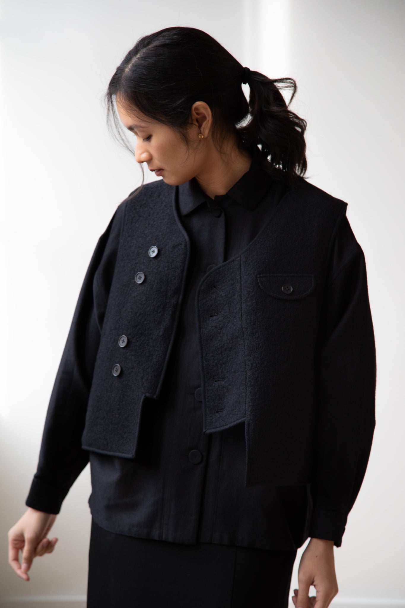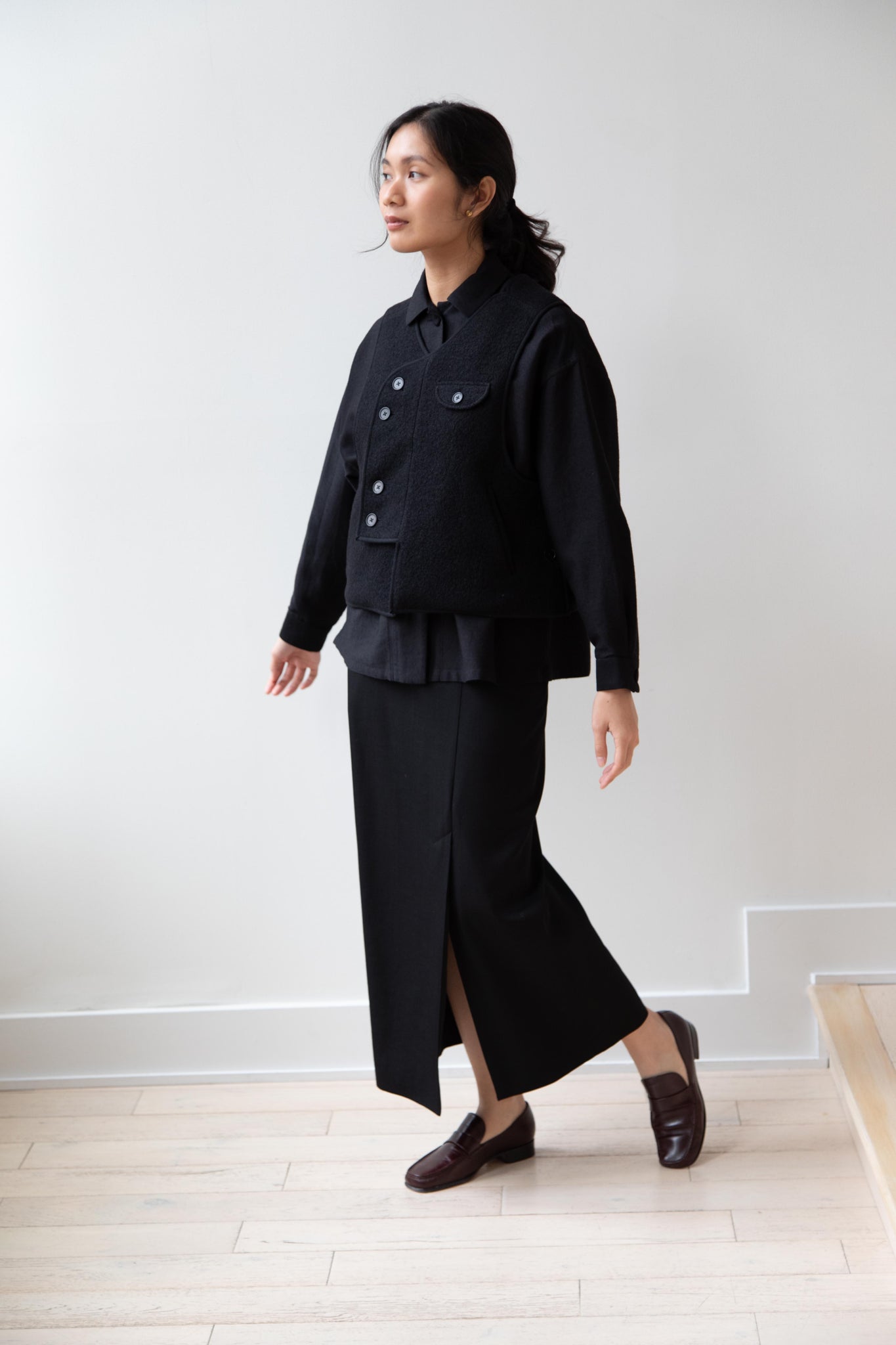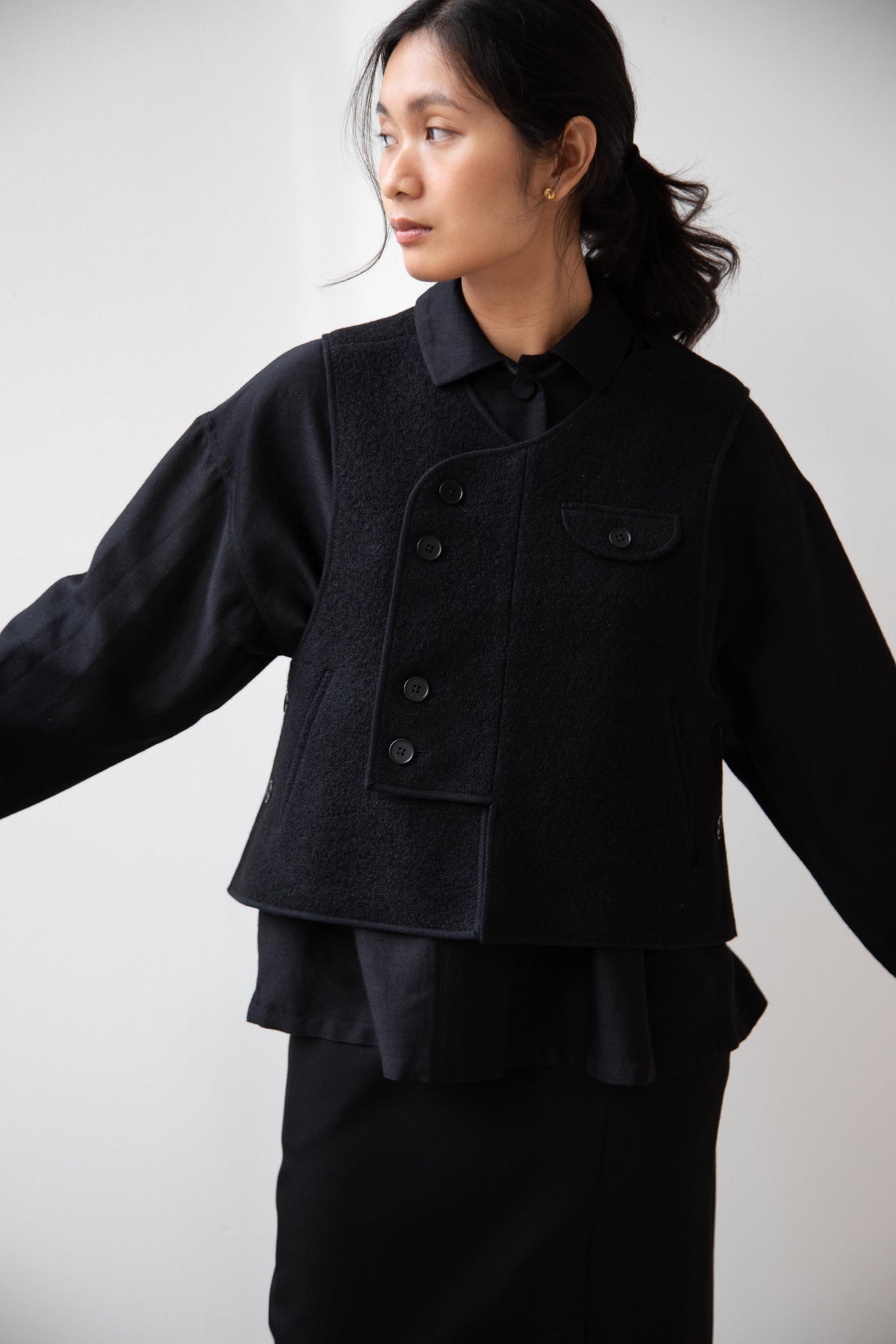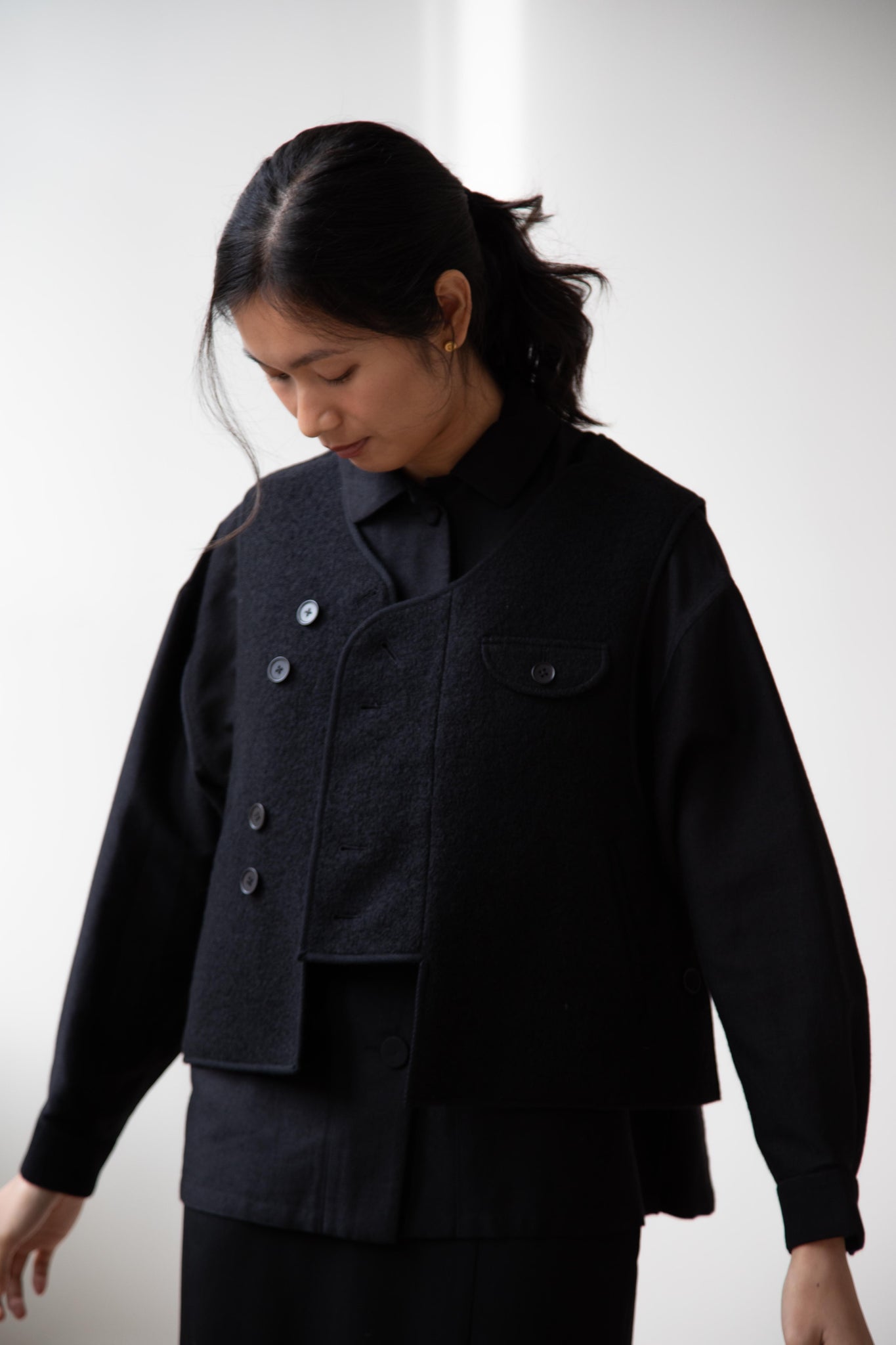 This vest has all the best details, nothing has been overlooked. There is an asymmetrical button closure and many pockets. There are small notches around the bound hem seam, one of many thoughtful features on this piece. Made from a boiled wool and lined in cotton, it's sure to be warm throughout the season.