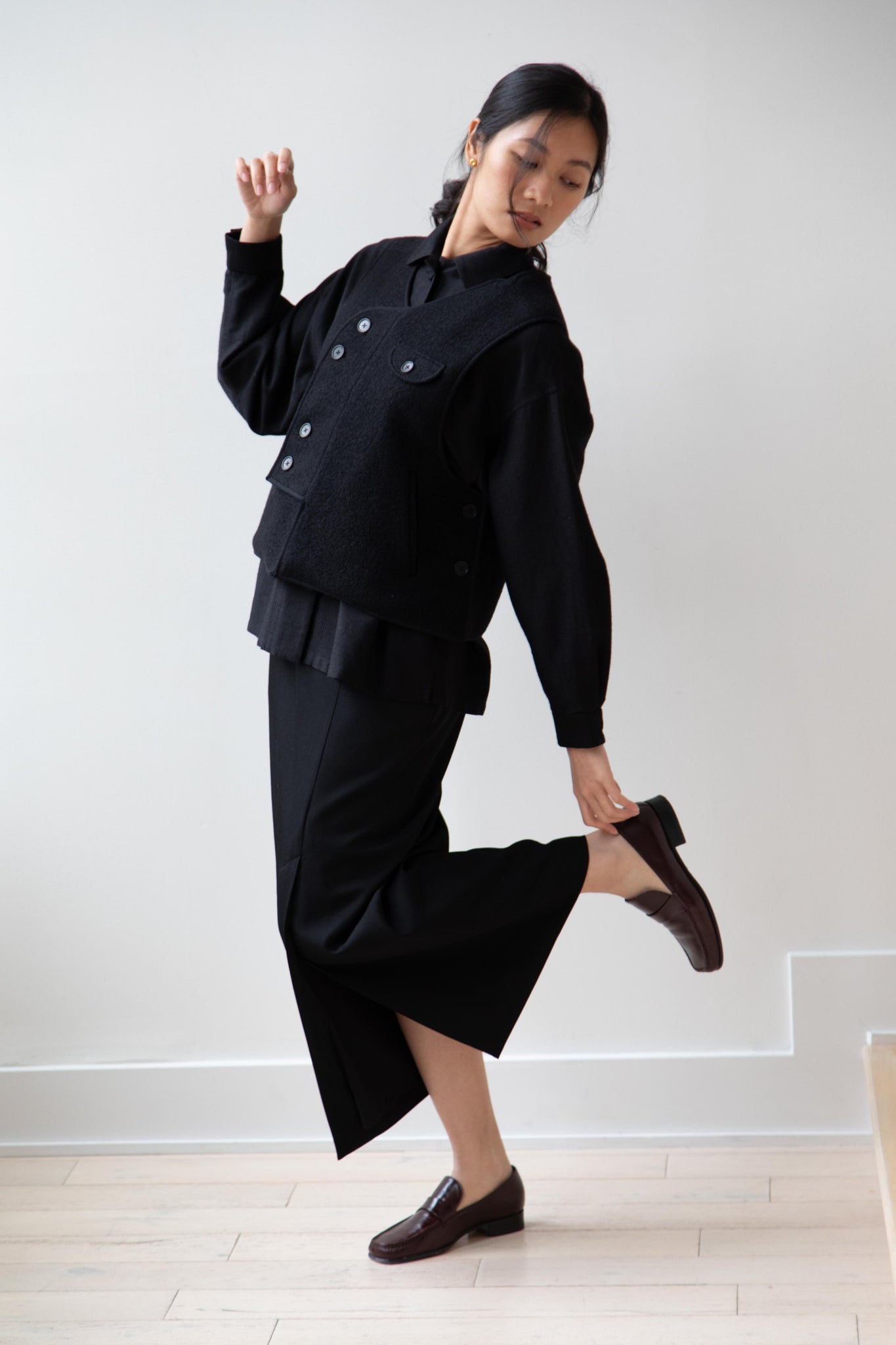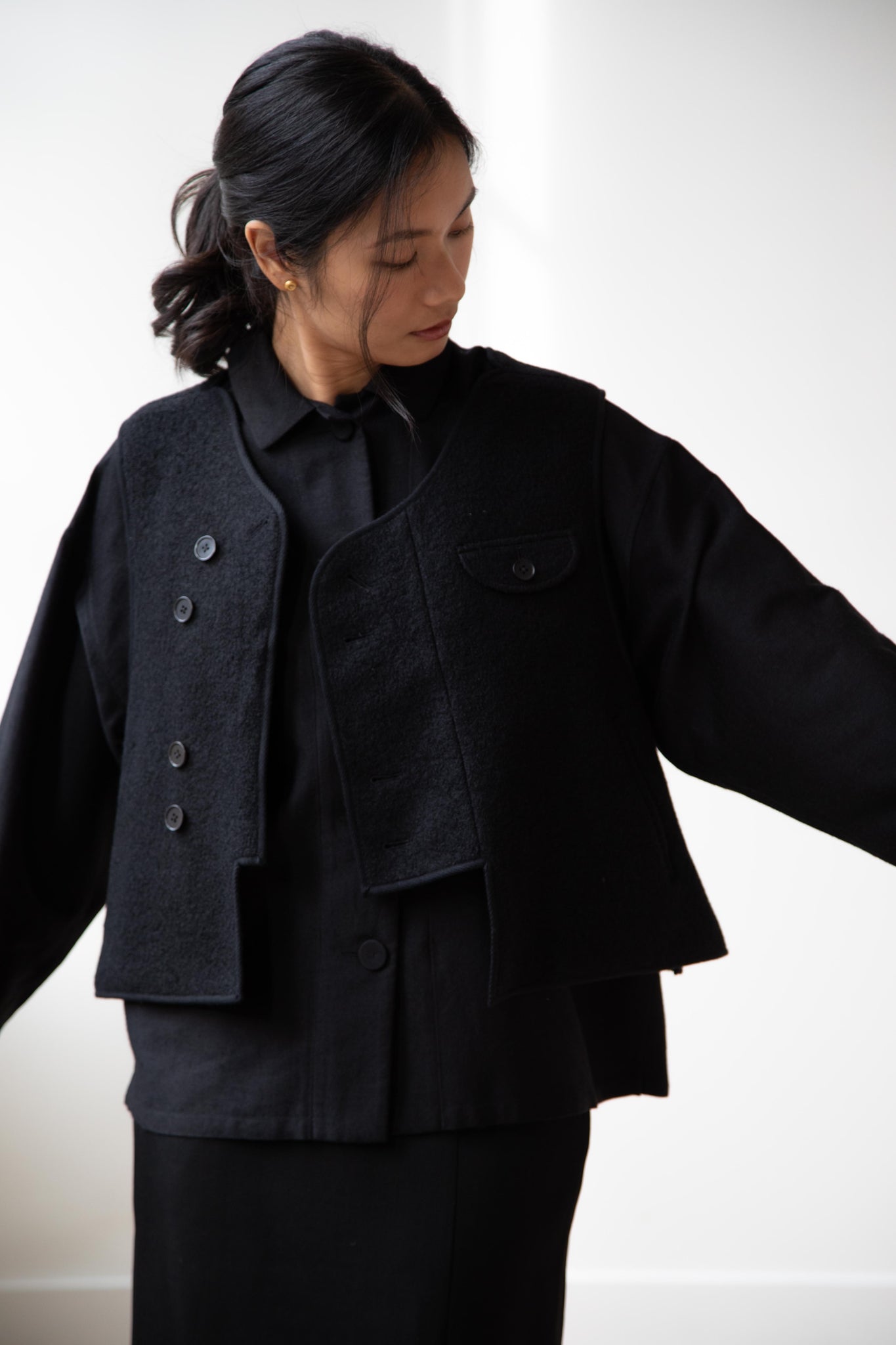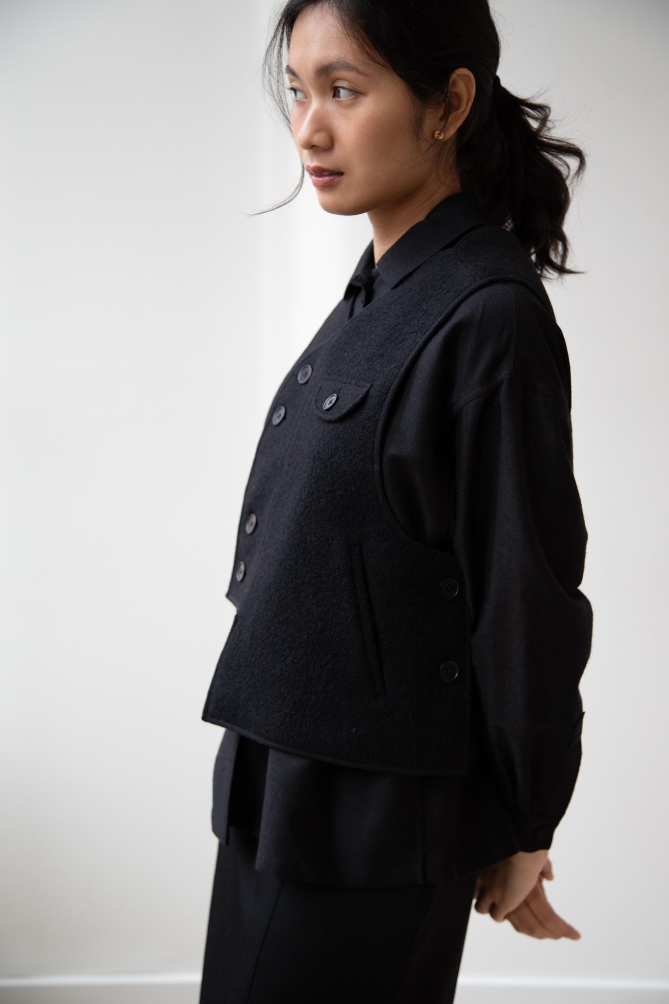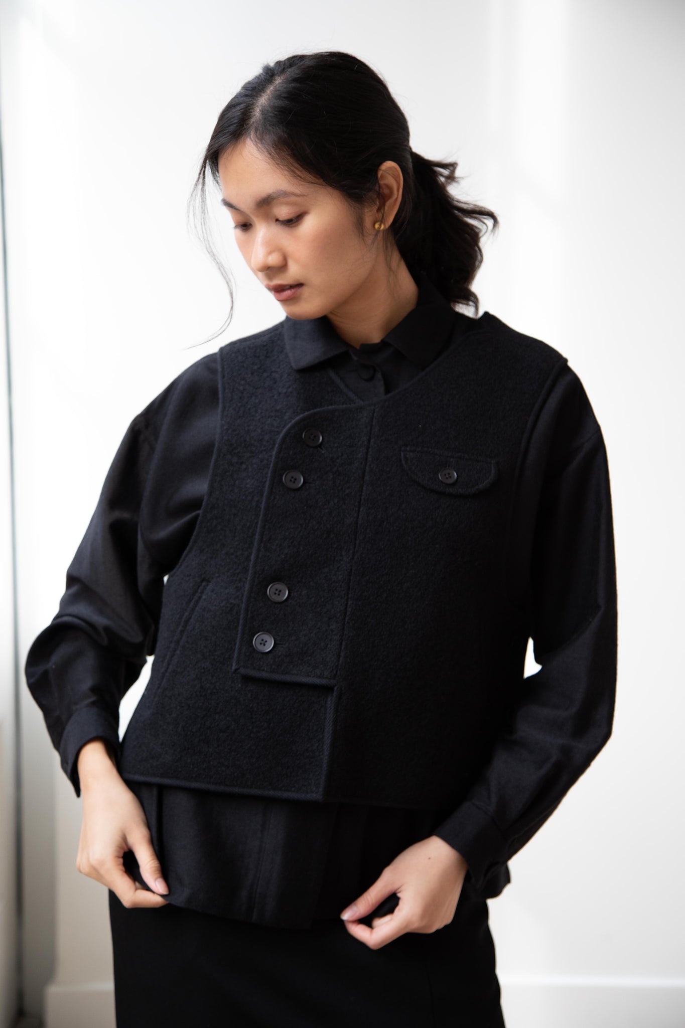 This vest has all the best details, nothing has been overlooked. There is an asymmetrical button closure and many pockets. There are small notches around the bound hem seam, one of many thoughtful features on this piece. Made from a boiled wool and lined in cotton, it's sure to be warm throughout the season.