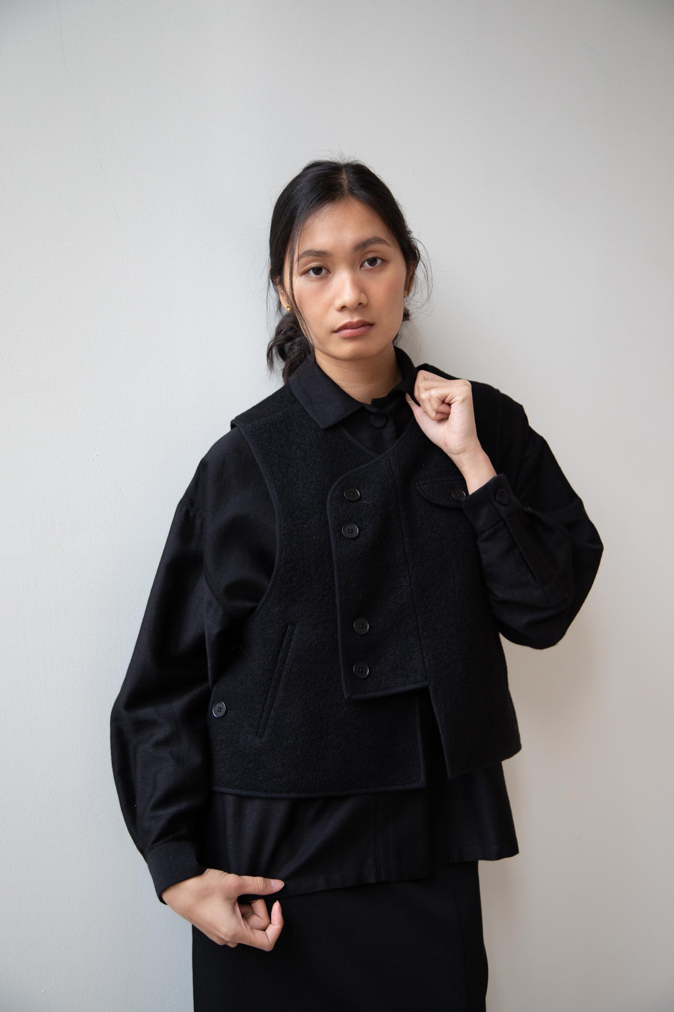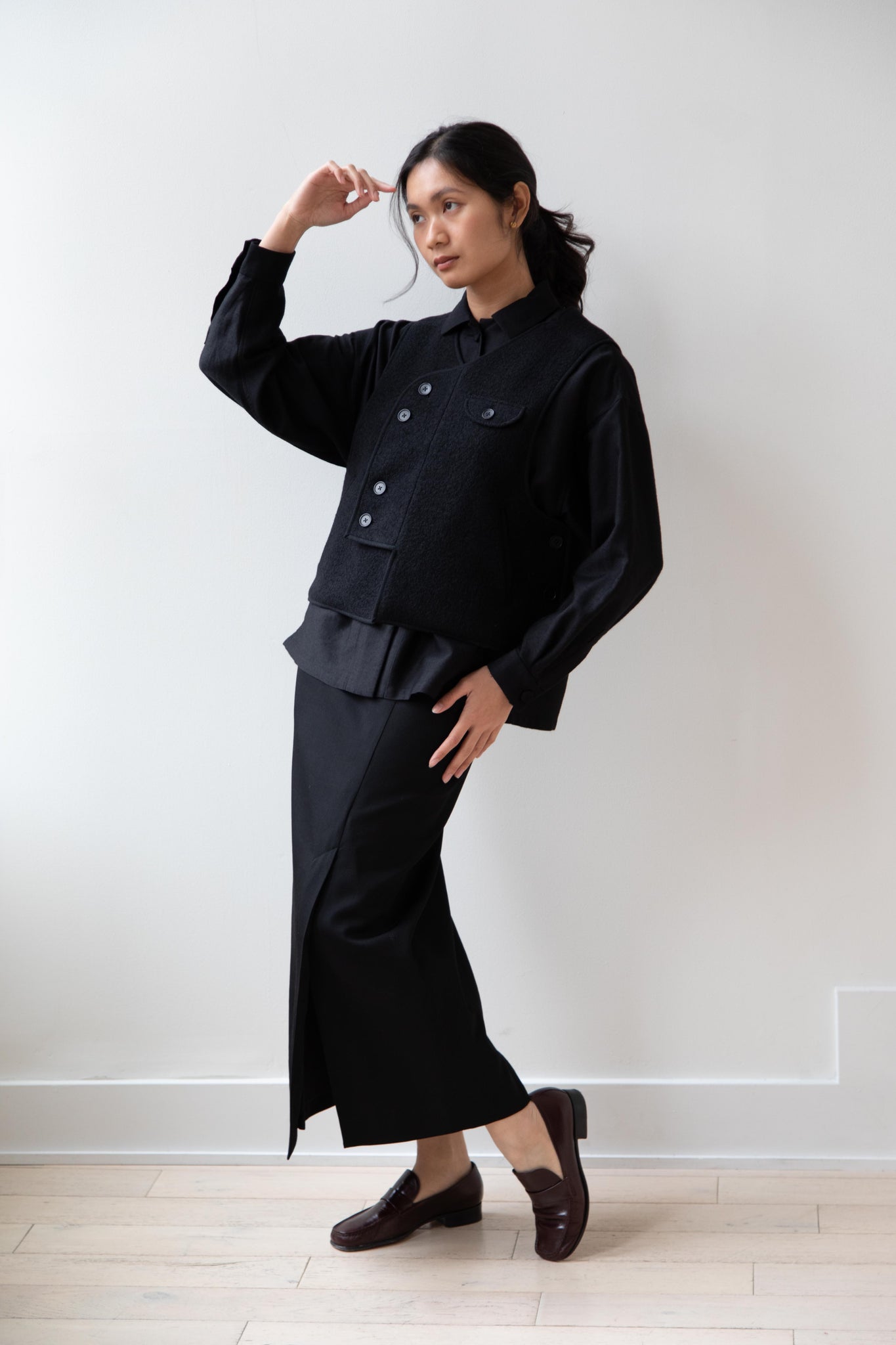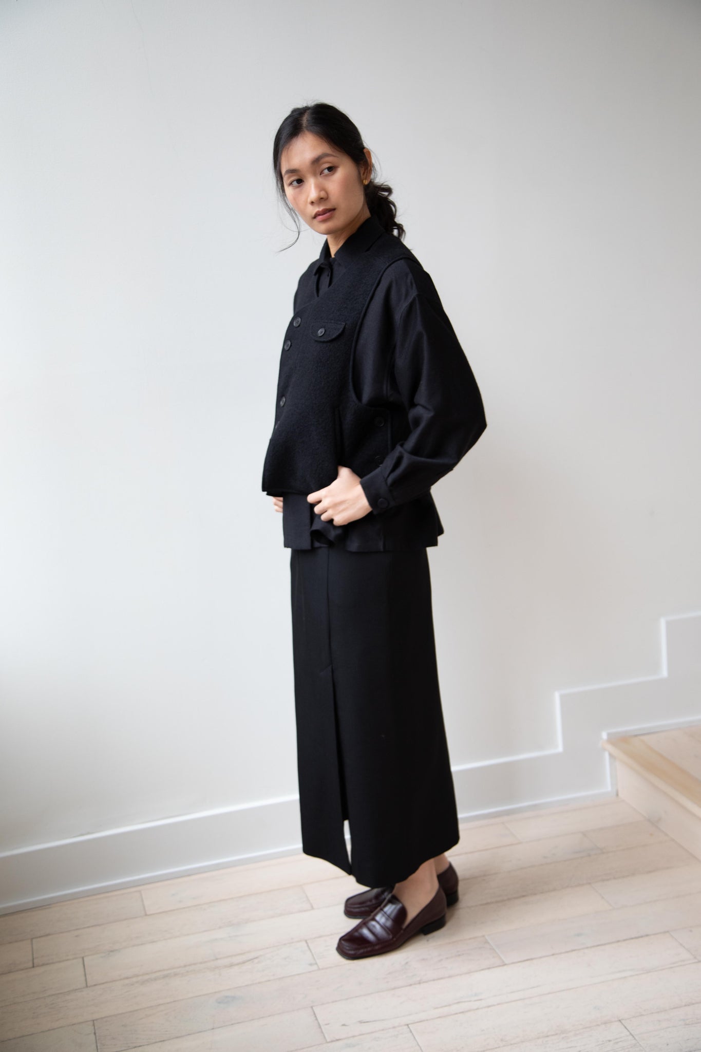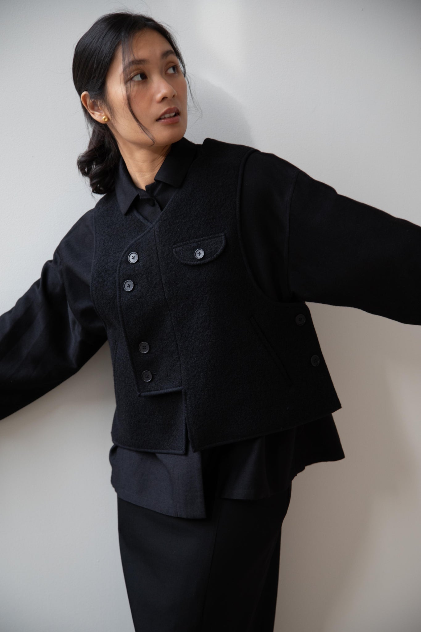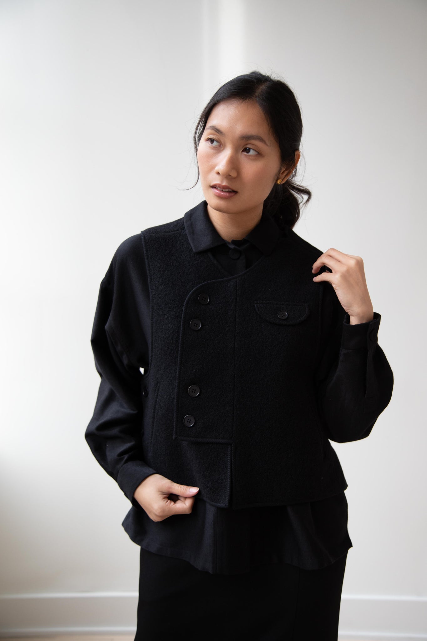 This vest has all the best details, nothing has been overlooked. There is an asymmetrical button closure and many pockets. There are small notches around the bound hem seam, one of many thoughtful features on this piece. Made from a boiled wool and lined in cotton, it's sure to be warm throughout the season.