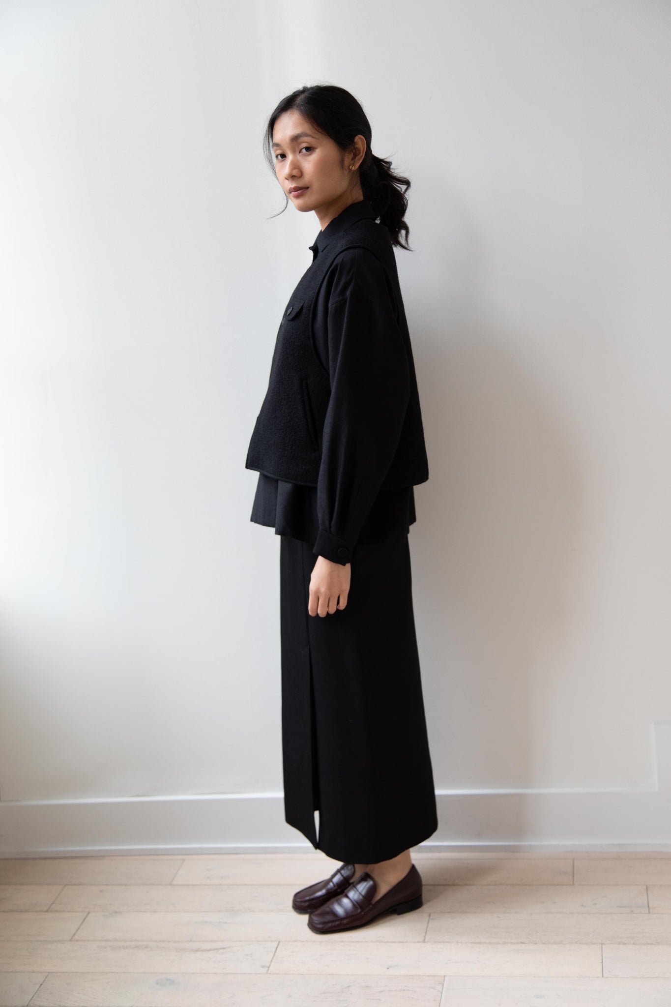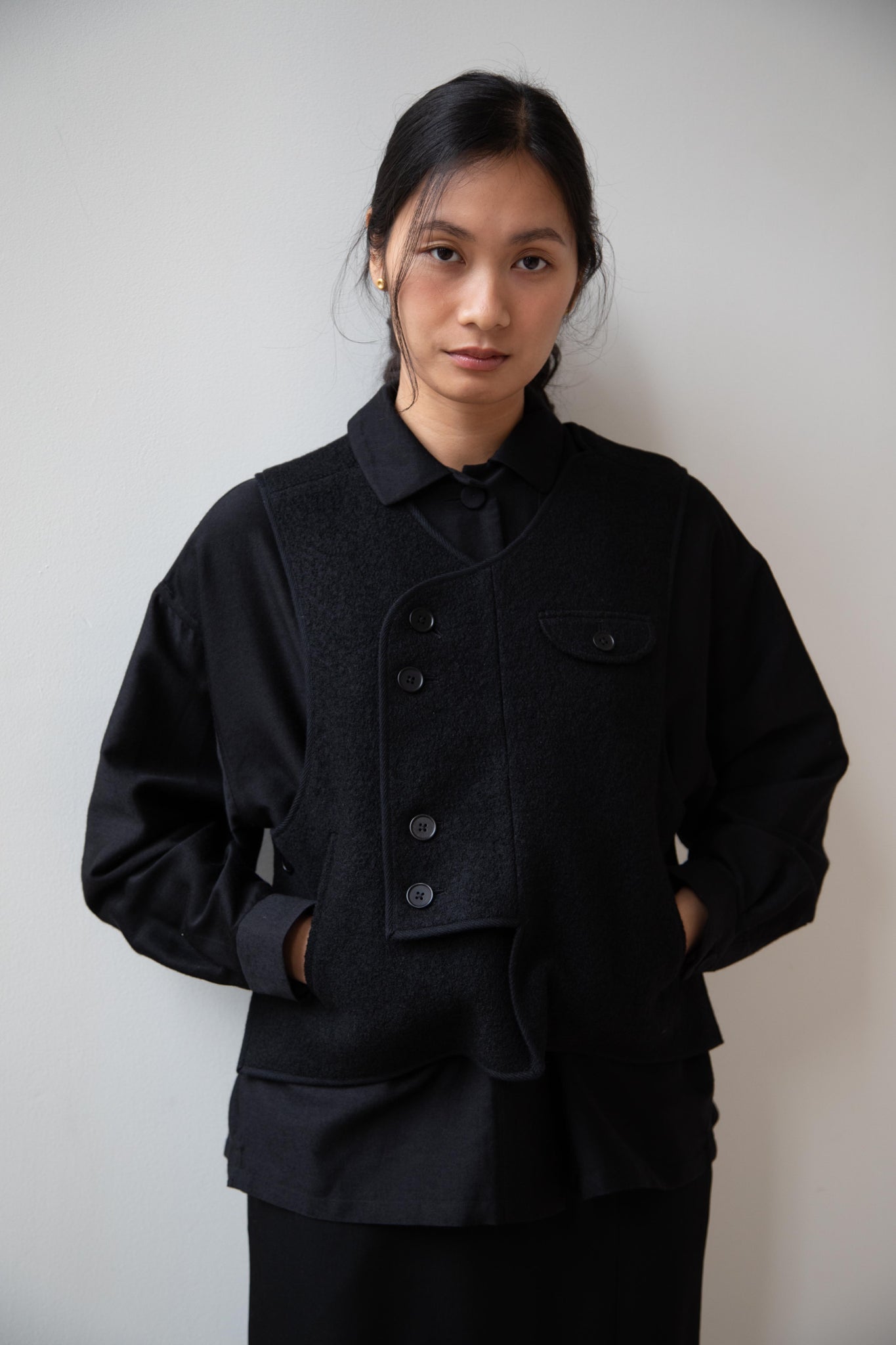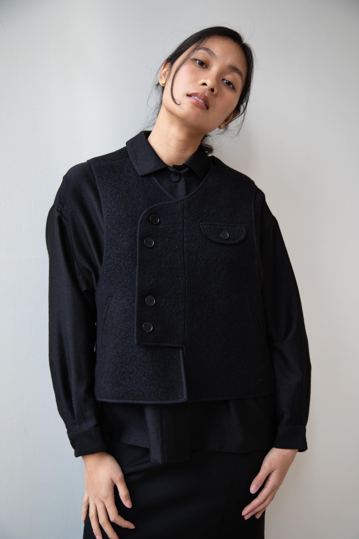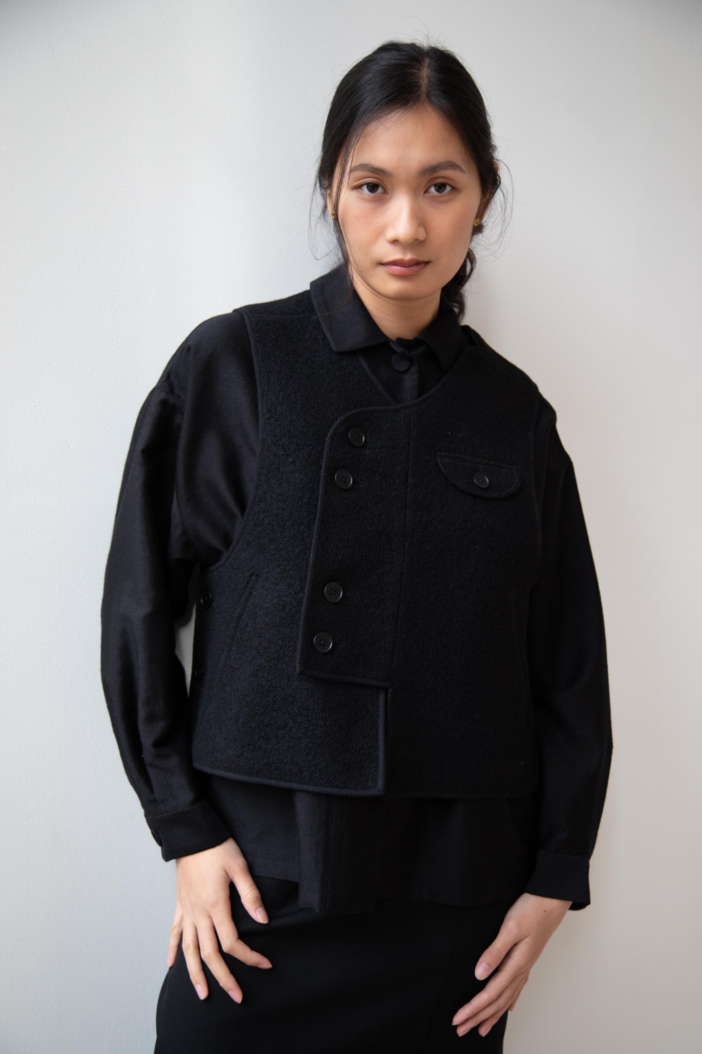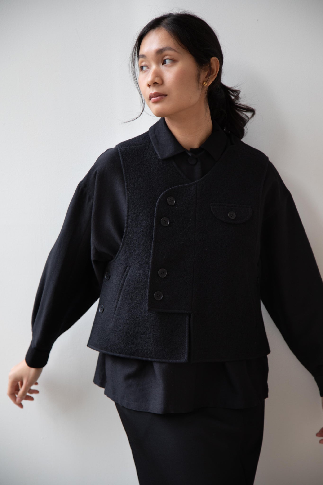 This vest has all the best details, nothing has been overlooked. There is an asymmetrical button closure and many pockets. There are small notches around the bound hem seam, one of many thoughtful features on this piece. Made from a boiled wool and lined in cotton, it's sure to be warm throughout the season.