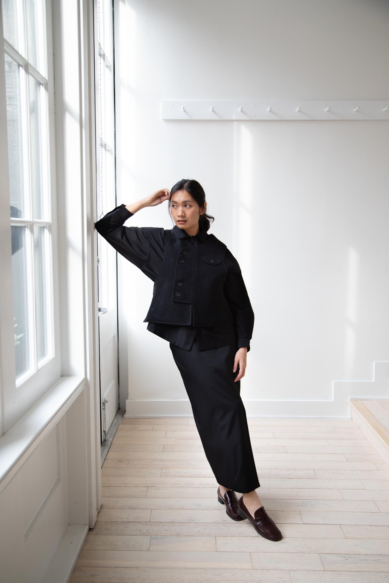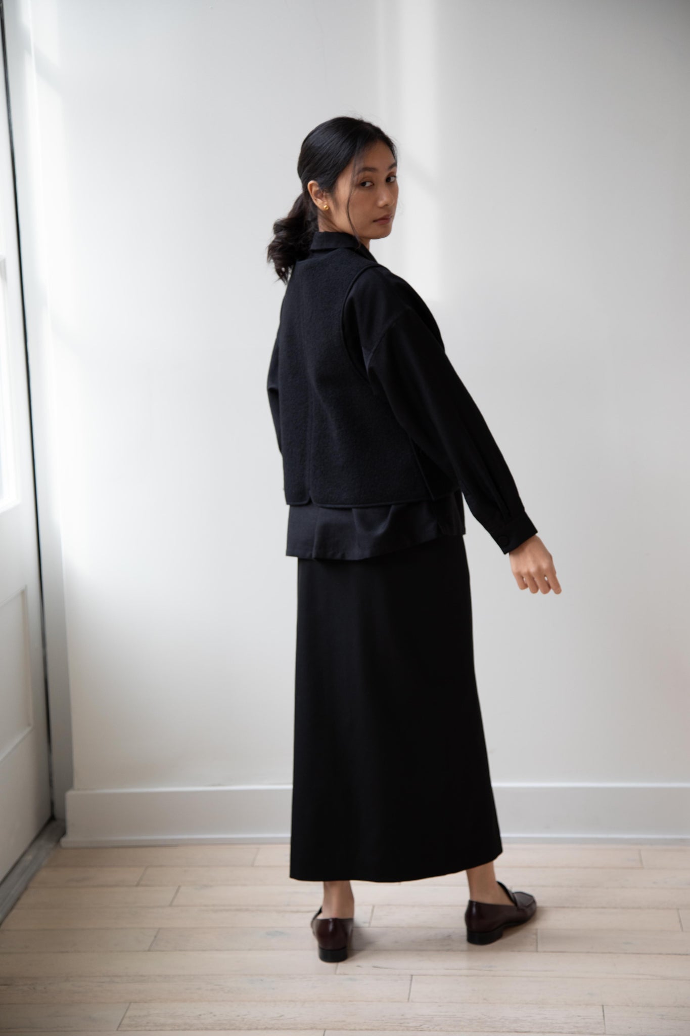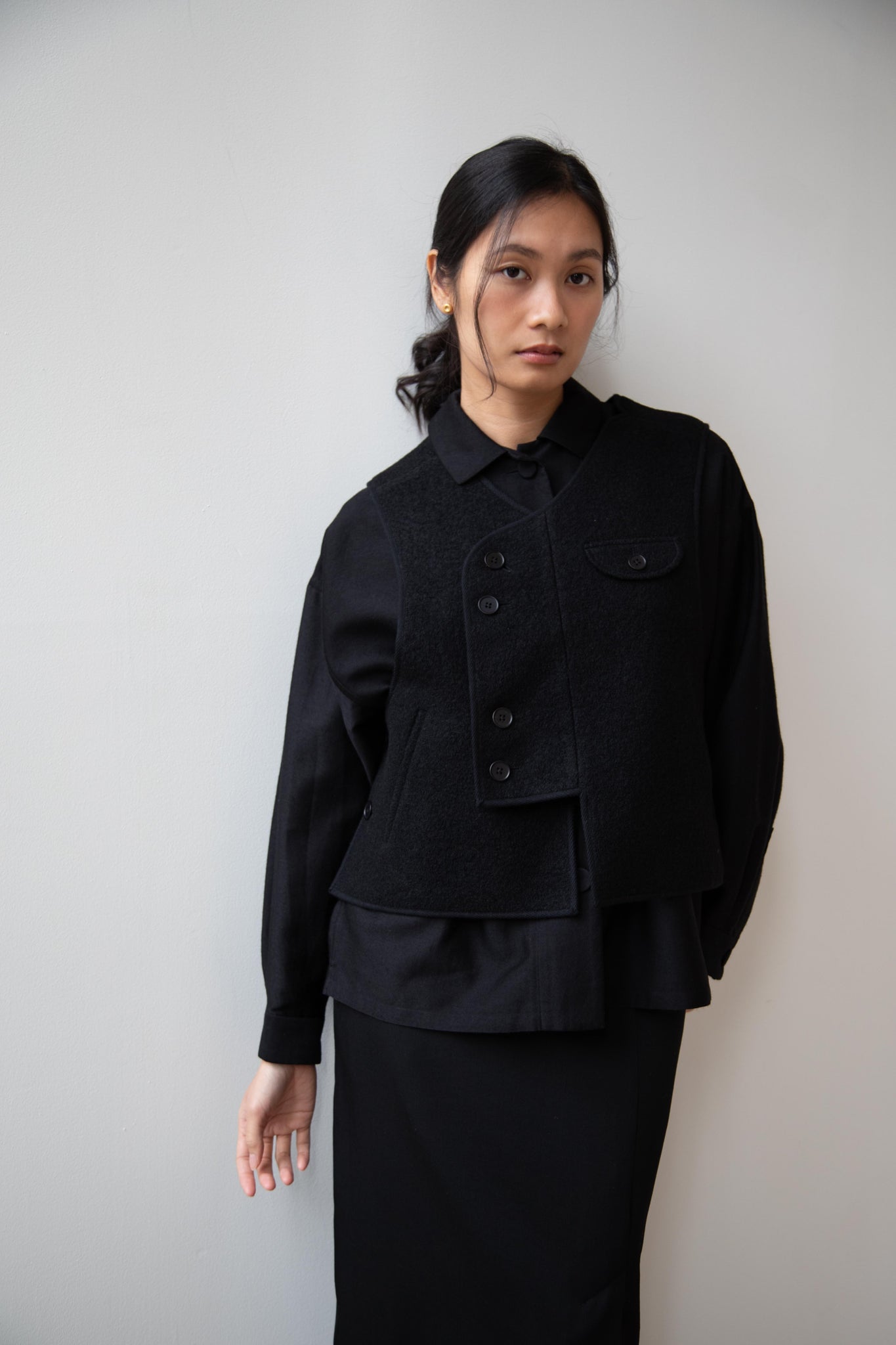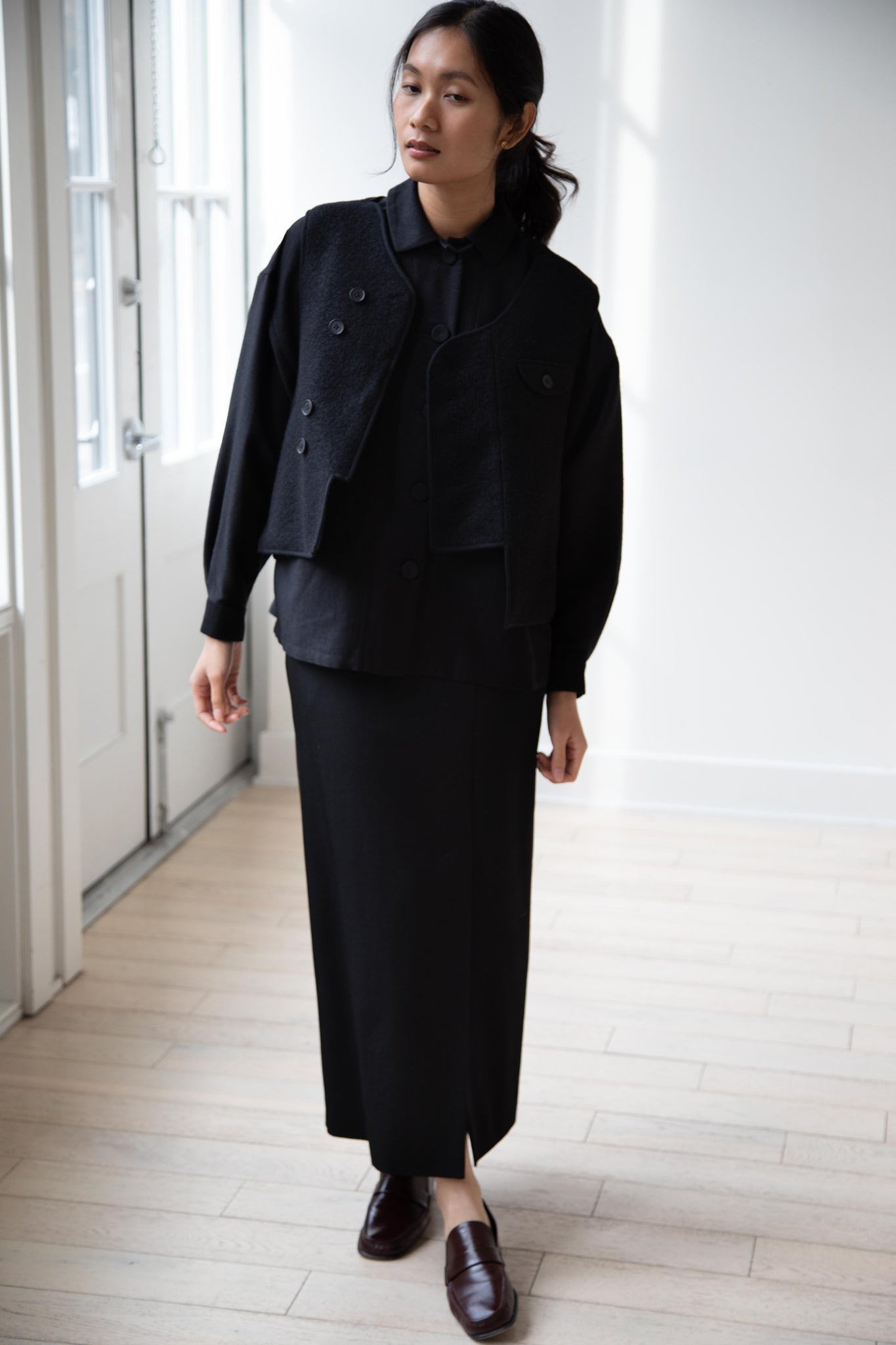 This vest has all the best details, nothing has been overlooked. There is an asymmetrical button closure and many pockets. There are small notches around the bound hem seam, one of many thoughtful features on this piece. Made from a boiled wool and lined in cotton, it's sure to be warm throughout the season.