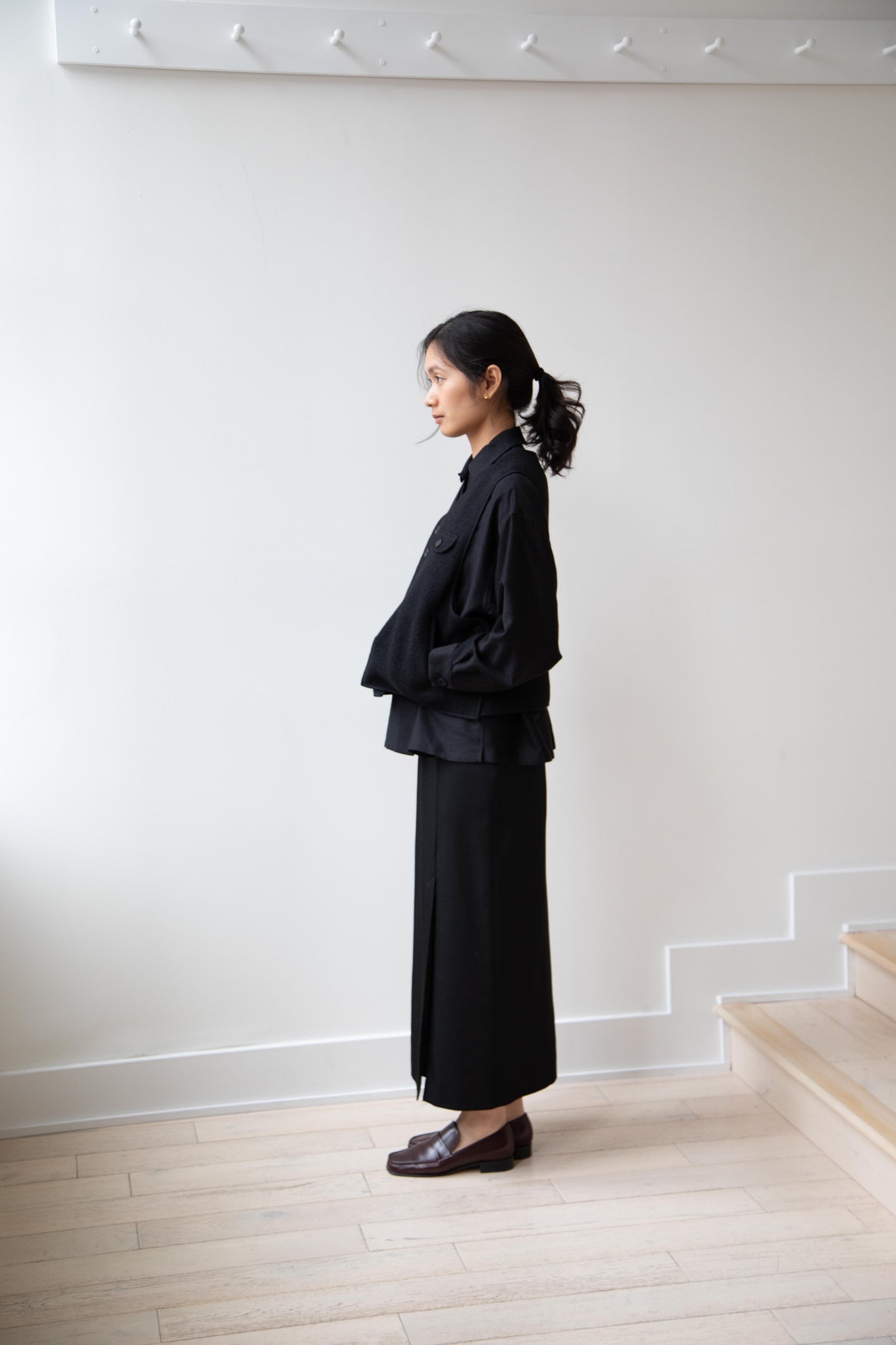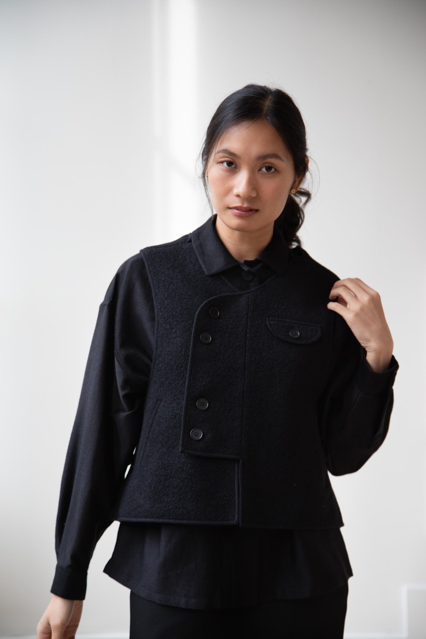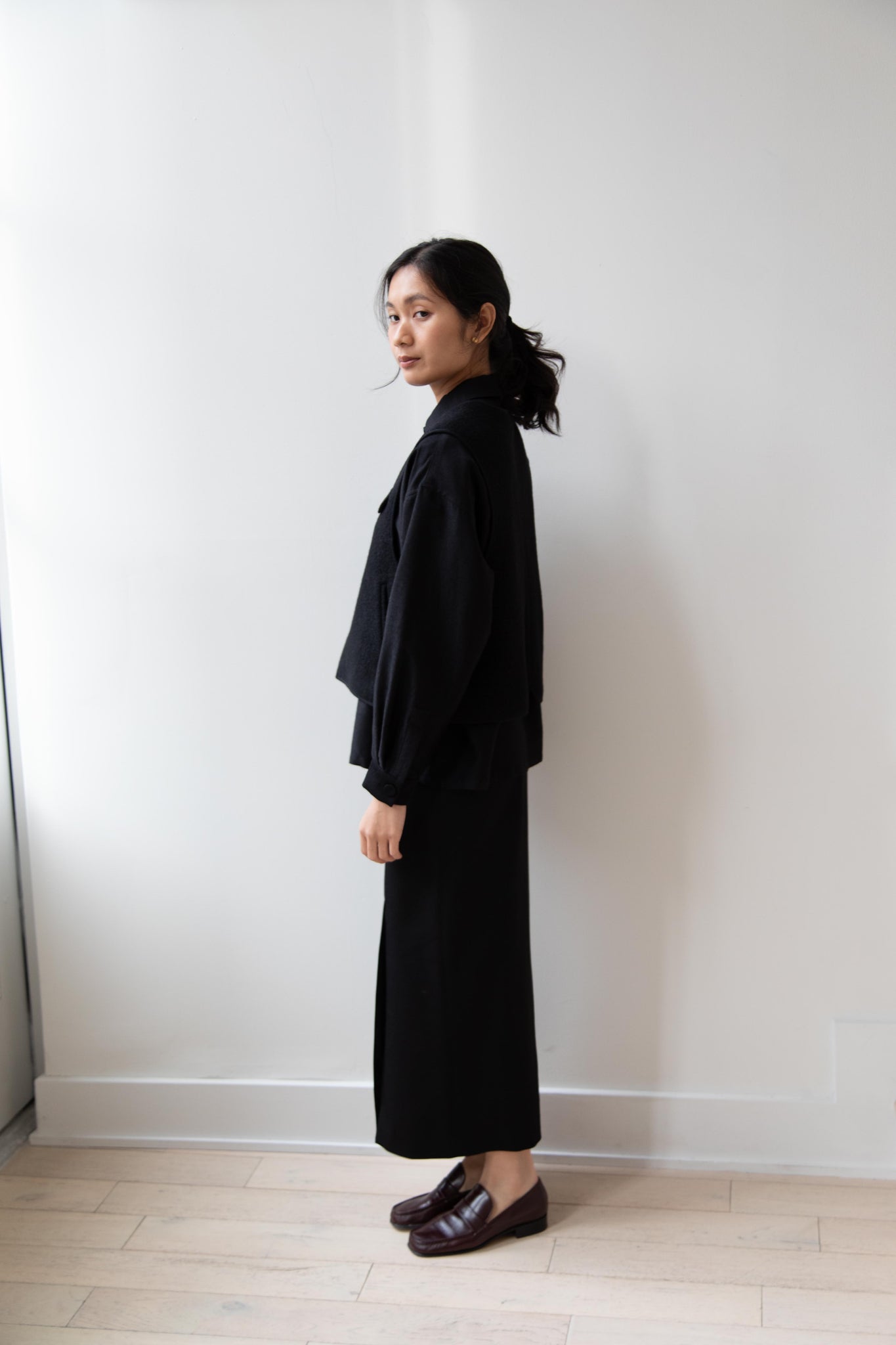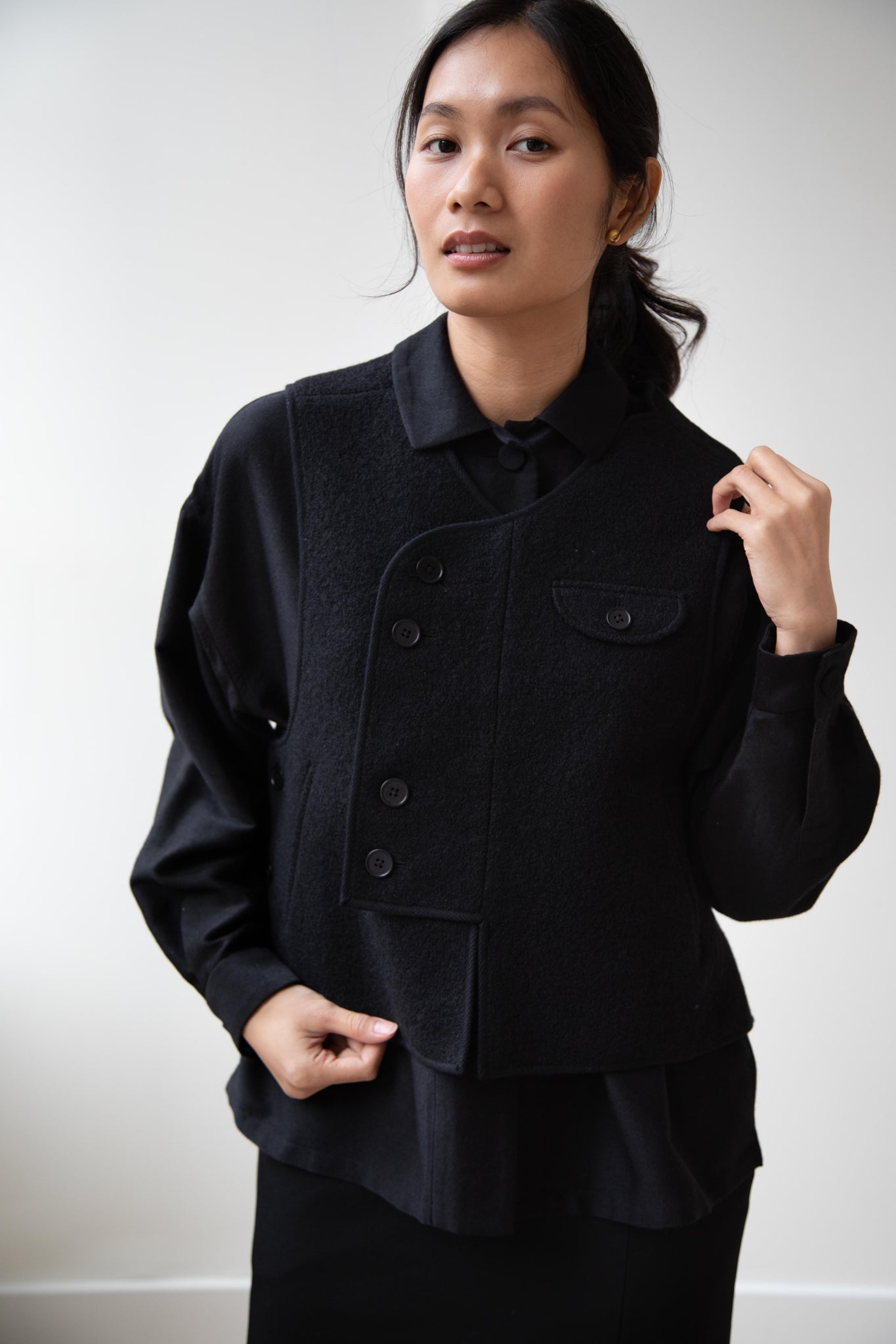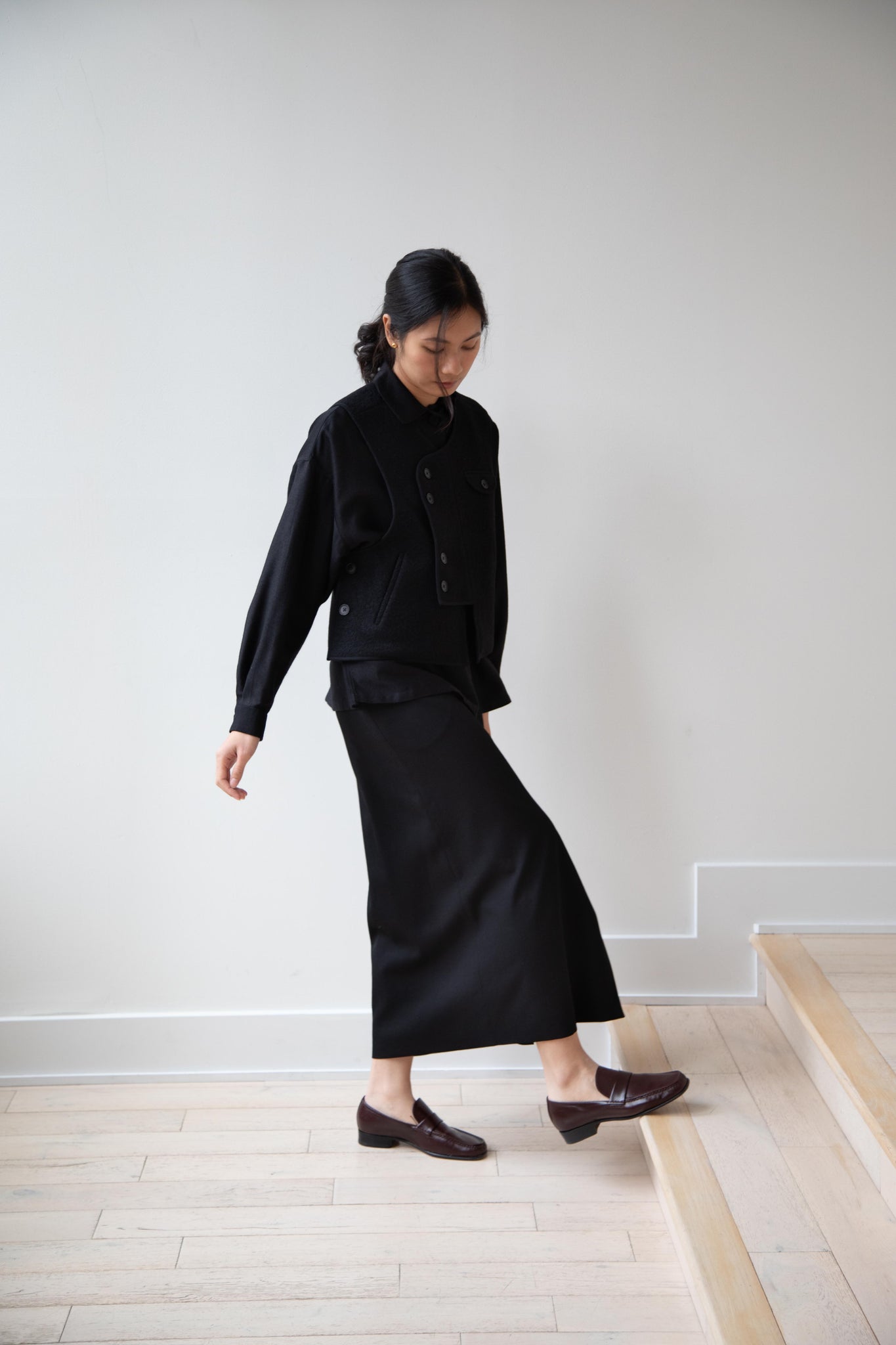 This vest has all the best details, nothing has been overlooked. There is an asymmetrical button closure and many pockets. There are small notches around the bound hem seam, one of many thoughtful features on this piece. Made from a boiled wool and lined in cotton, it's sure to be warm throughout the season.