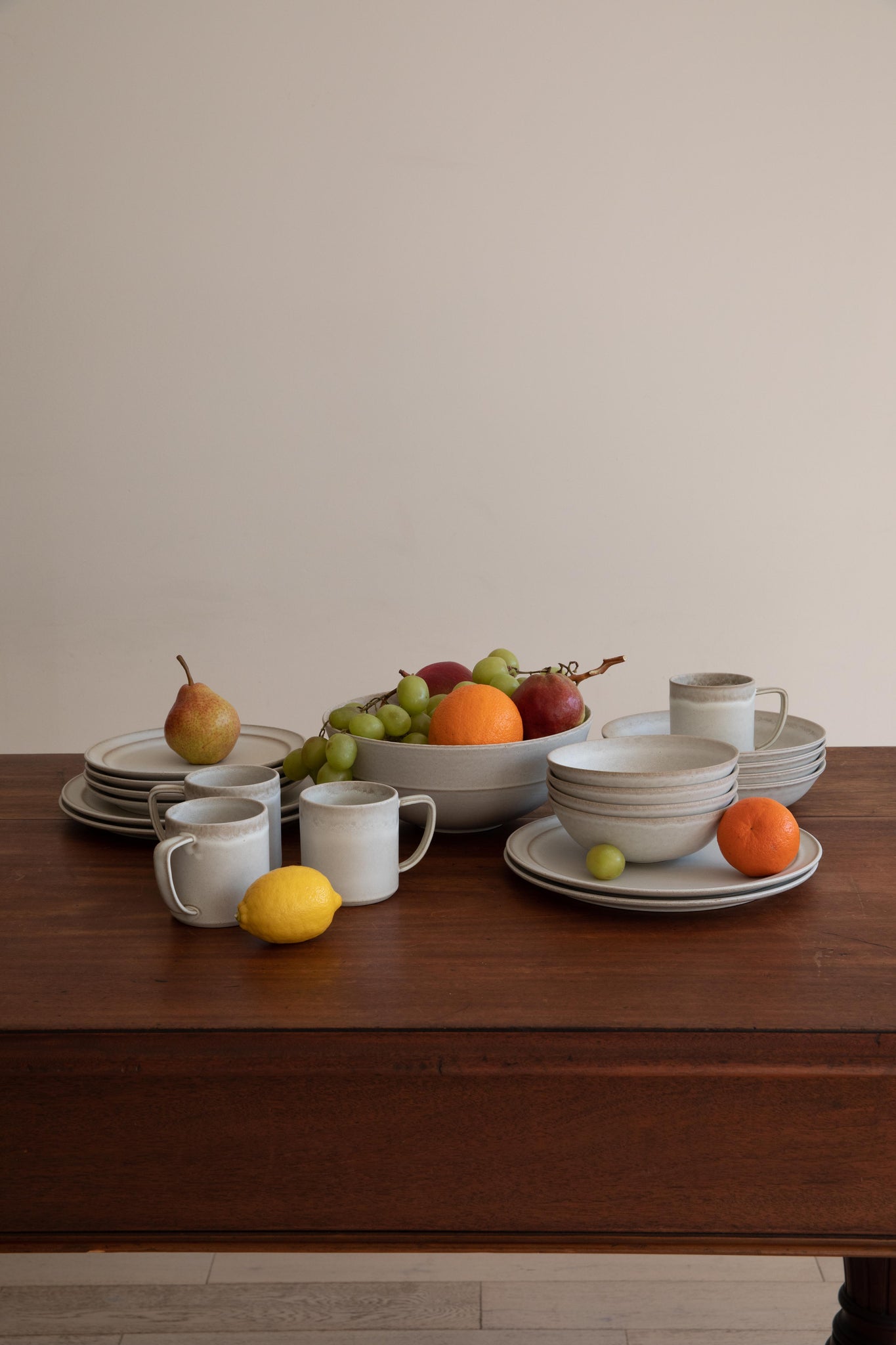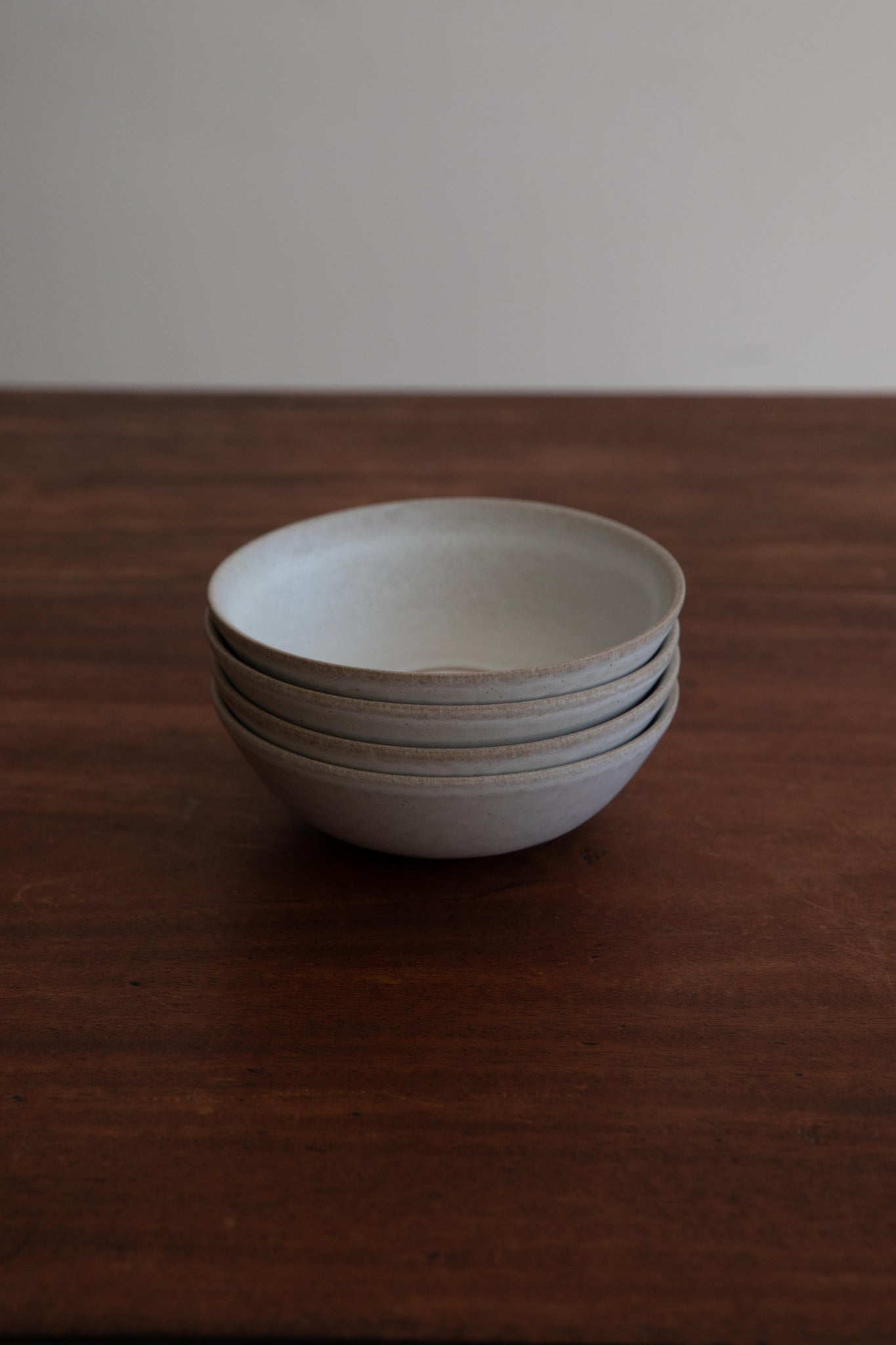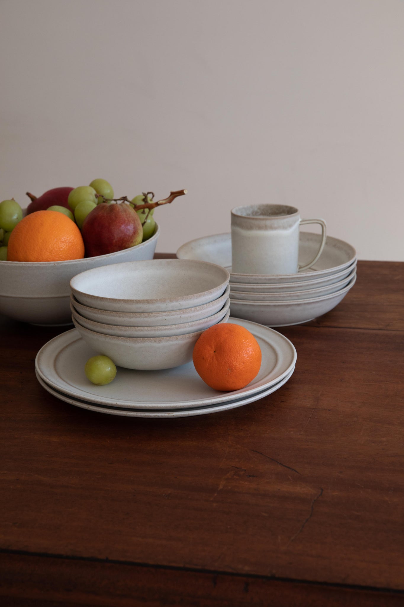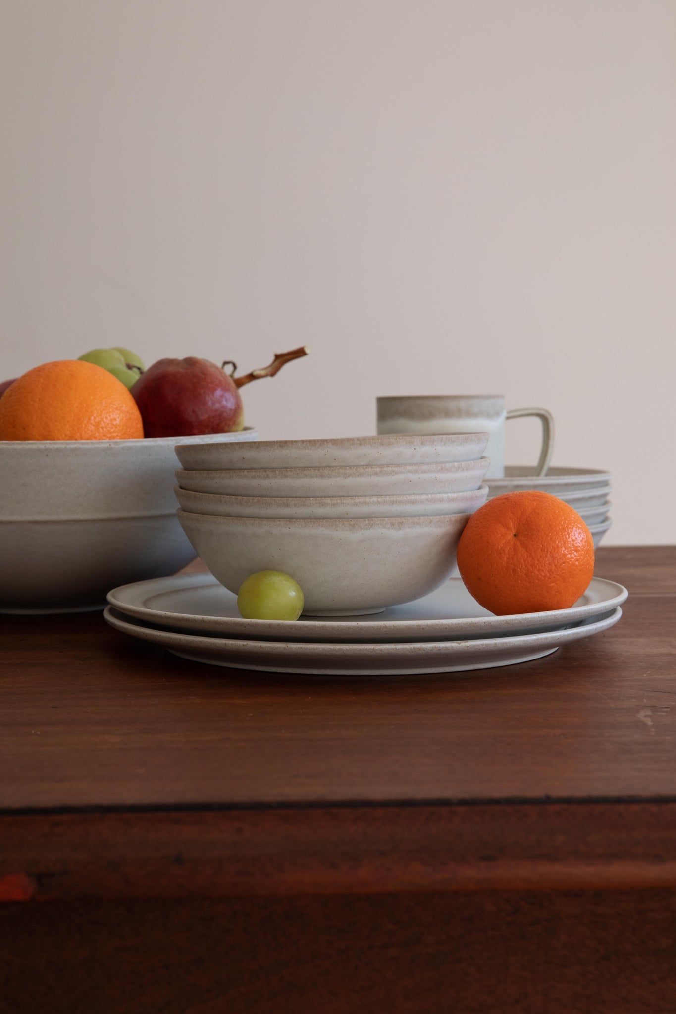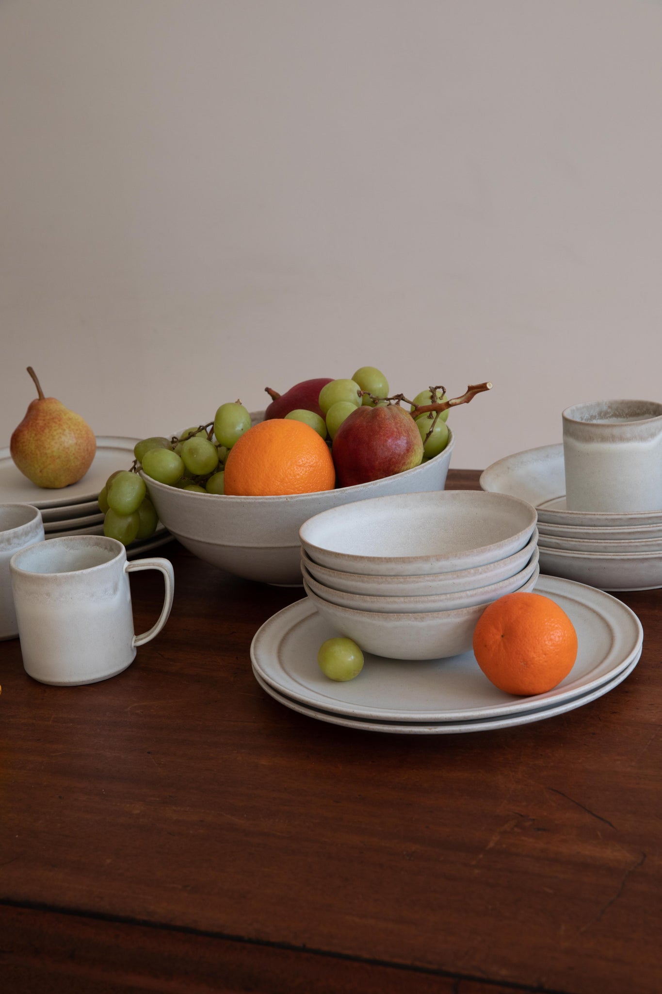 These beautiful bowls have the most stunning glaze. Made of a beige speckled ceramic, the glaze on top is a pearly off white, which is thinner in some areas around the rim which give a nice depth and texture showing the clay underneath. They work perfectly in a set, or if you need a special extra serving dish, these would work wonderfully.