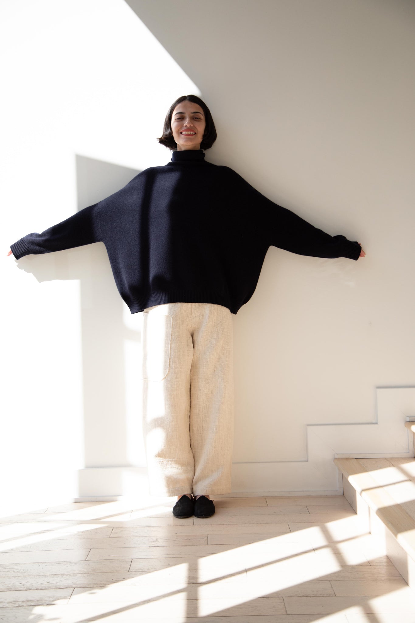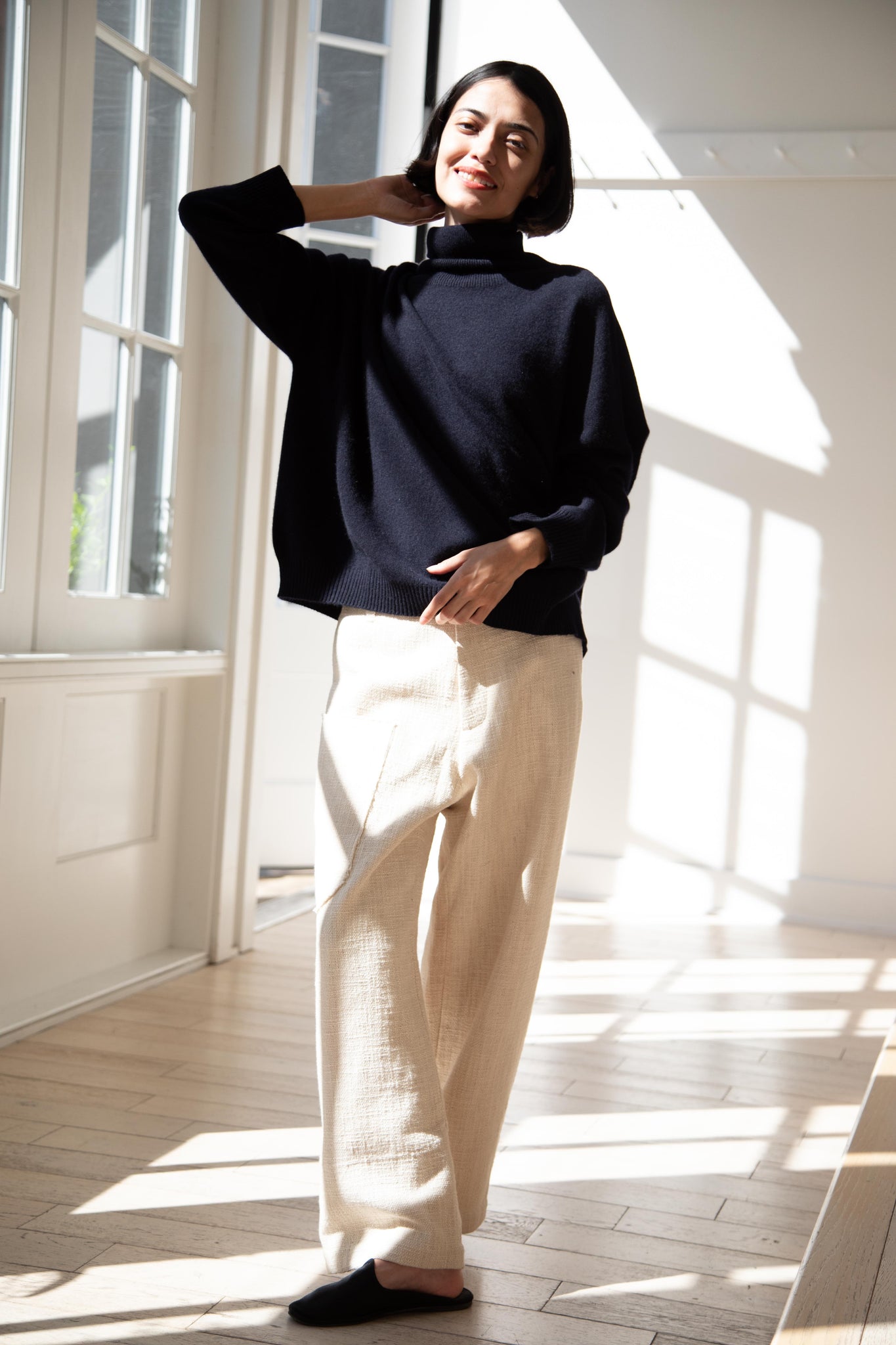 We love this new woven textile from Wright and Doyle this season, and are pleased to have it in a wonderful trouser silhouette (and there's a matching jacket too!). The pants have a long carrot shape leg that's just a little tapered at the hem. They have a flat band waist in the front and an elastic back for and easy fit. There are two side pockets and one big pocket on the side.