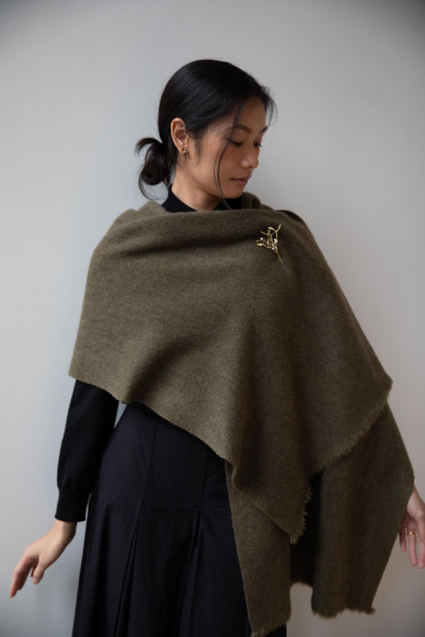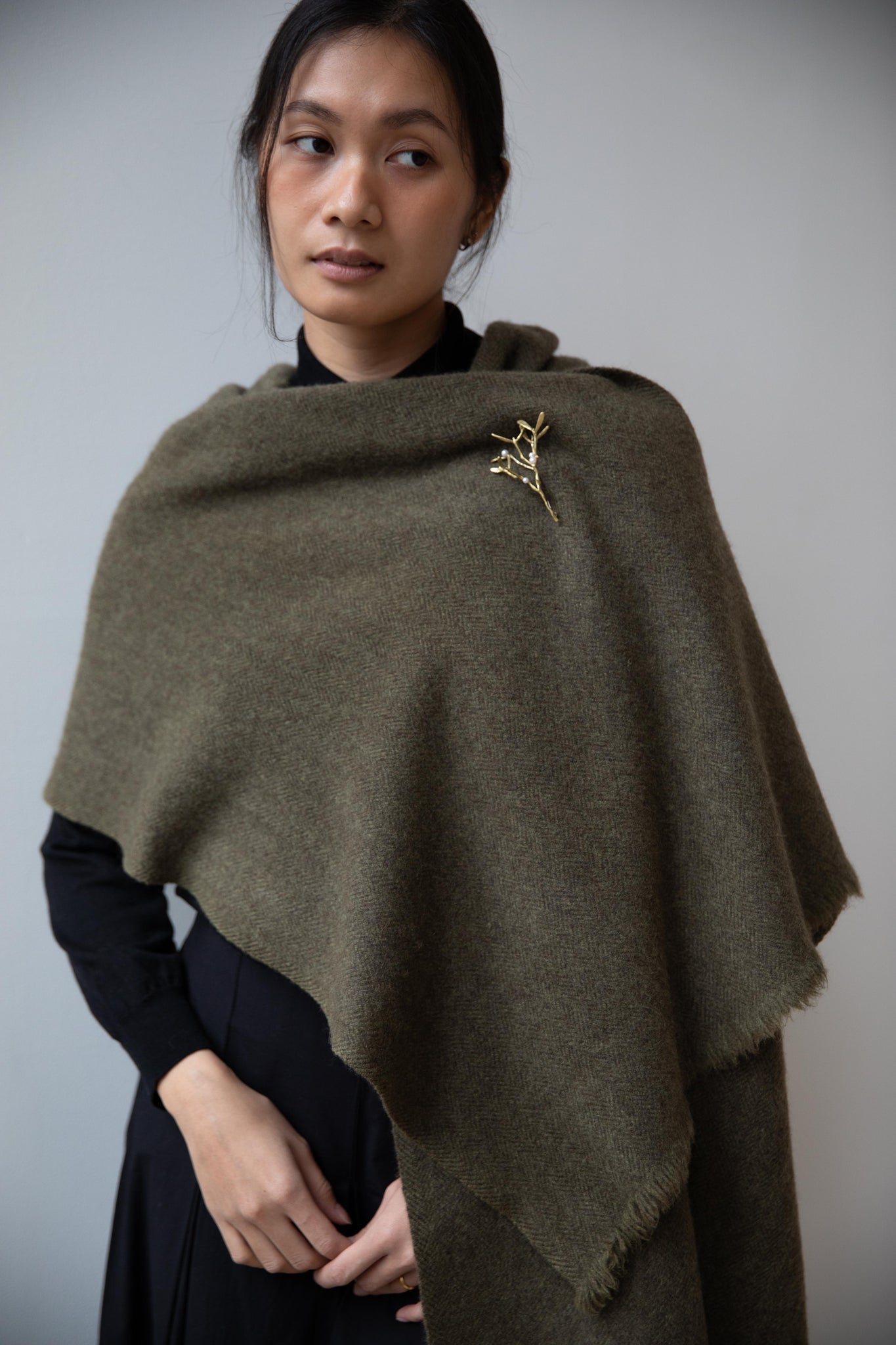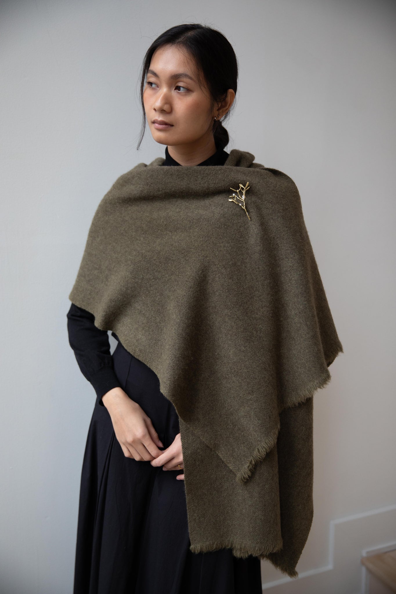 This olive tonal herringbone scarf is made from the softest yak wool.  An ideal scarf size that's perfect for everyday winter wear.  The wool has been slightly felted, so the texture is slightly lofted and thick.  Shown with a pin, not included.  Pin is sold separately.