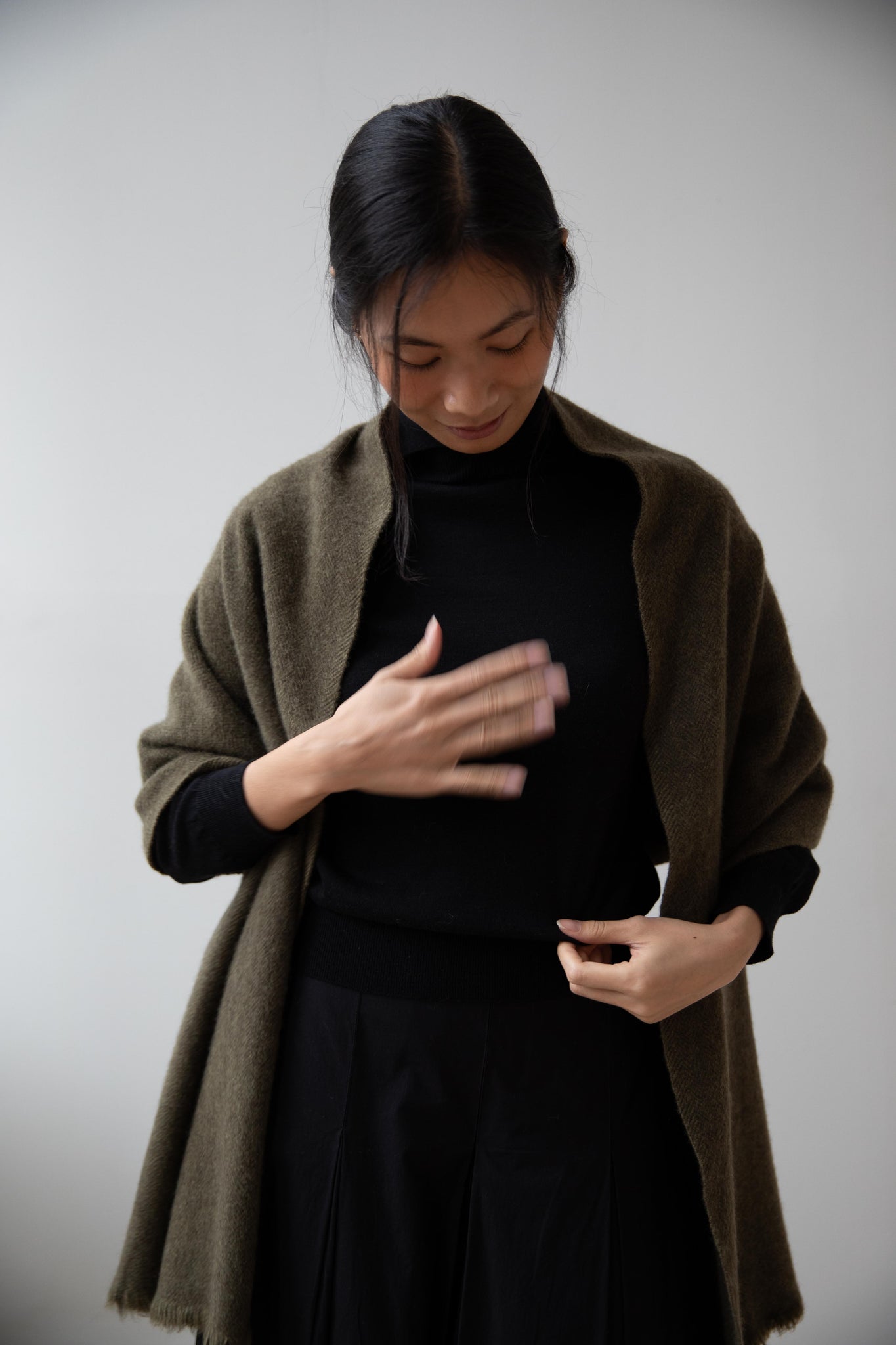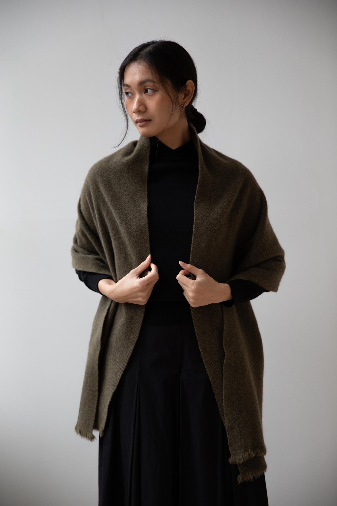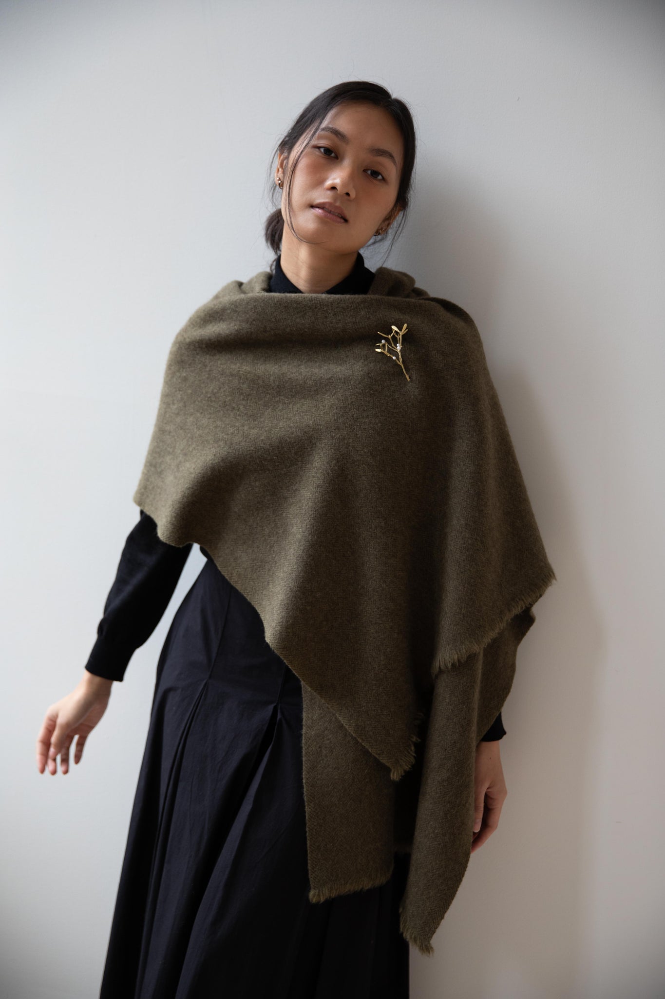 This olive tonal herringbone scarf is made from the softest yak wool.  An ideal scarf size that's perfect for everyday winter wear.  The wool has been slightly felted, so the texture is slightly lofted and thick.  Shown with a pin, not included.  Pin is sold separately.