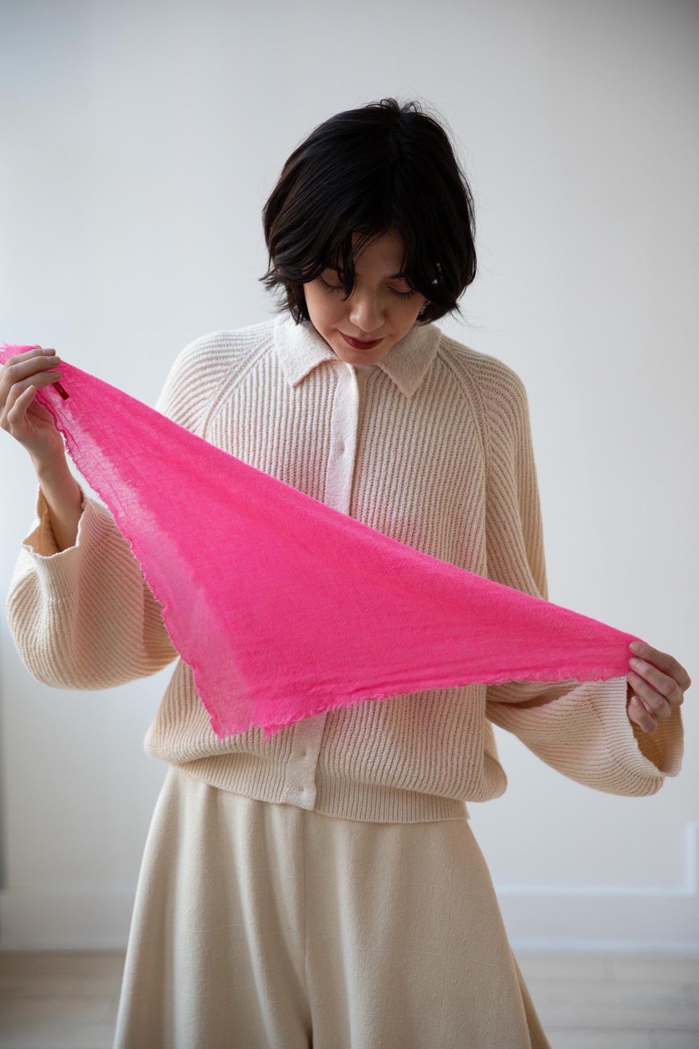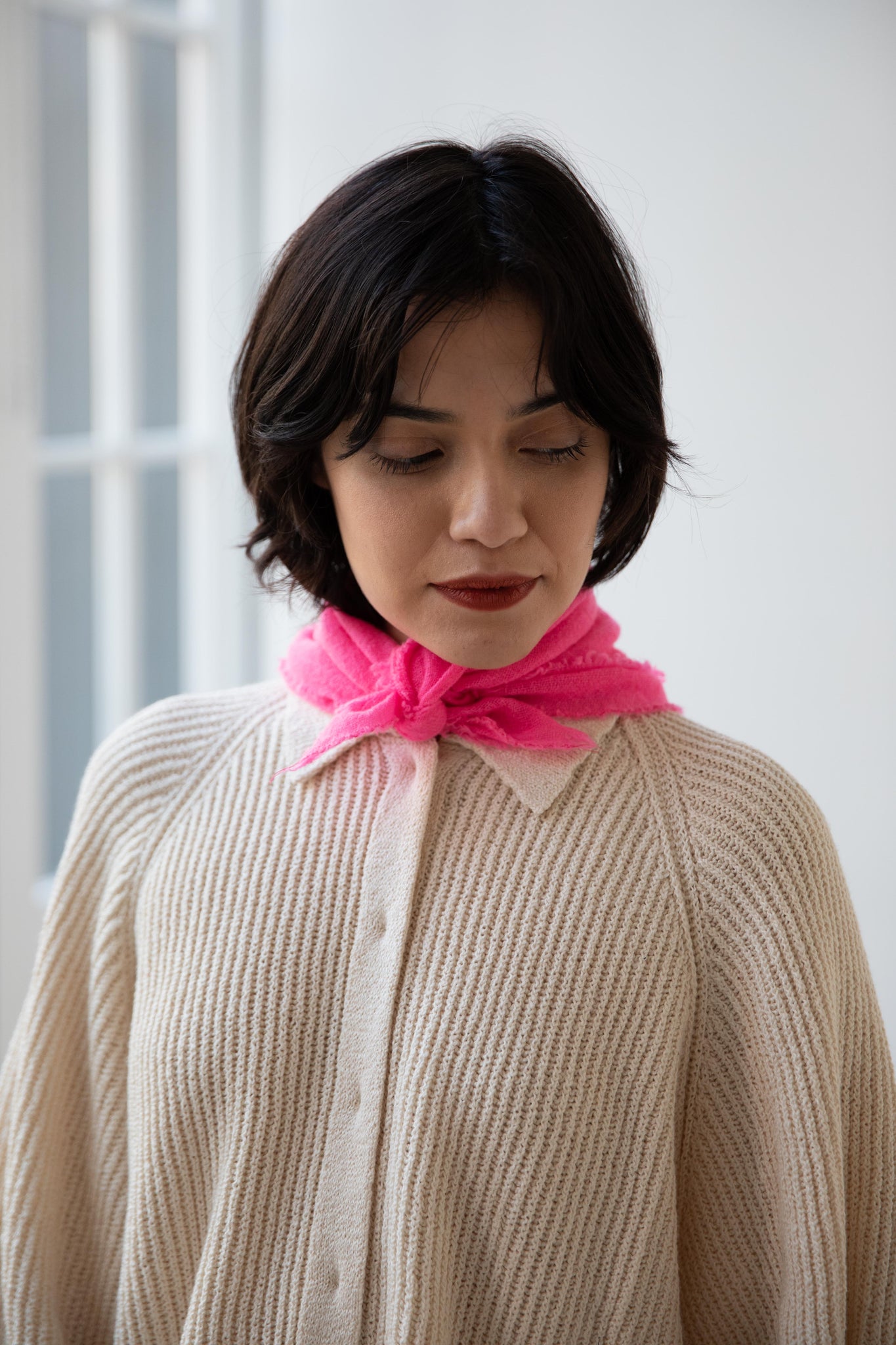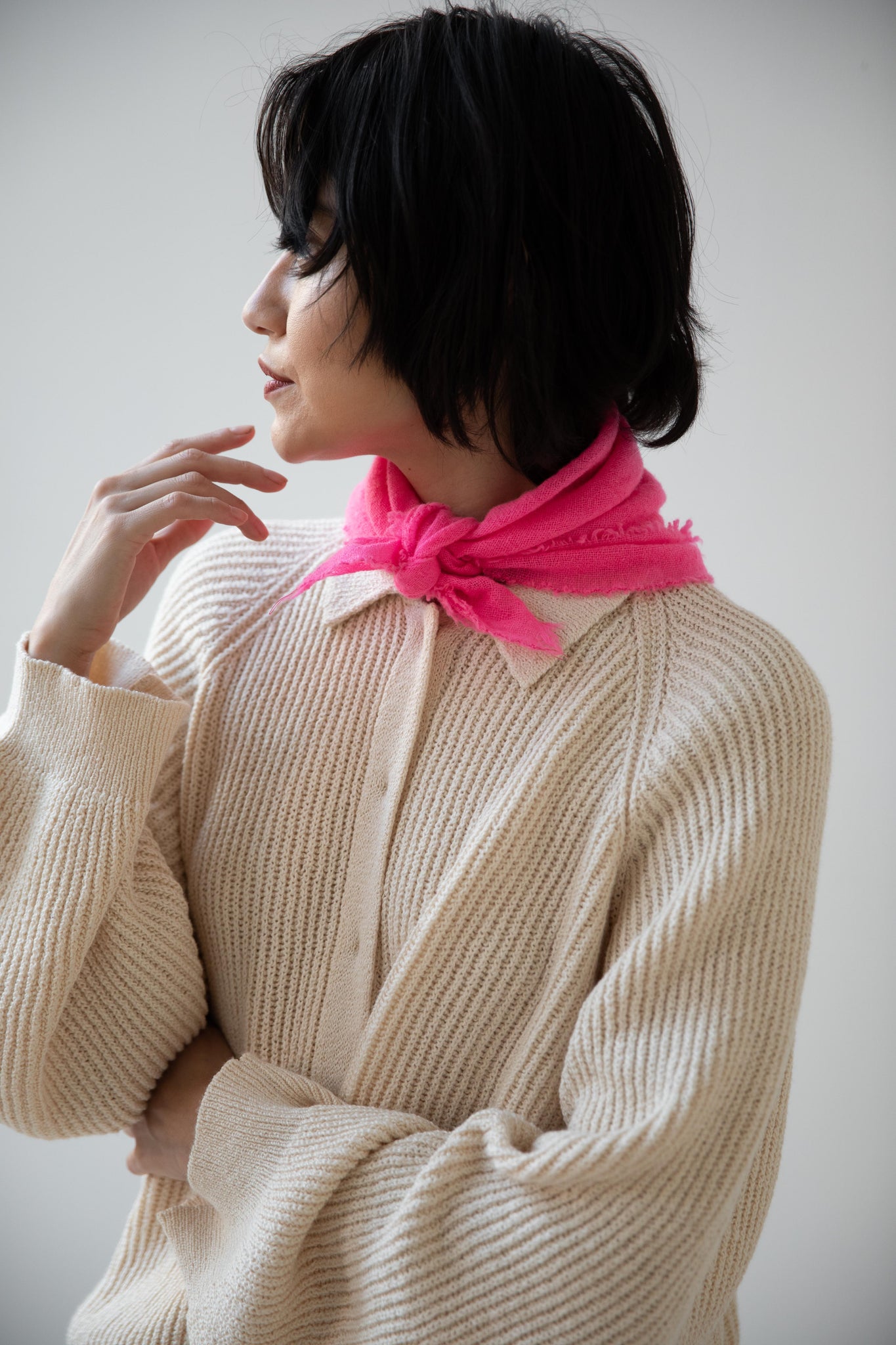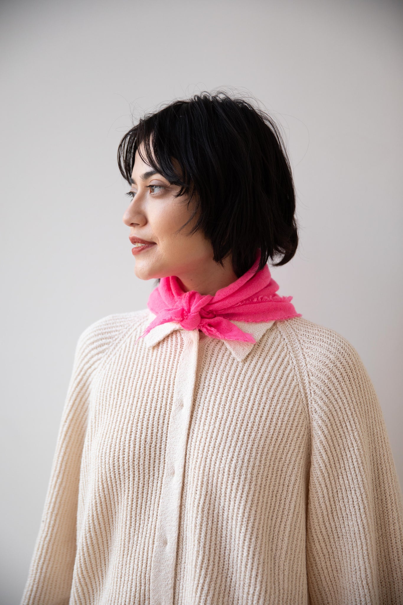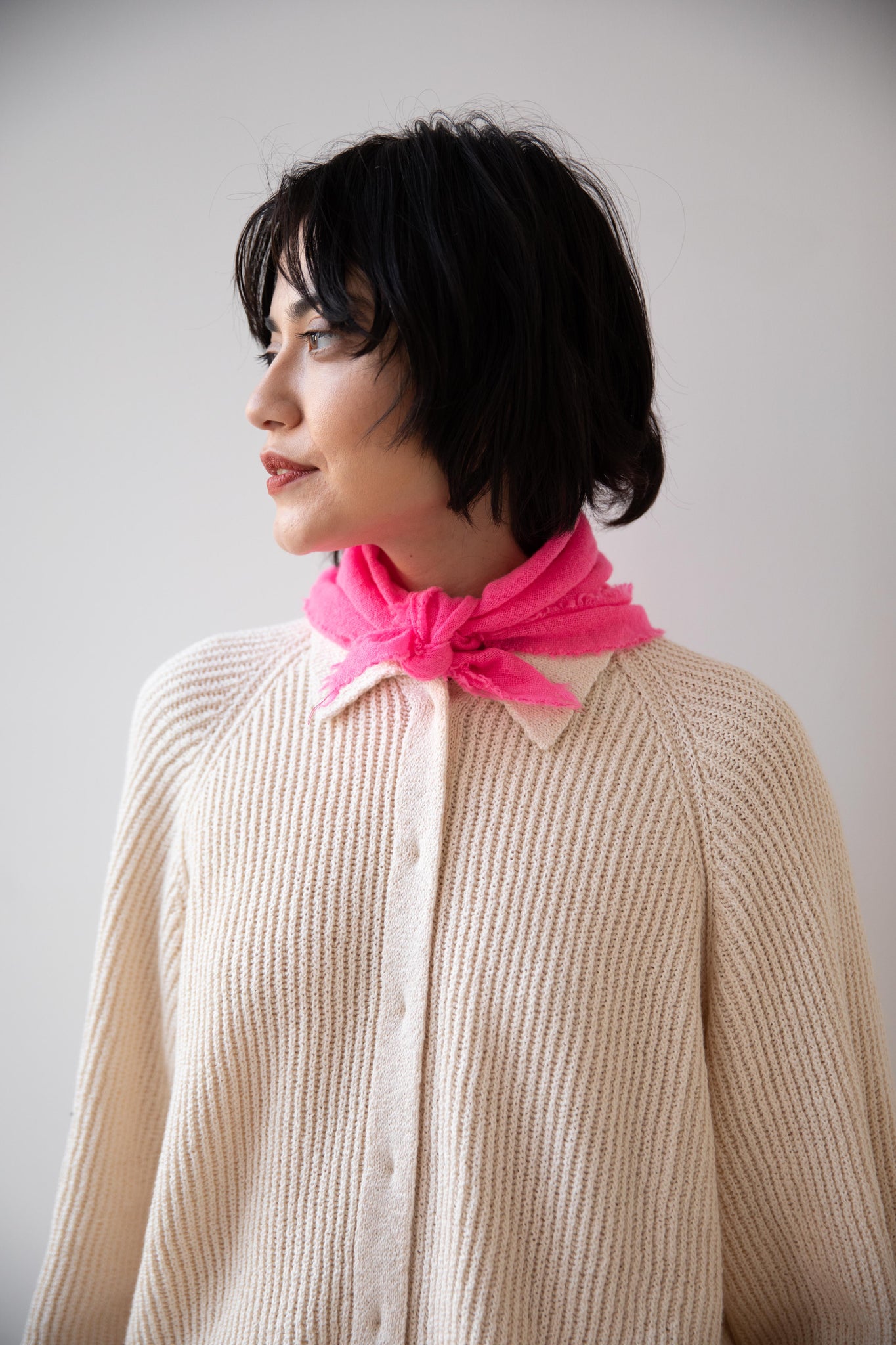 These short and sweet little cashmere scarves are soft as can be and perfect for spring. Roughly the size of a bandana, they add a bit of charm to any look.