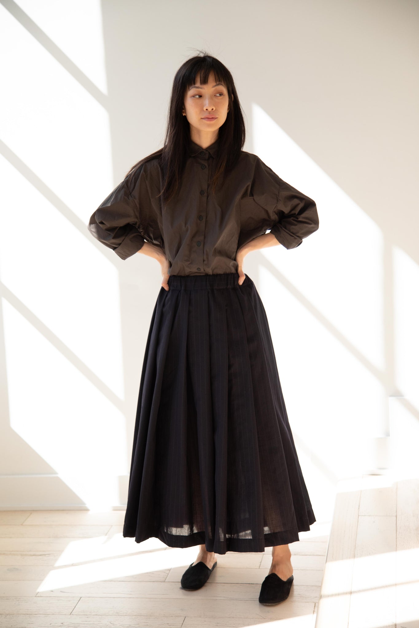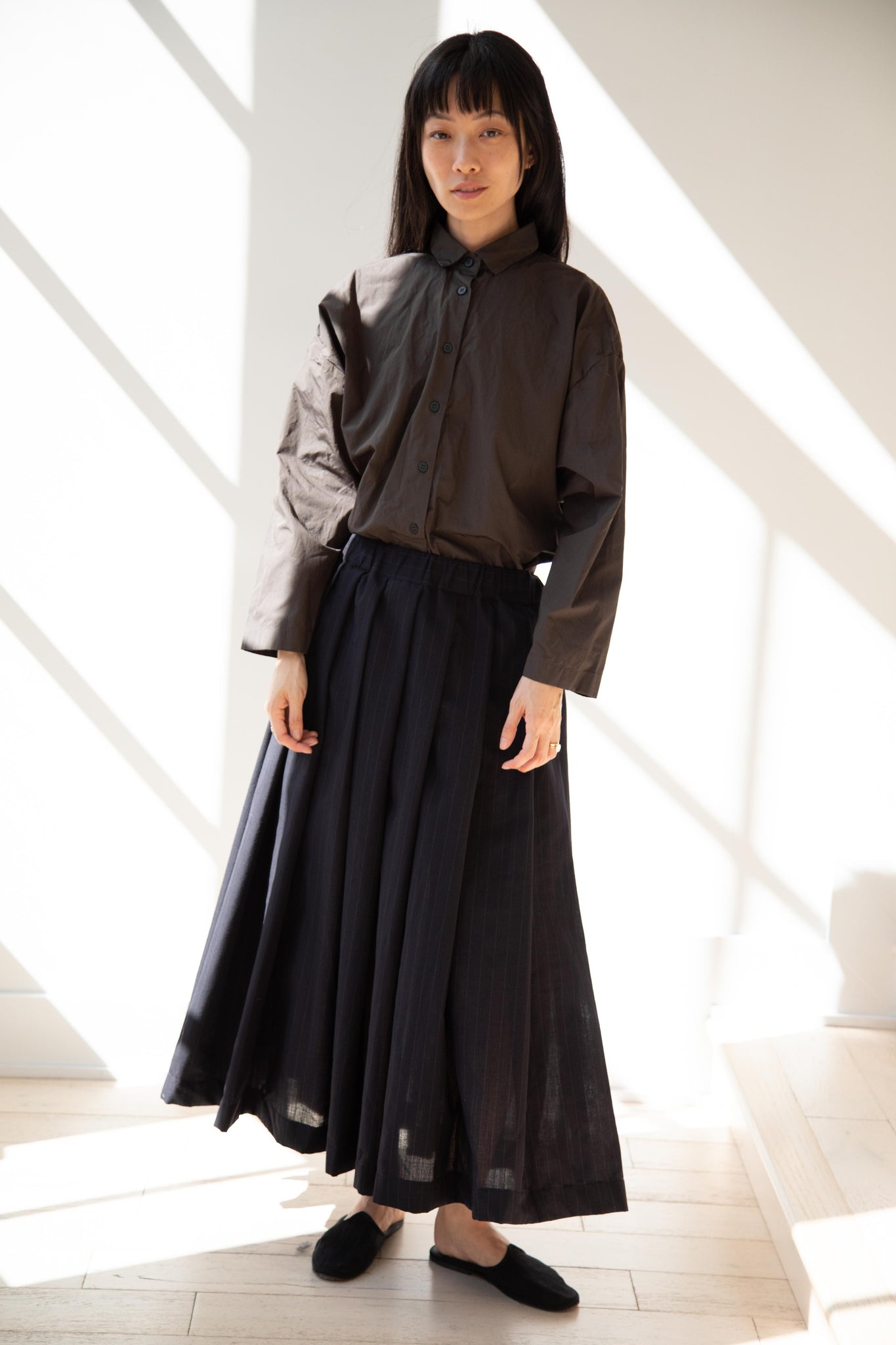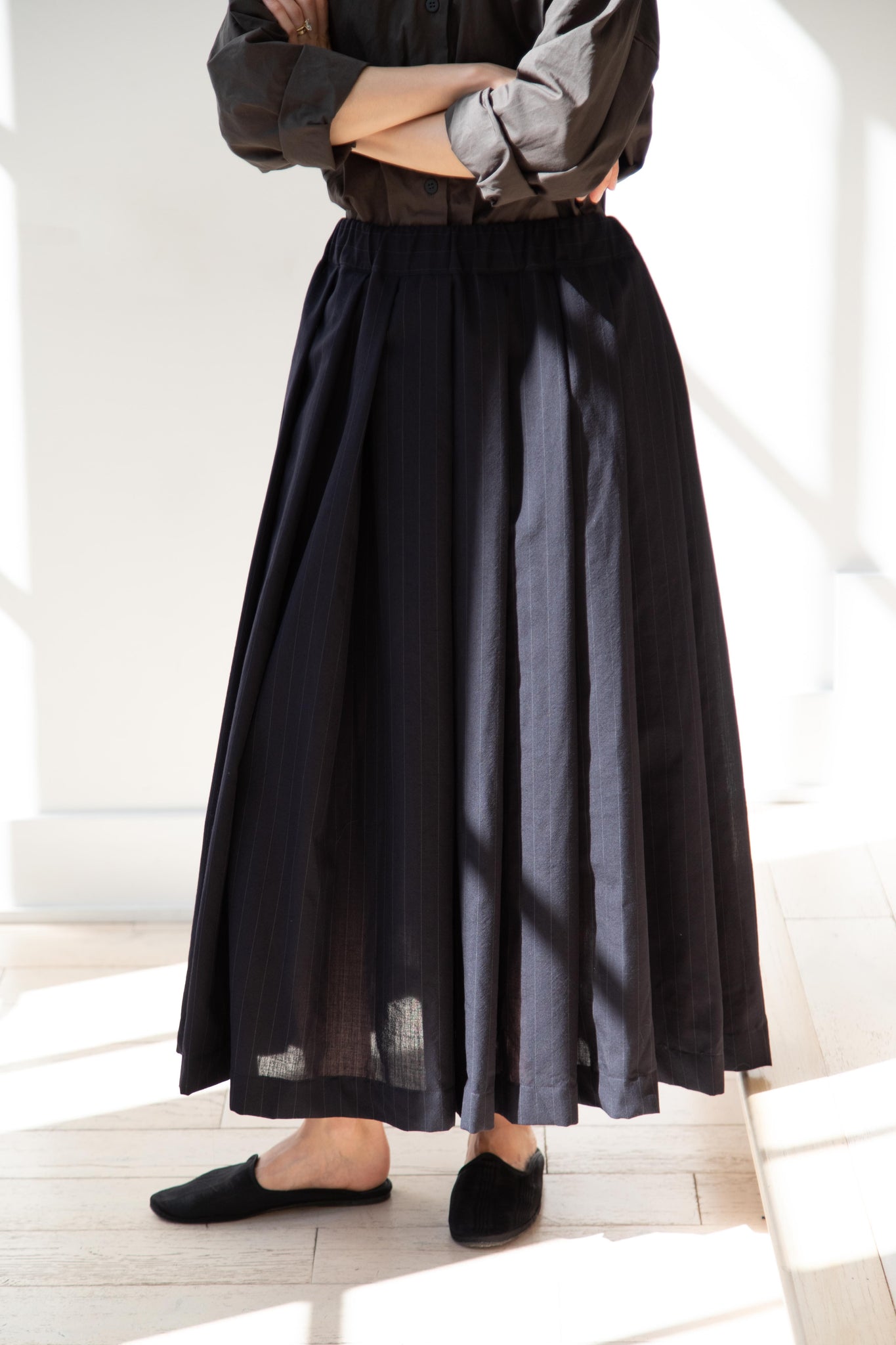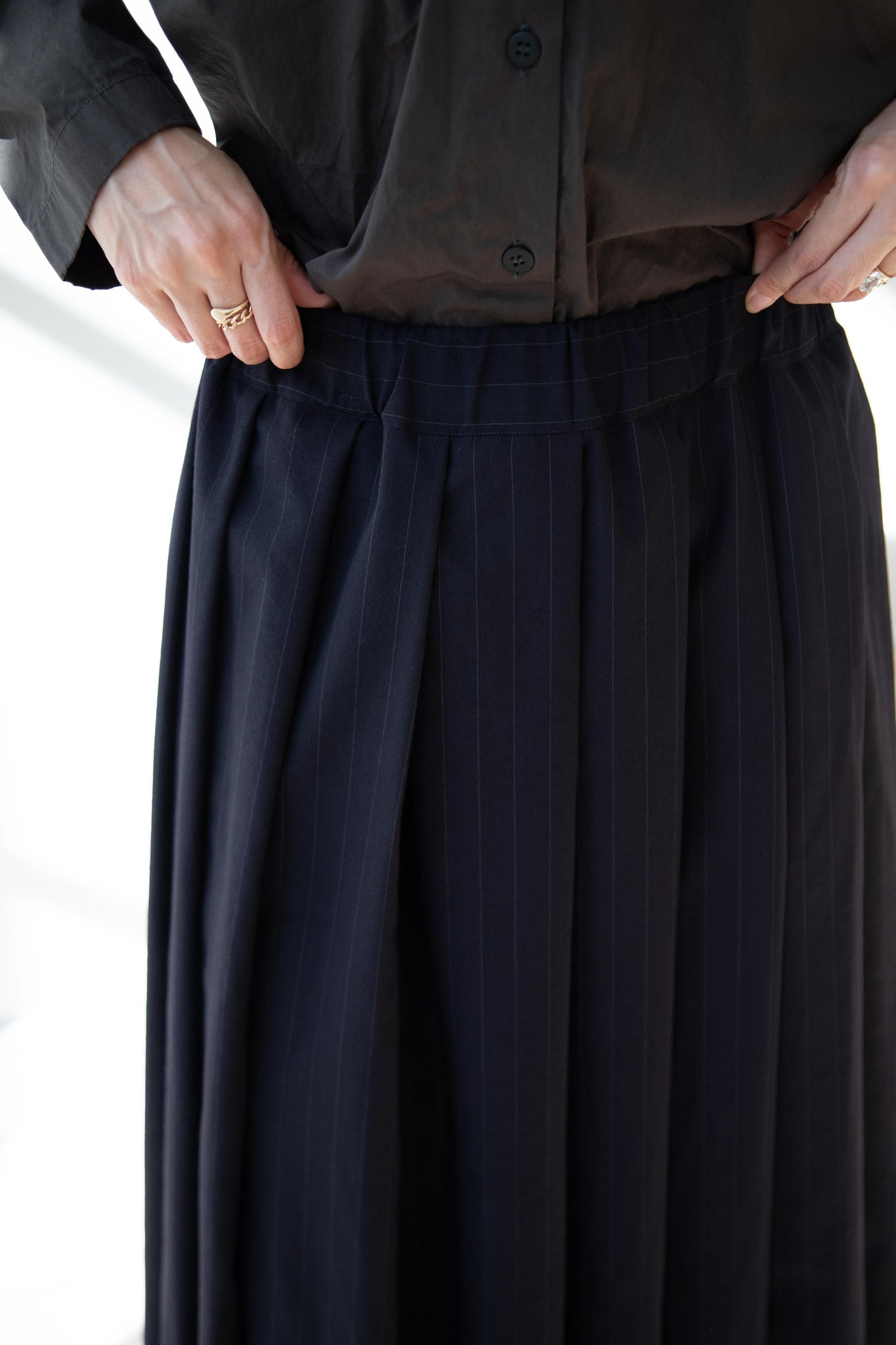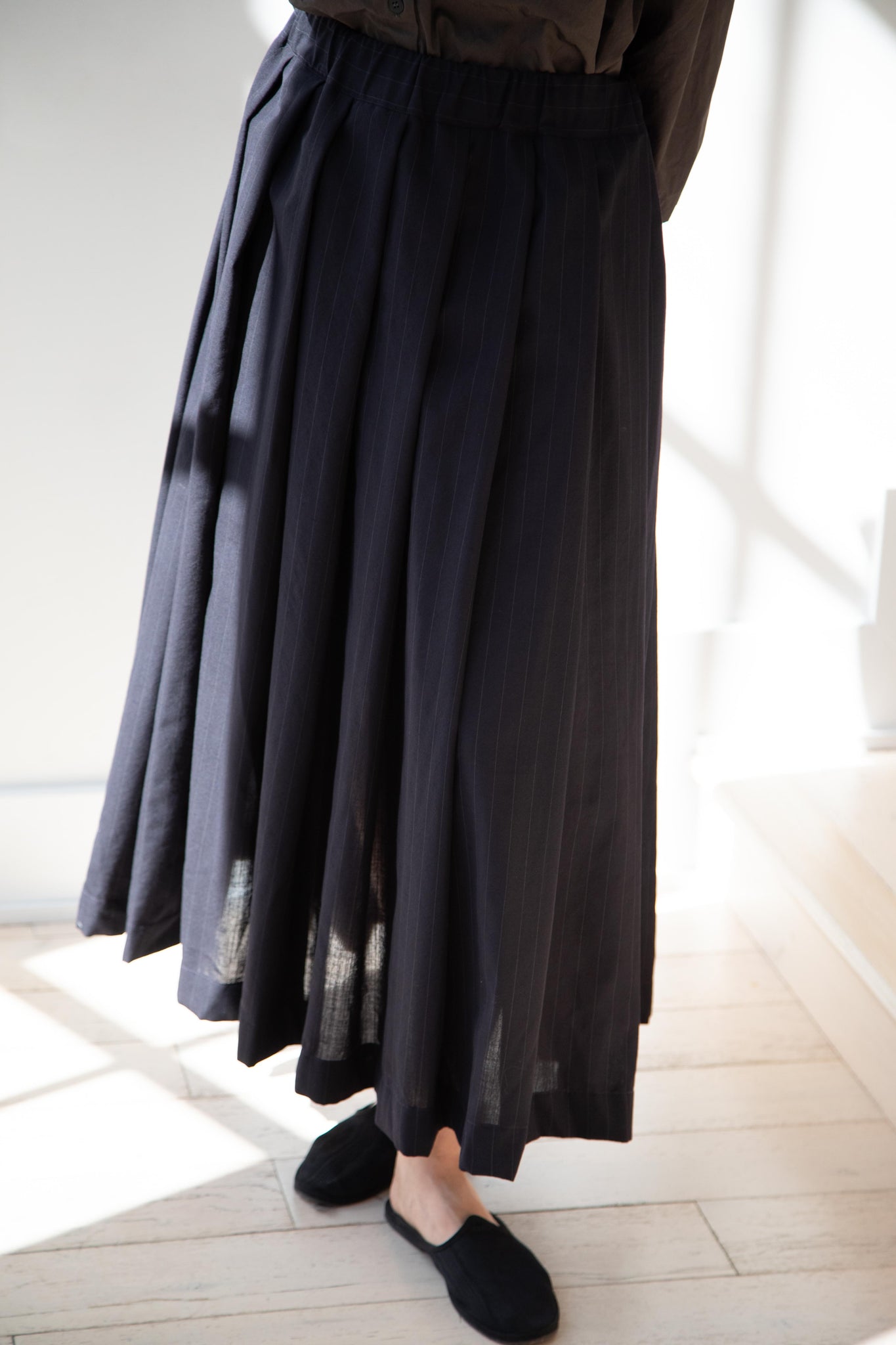 Another classic piece from Bergfabel. This pleated skirt is constructed from a tropical wool with an elastic waist and an interior drawstring, making it super comfortable and a pleasure to wear. It provides great shape and interest to any outfit year round!