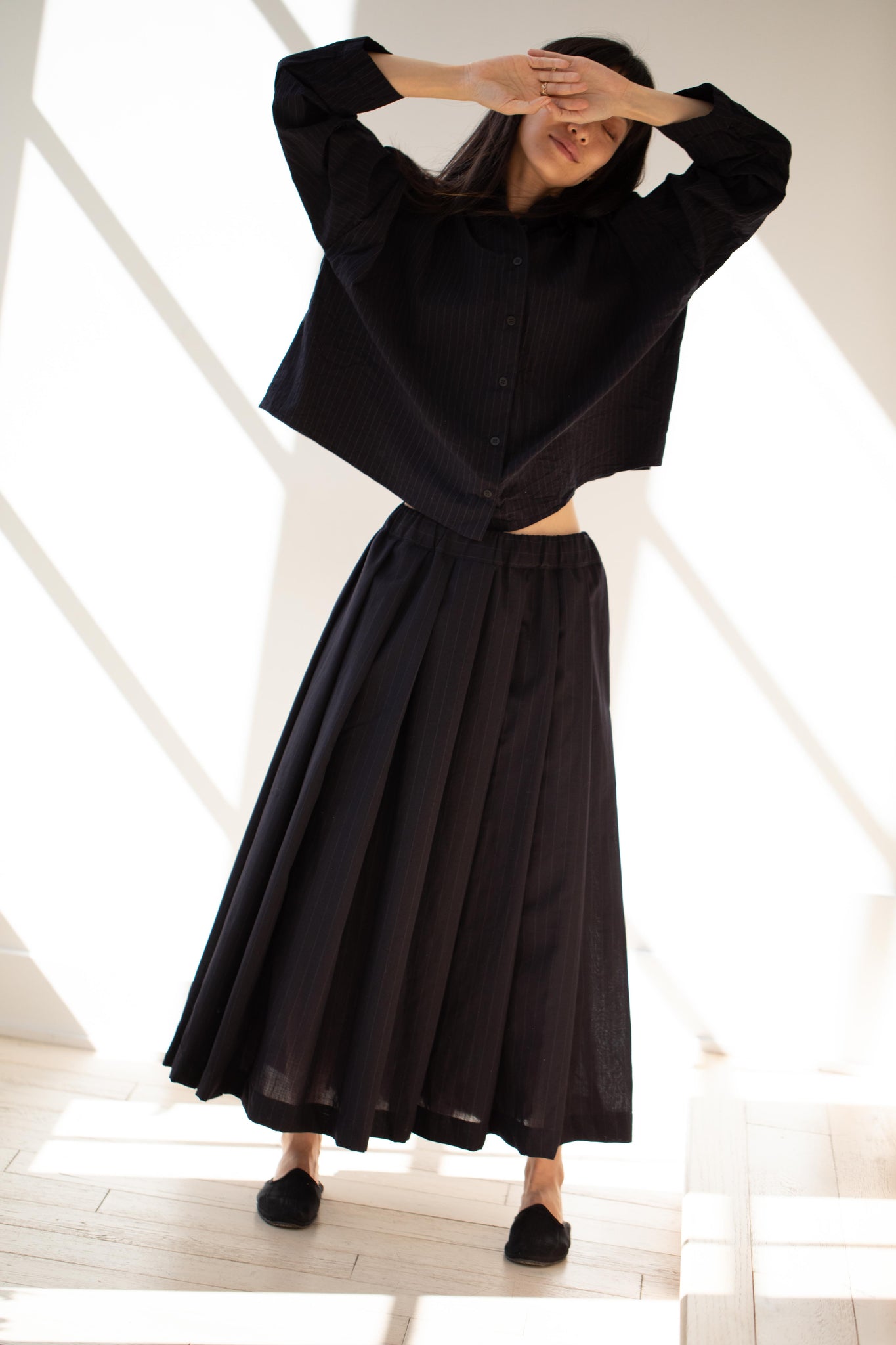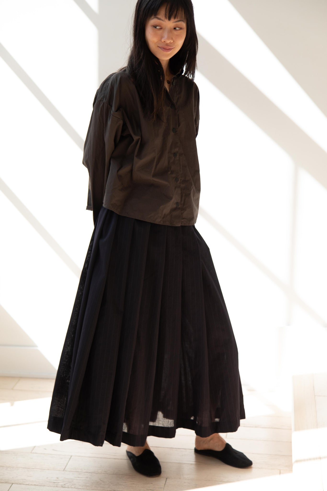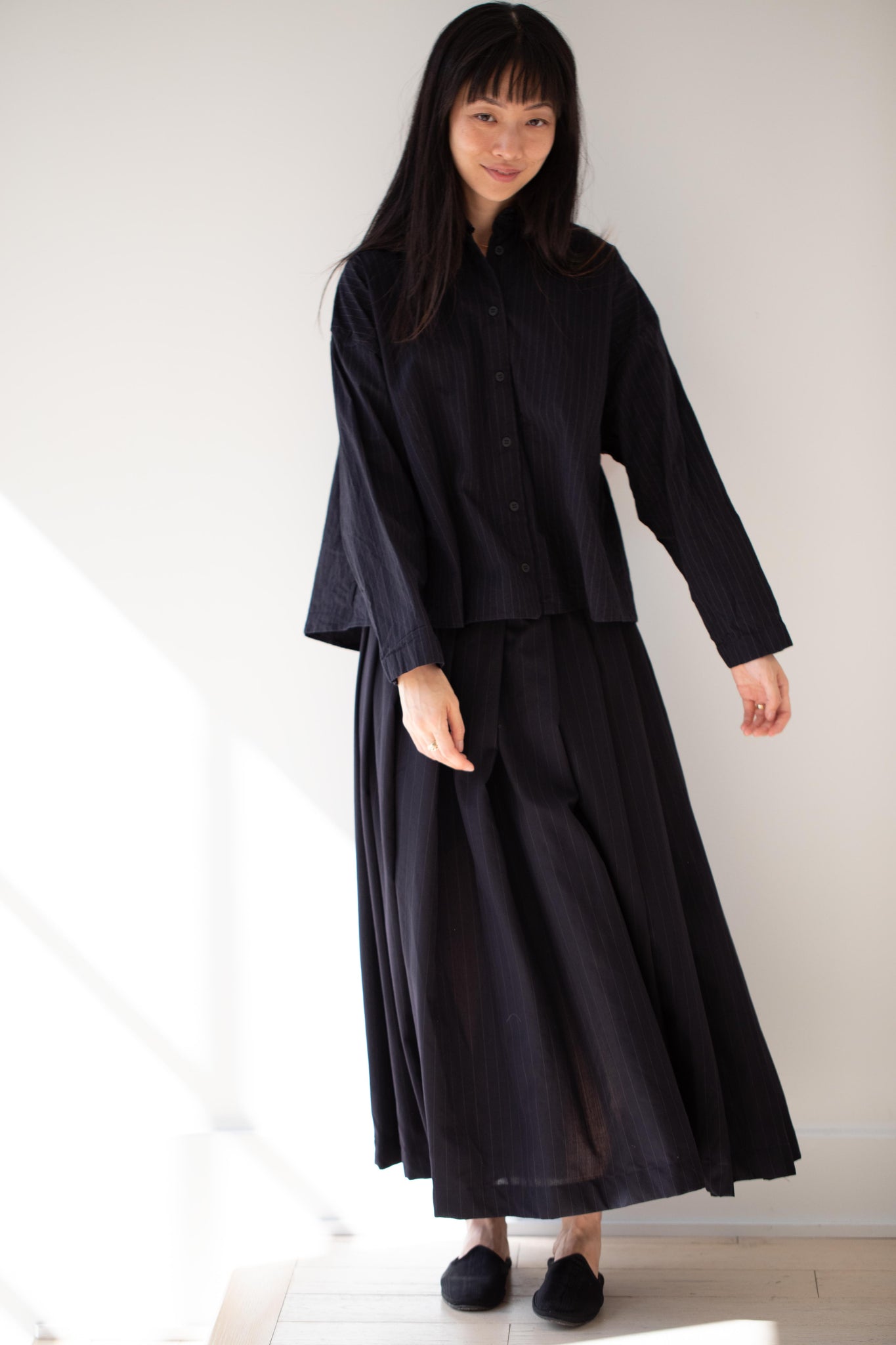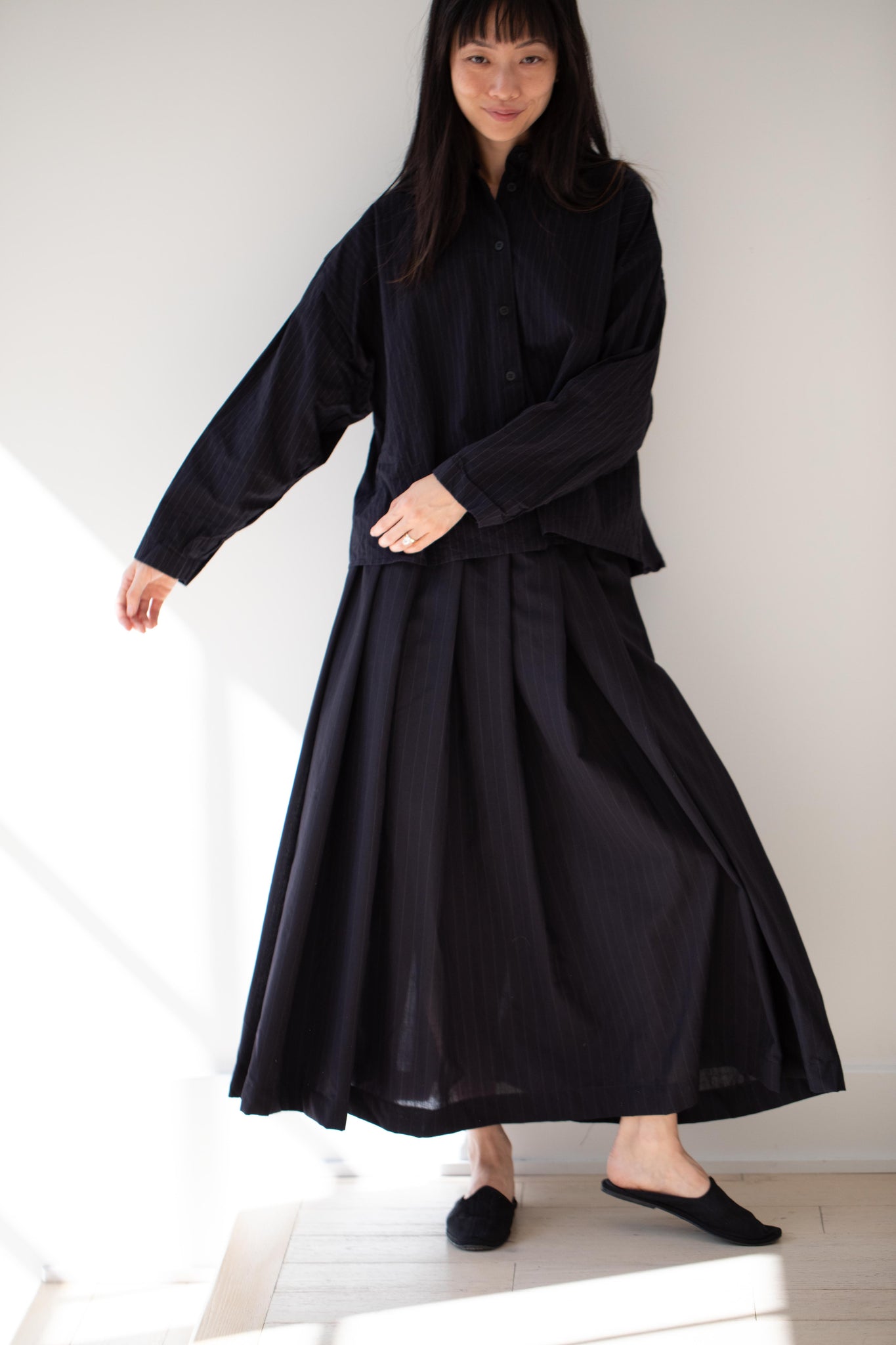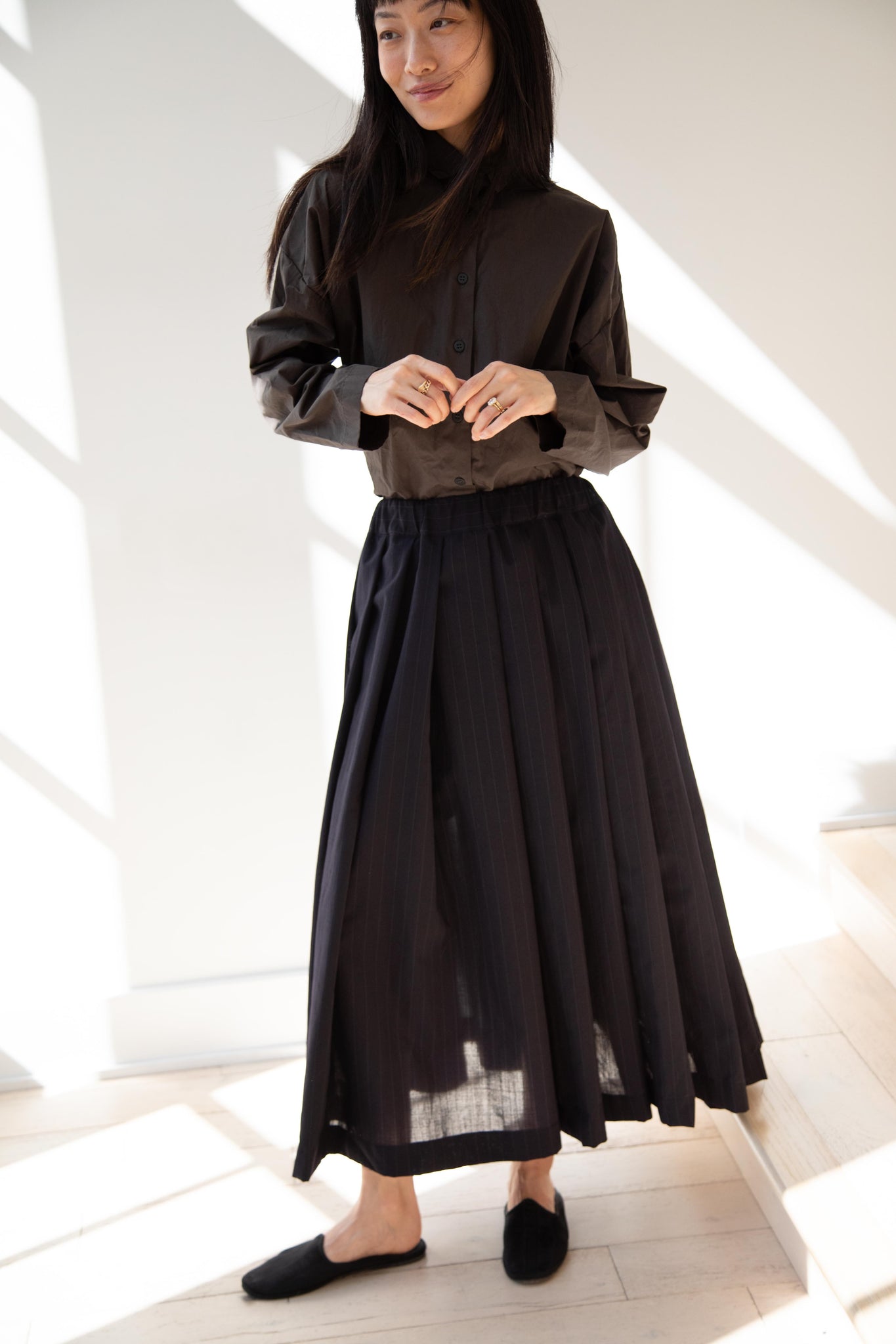 Another classic piece from Bergfabel. This pleated skirt is constructed from a tropical wool with an elastic waist and an interior drawstring, making it super comfortable and a pleasure to wear. It provides great shape and interest to any outfit year round!