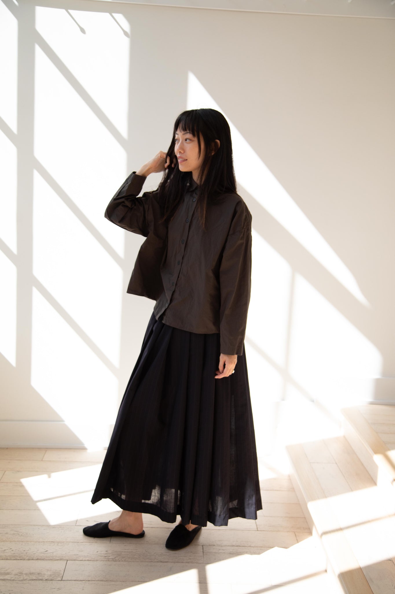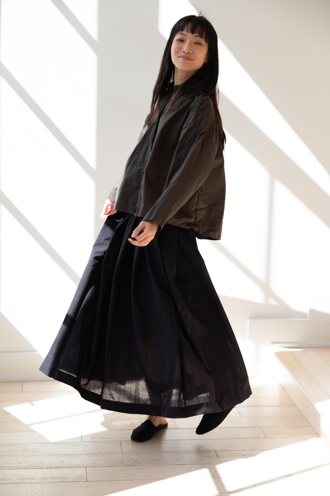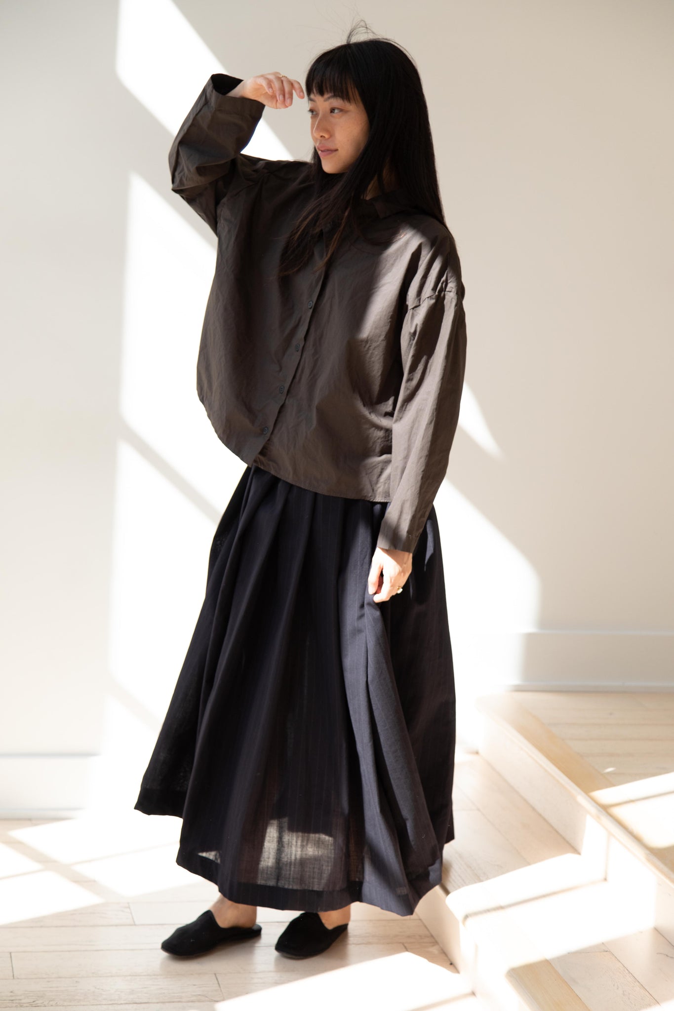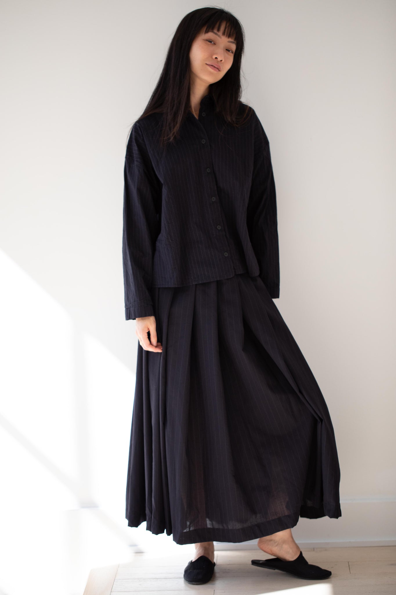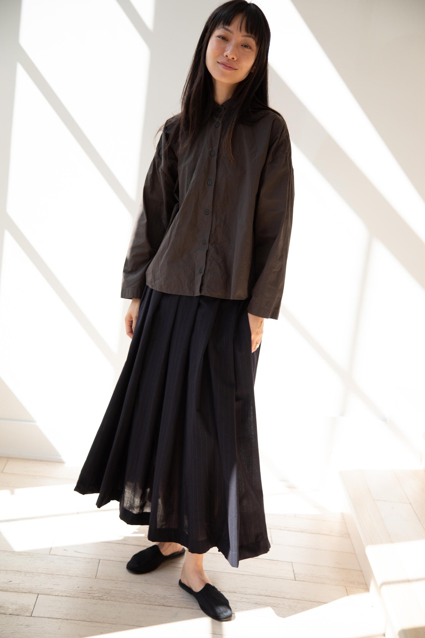 Another classic piece from Bergfabel. This pleated skirt is constructed from a tropical wool with an elastic waist and an interior drawstring, making it super comfortable and a pleasure to wear. It provides great shape and interest to any outfit year round!