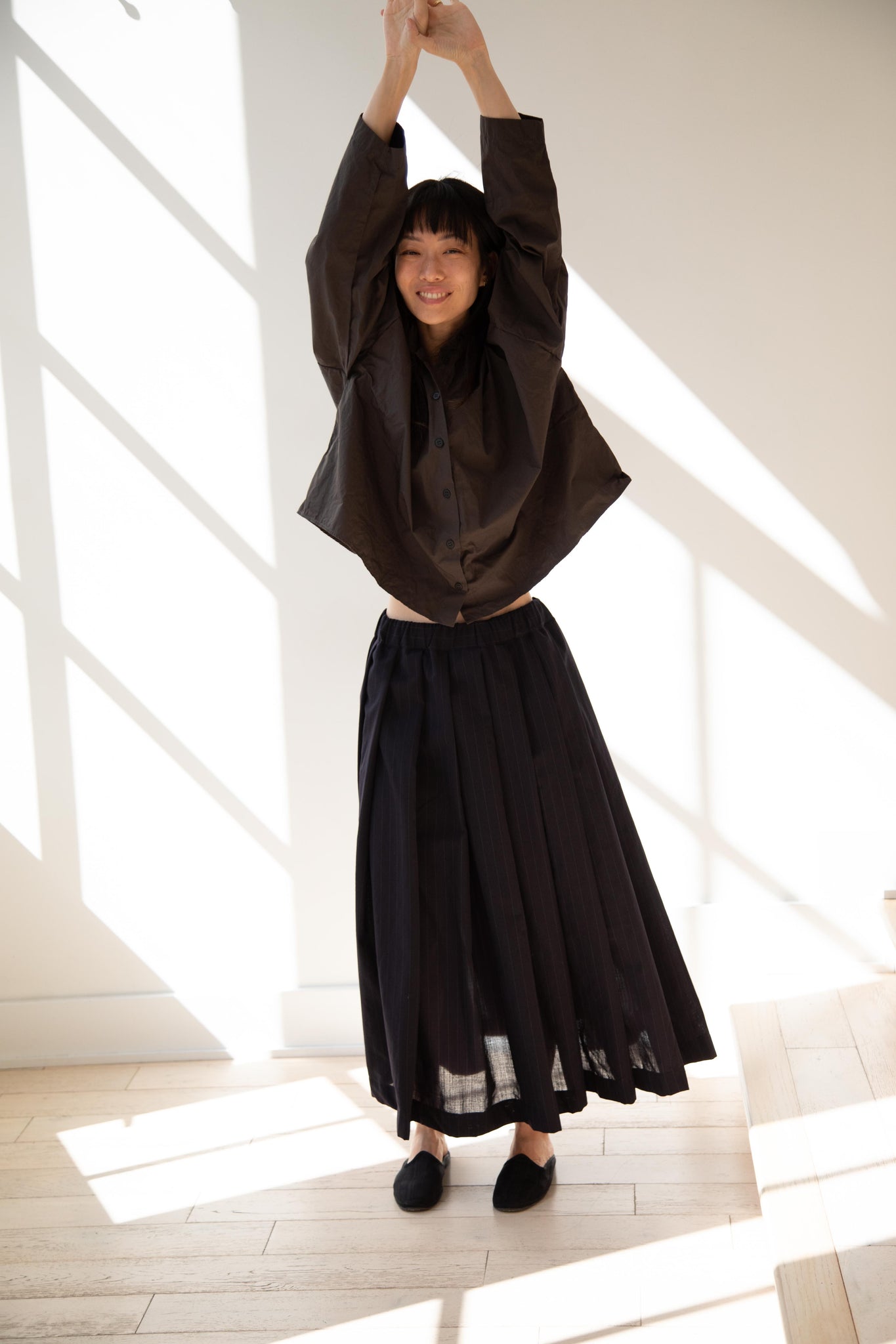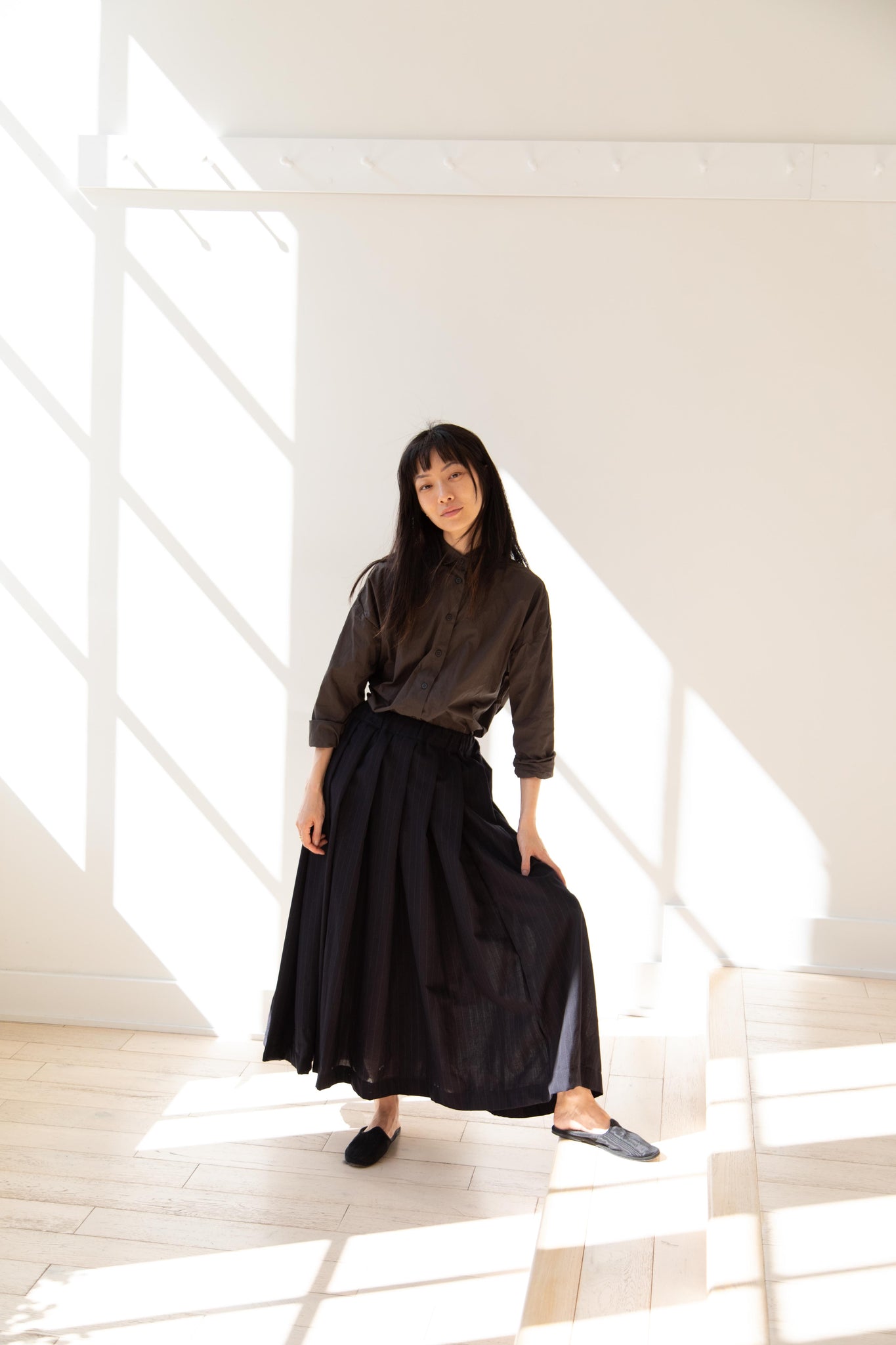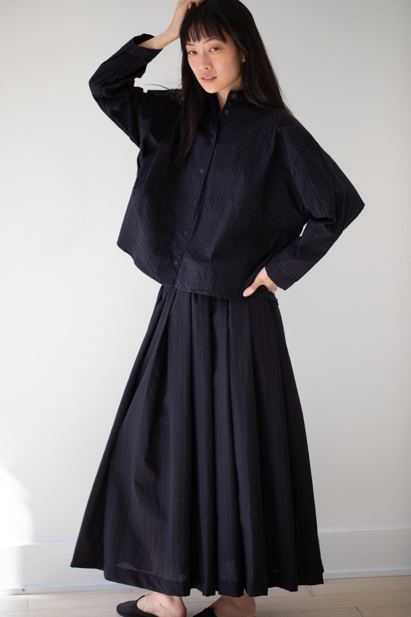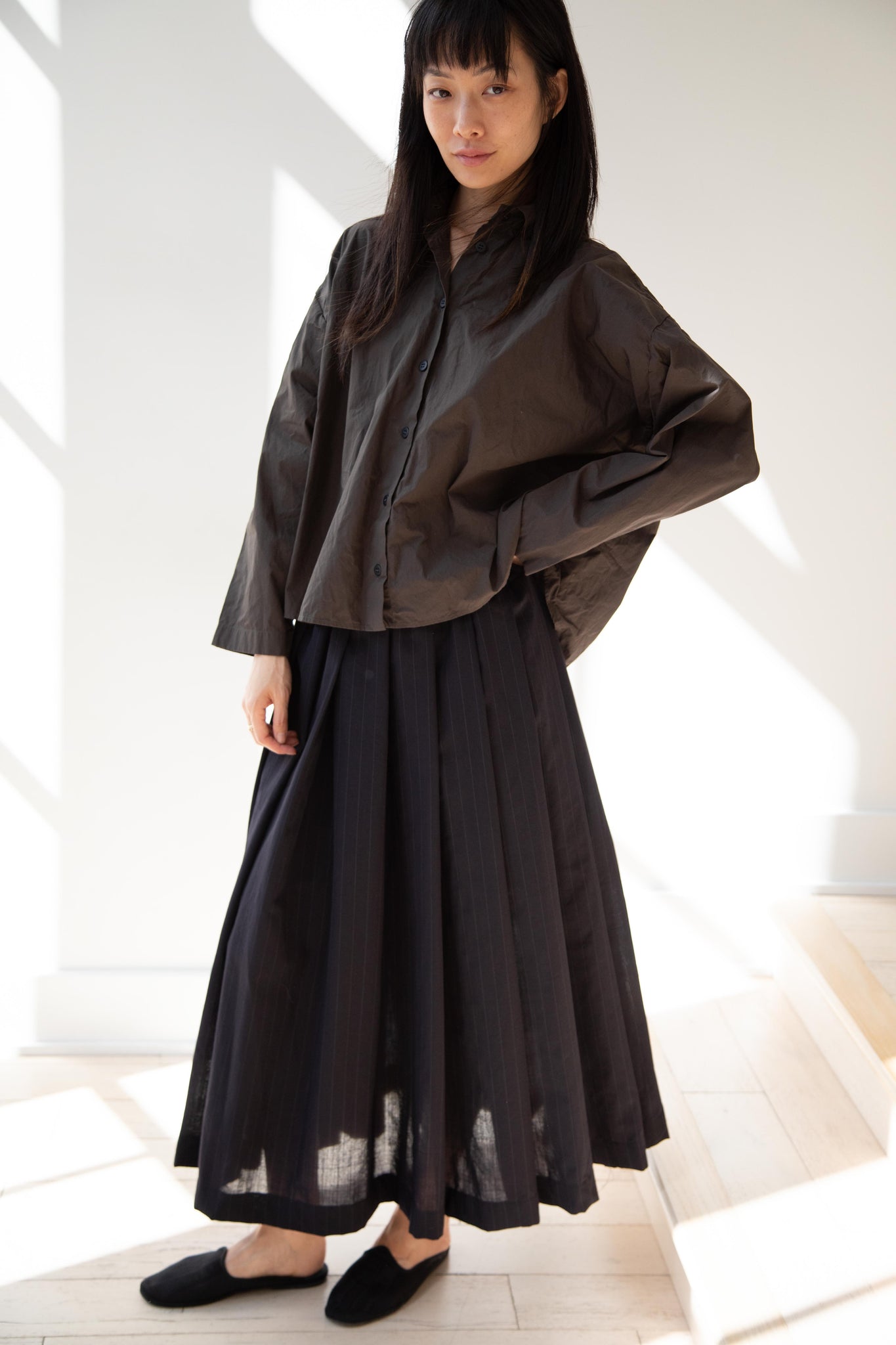 Another classic piece from Bergfabel. This pleated skirt is constructed from a tropical wool with an elastic waist and an interior drawstring, making it super comfortable and a pleasure to wear. It provides great shape and interest to any outfit year round!