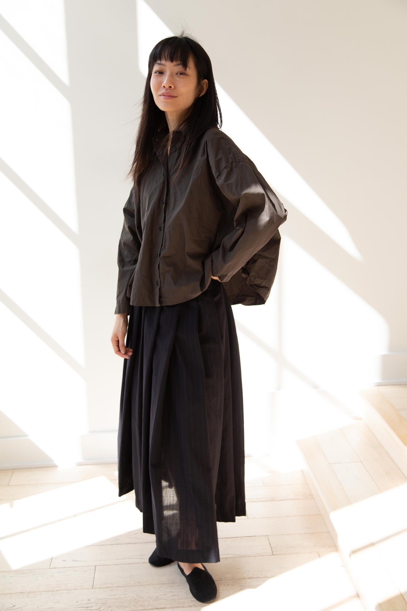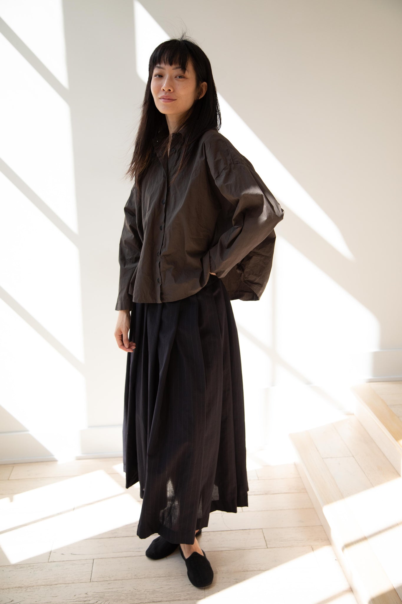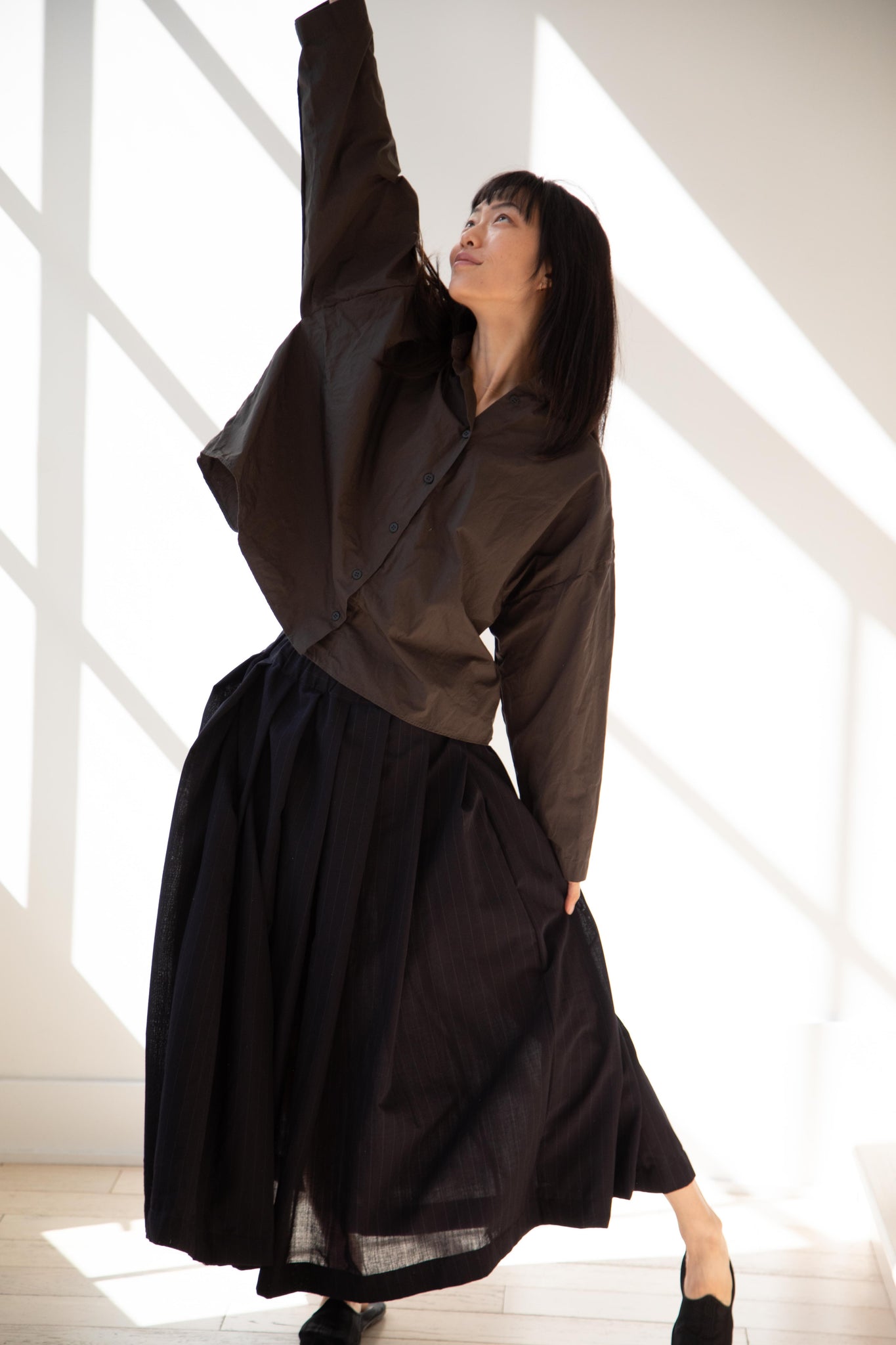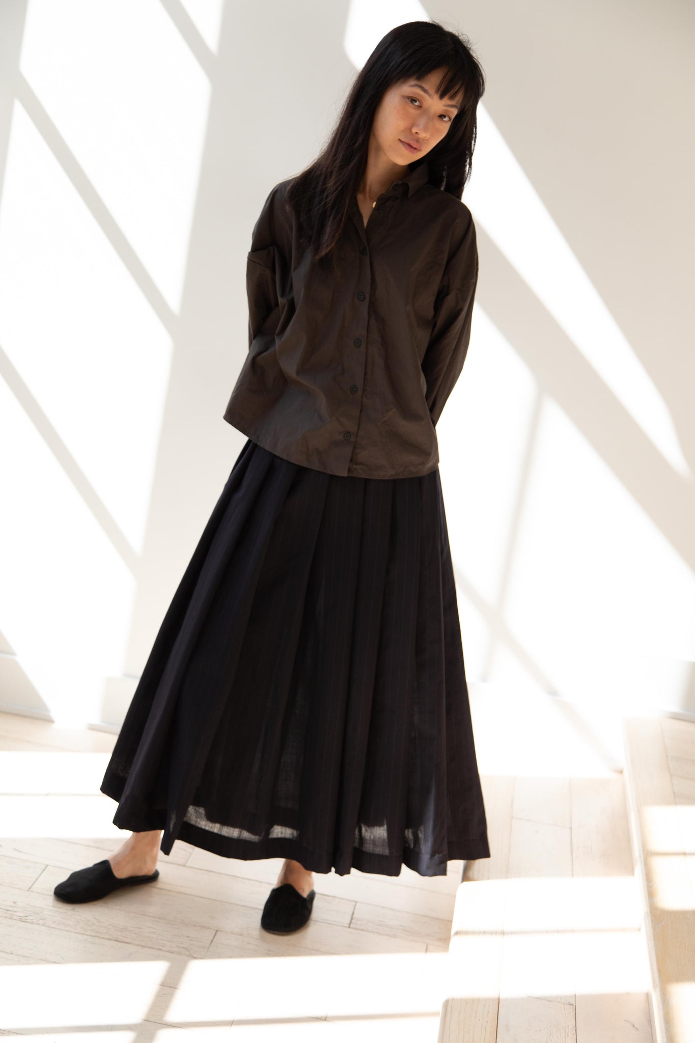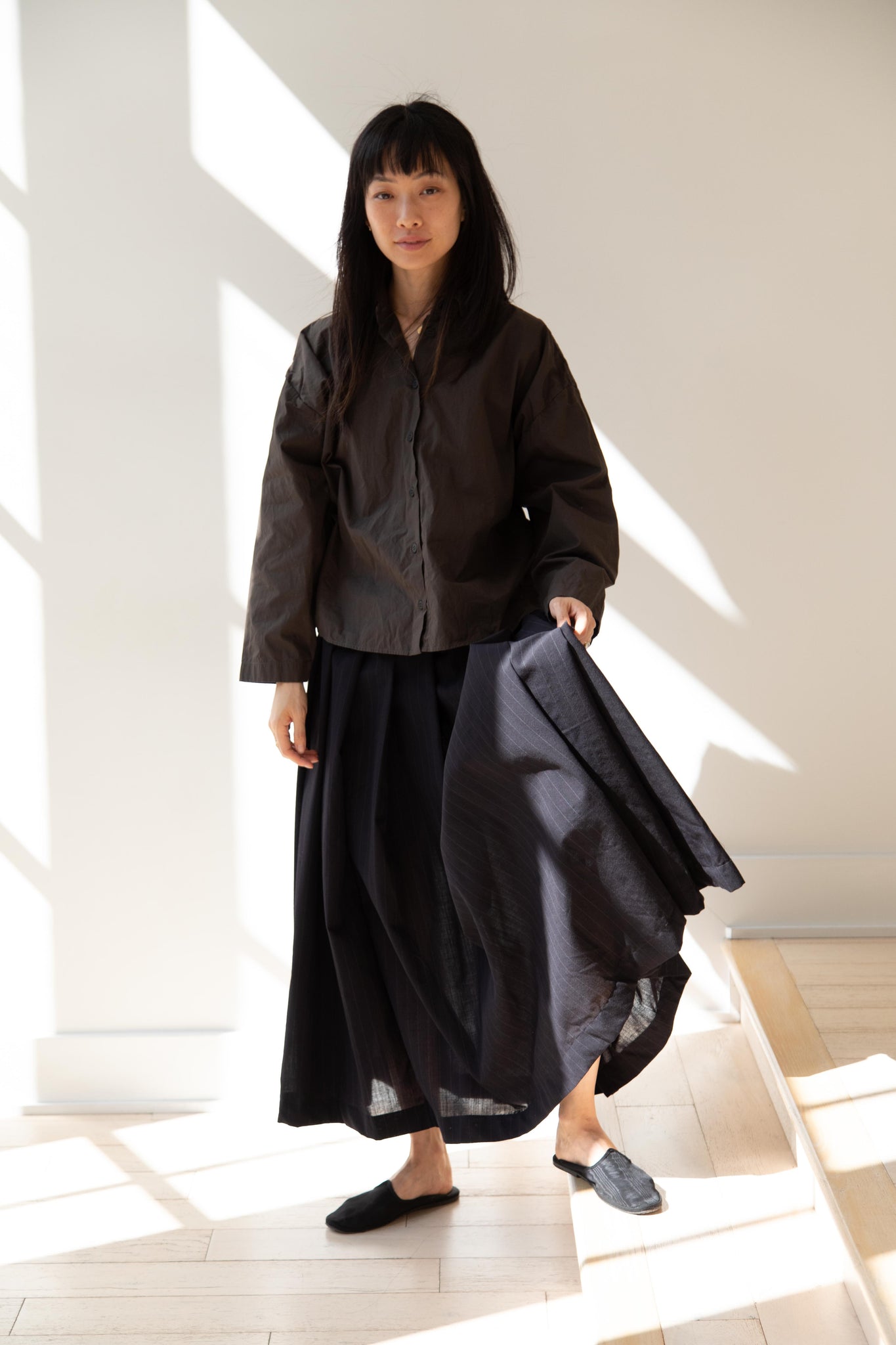 Another classic piece from Bergfabel. This pleated skirt is constructed from a tropical wool with an elastic waist and an interior drawstring, making it super comfortable and a pleasure to wear. It provides great shape and interest to any outfit year round!