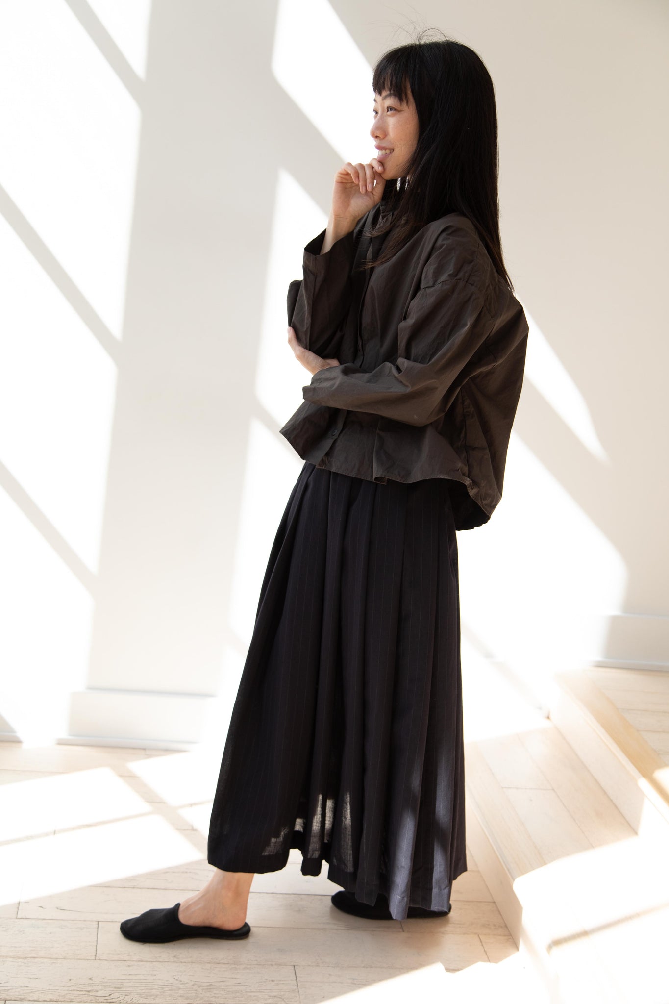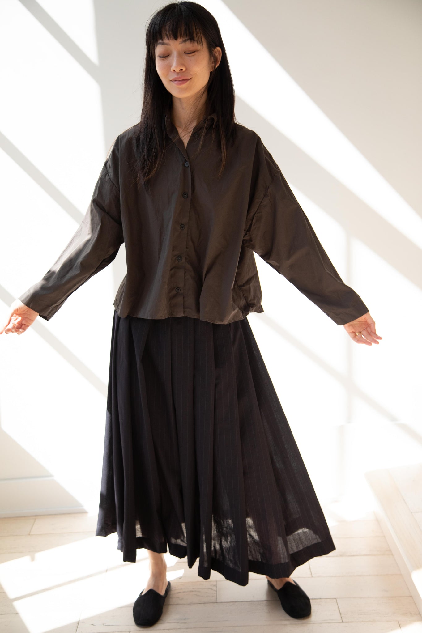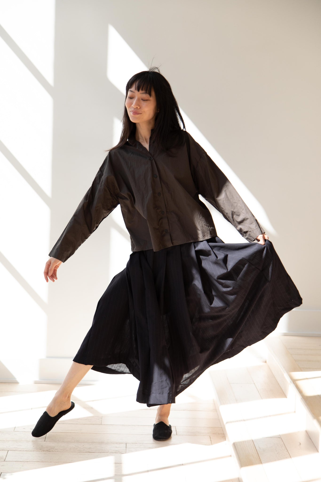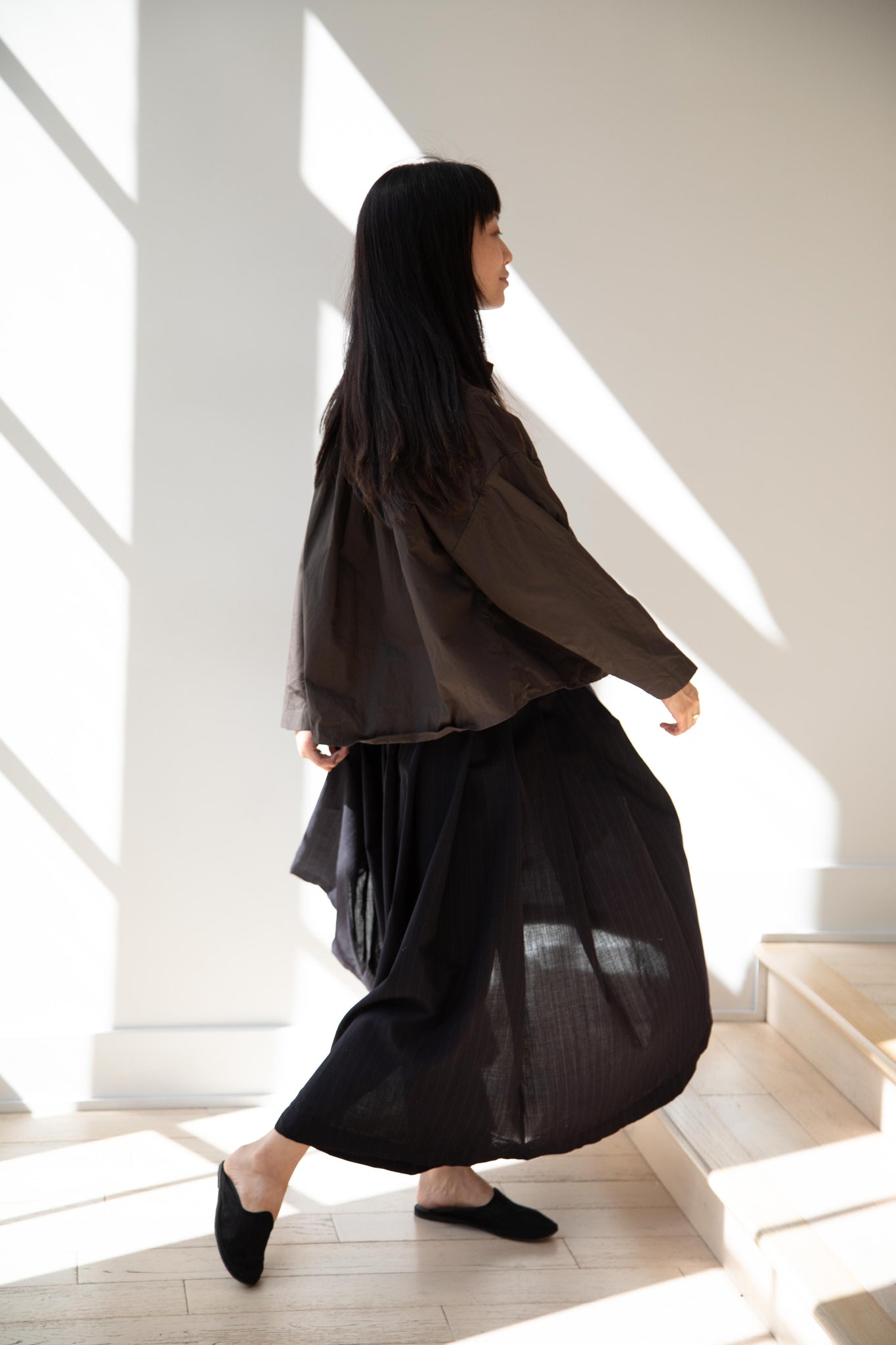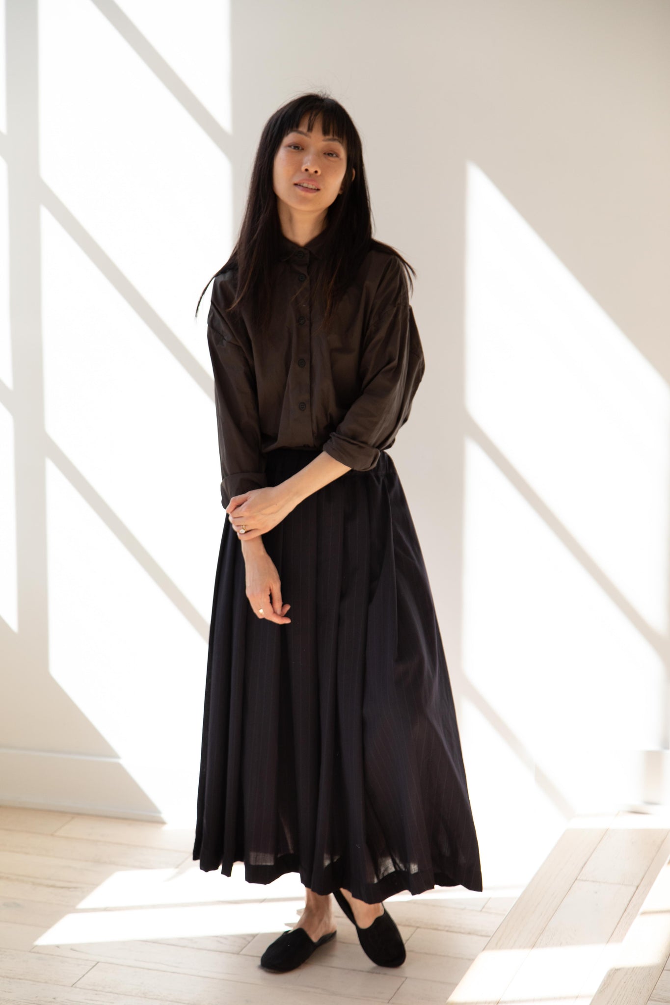 Another classic piece from Bergfabel. This pleated skirt is constructed from a tropical wool with an elastic waist and an interior drawstring, making it super comfortable and a pleasure to wear. It provides great shape and interest to any outfit year round!