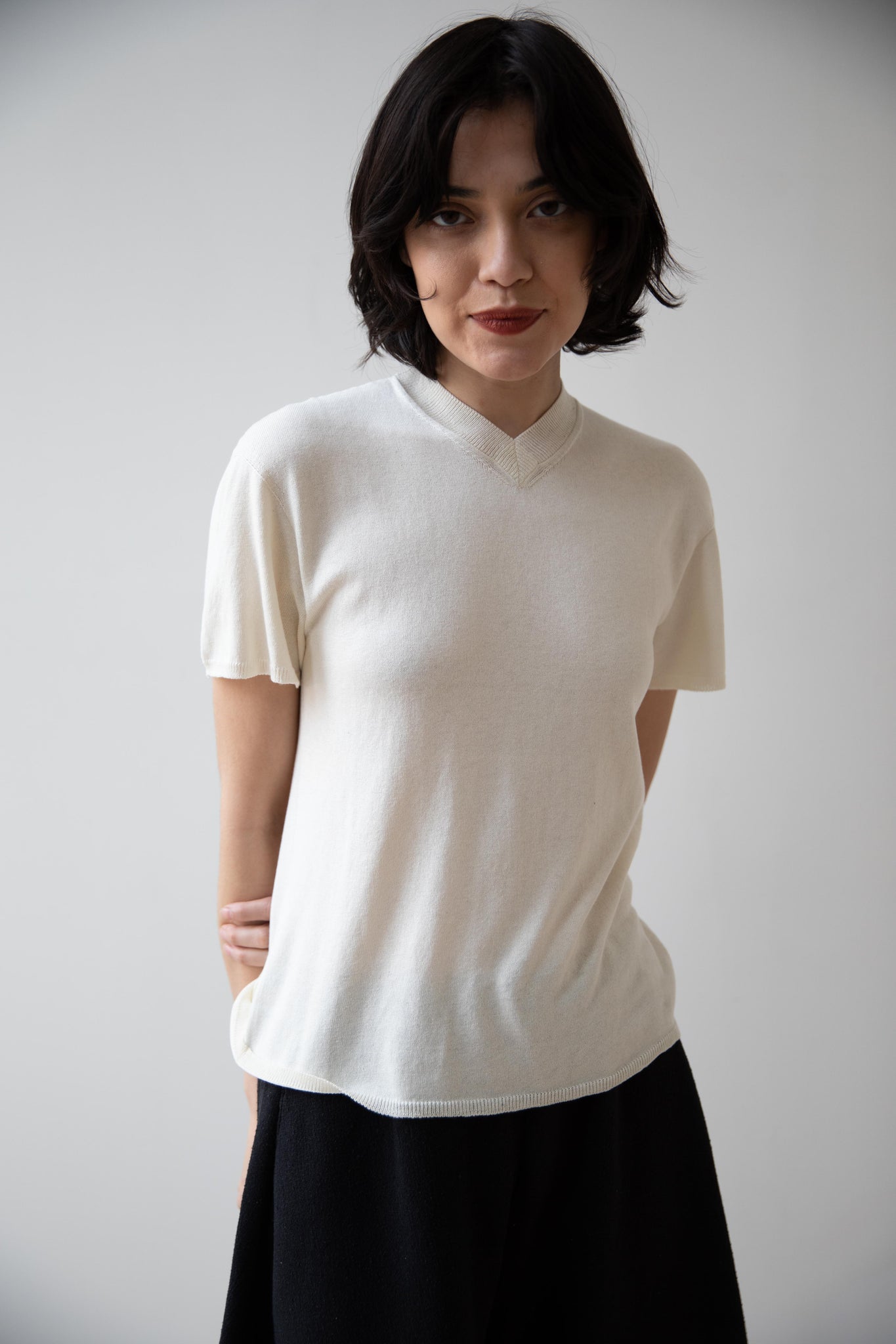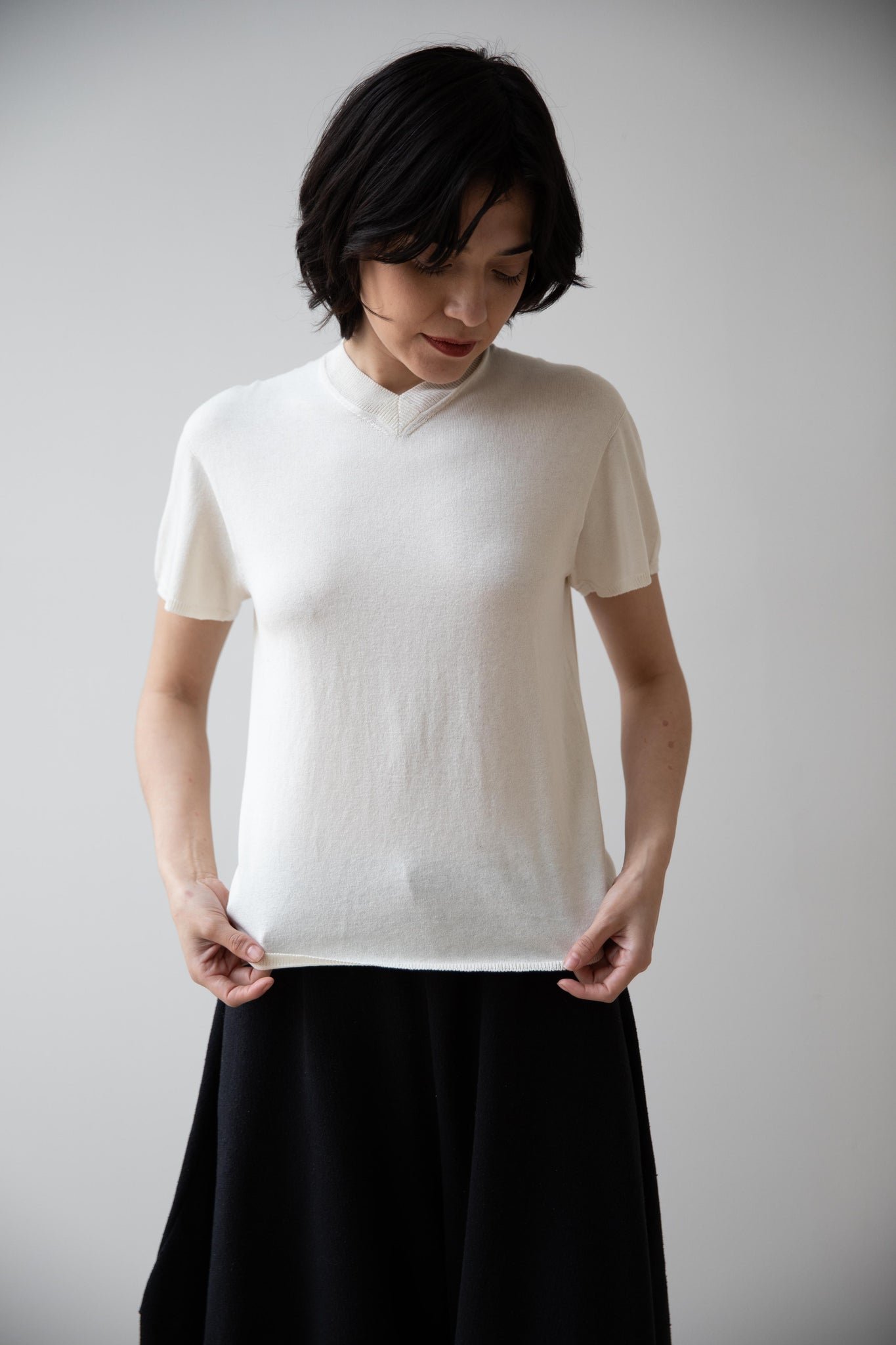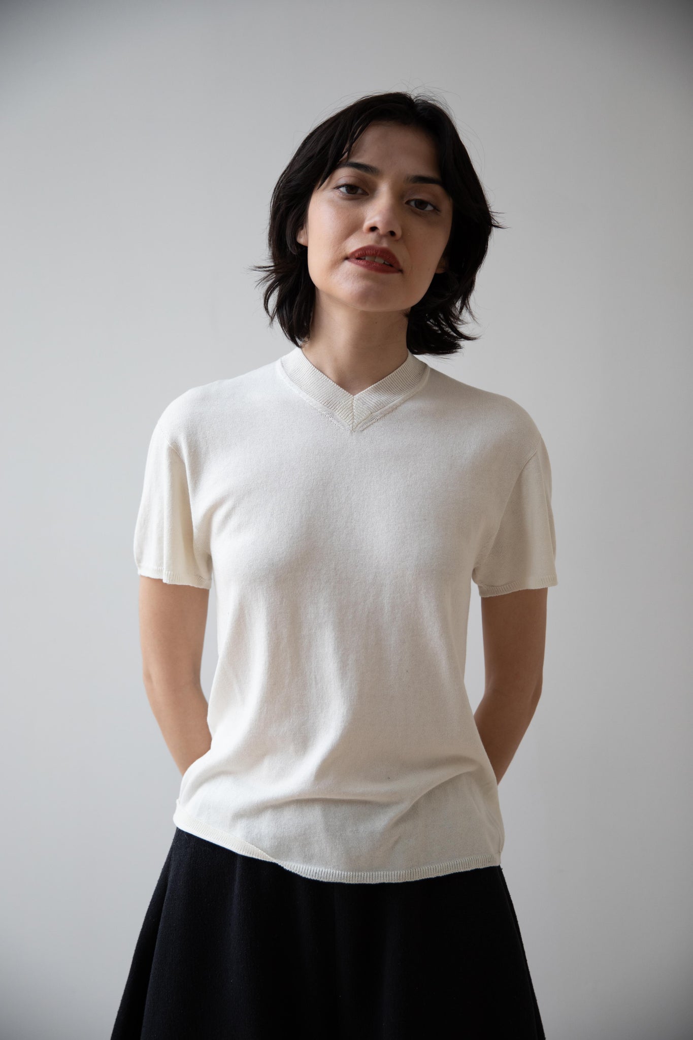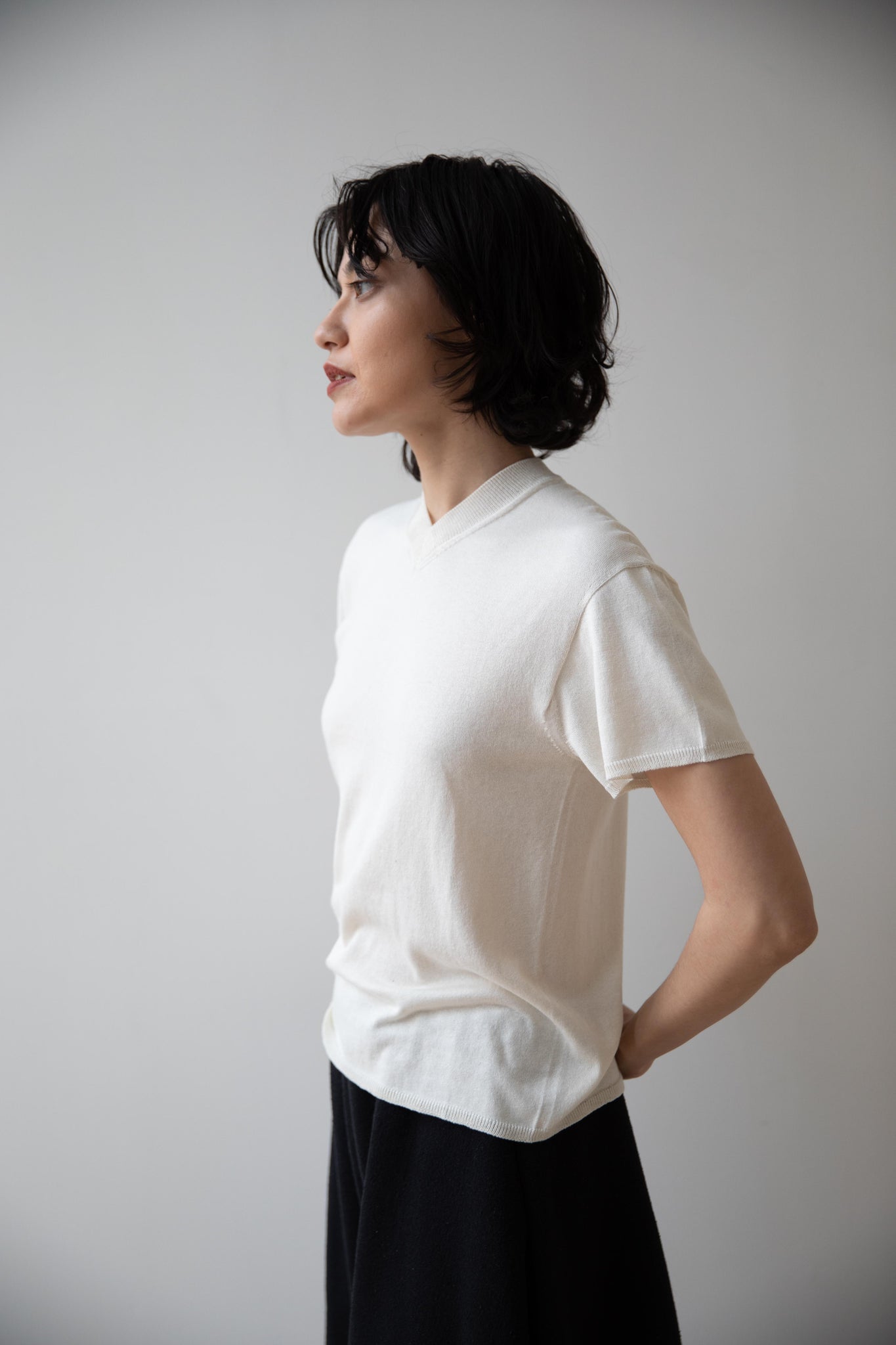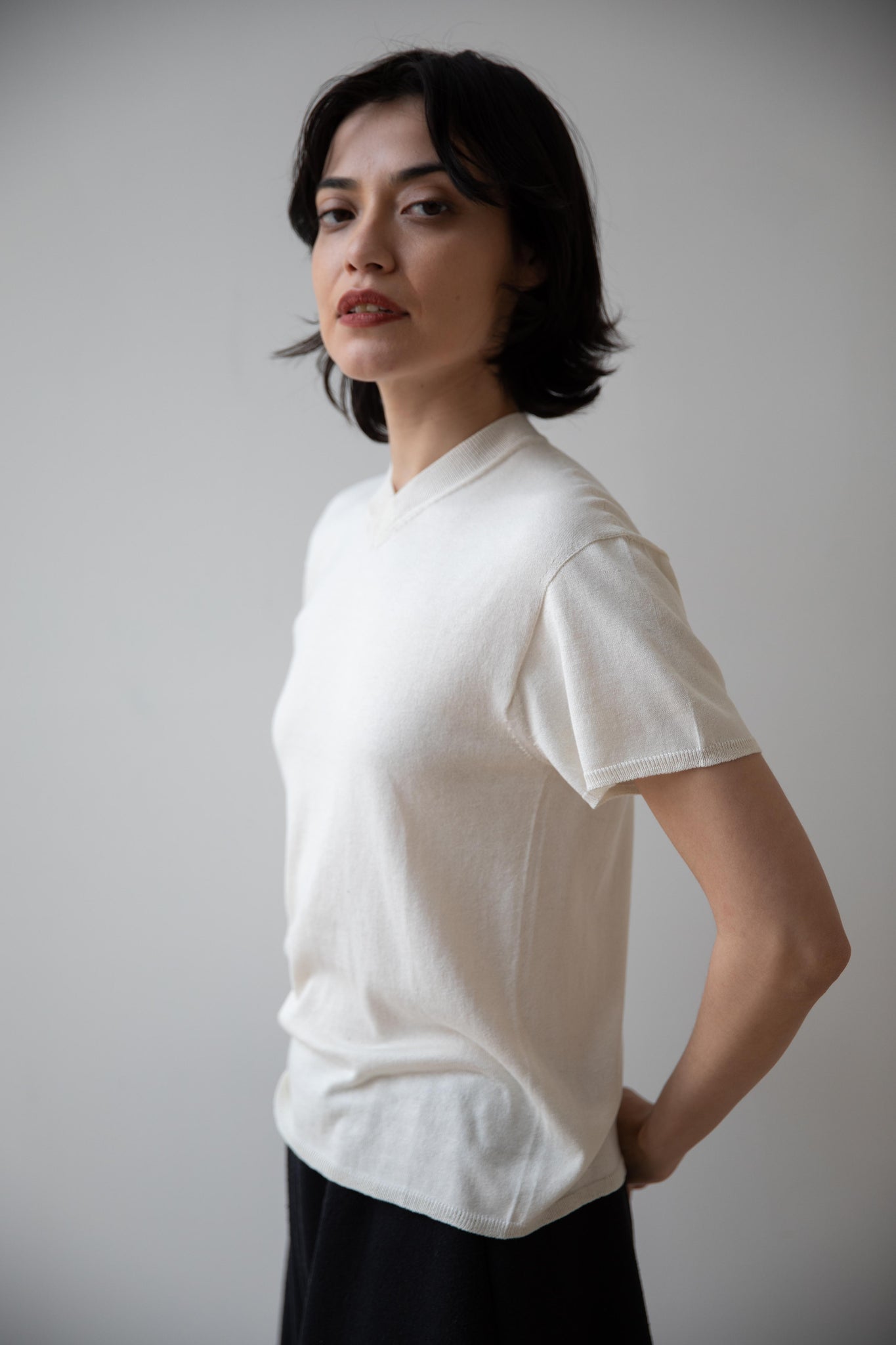 This fully fashioned t-shirt is made from a beautiful off white cotton silk yarn. It's lightweight and will be perfect for spring and summer wear. The high V neck adds a nice touch to this piece.