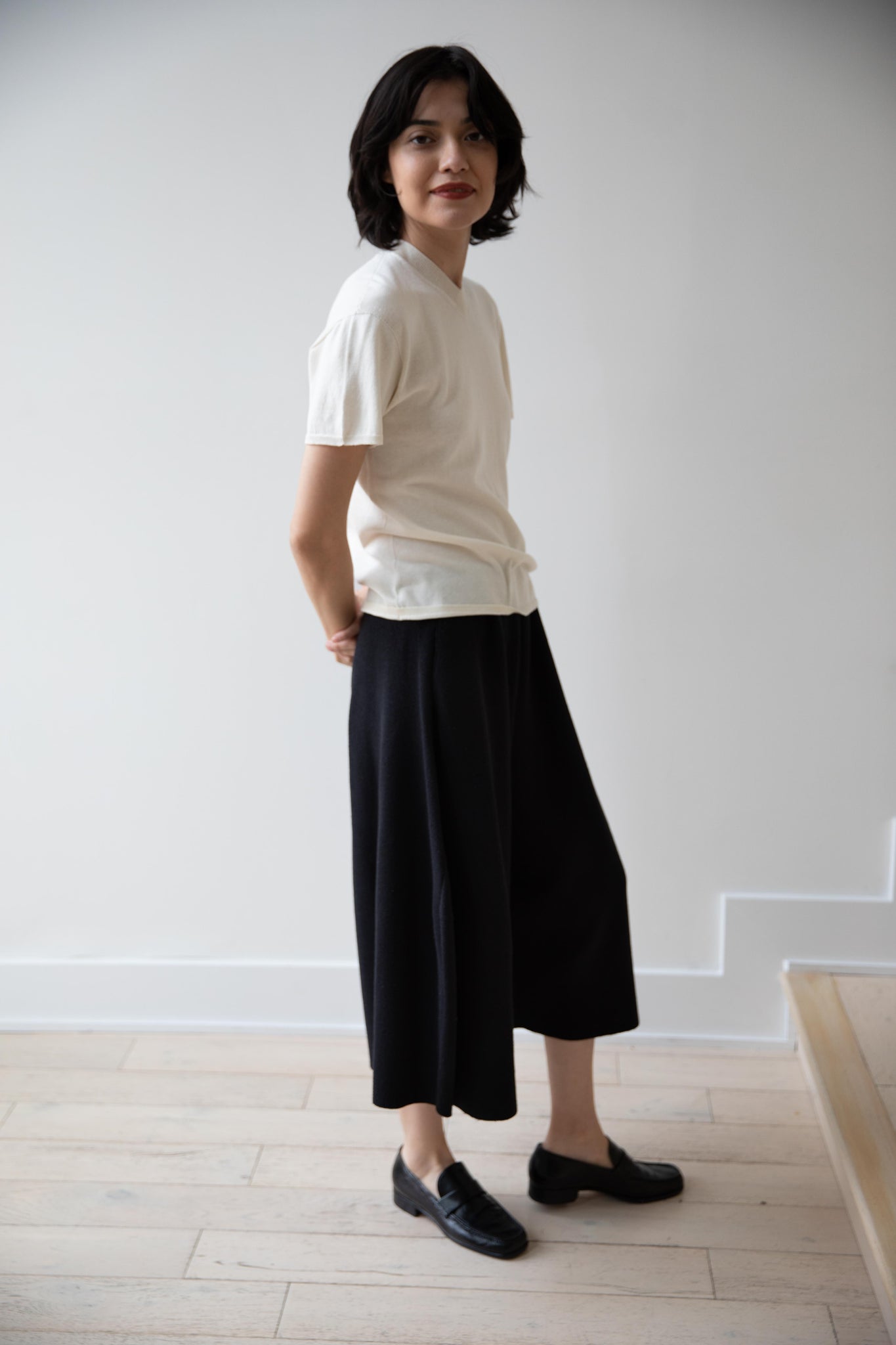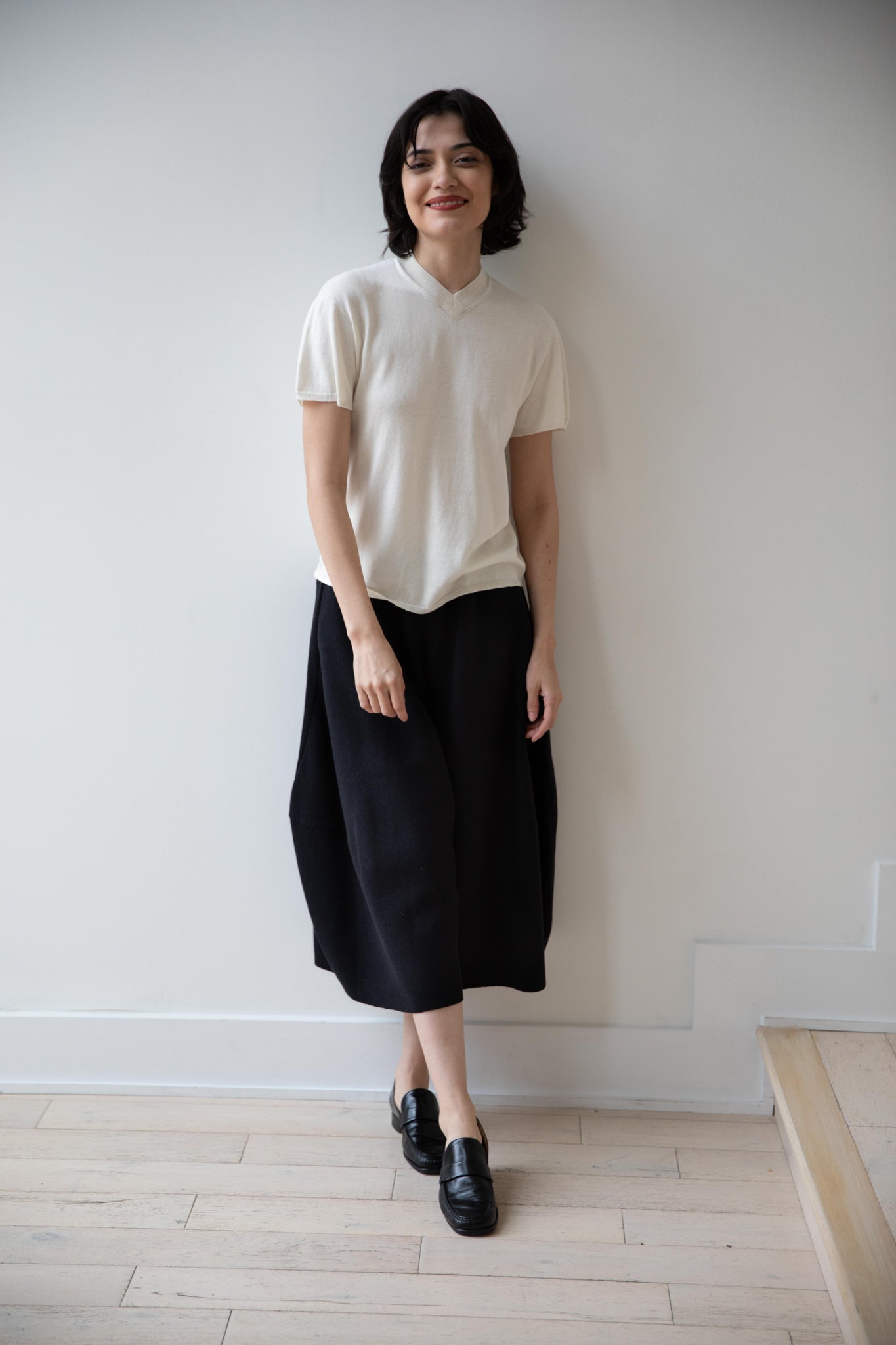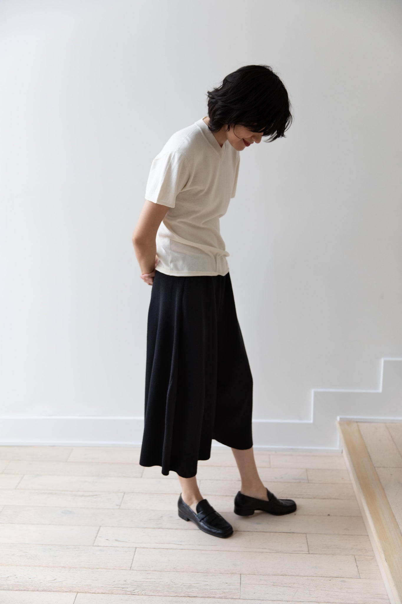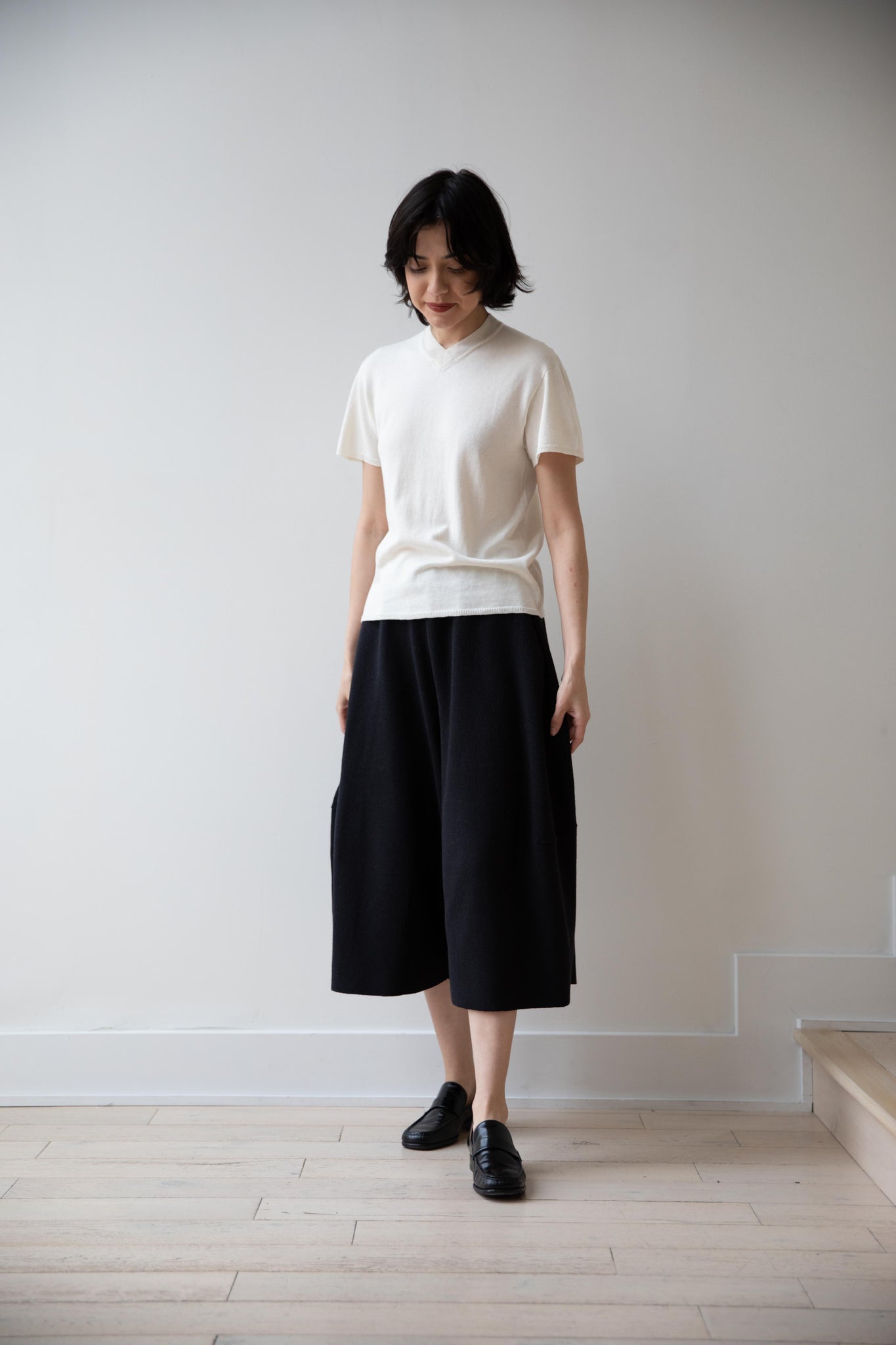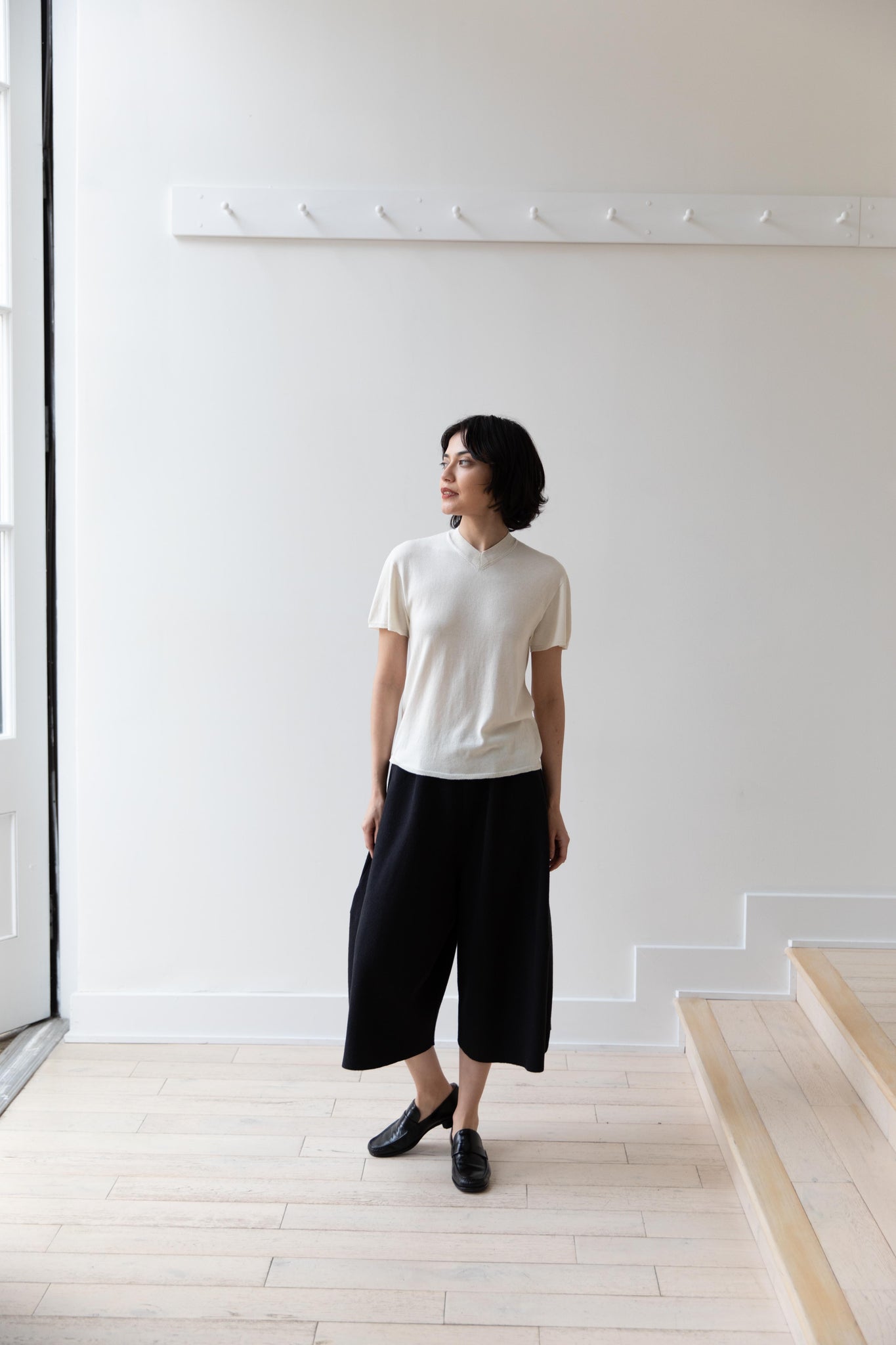This fully fashioned t-shirt is made from a beautiful off white cotton silk yarn. It's lightweight and will be perfect for spring and summer wear. The high V neck adds a nice touch to this piece.