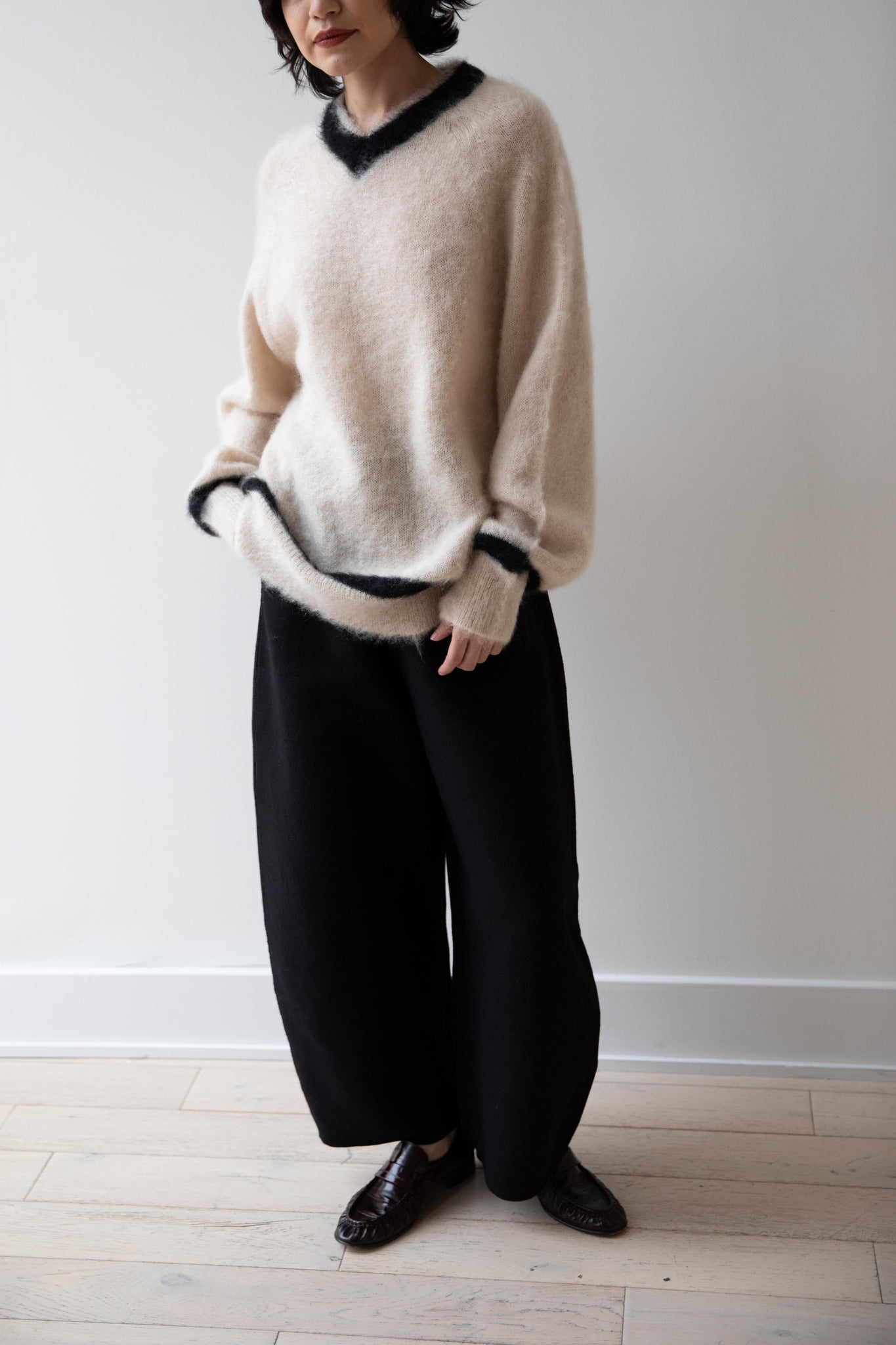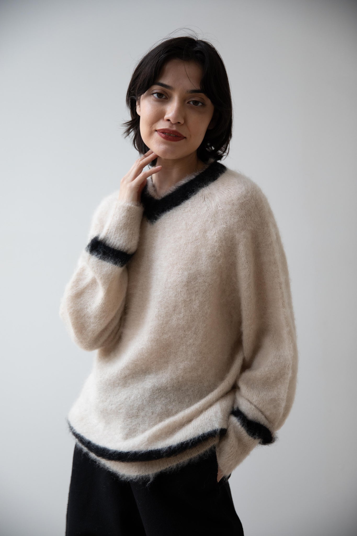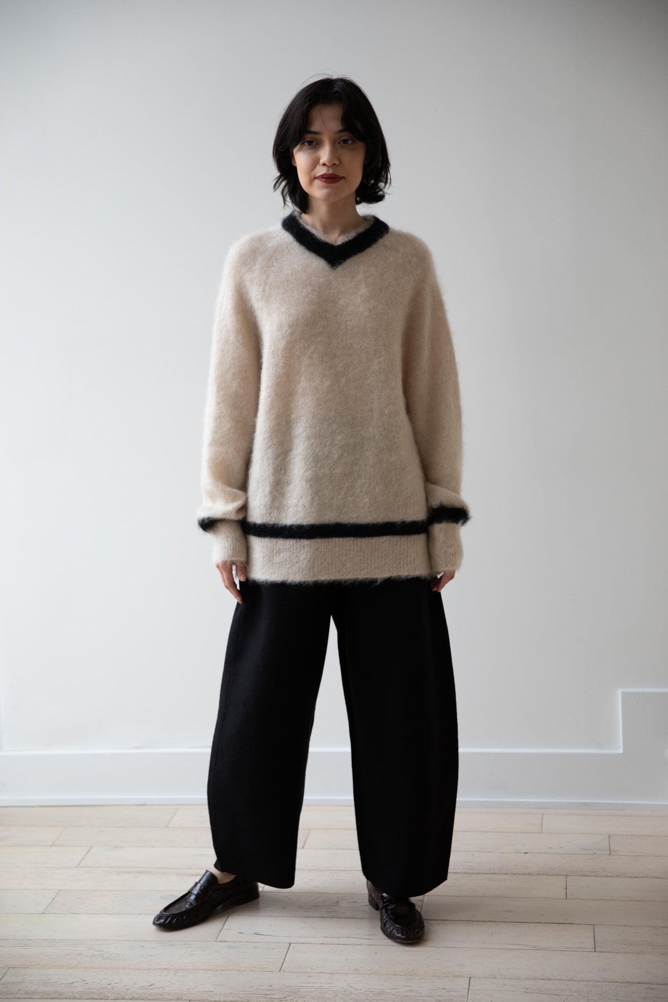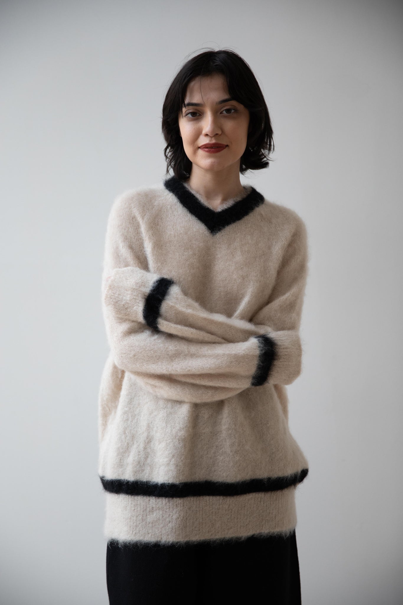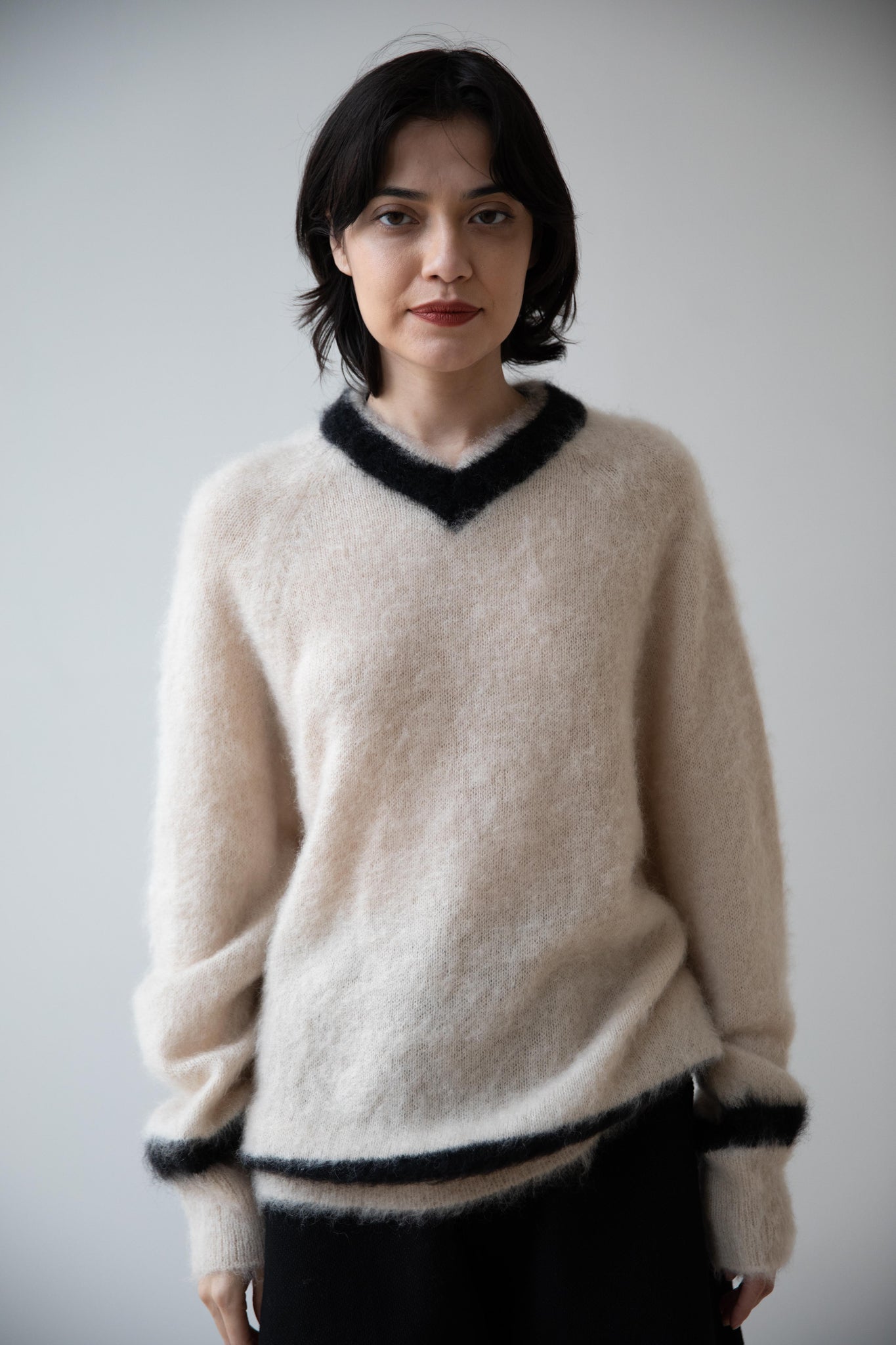 We love this take on a cricket sweater! It has a high V-neck and contrasting stripe at the neck and hemline. The mohair gives a nice fluffy finish, making it a perfect in between season piece. We also love the elongated cut, perfect for layering over a silk or cupro trouser.