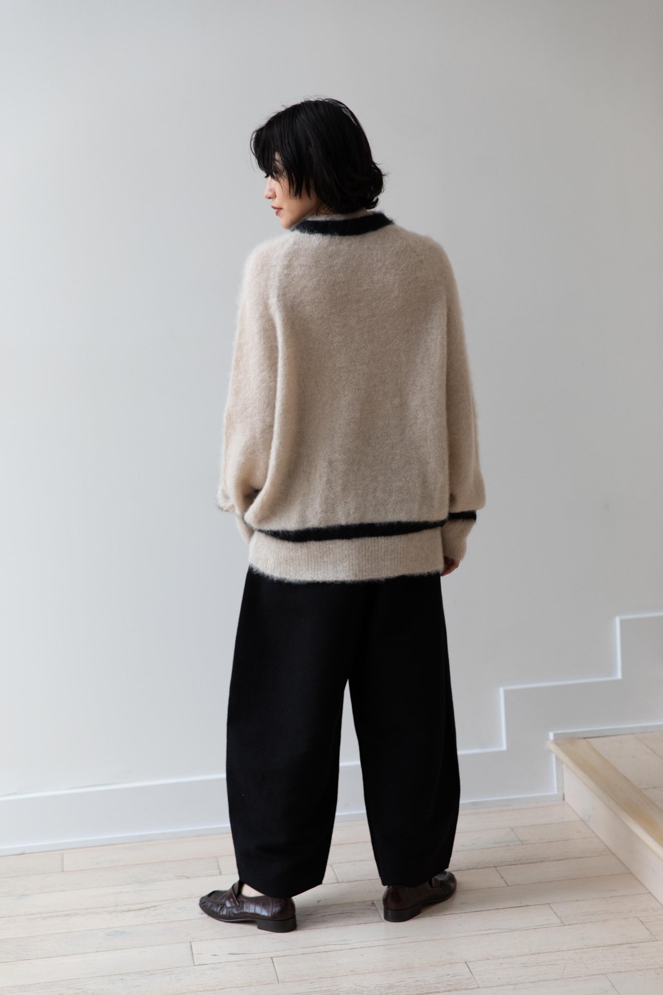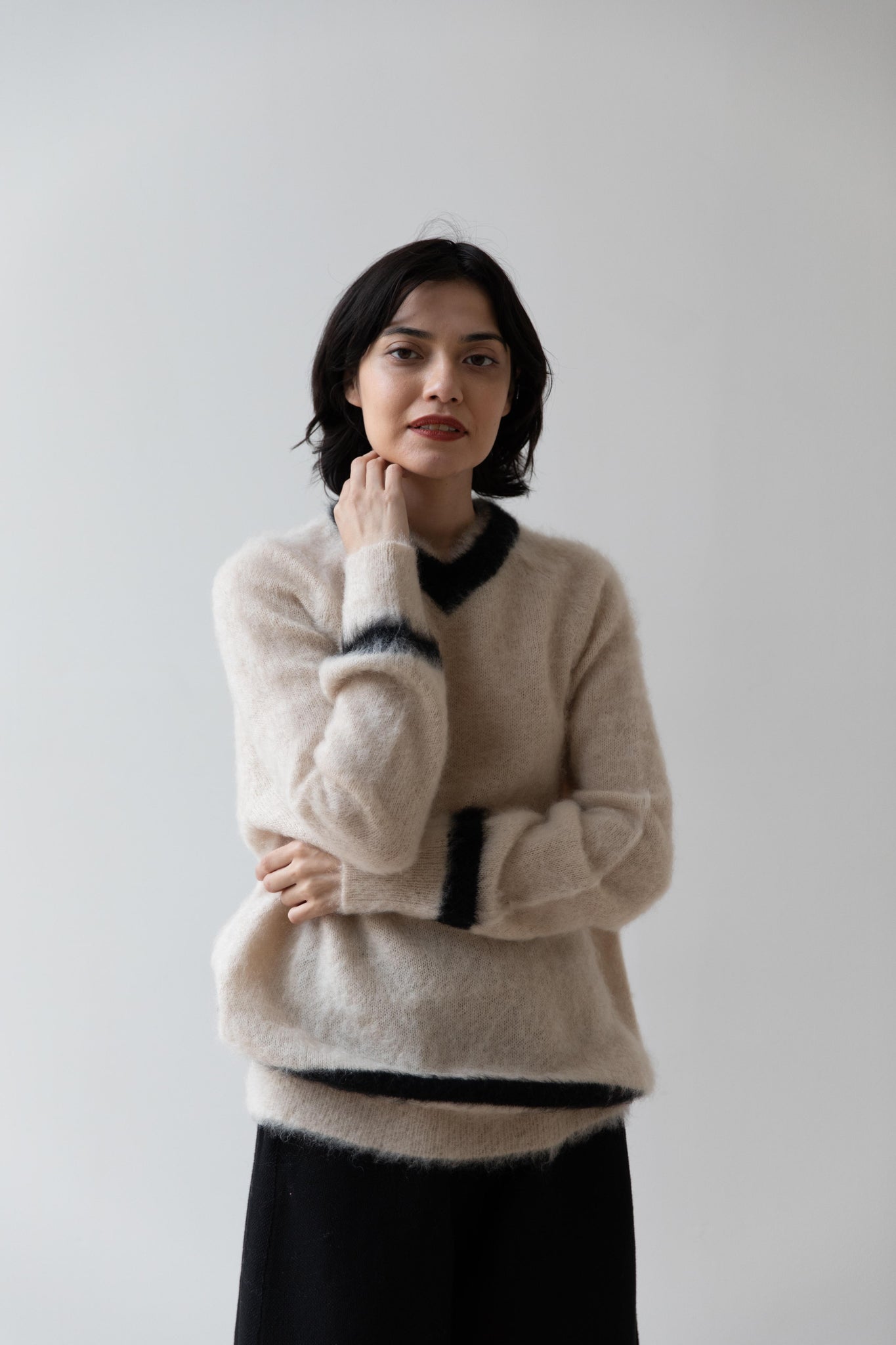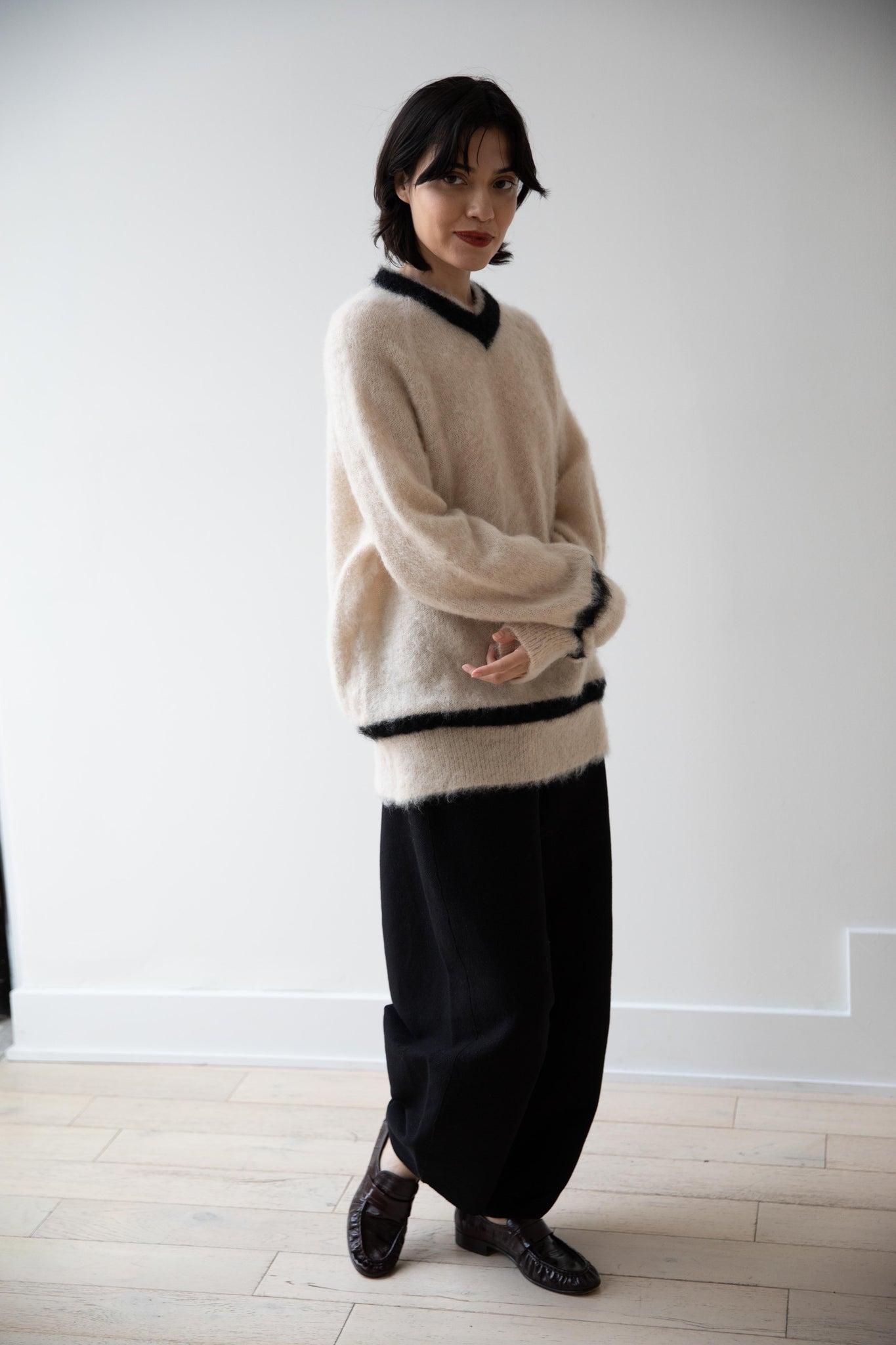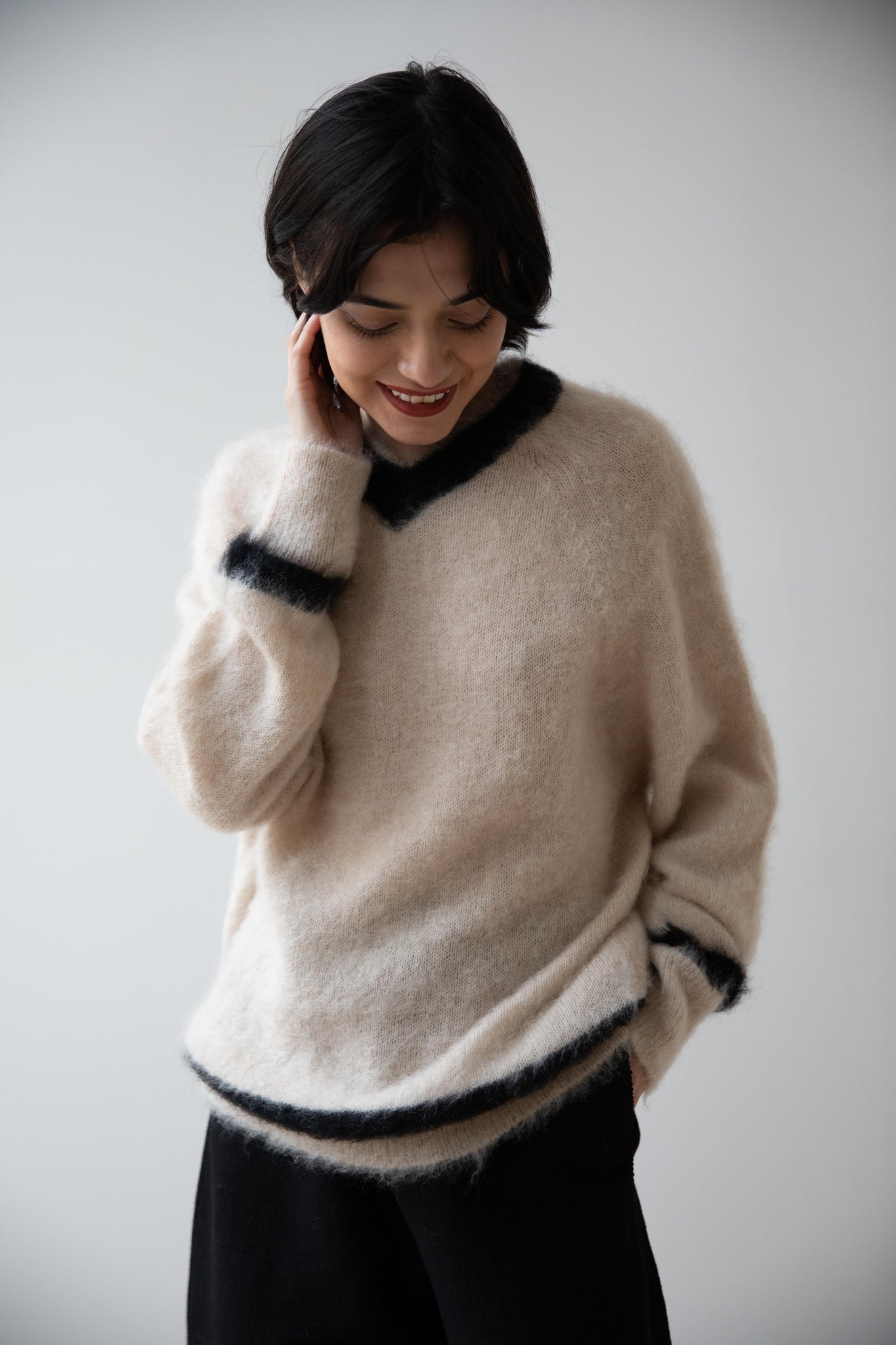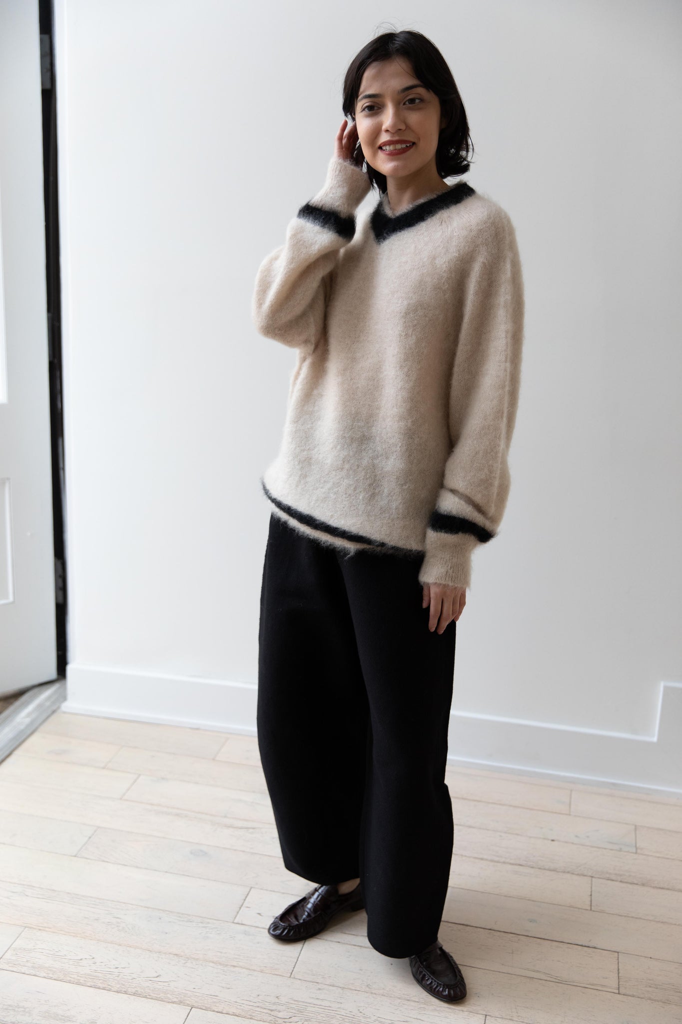 We love this take on a cricket sweater! It has a high V-neck and contrasting stripe at the neck and hemline. The mohair gives a nice fluffy finish, making it a perfect in between season piece. We also love the elongated cut, perfect for layering over a silk or cupro trouser.
