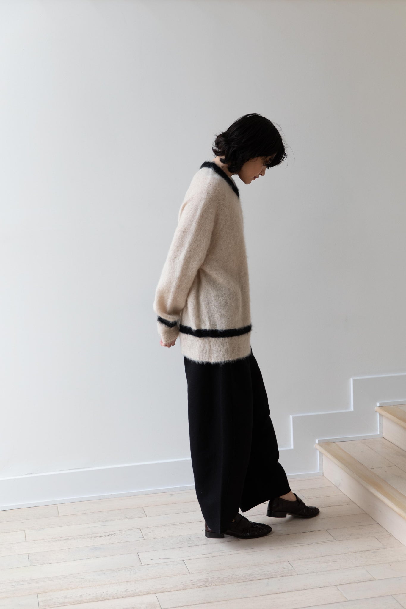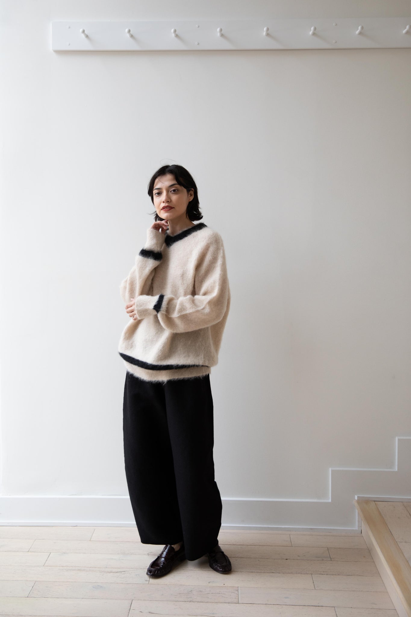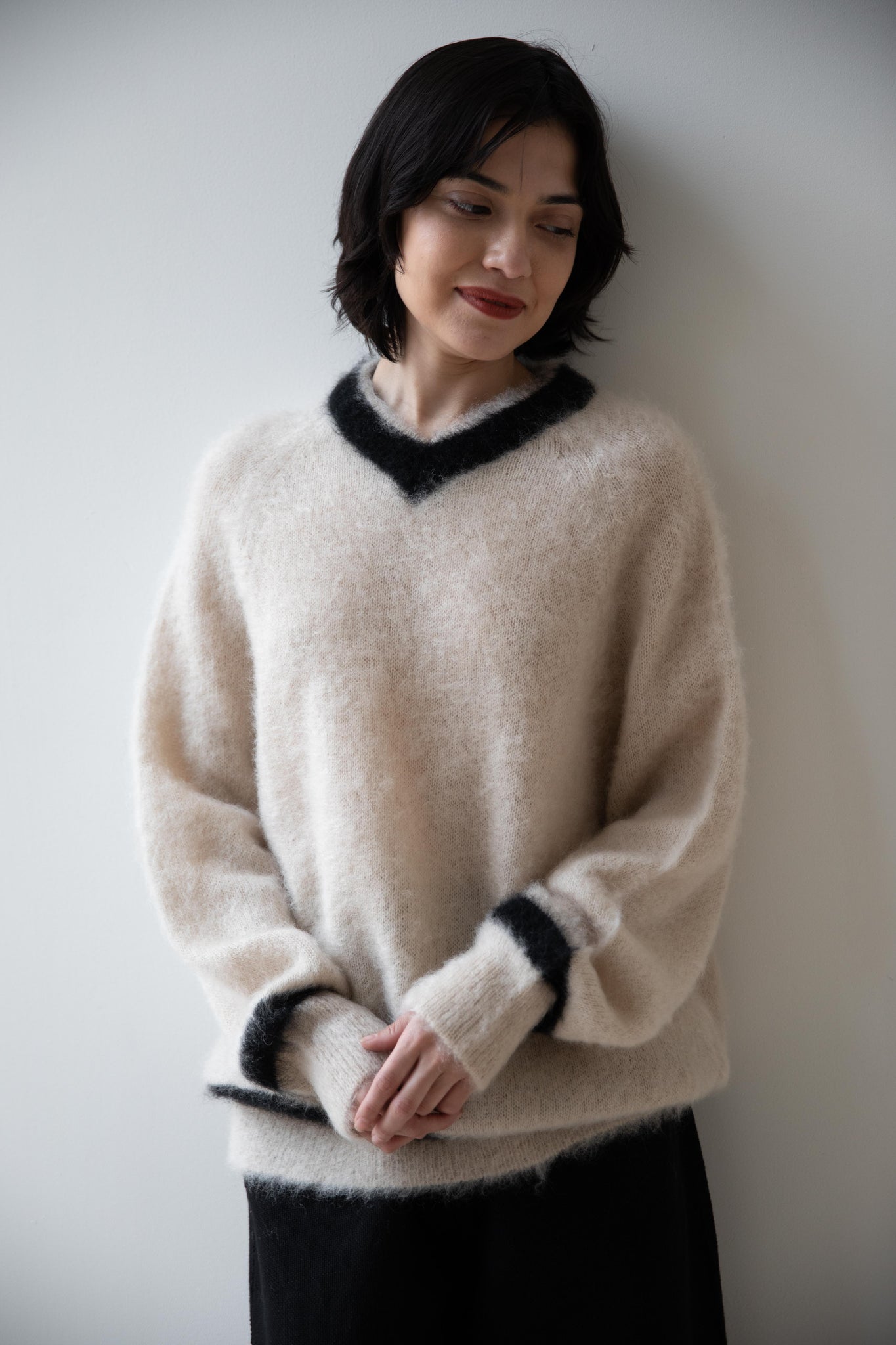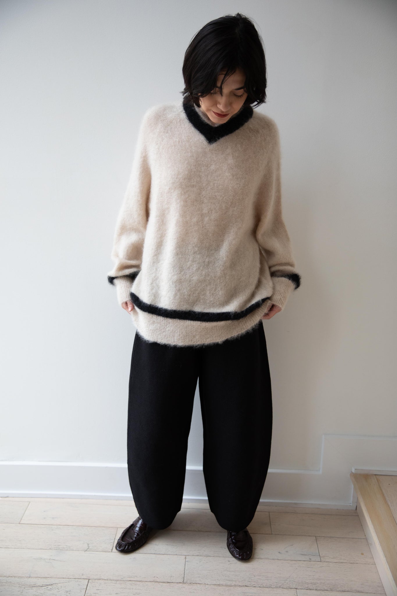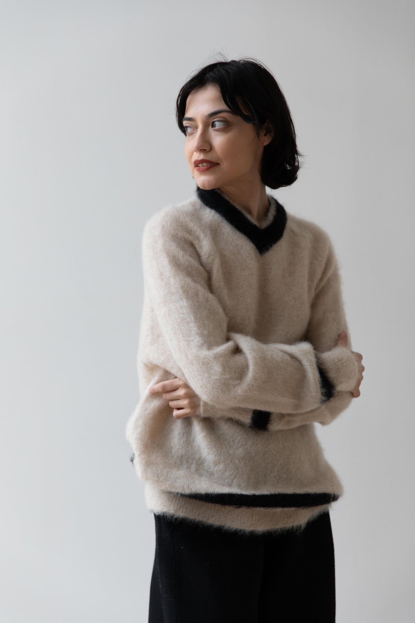 We love this take on a cricket sweater! It has a high V-neck and contrasting stripe at the neck and hemline. The mohair gives a nice fluffy finish, making it a perfect in between season piece. We also love the elongated cut, perfect for layering over a silk or cupro trouser.