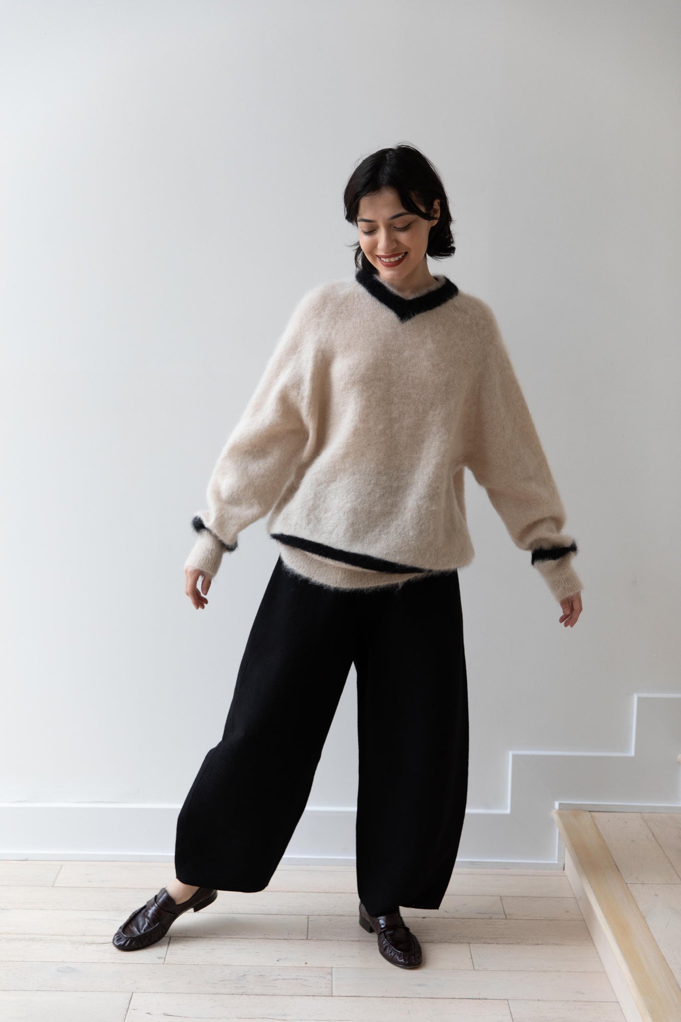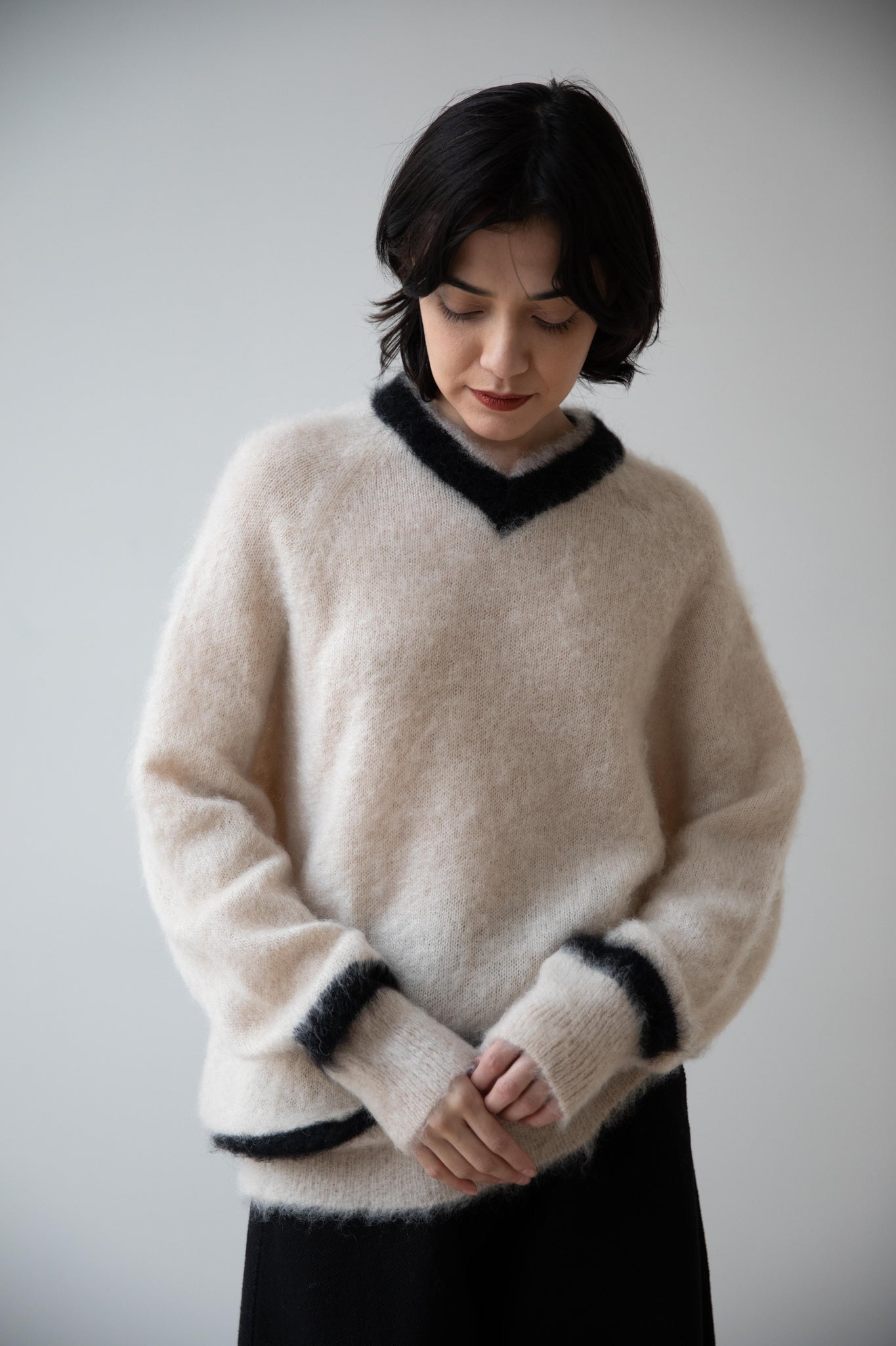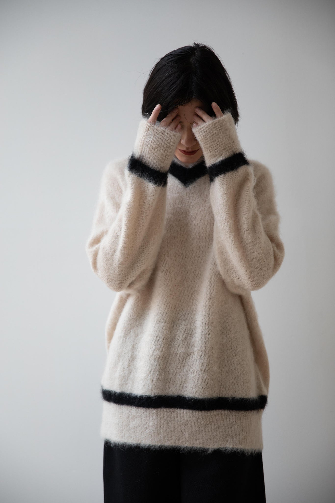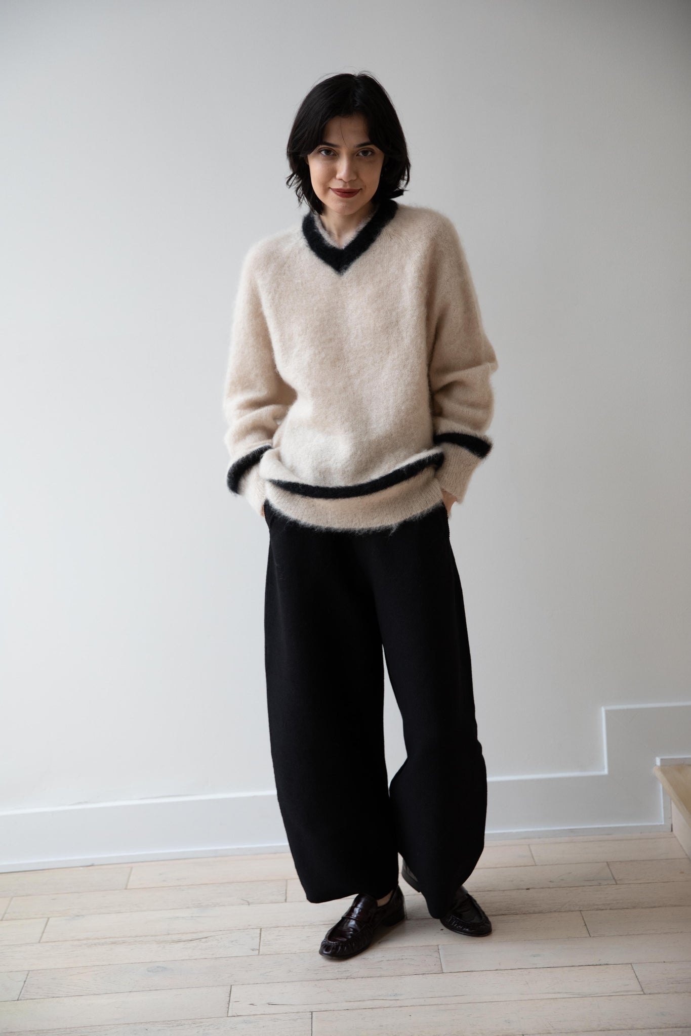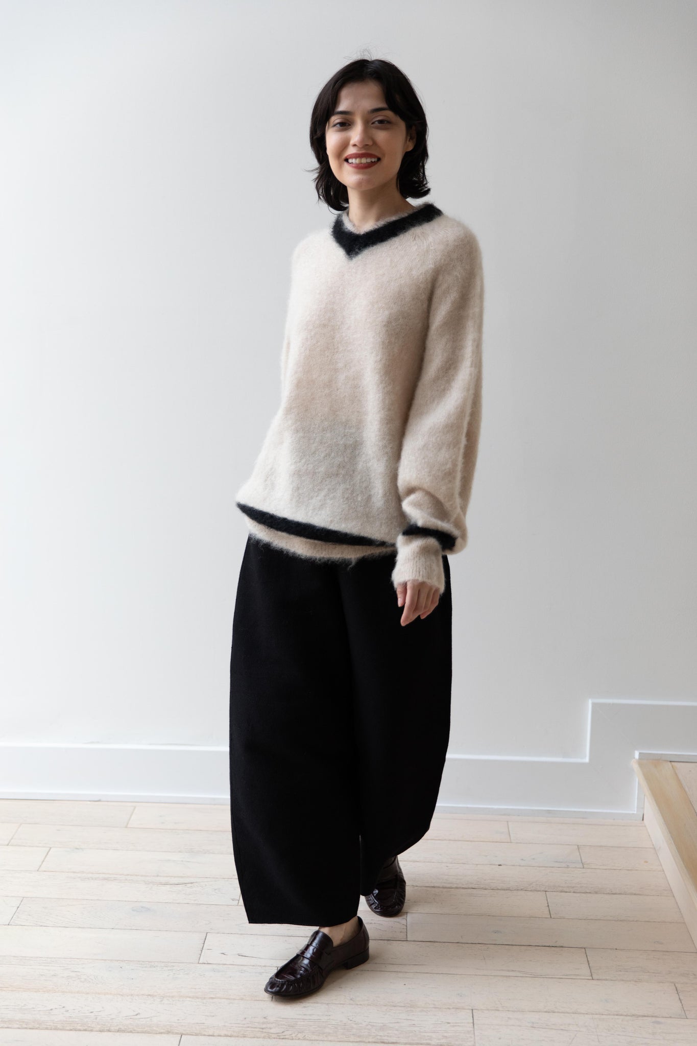 We love this take on a cricket sweater! It has a high V-neck and contrasting stripe at the neck and hemline. The mohair gives a nice fluffy finish, making it a perfect in between season piece. We also love the elongated cut, perfect for layering over a silk or cupro trouser.