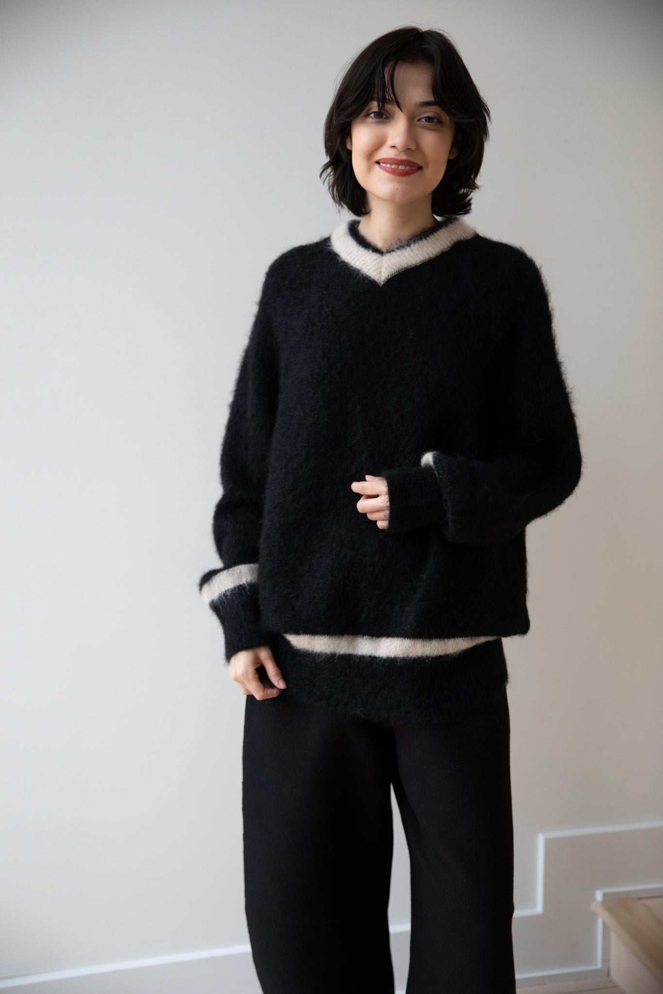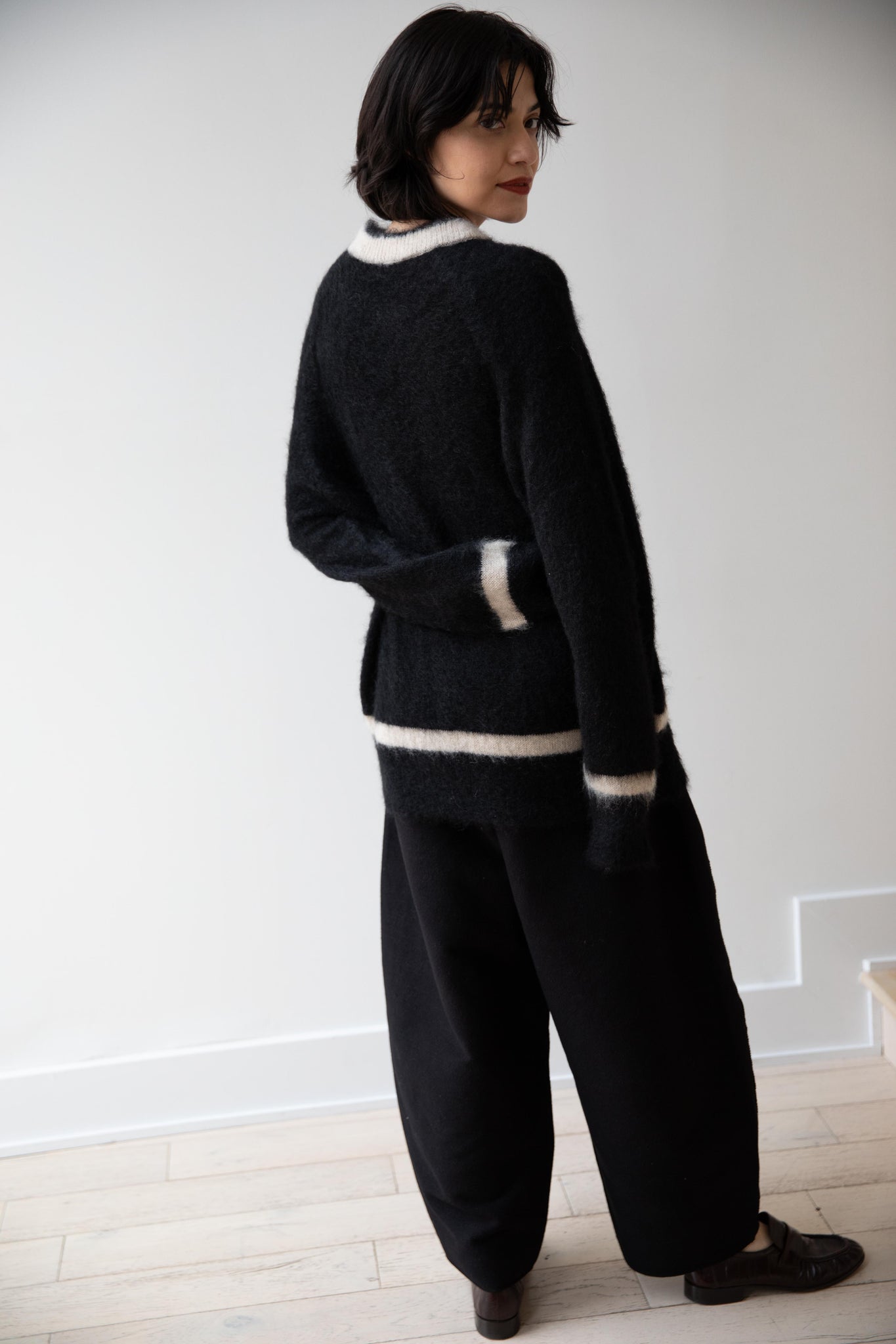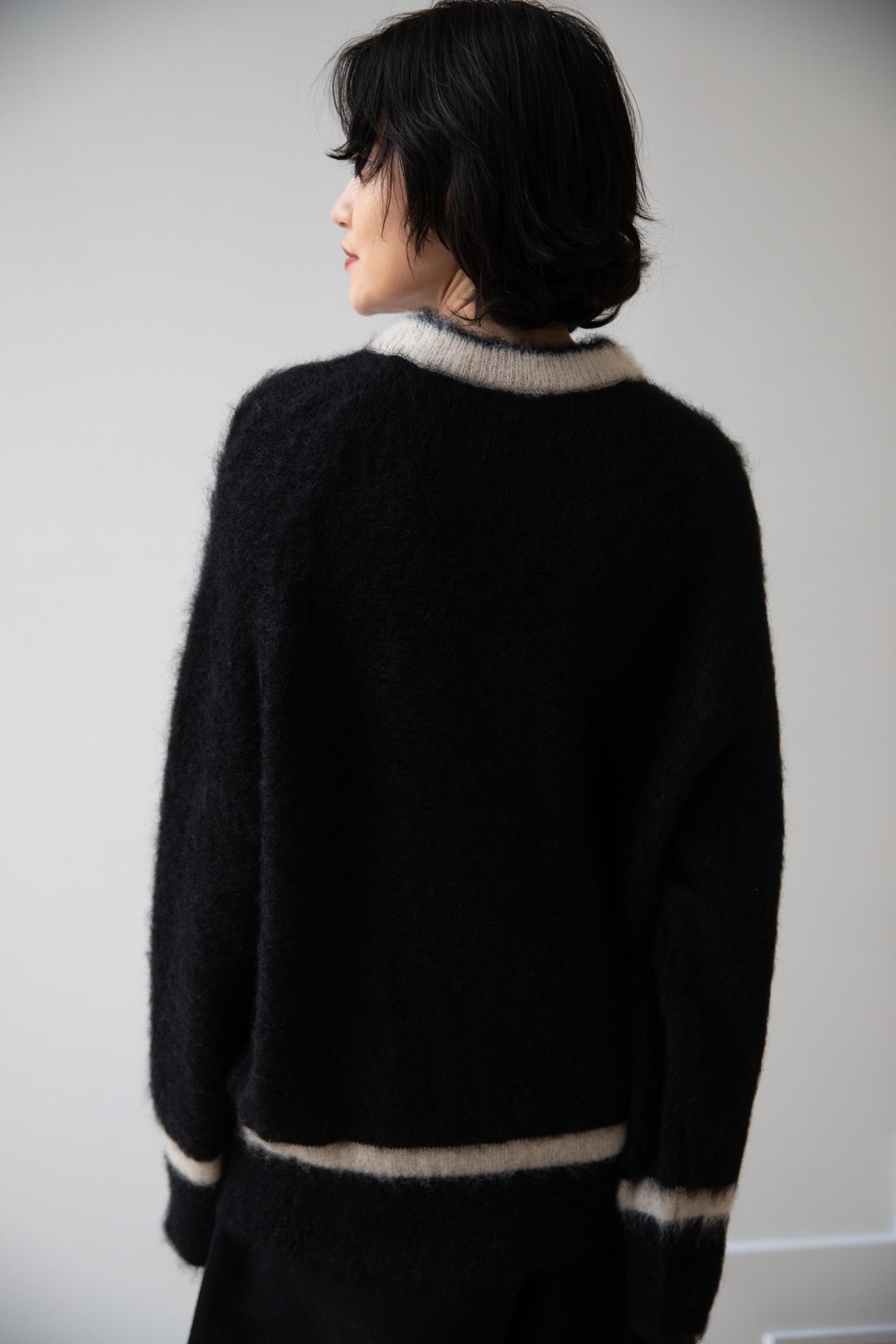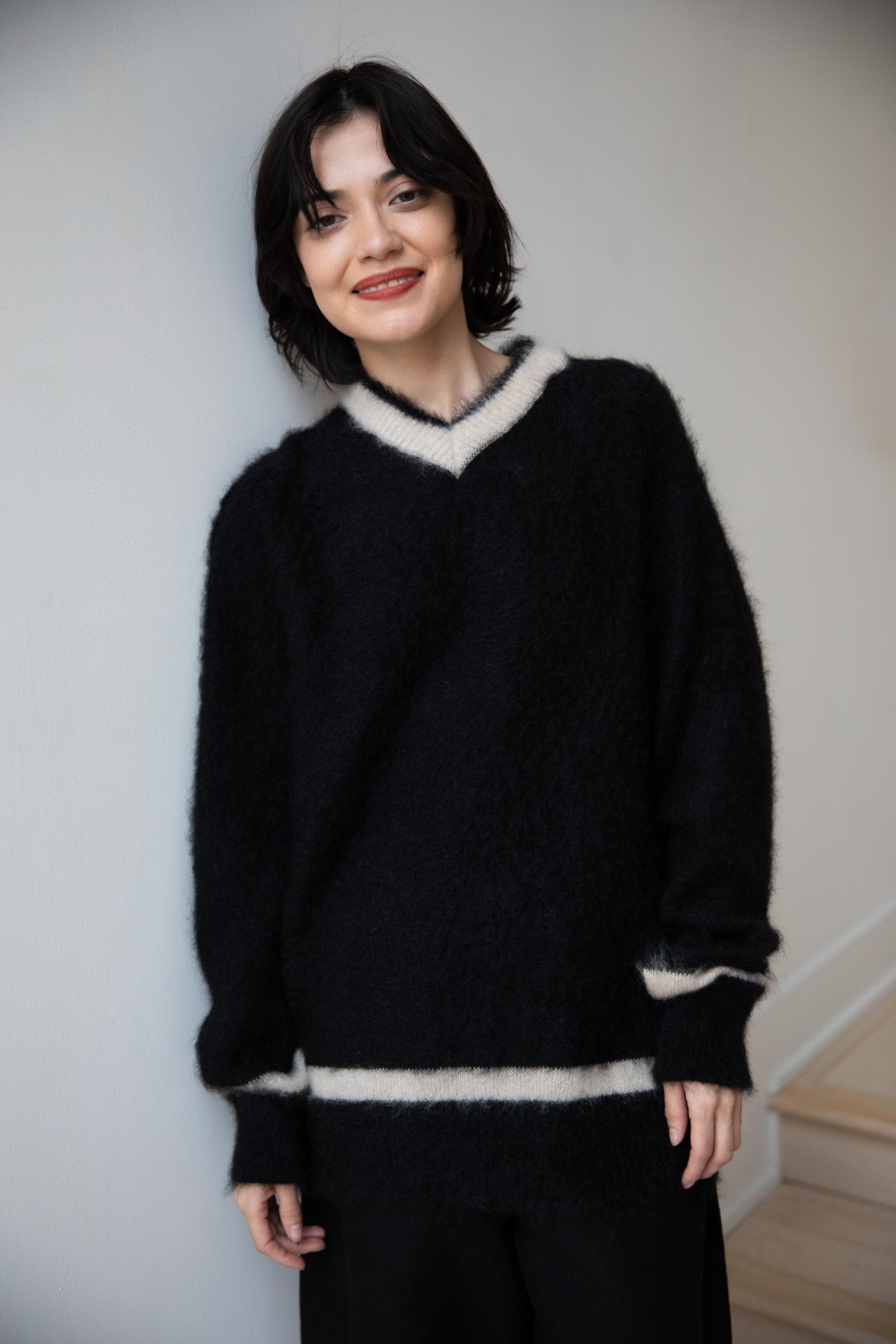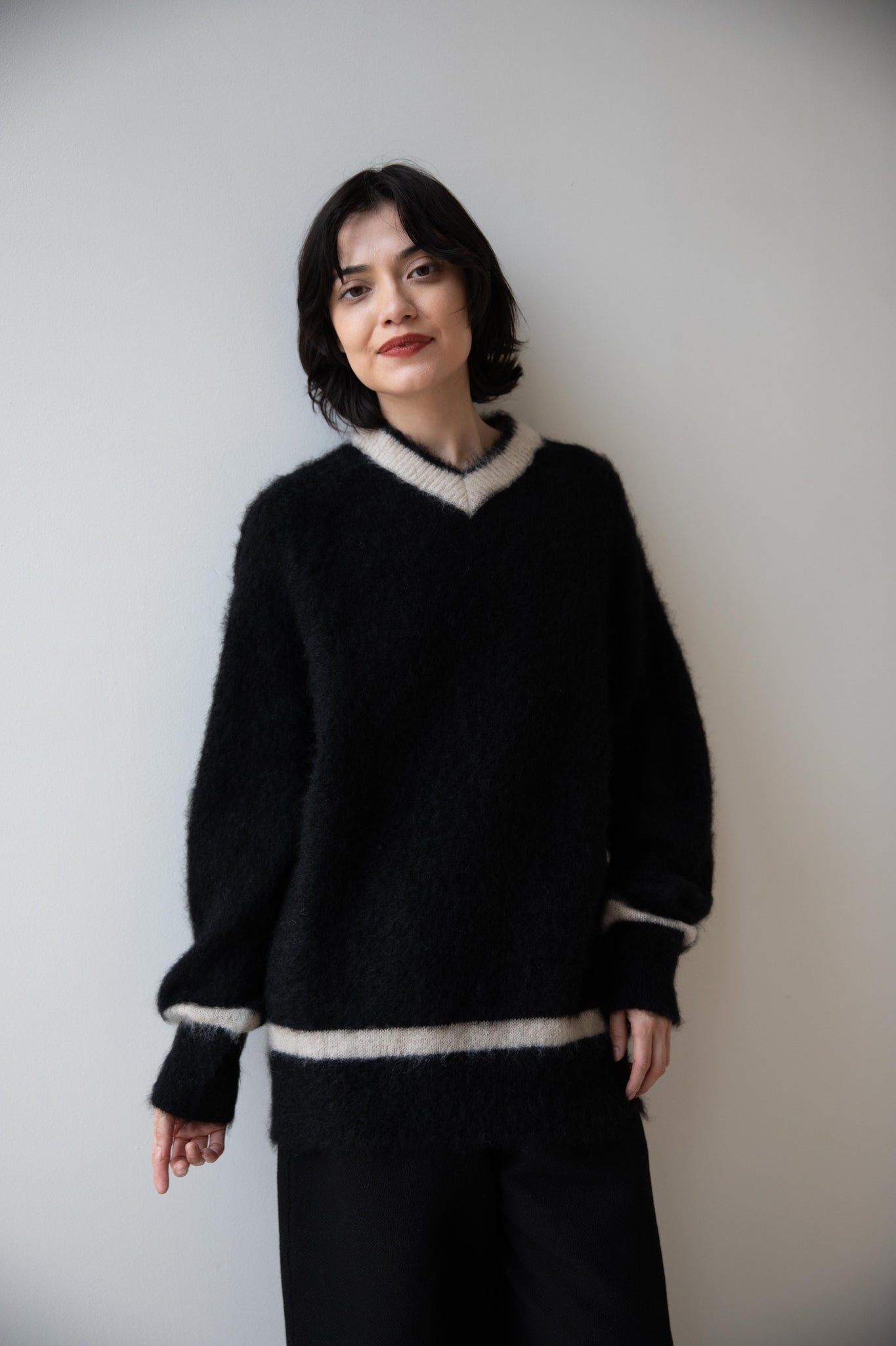 We love this take on a cricket sweater! It has a high V-neck and contrasting stripe at the neck and hemline. The mohair gives a nice fluffy finish, making it a perfect in between season piece. We also love the elongated cut, perfect for layering over a silk or cupro trouser.