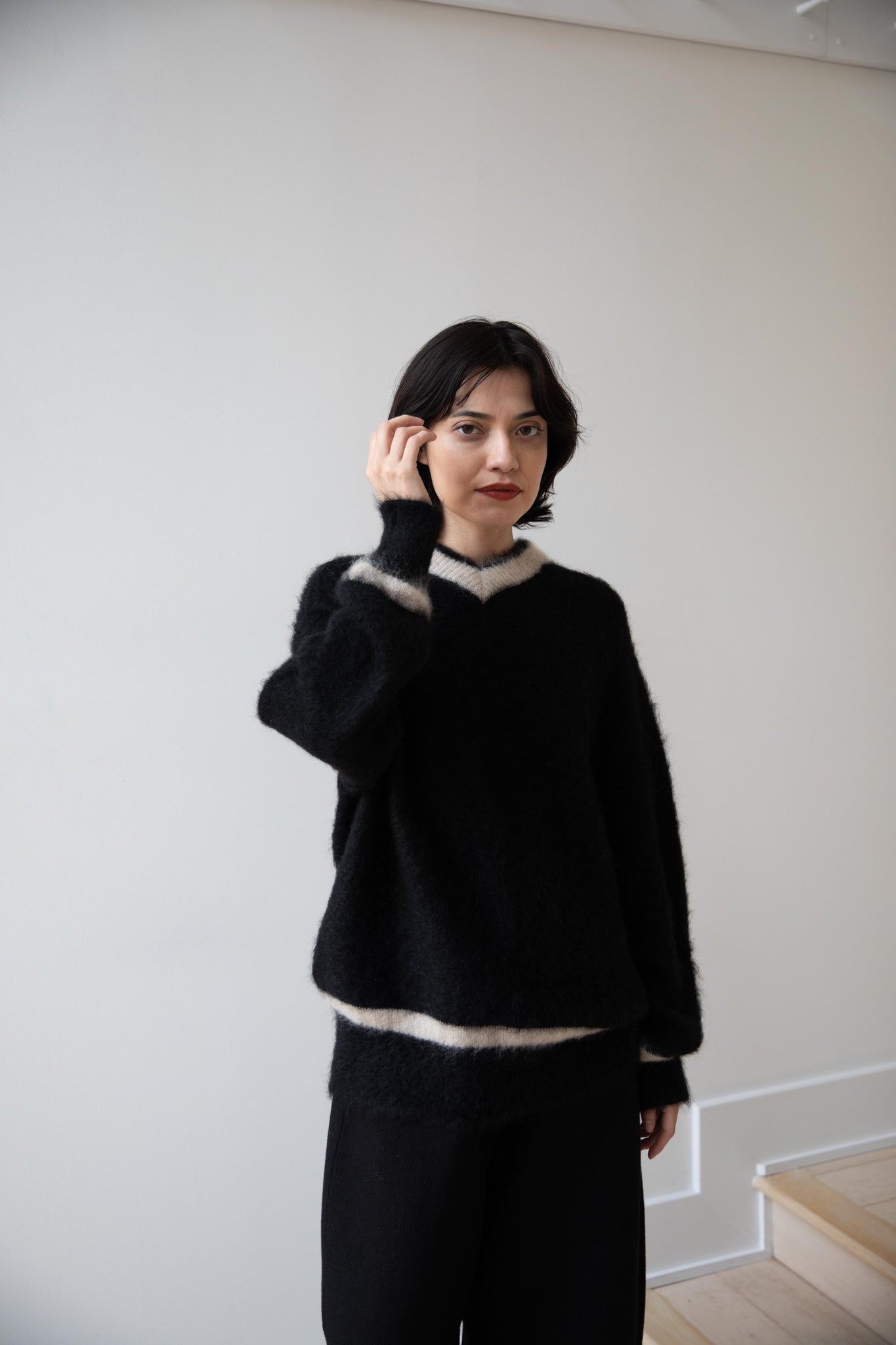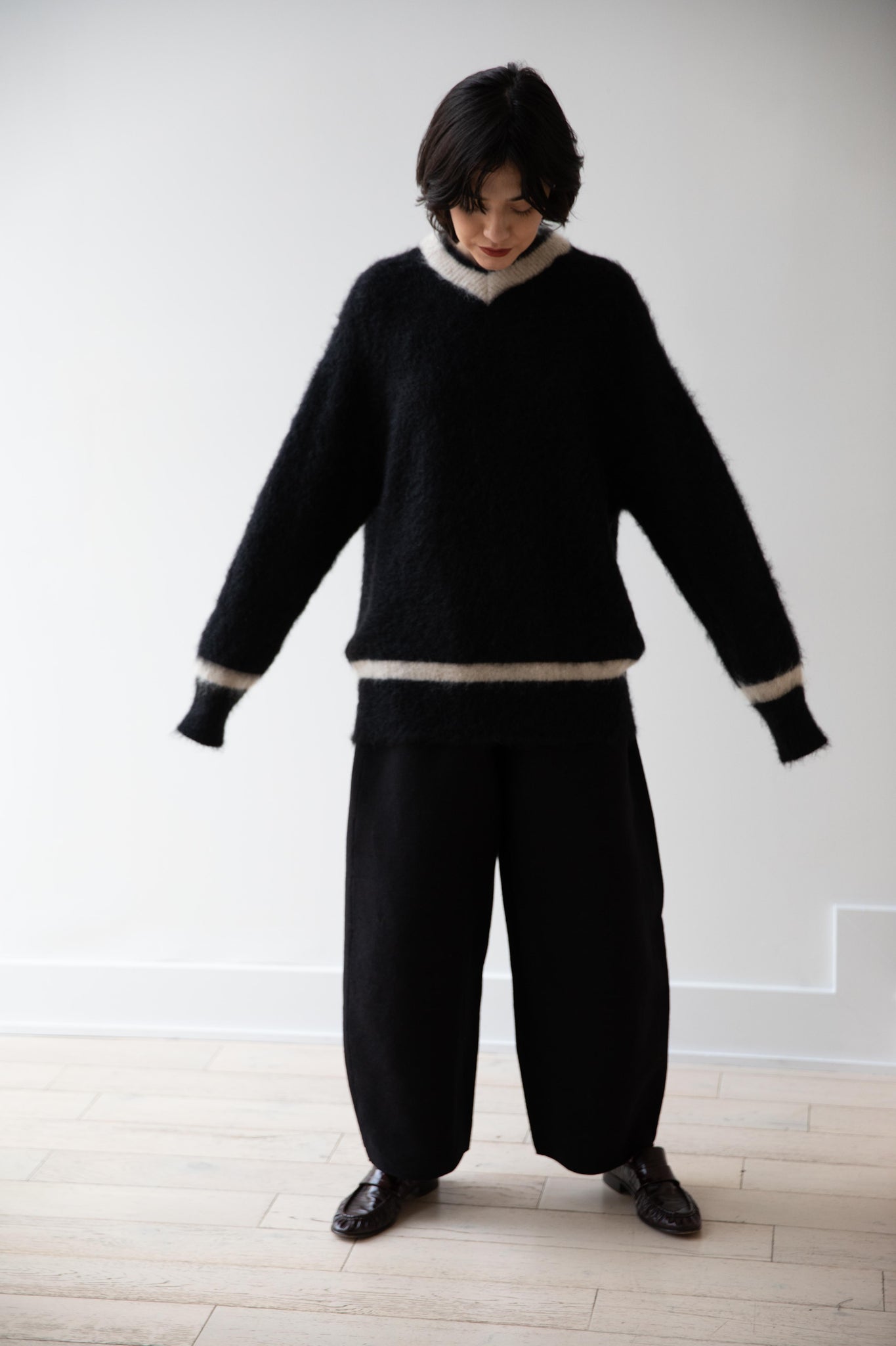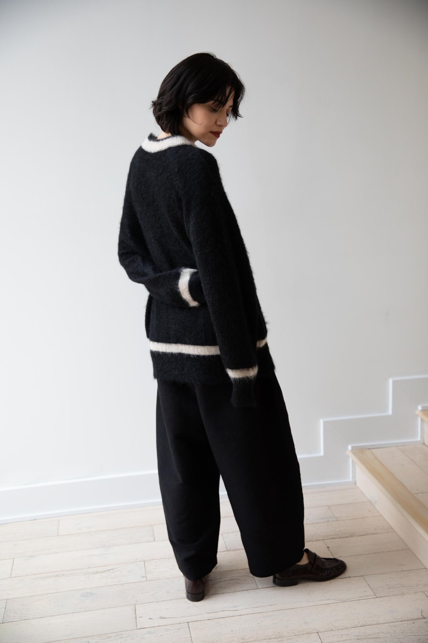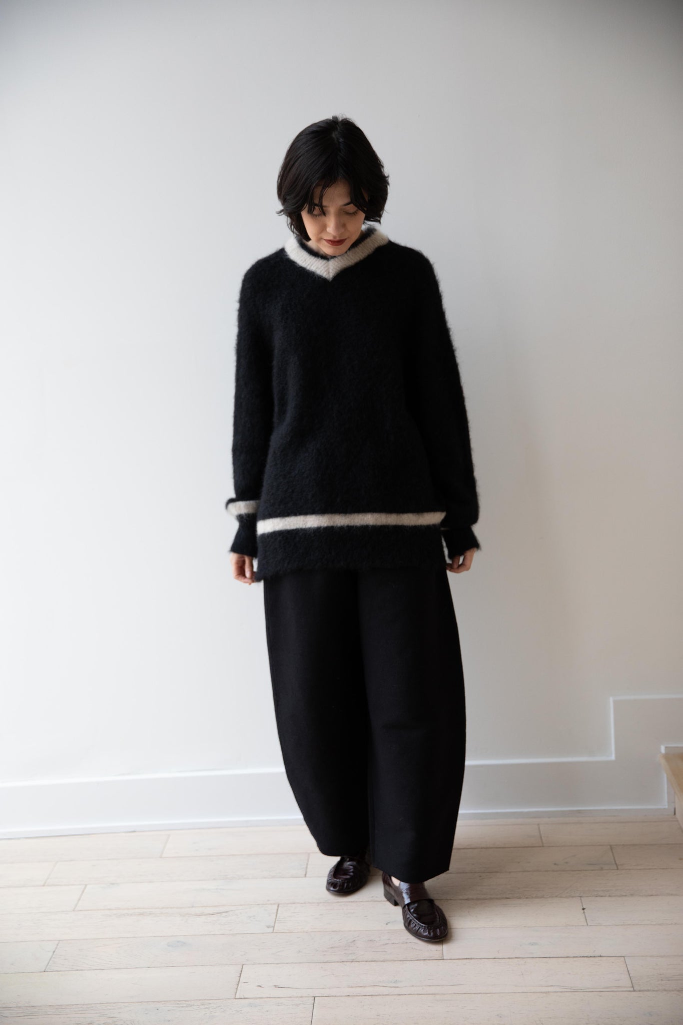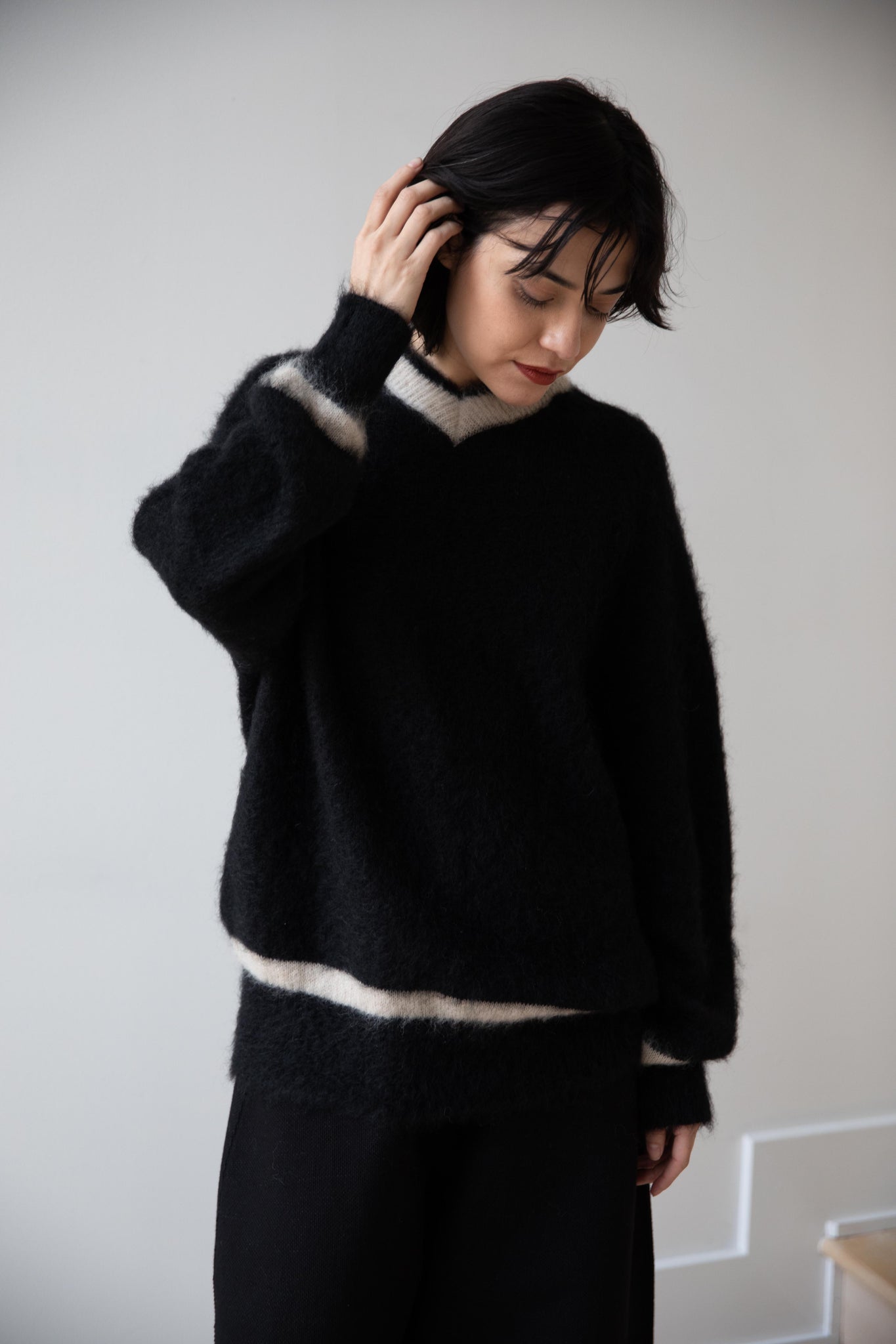 We love this take on a cricket sweater! It has a high V-neck and contrasting stripe at the neck and hemline. The mohair gives a nice fluffy finish, making it a perfect in between season piece. We also love the elongated cut, perfect for layering over a silk or cupro trouser.