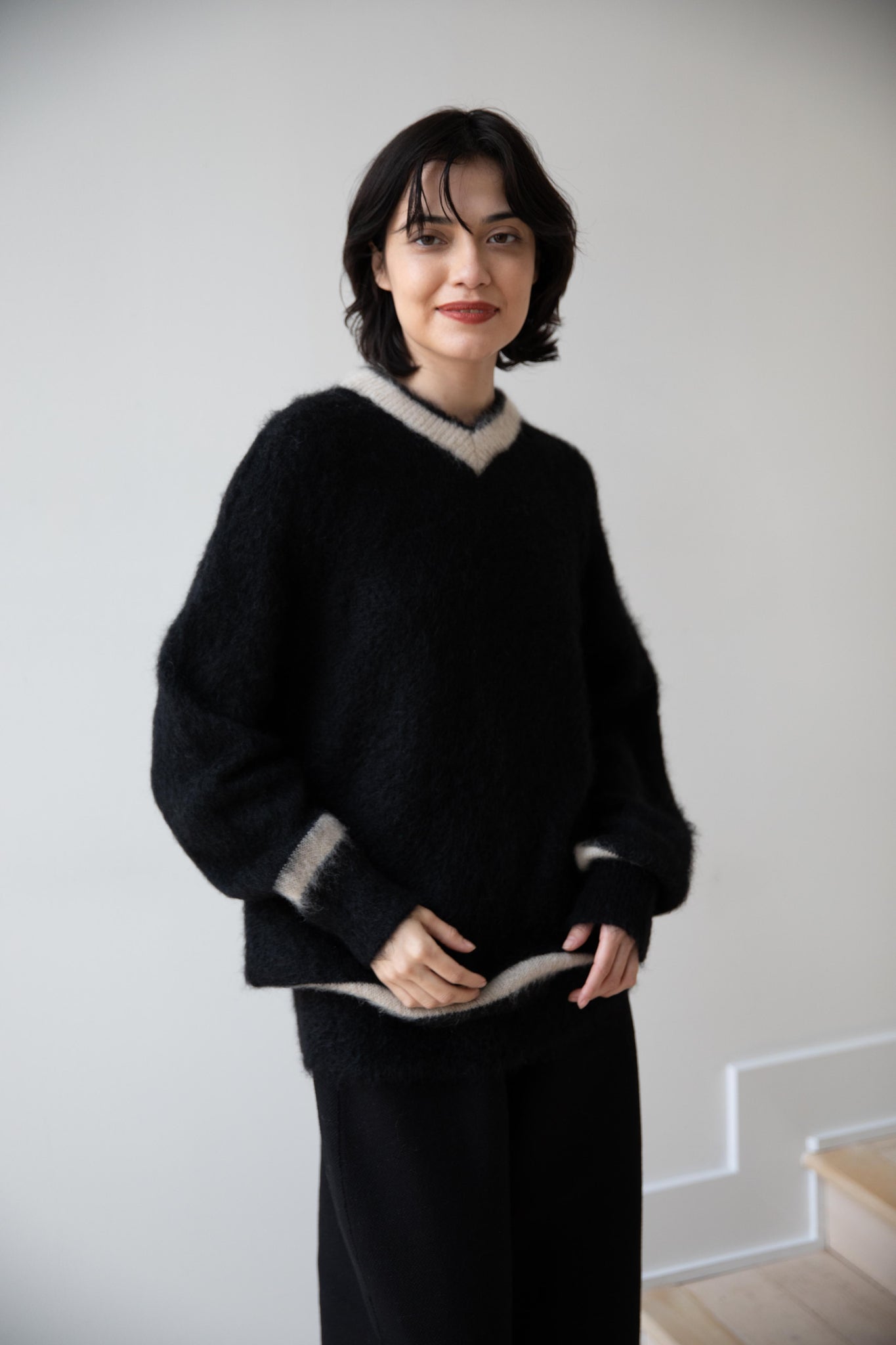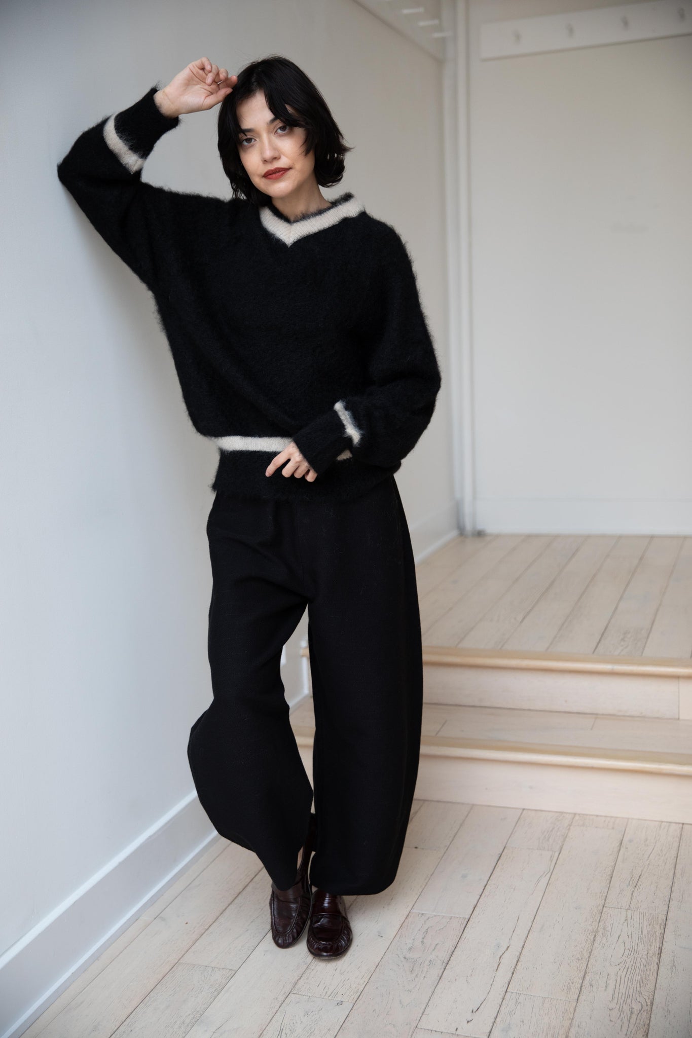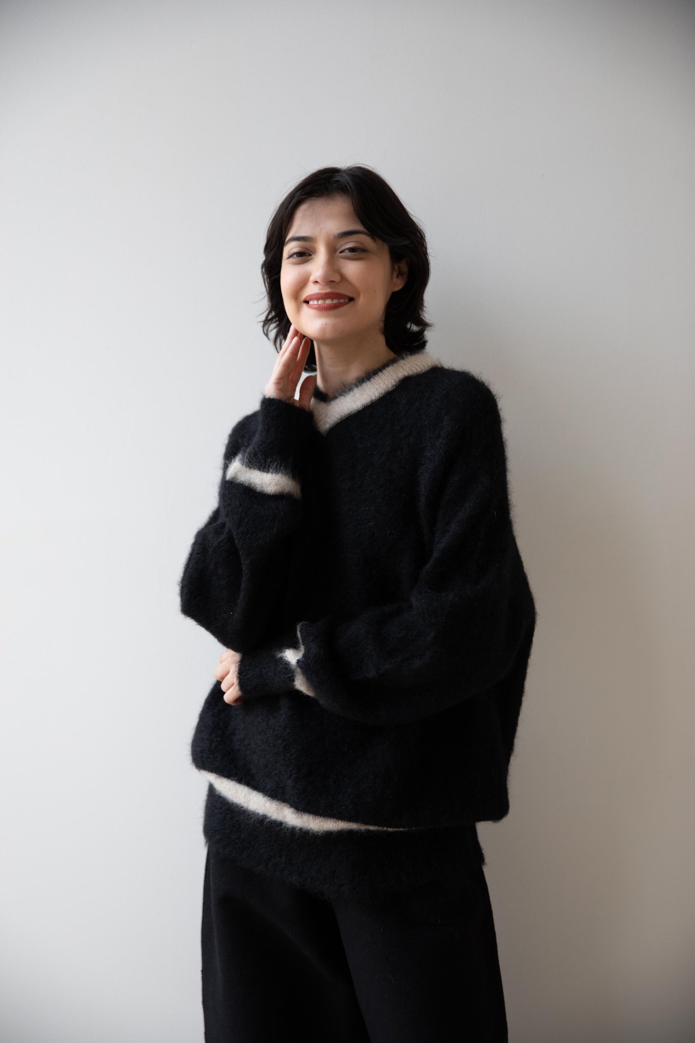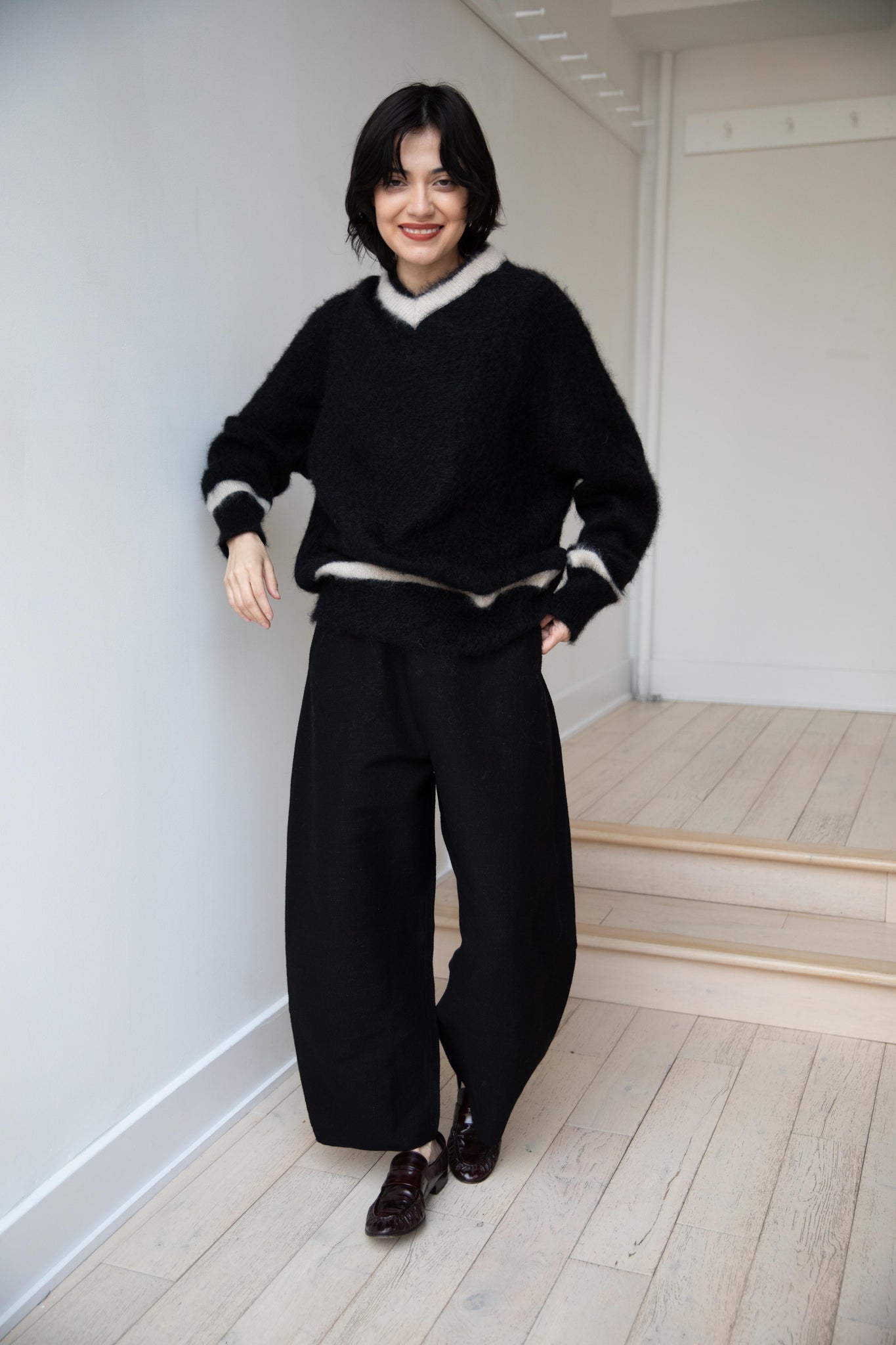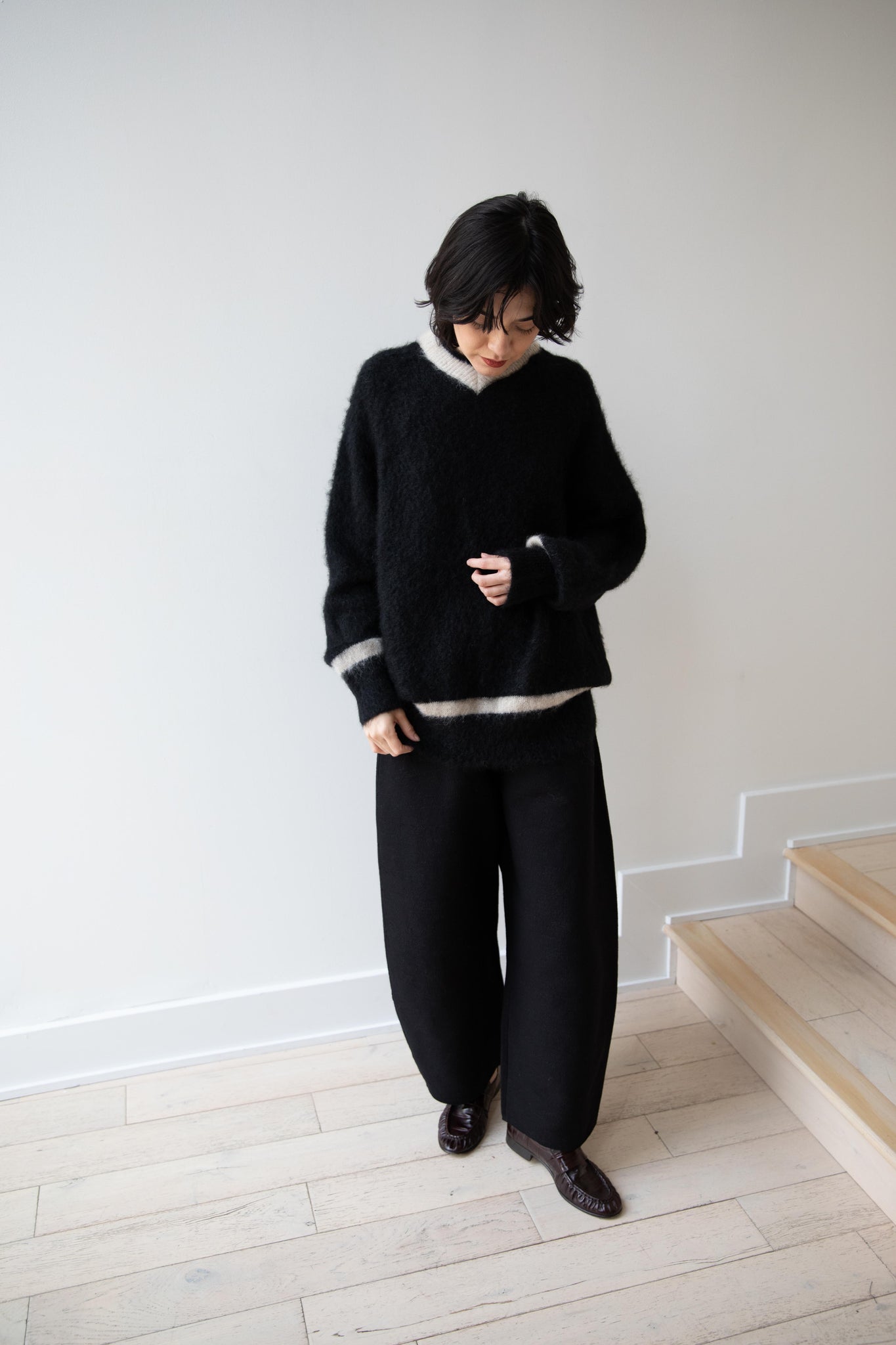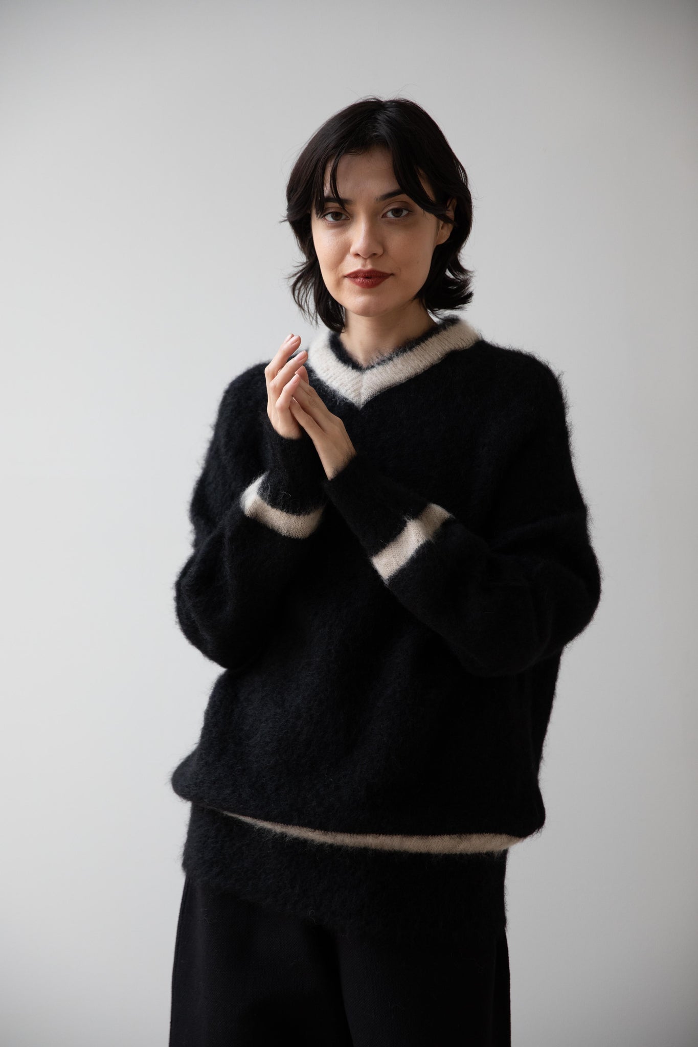 We love this take on a cricket sweater! It has a high V-neck and contrasting stripe at the neck and hemline. The mohair gives a nice fluffy finish, making it a perfect in between season piece. We also love the elongated cut, perfect for layering over a silk or cupro trouser.