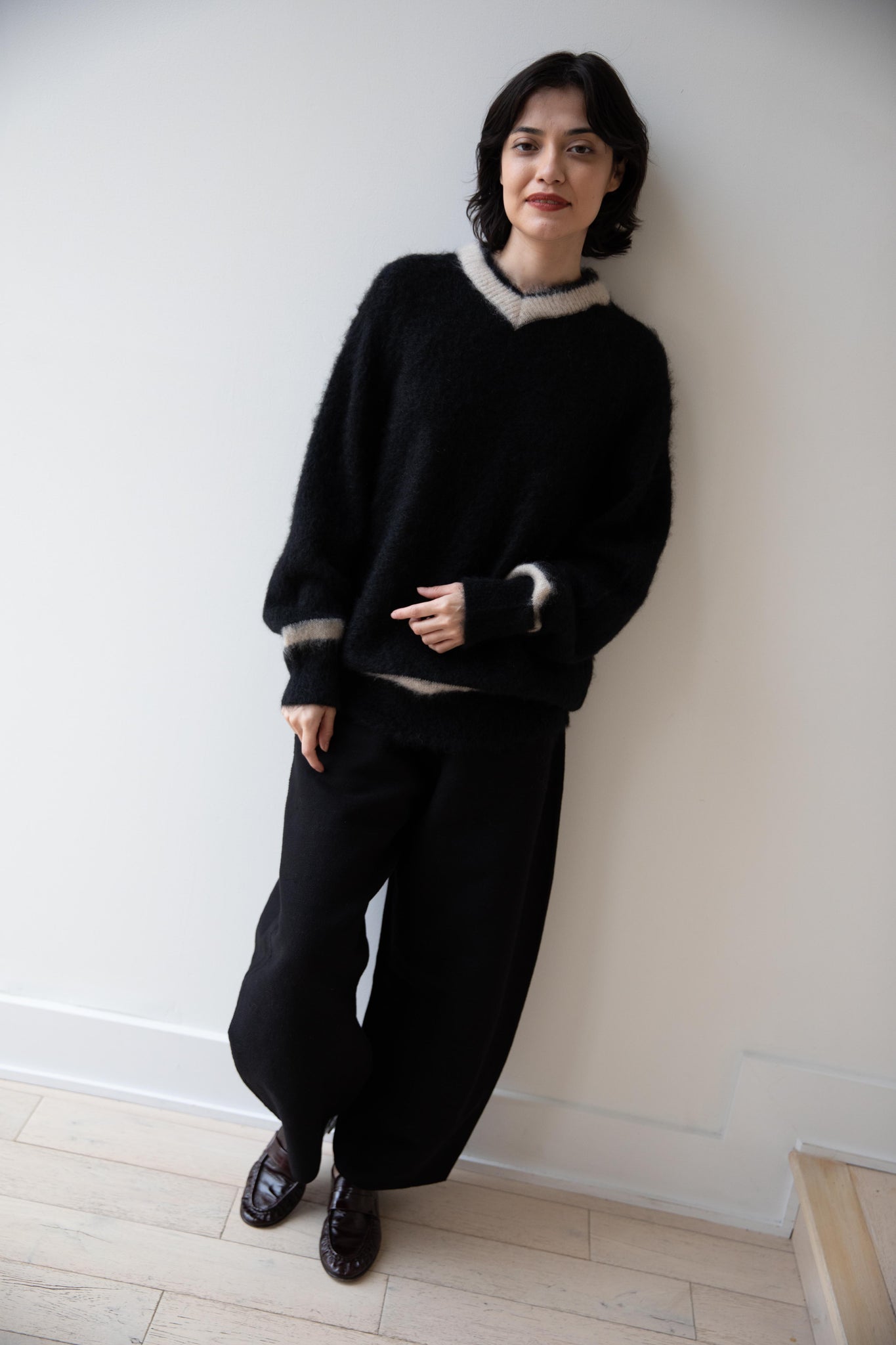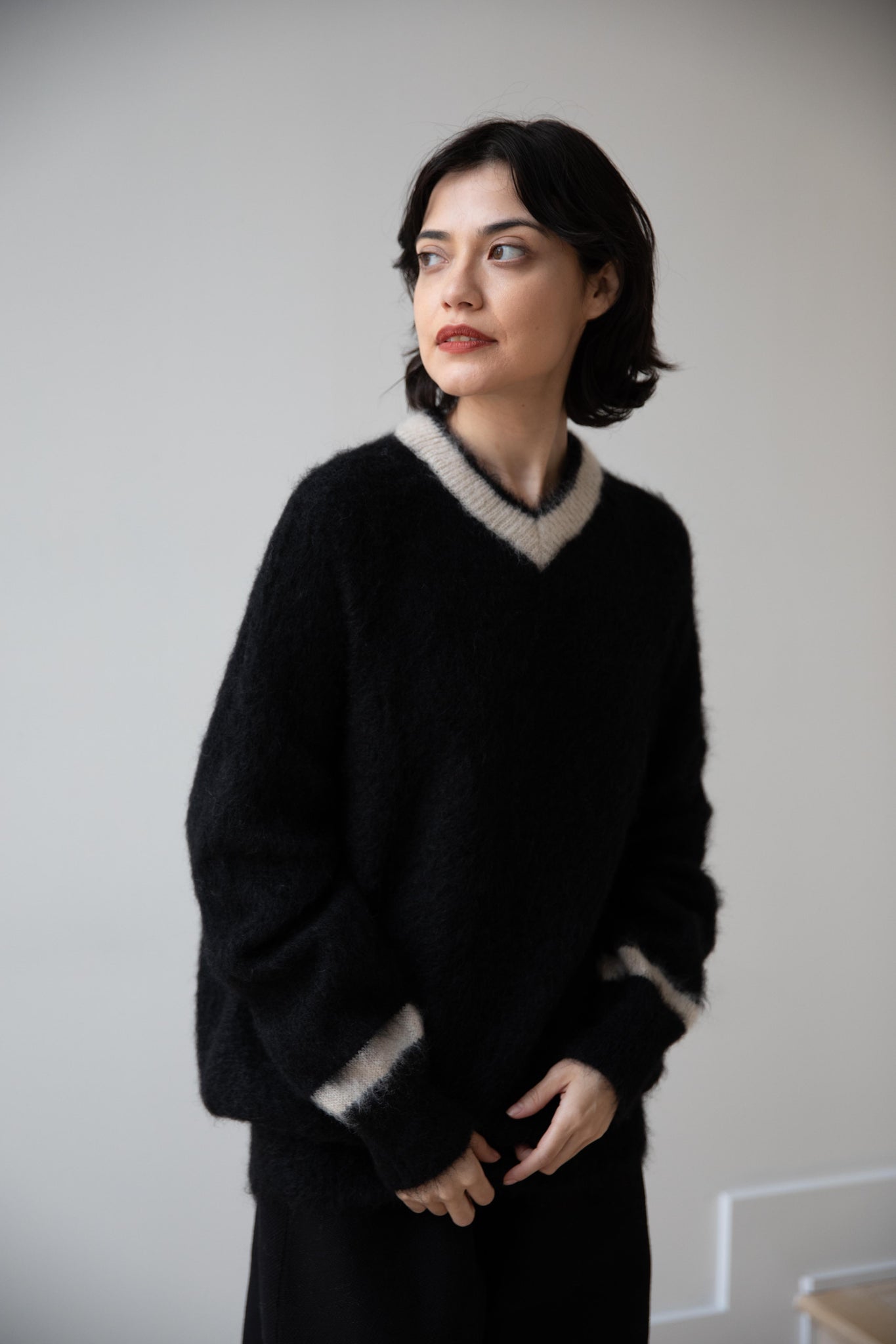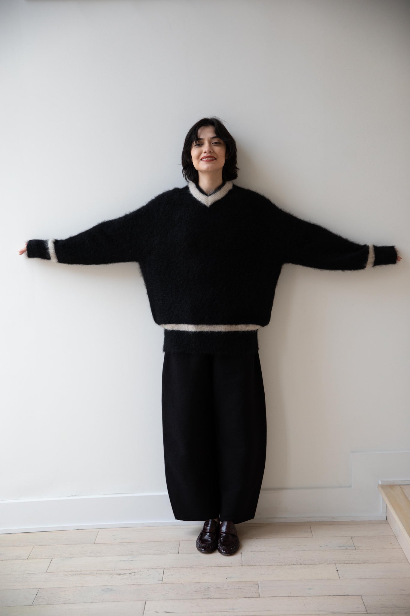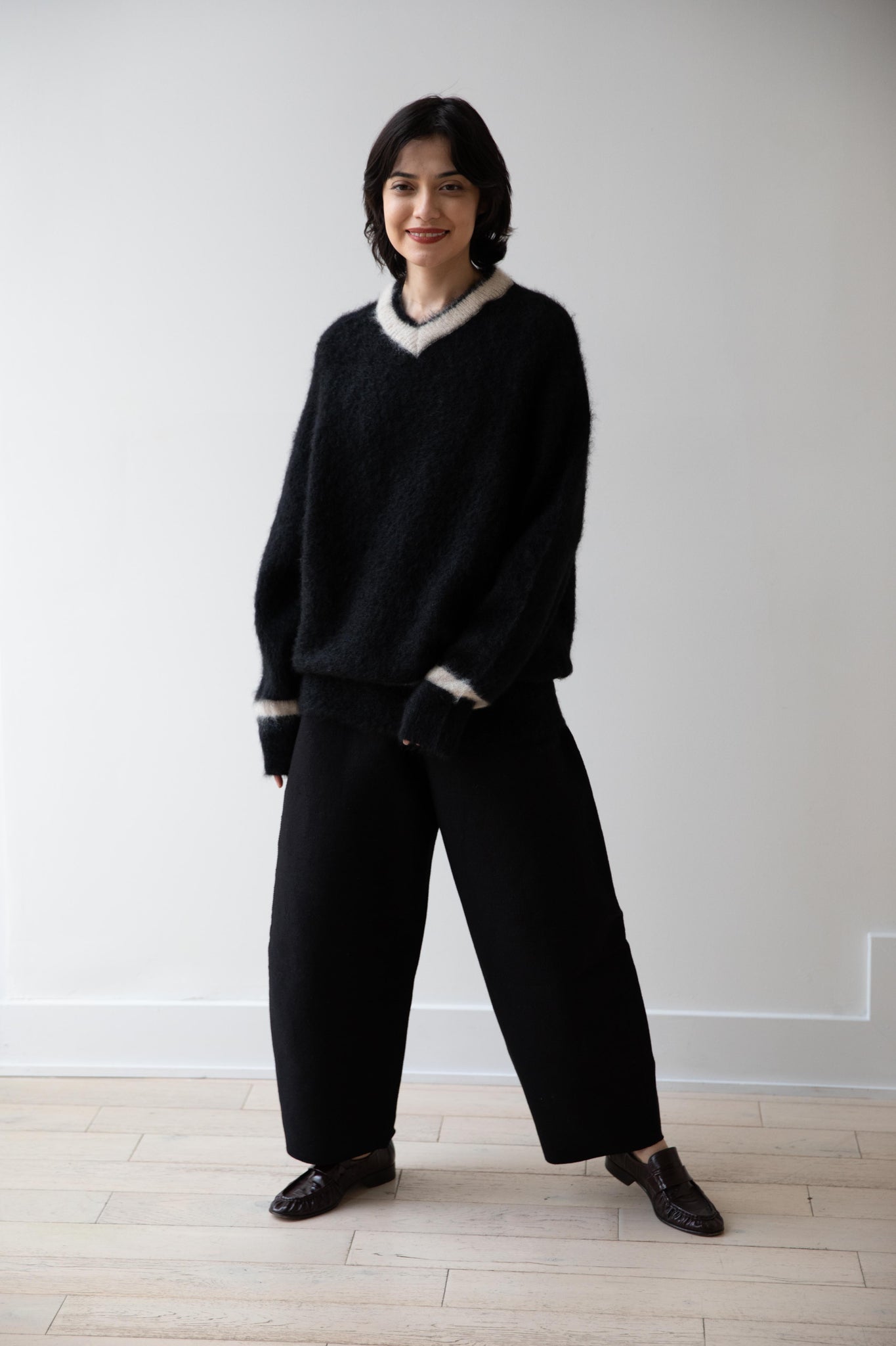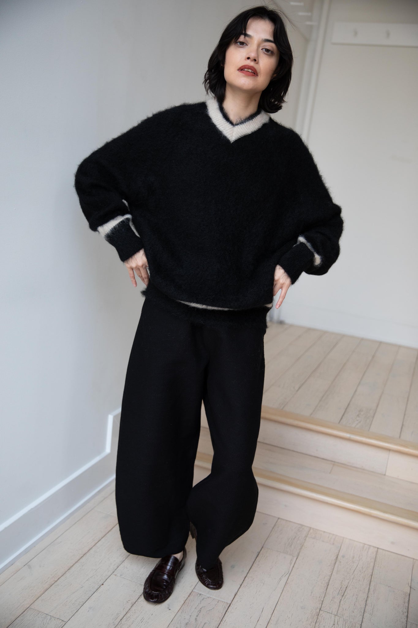 We love this take on a cricket sweater! It has a high V-neck and contrasting stripe at the neck and hemline. The mohair gives a nice fluffy finish, making it a perfect in between season piece. We also love the elongated cut, perfect for layering over a silk or cupro trouser.
