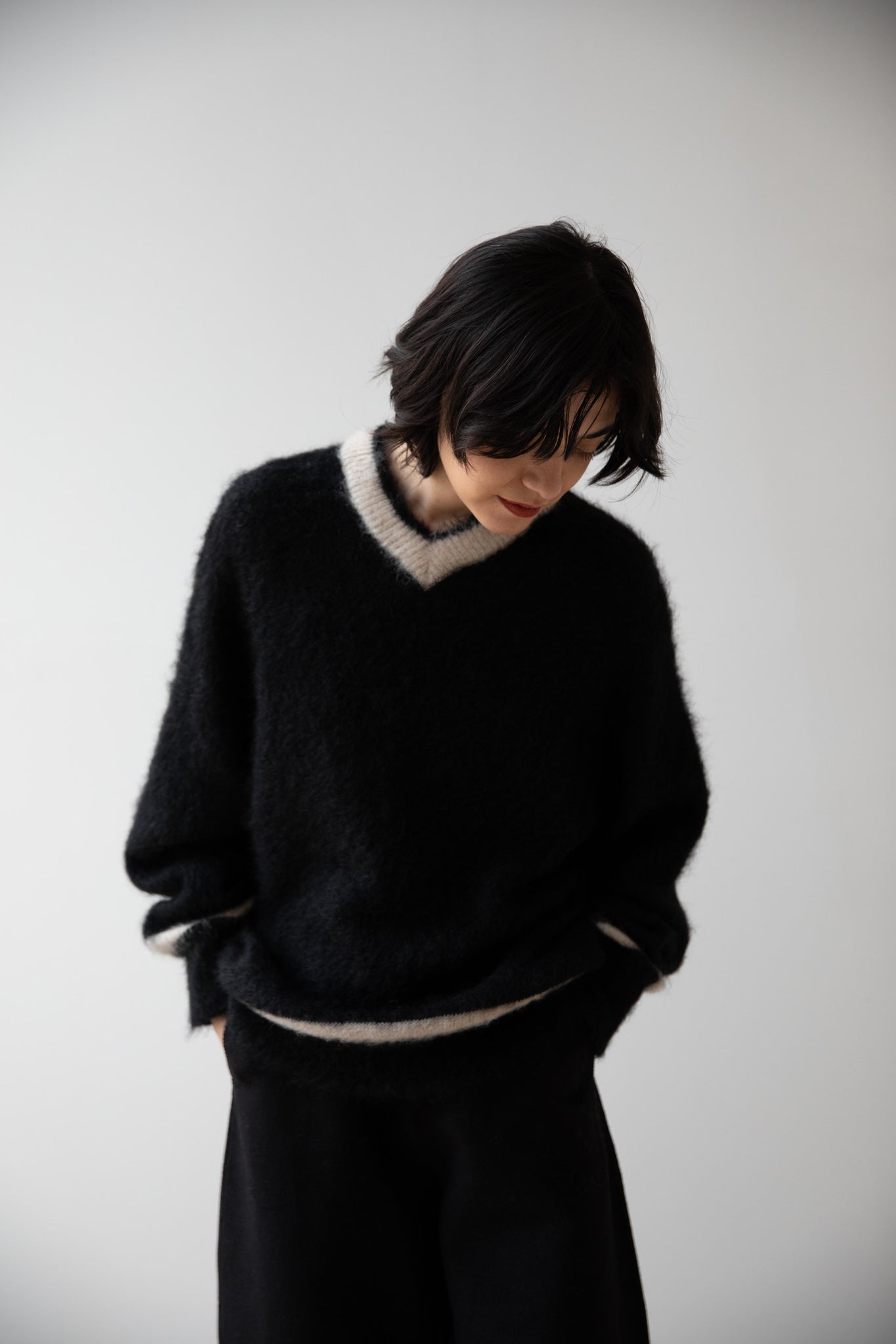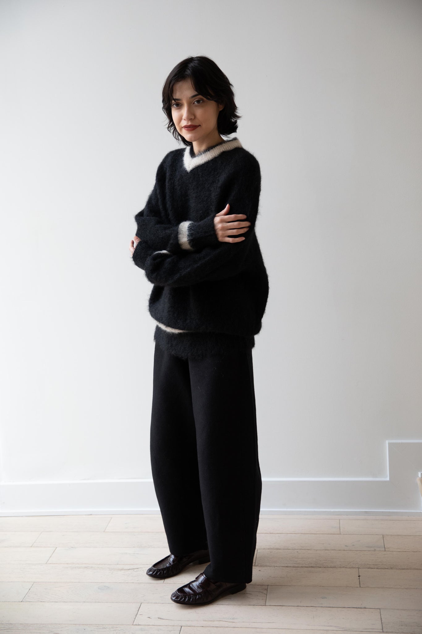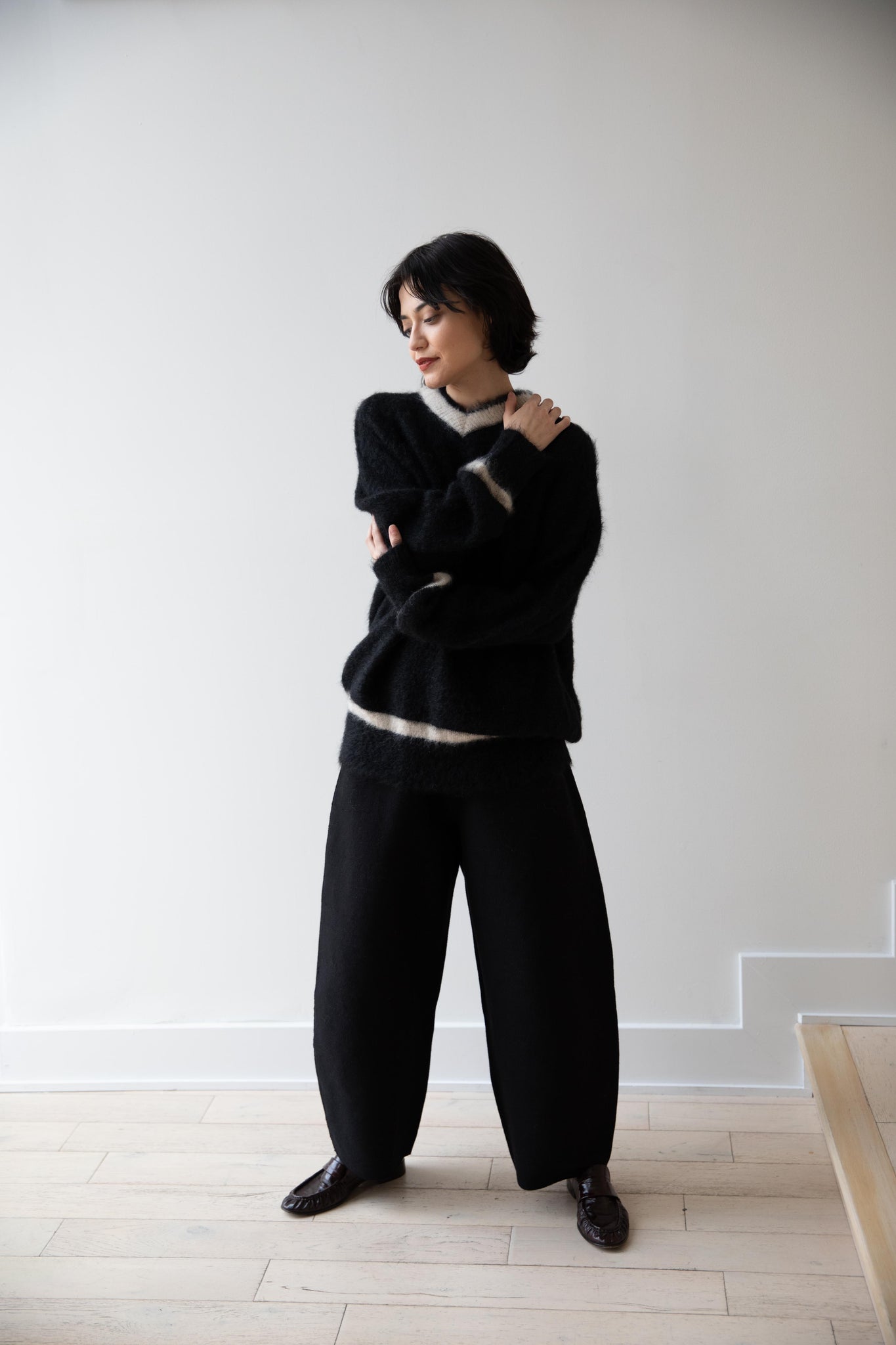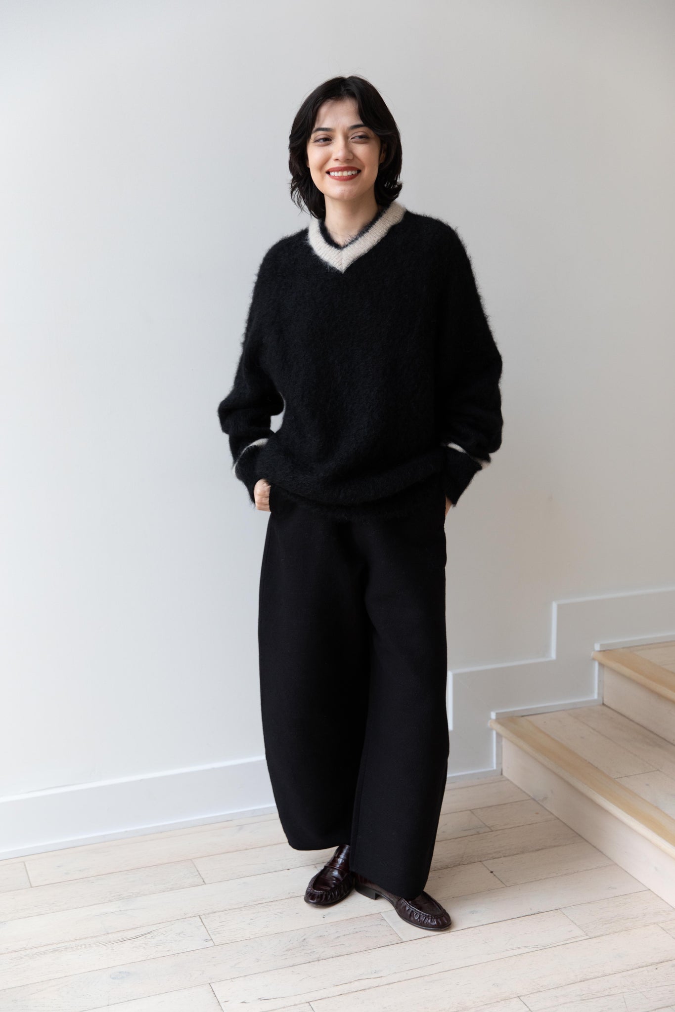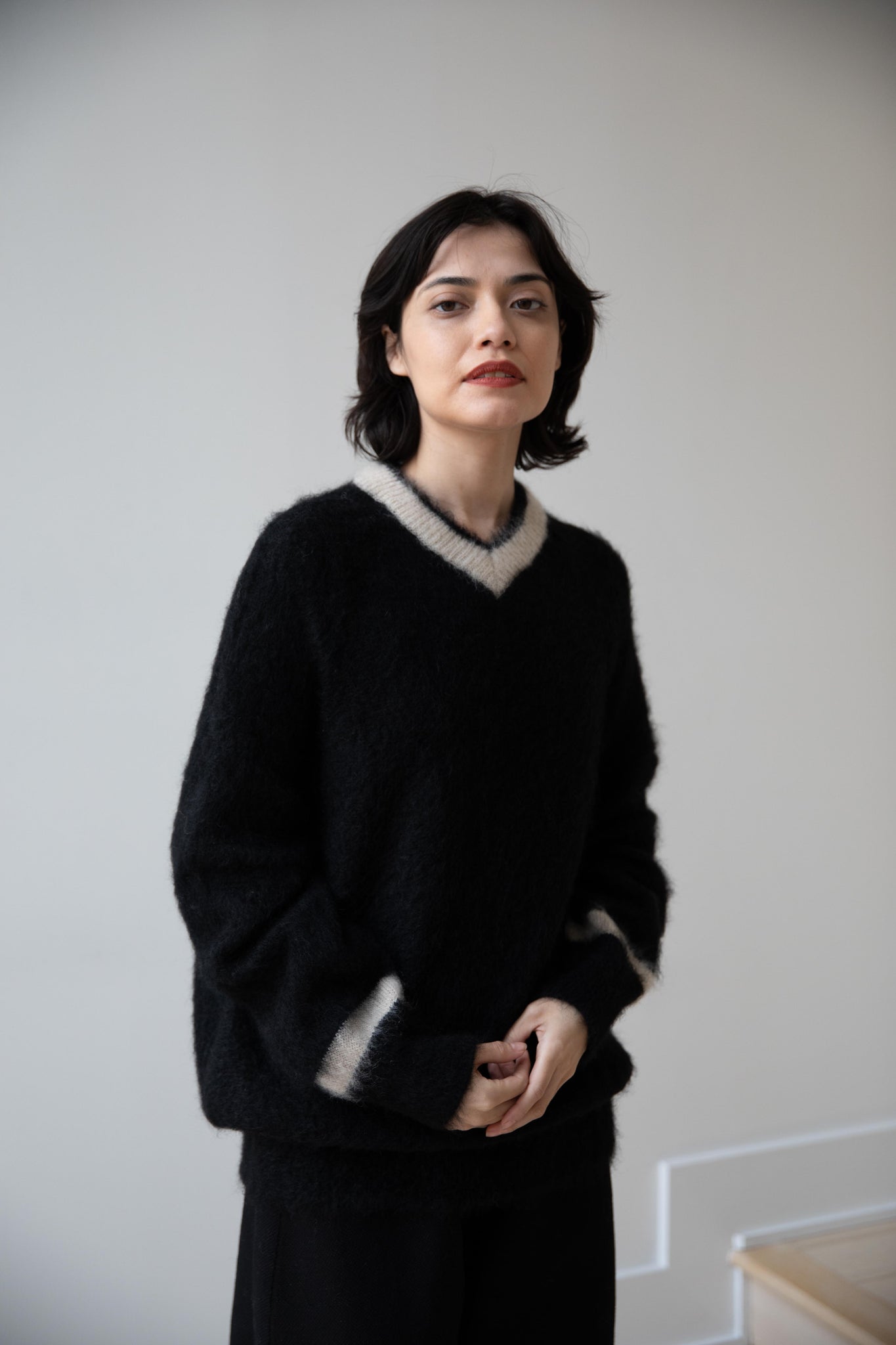 We love this take on a cricket sweater! It has a high V-neck and contrasting stripe at the neck and hemline. The mohair gives a nice fluffy finish, making it a perfect in between season piece. We also love the elongated cut, perfect for layering over a silk or cupro trouser.