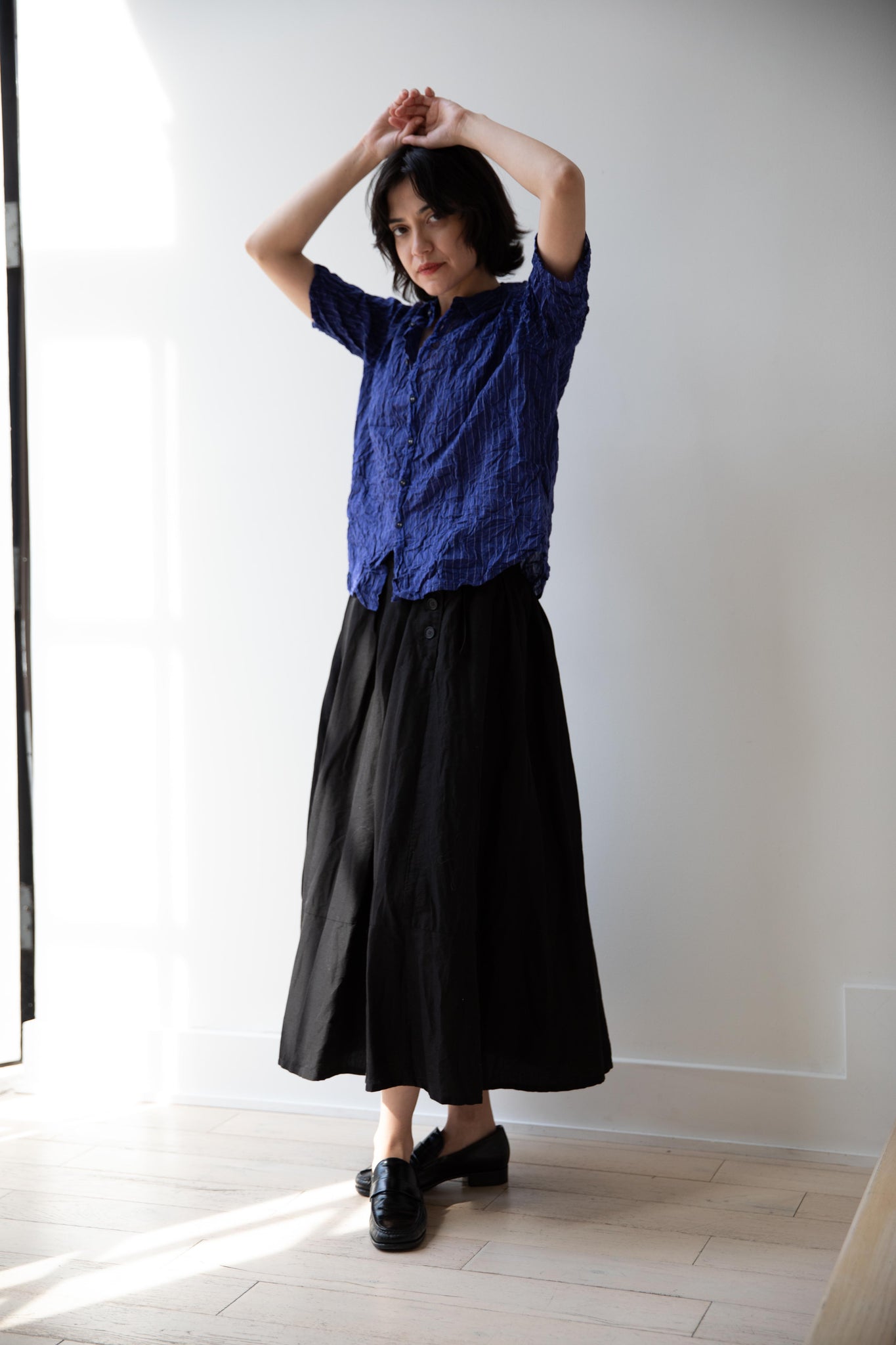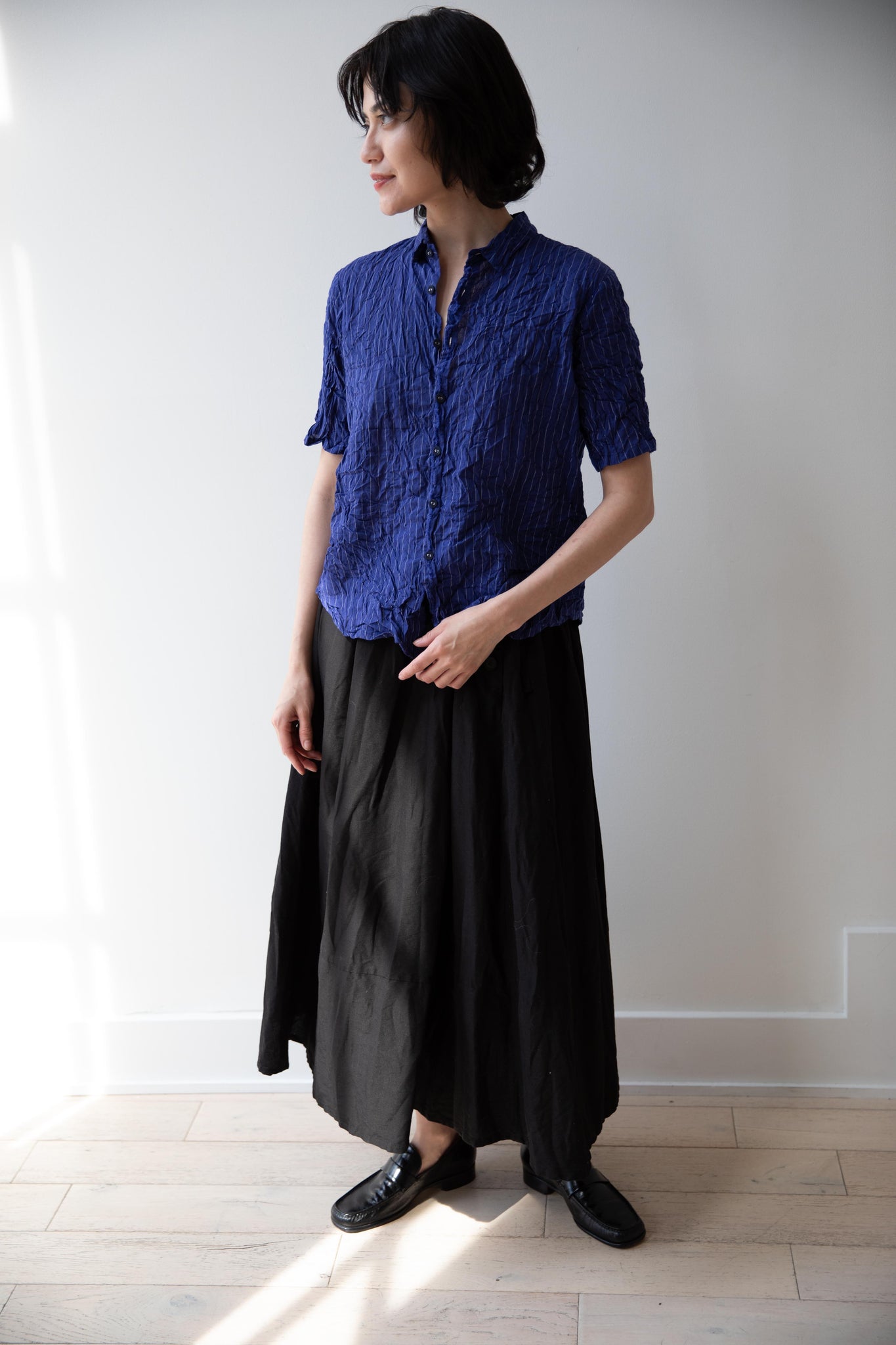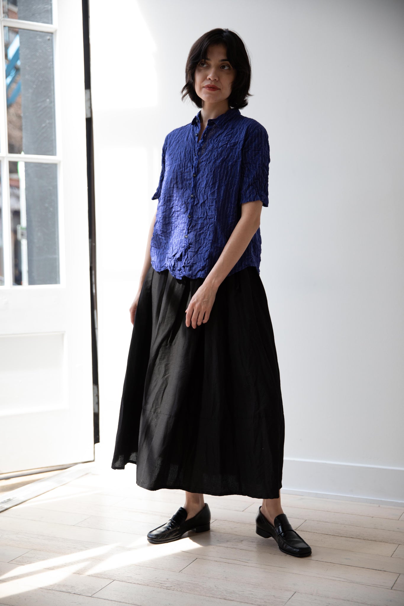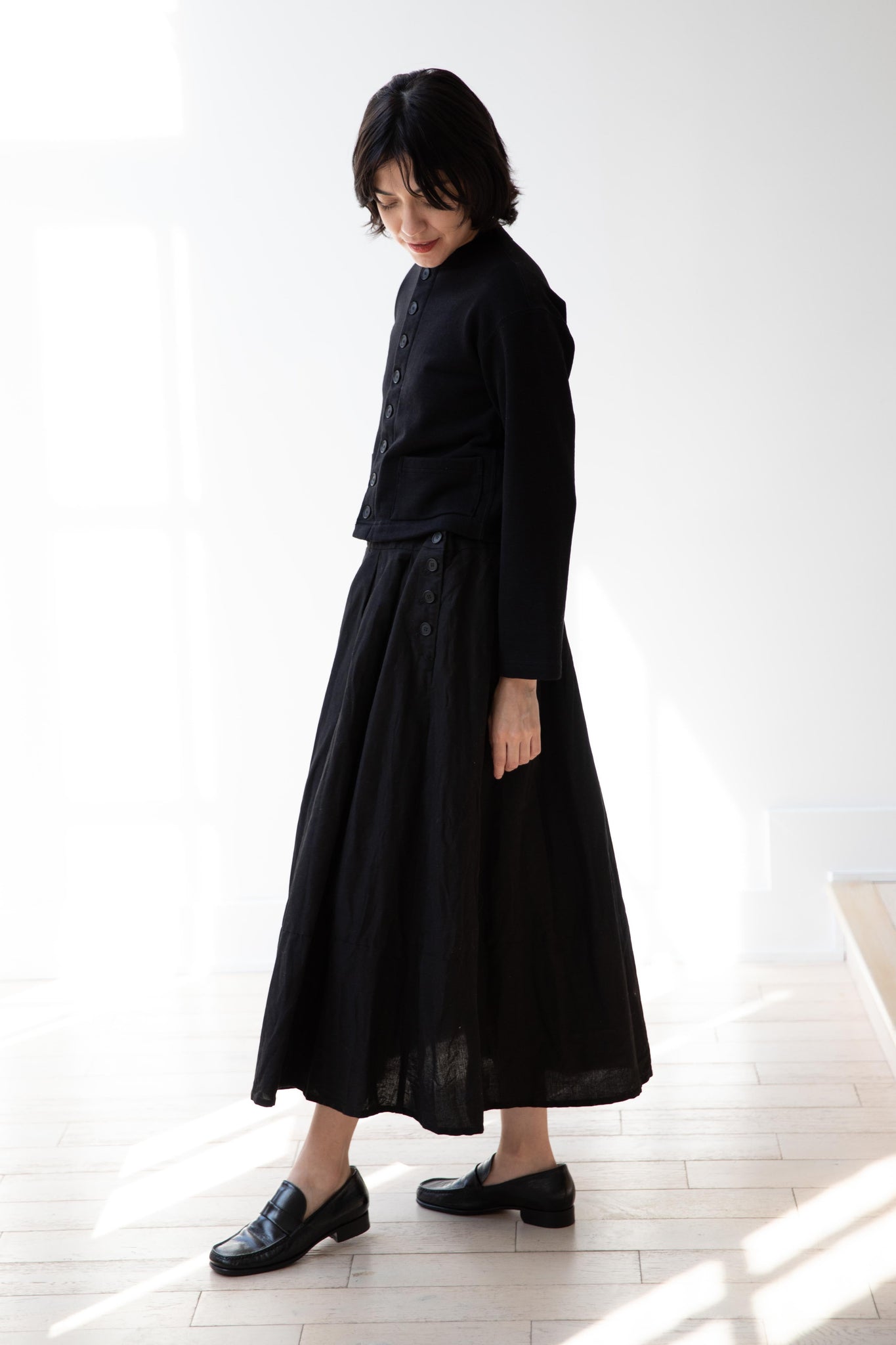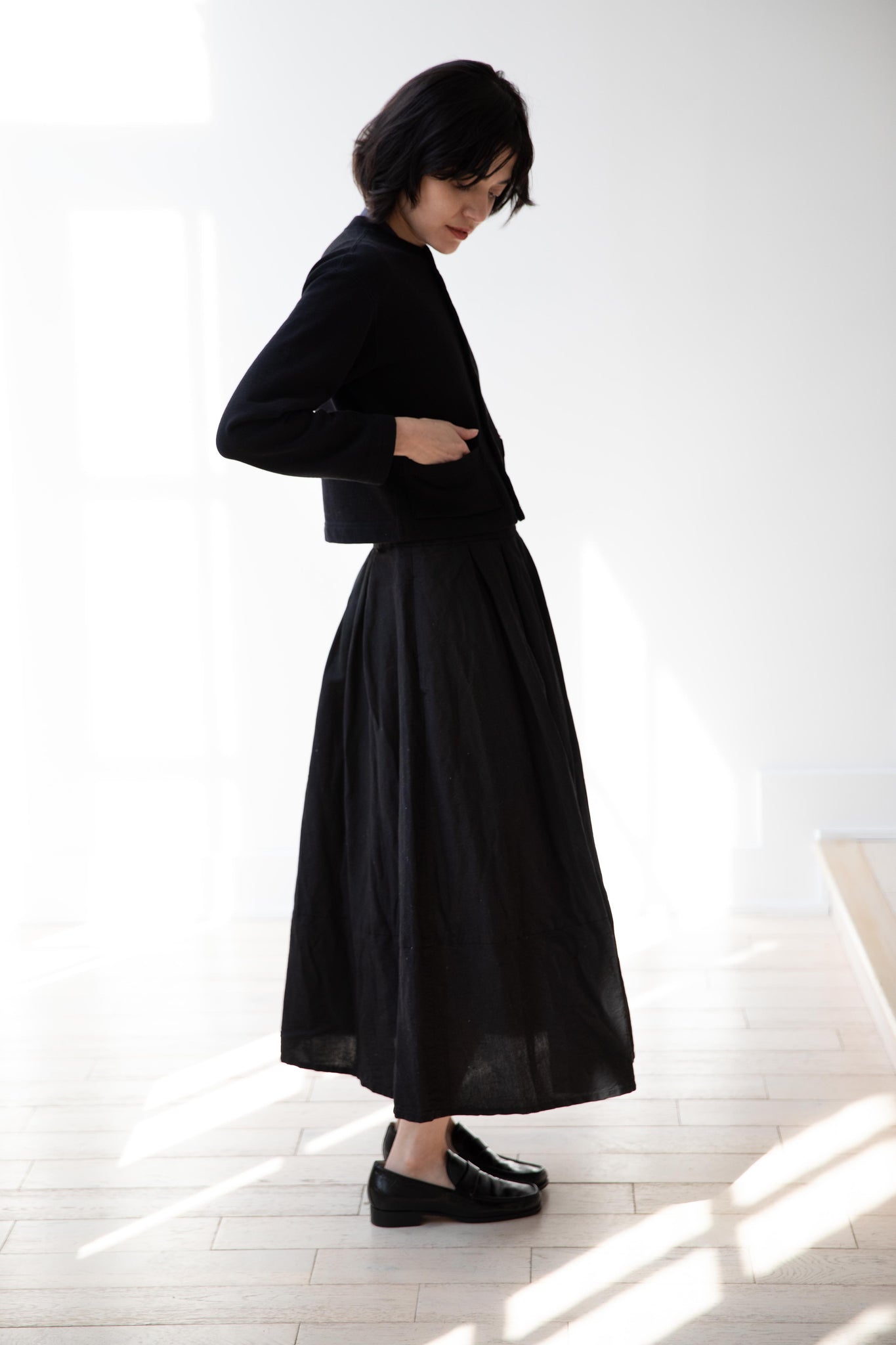 This skirt is made from a structured linen cotton that gives the silhouette a wonderful definition. The waist band has a drawstring inside for any needed adjustments. One side of the skirt has one side pocket.