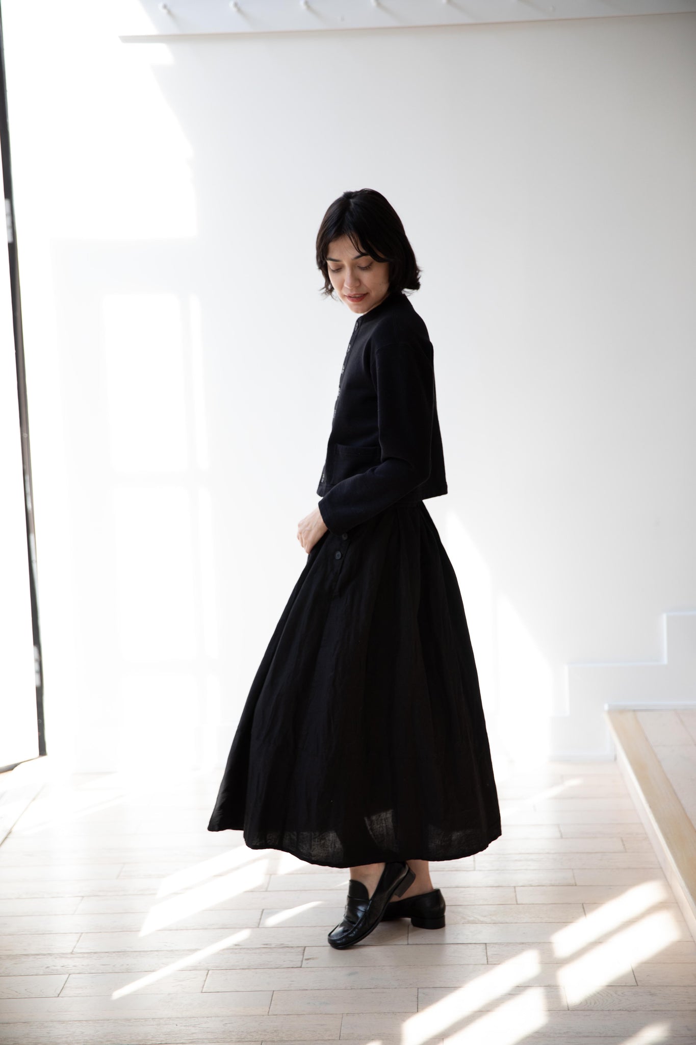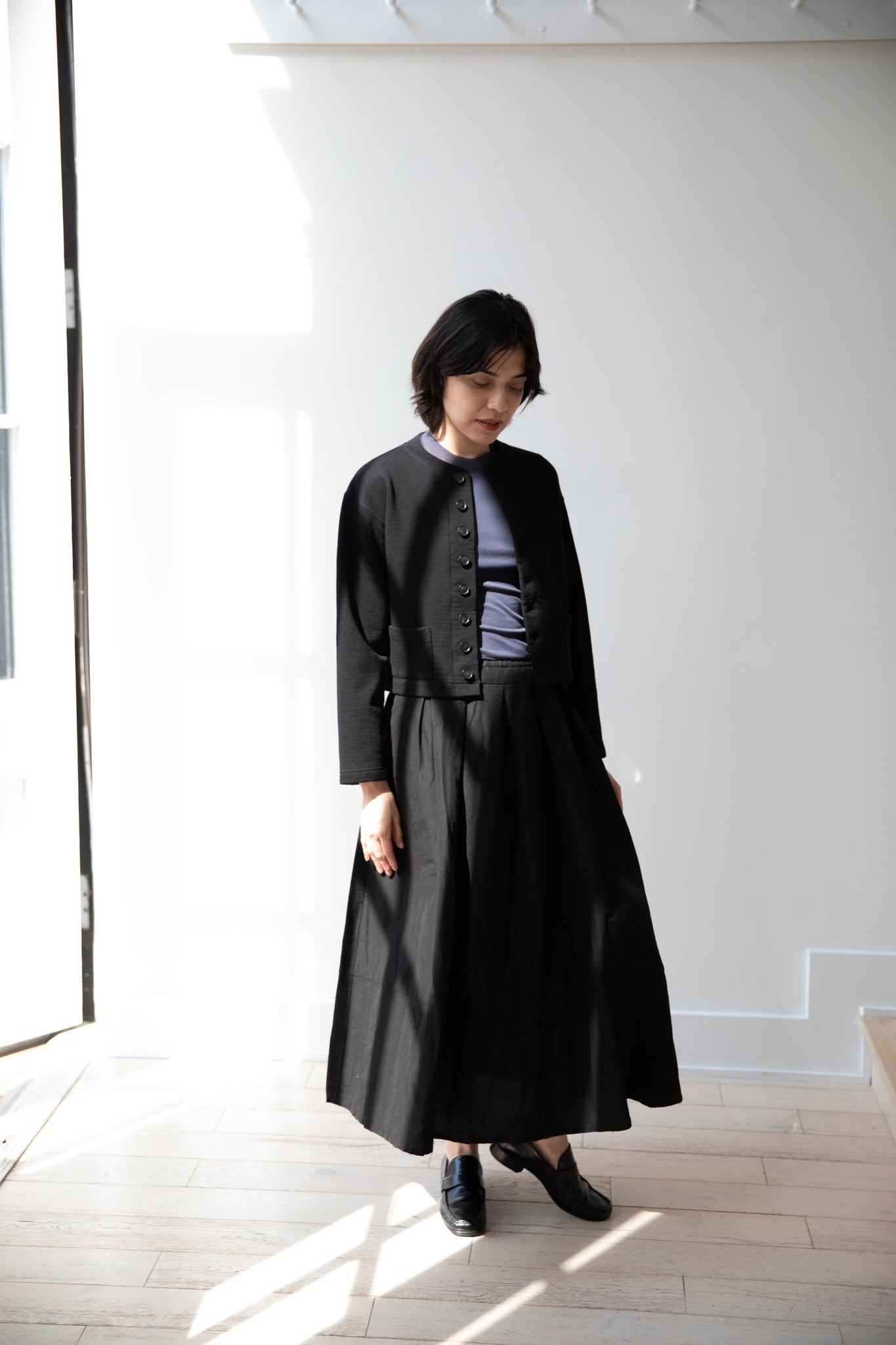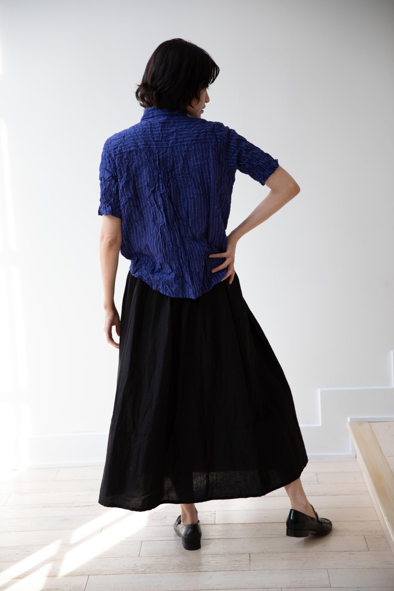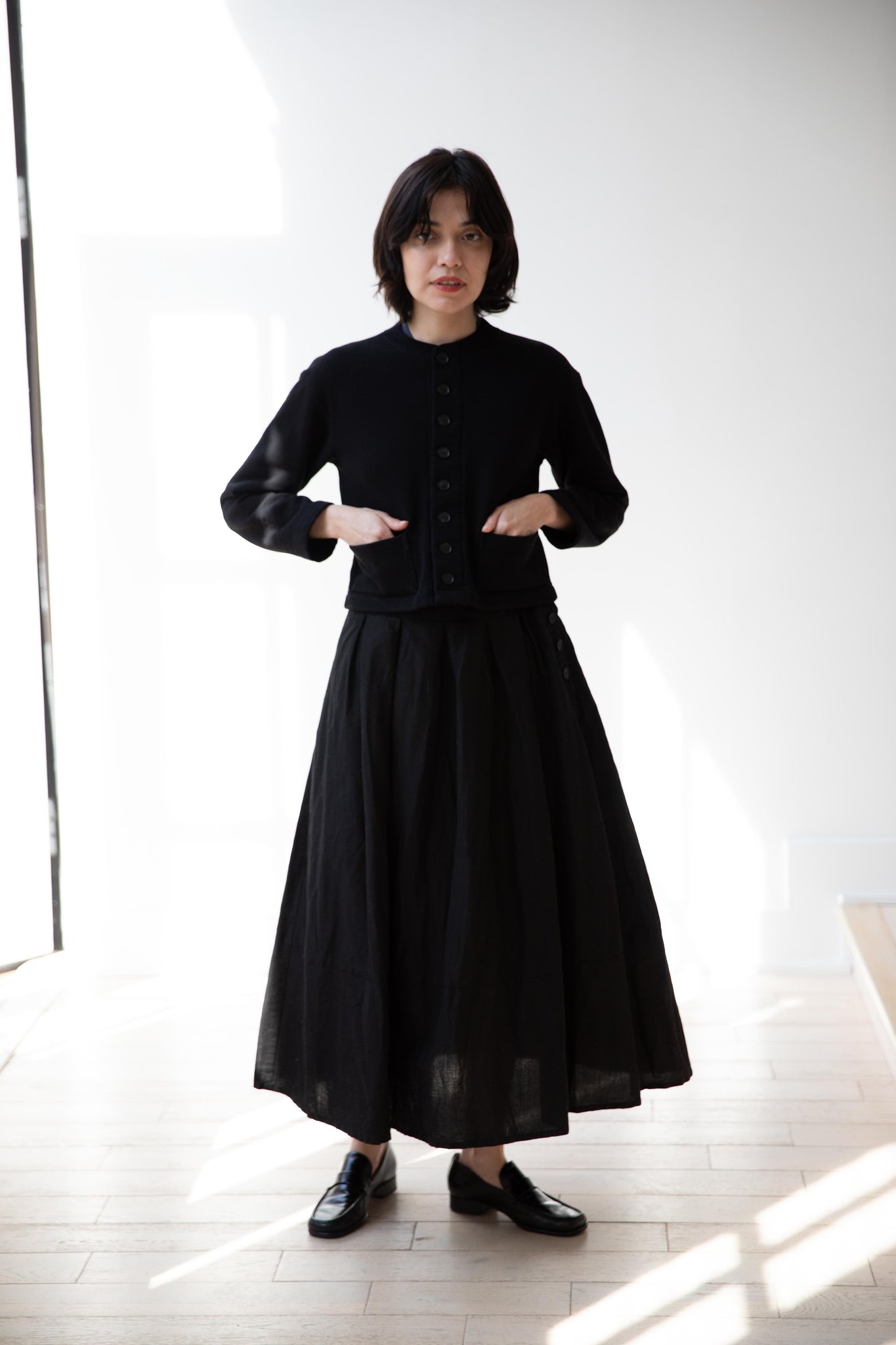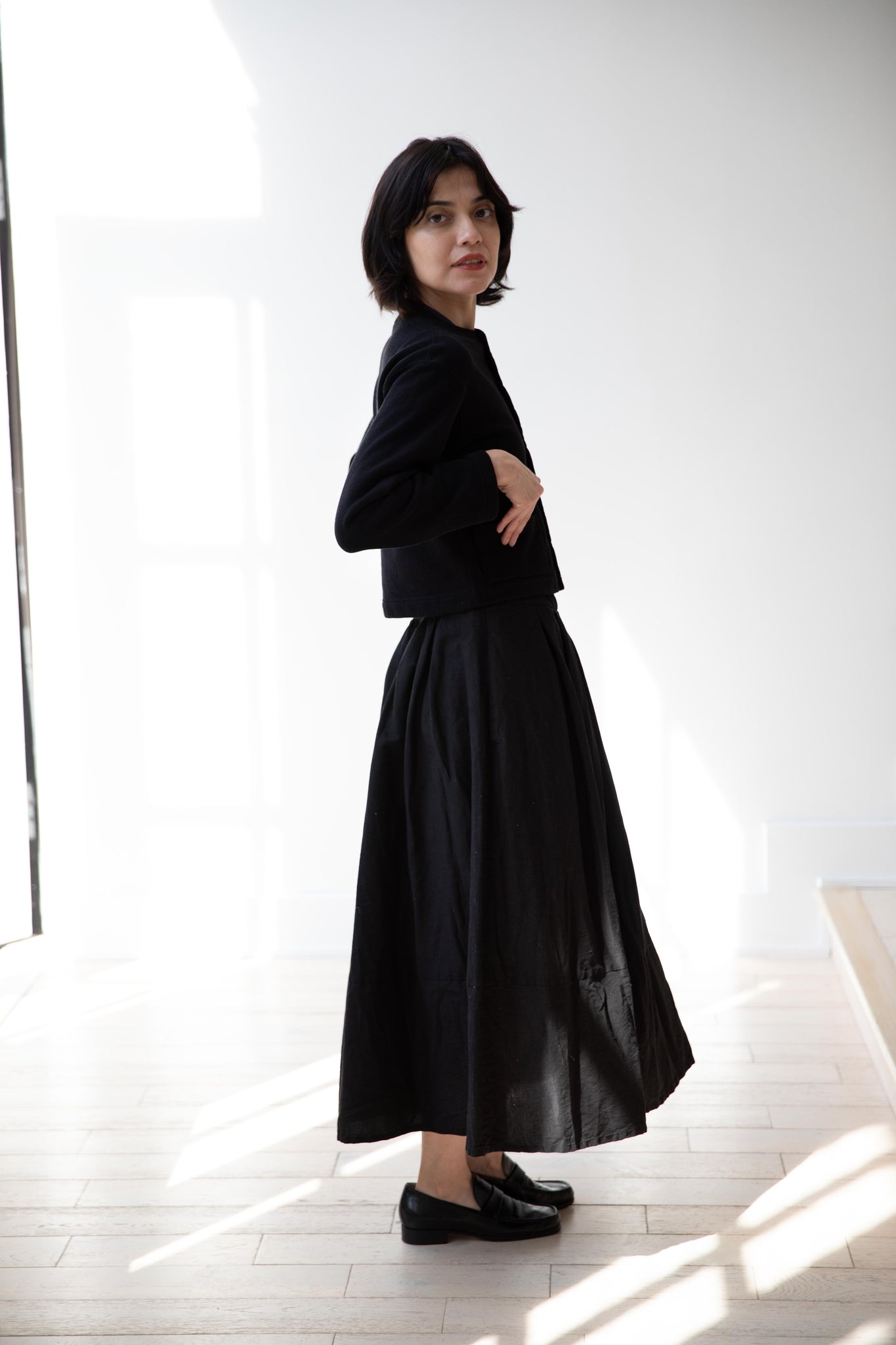 This skirt is made from a structured linen cotton that gives the silhouette a wonderful definition. The waist band has a drawstring inside for any needed adjustments. One side of the skirt has one side pocket.