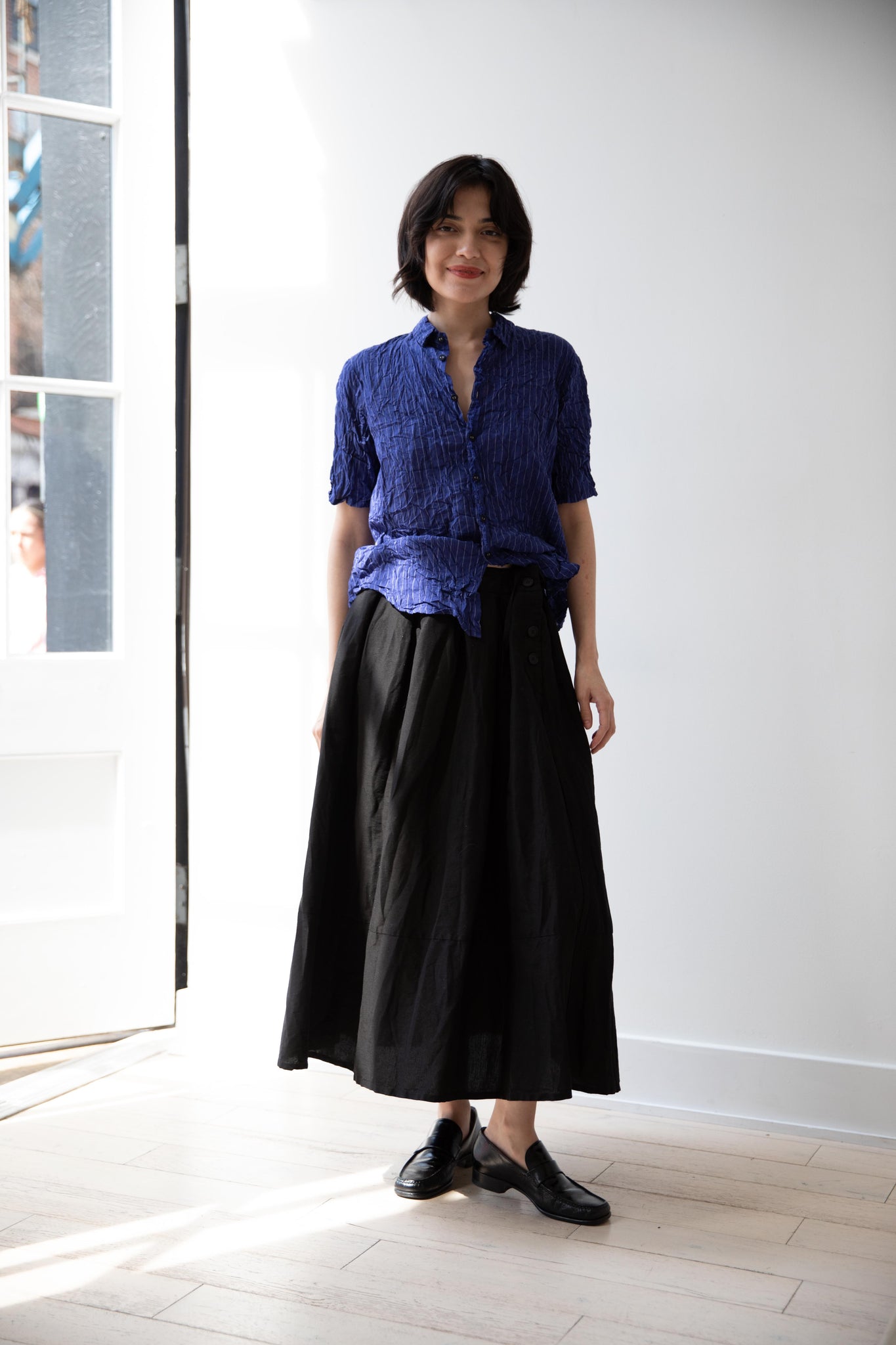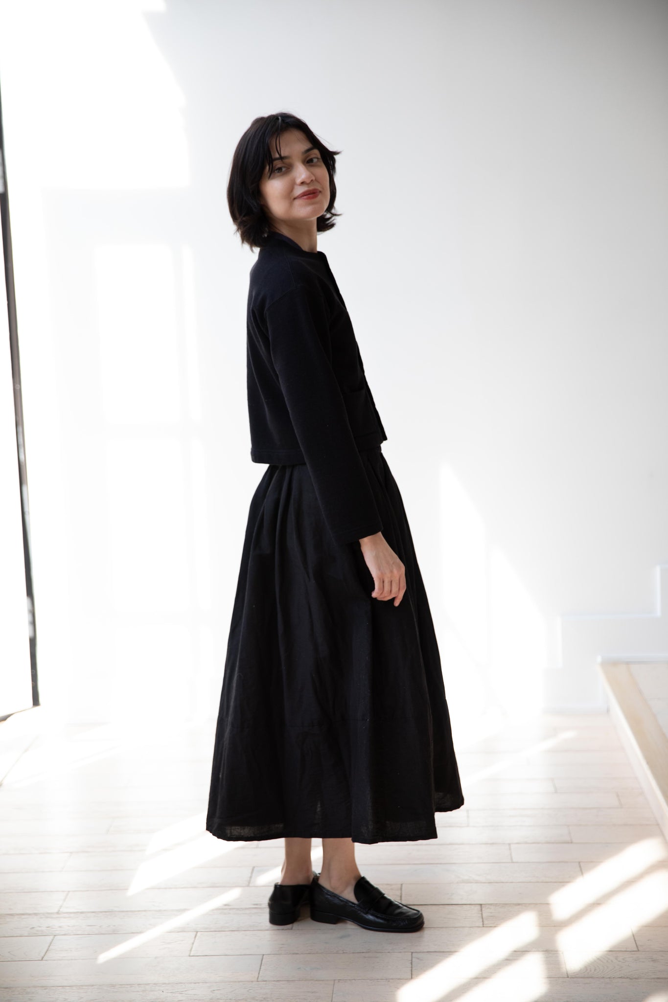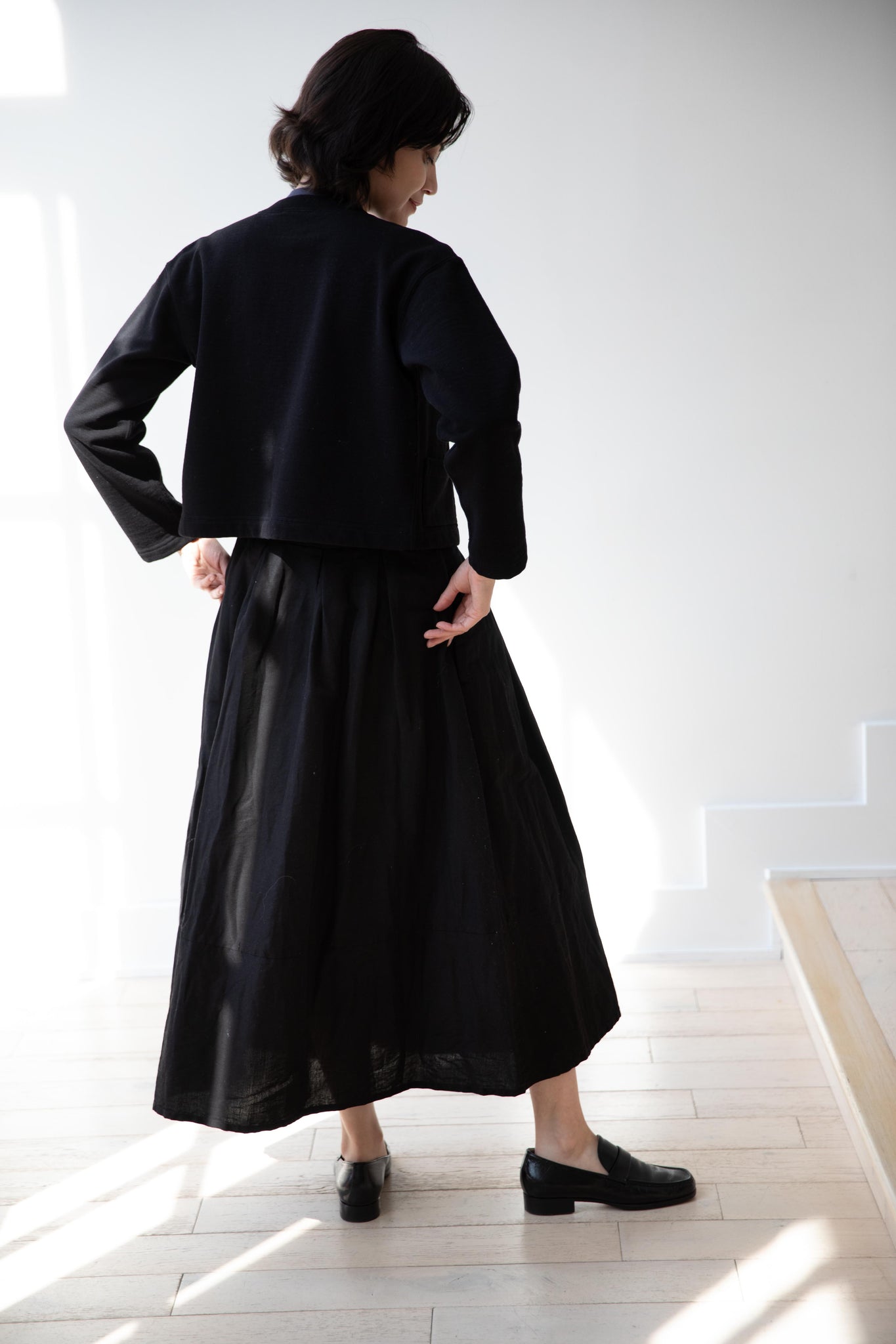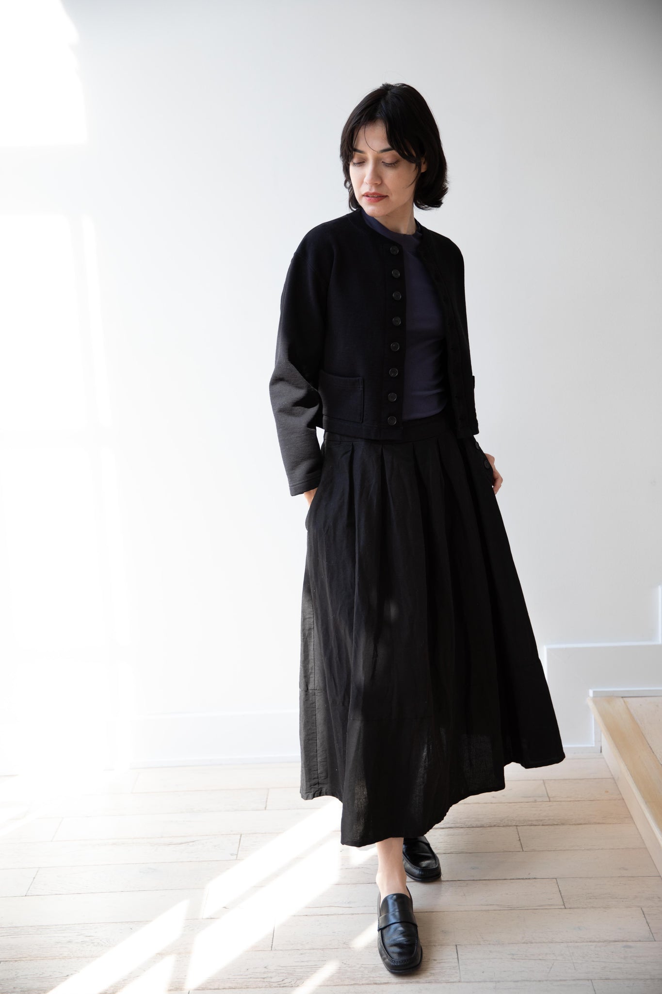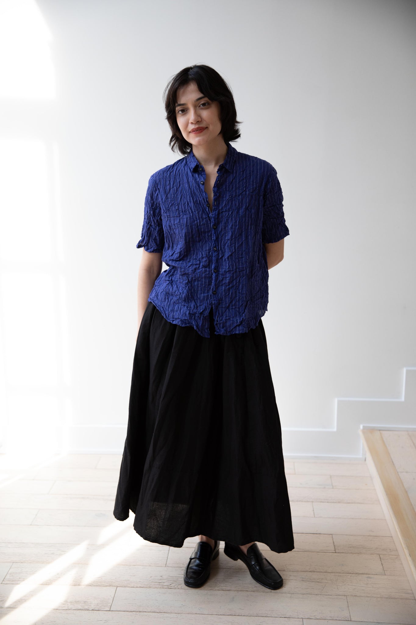 This skirt is made from a structured linen cotton that gives the silhouette a wonderful definition. The waist band has a drawstring inside for any needed adjustments. One side of the skirt has one side pocket.