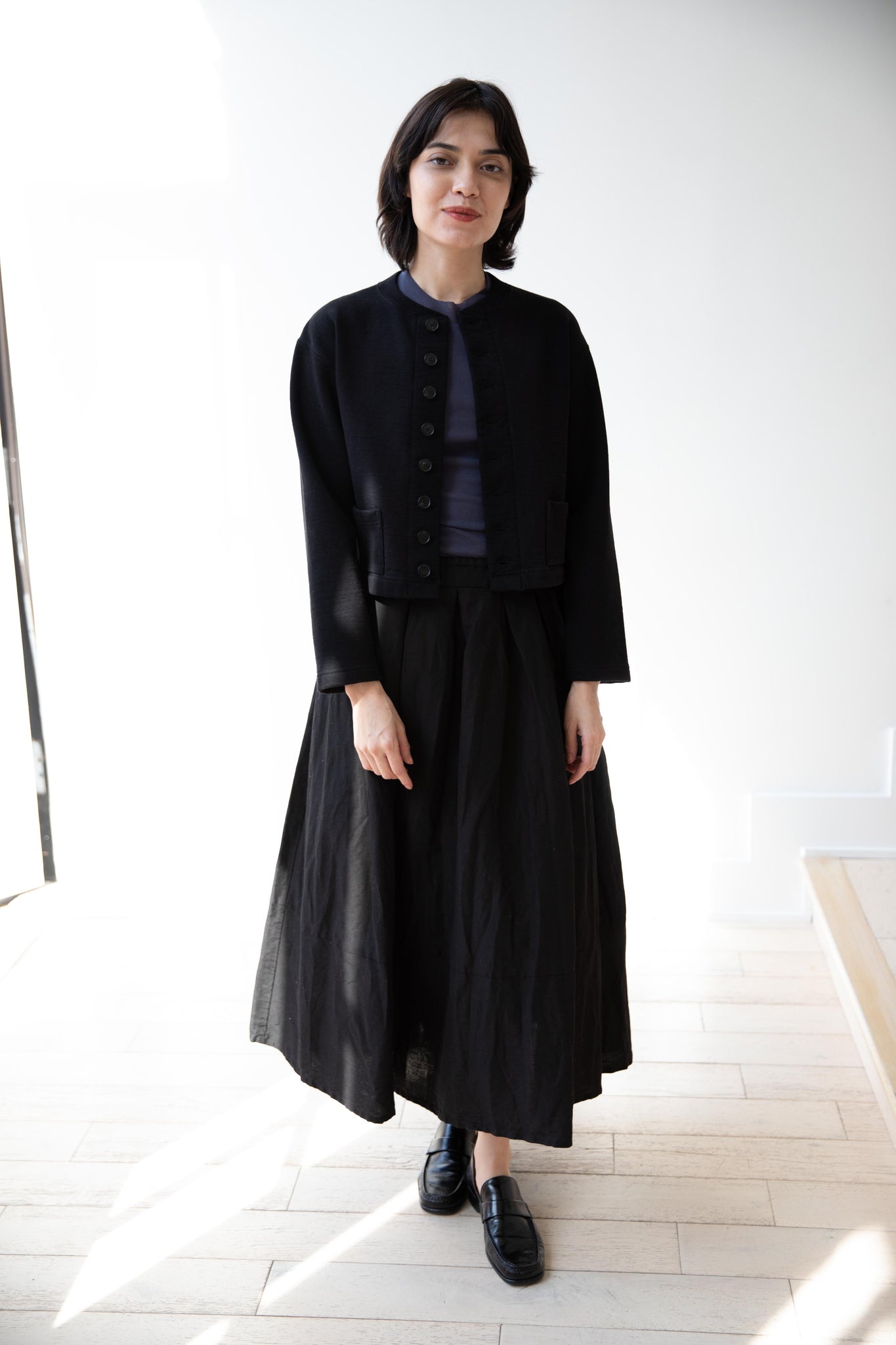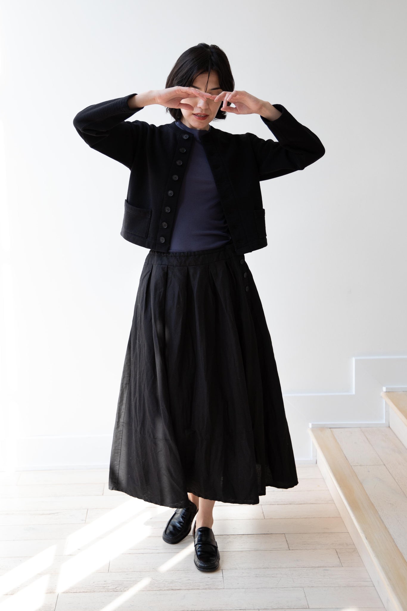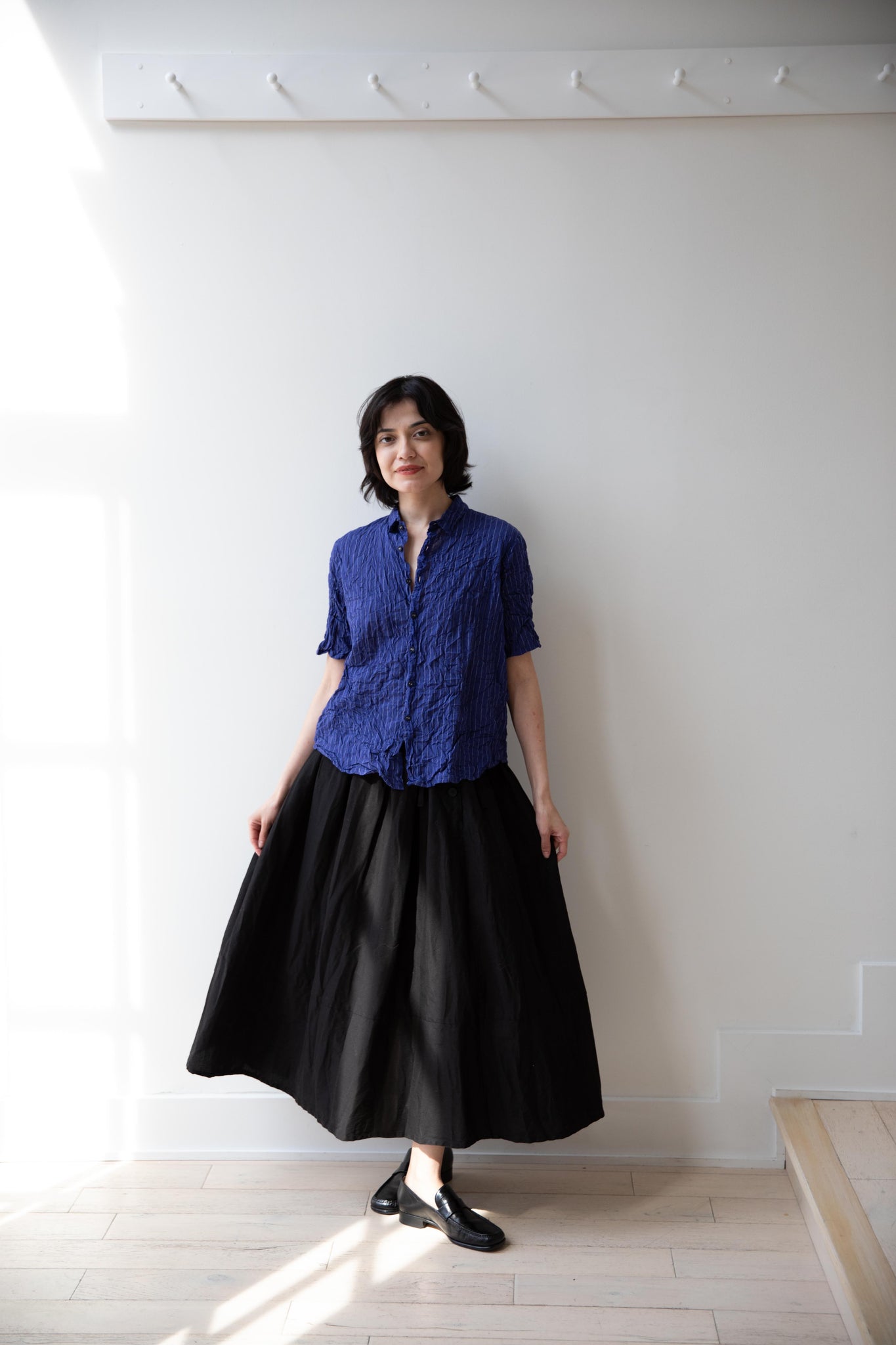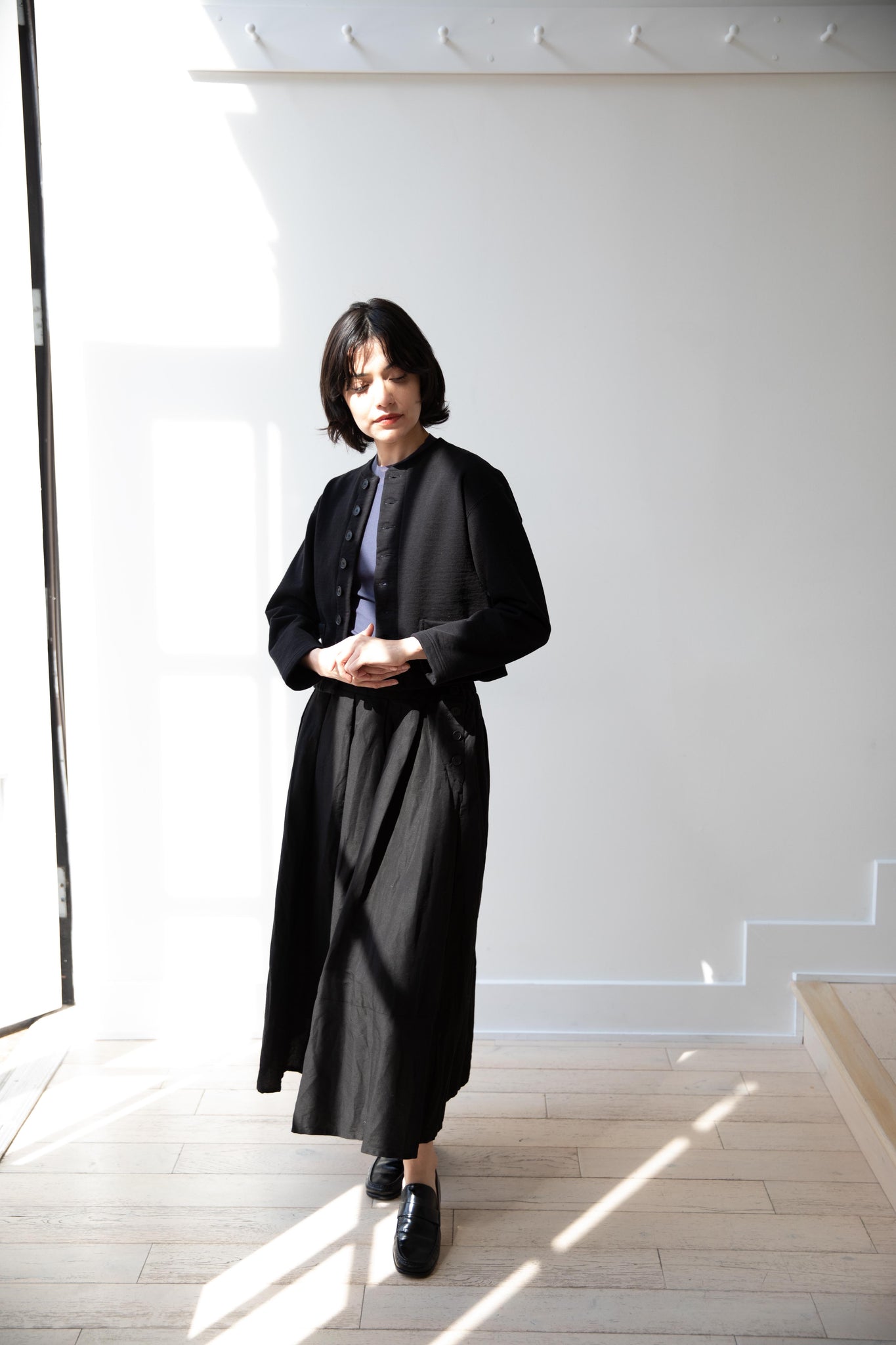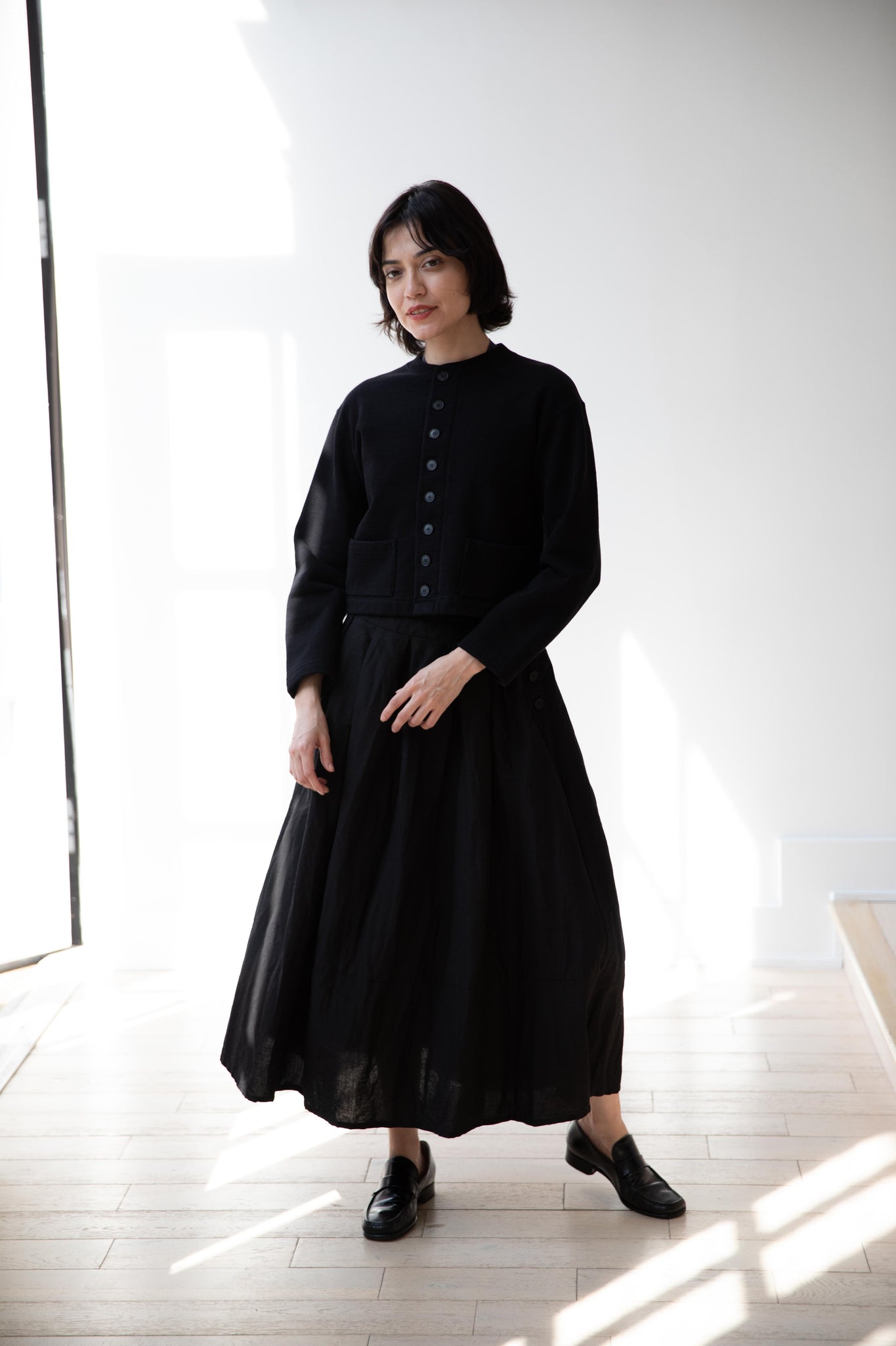 This skirt is made from a structured linen cotton that gives the silhouette a wonderful definition. The waist band has a drawstring inside for any needed adjustments. One side of the skirt has one side pocket.