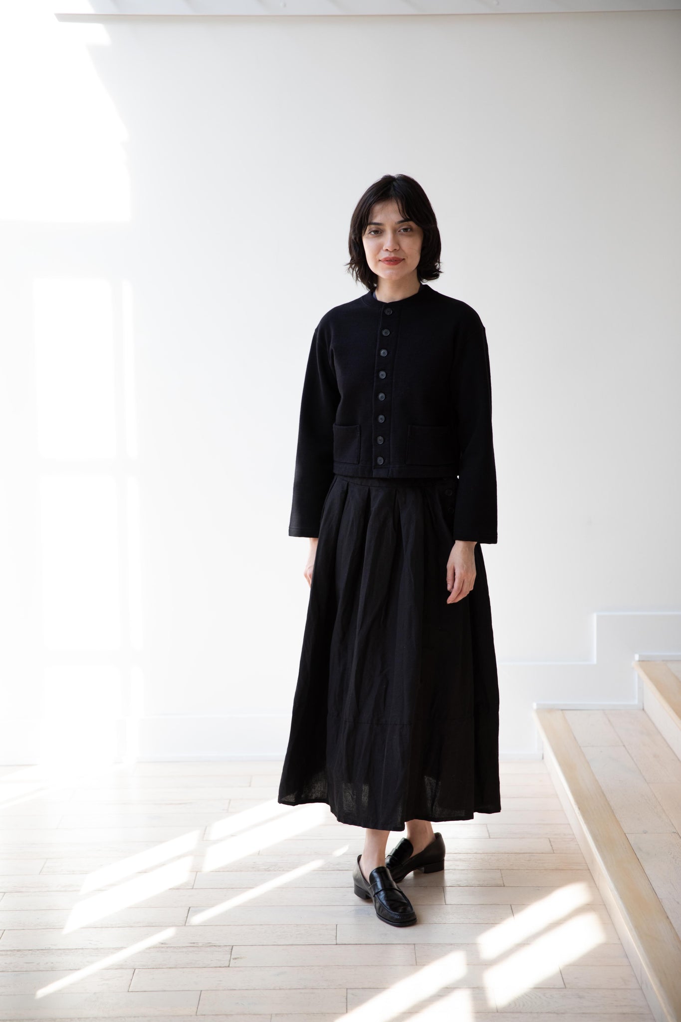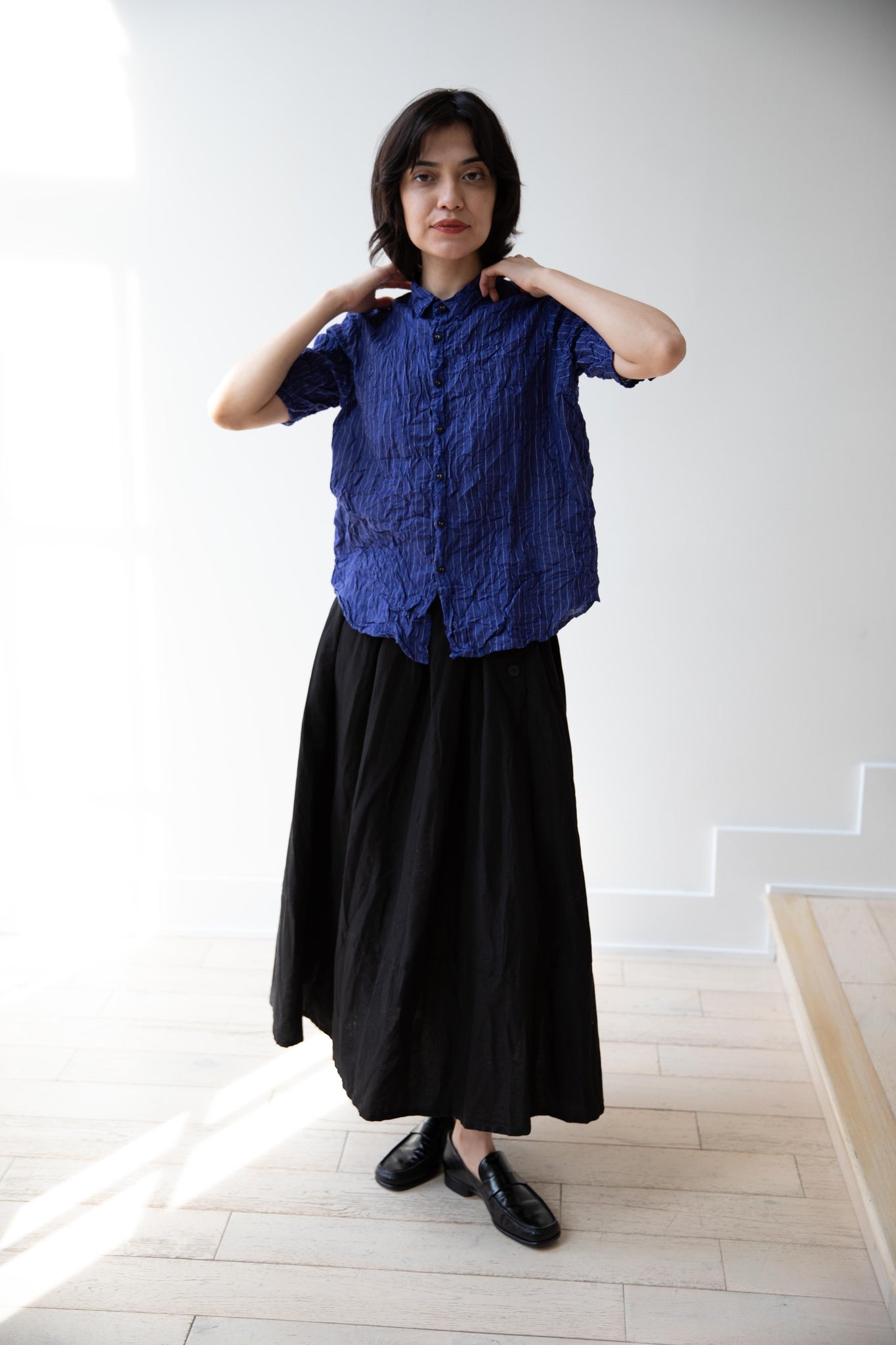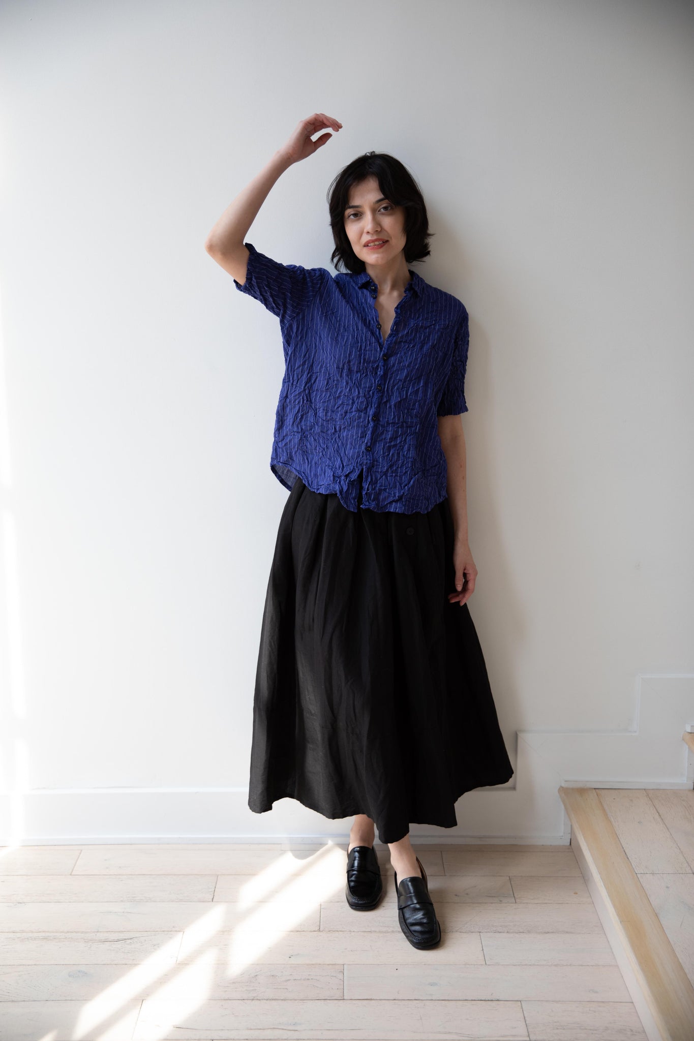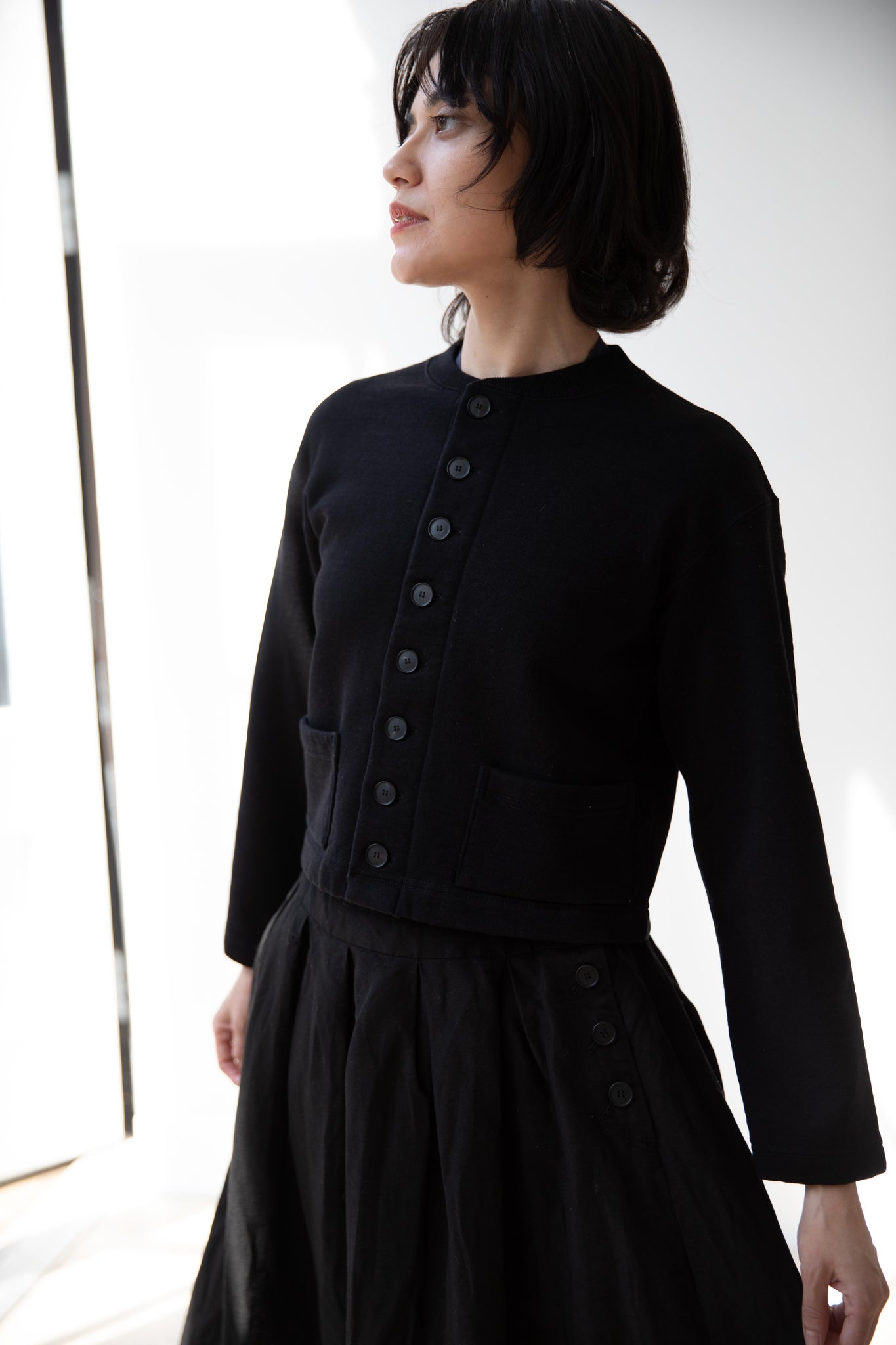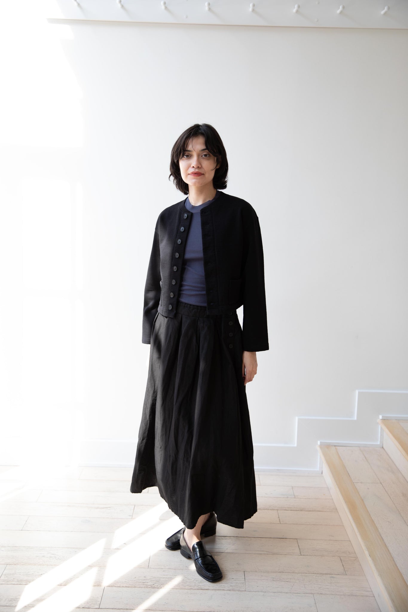 This skirt is made from a structured linen cotton that gives the silhouette a wonderful definition. The waist band has a drawstring inside for any needed adjustments. One side of the skirt has one side pocket.