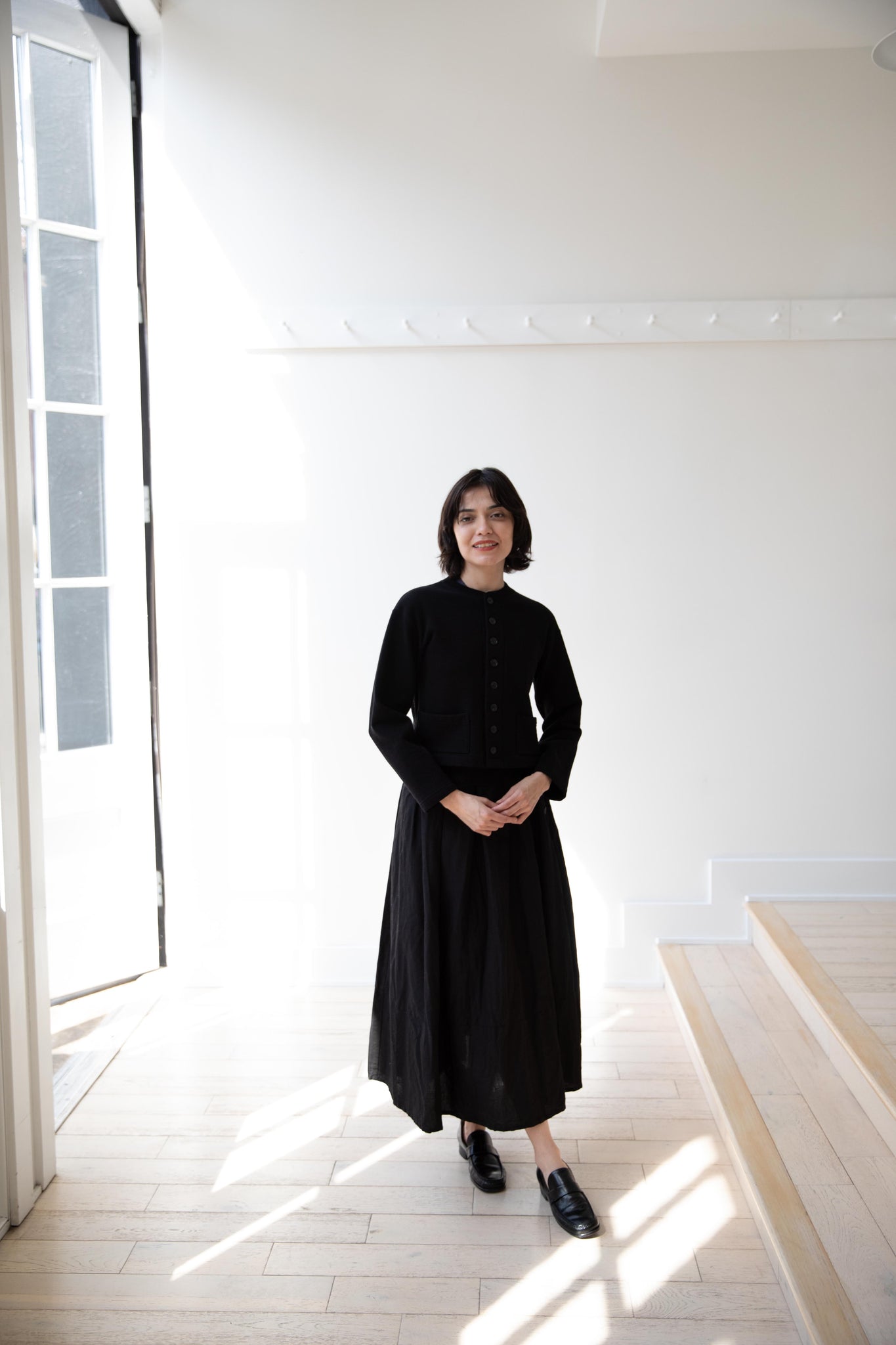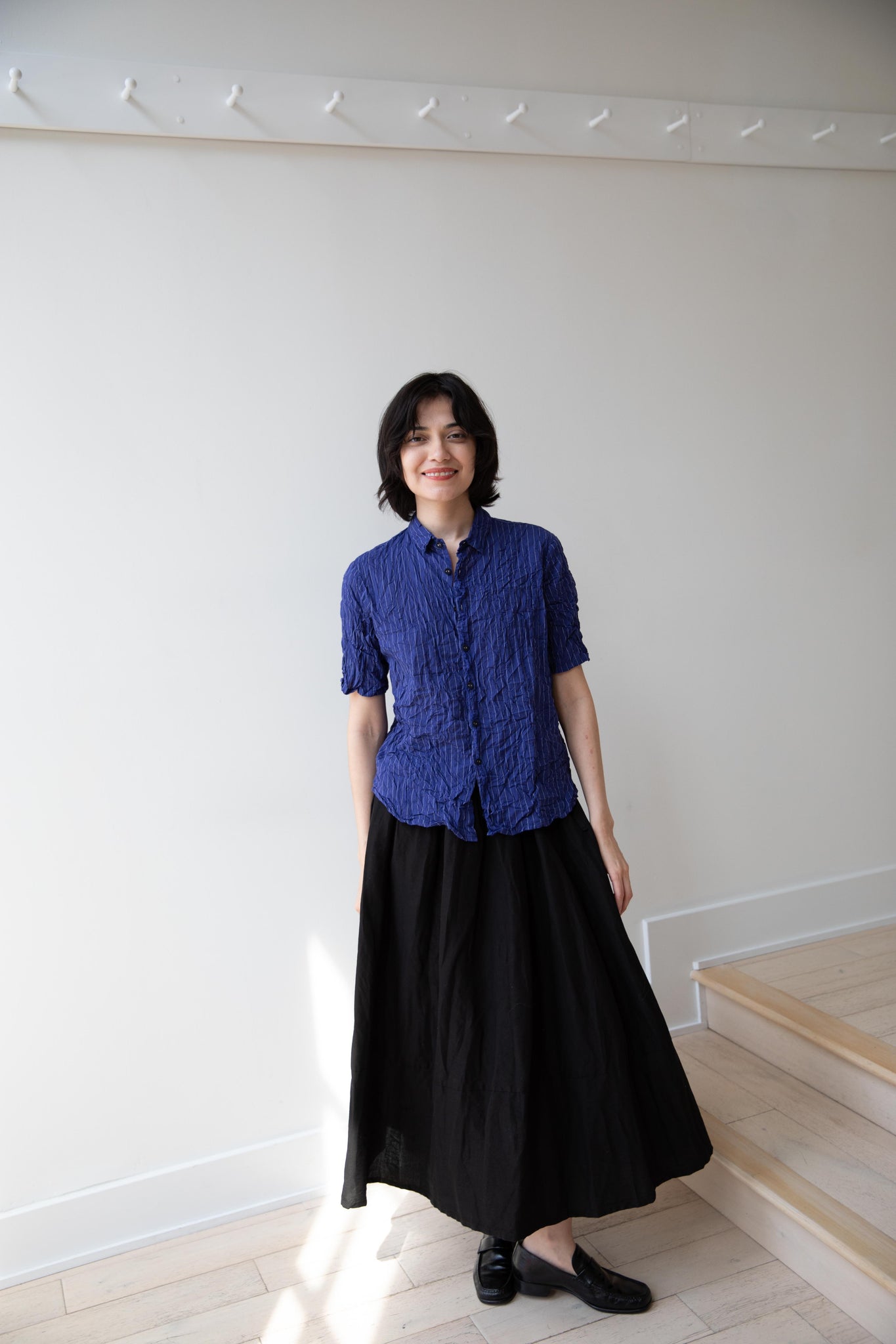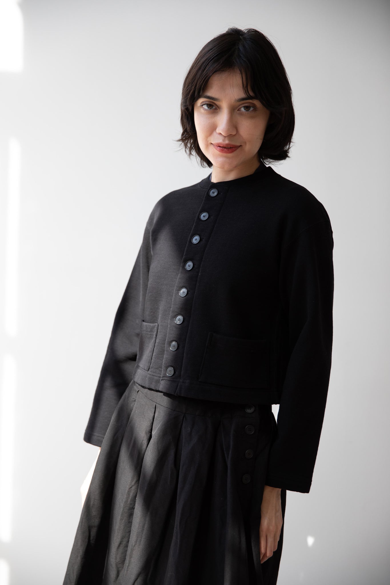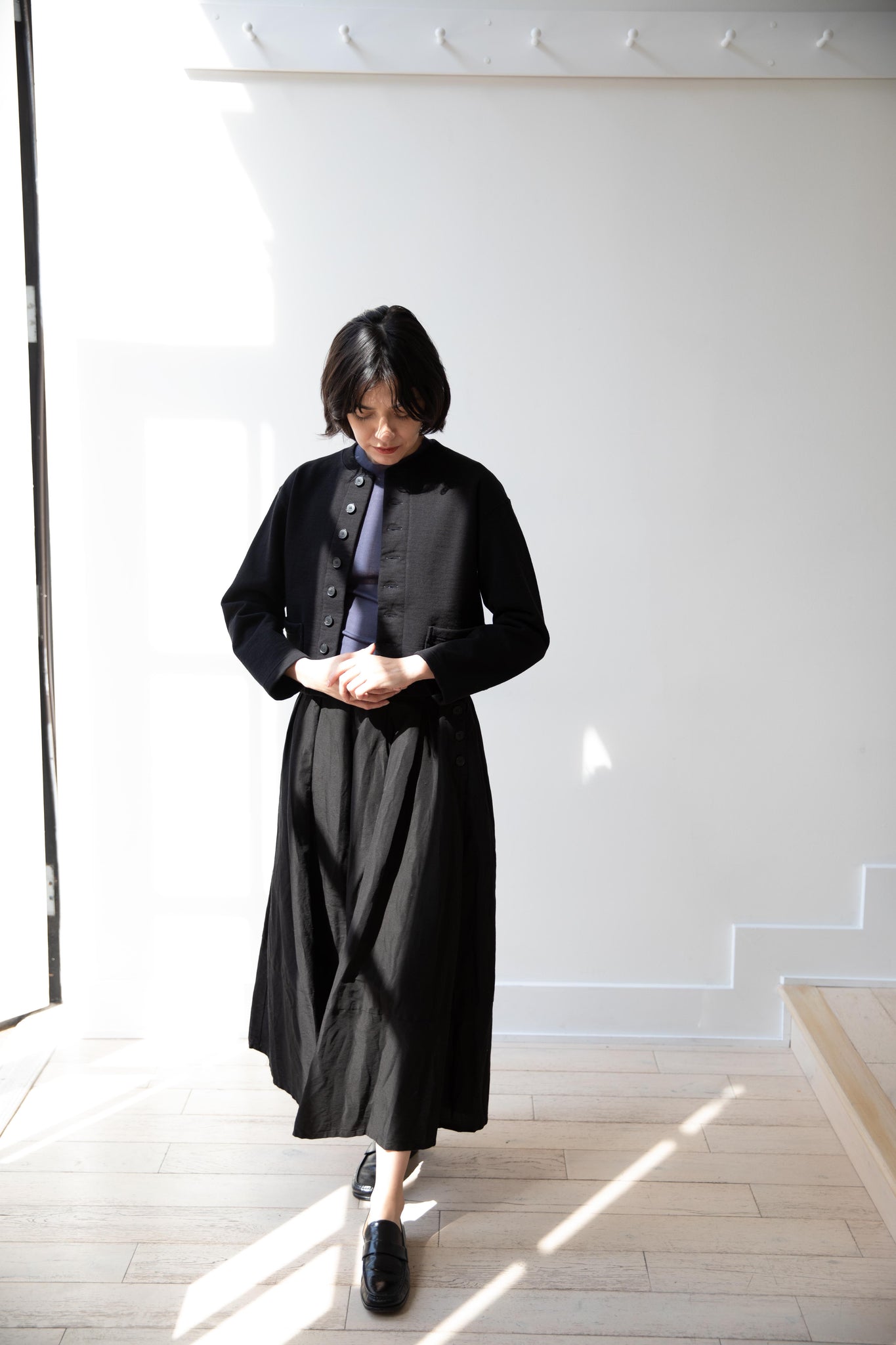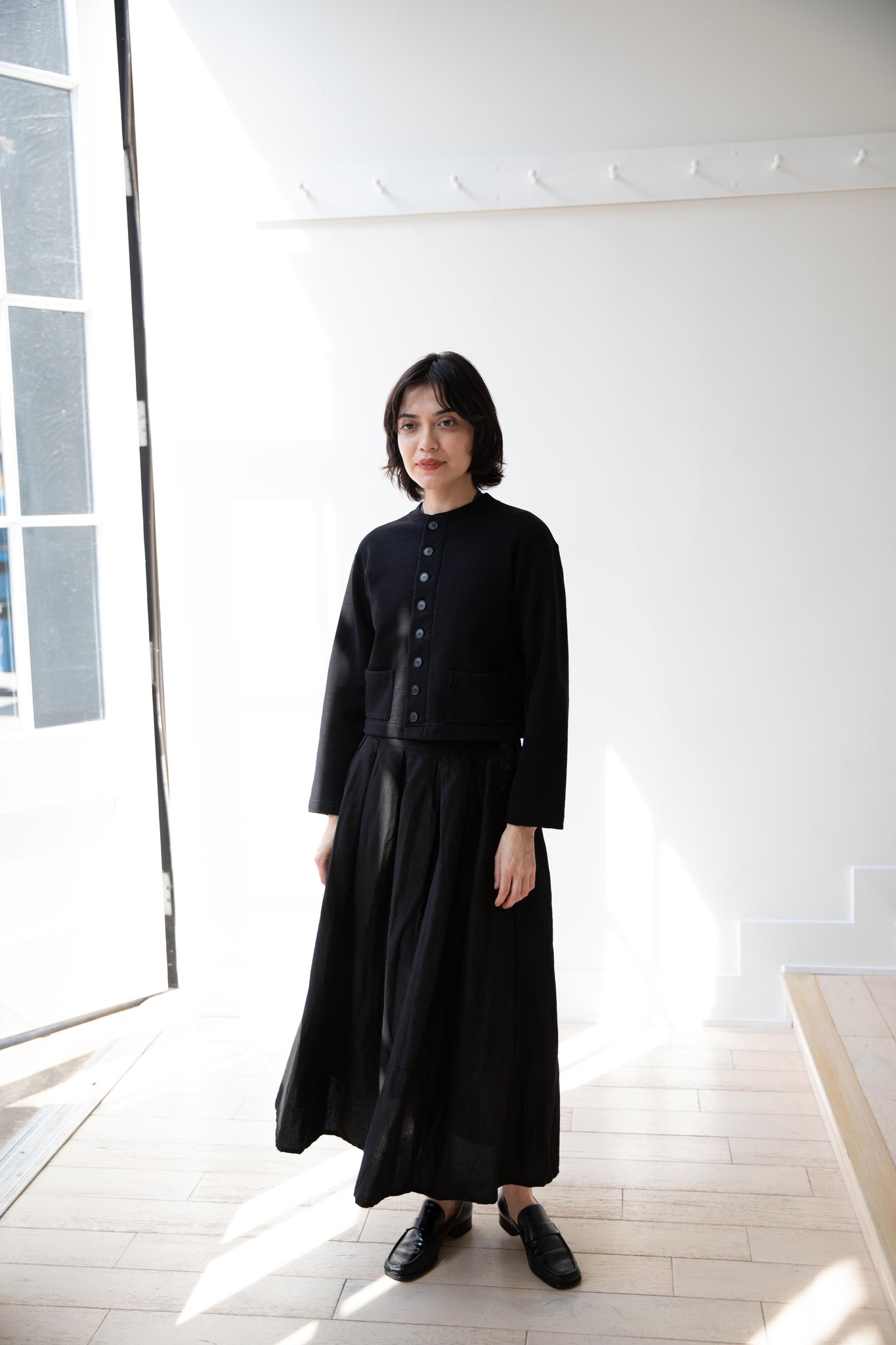 This skirt is made from a structured linen cotton that gives the silhouette a wonderful definition. The waist band has a drawstring inside for any needed adjustments. One side of the skirt has one side pocket.