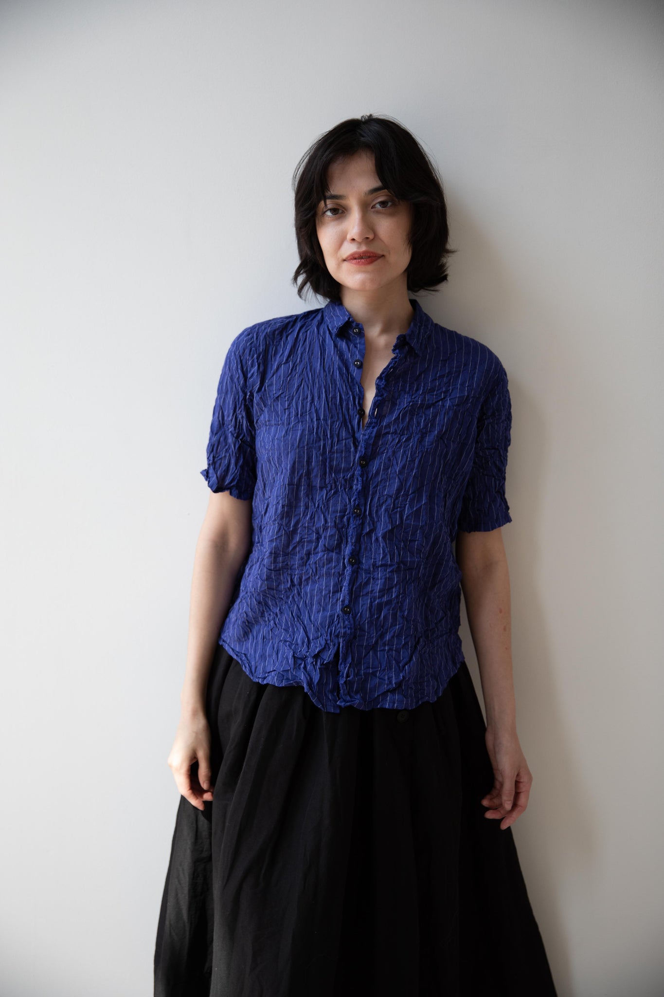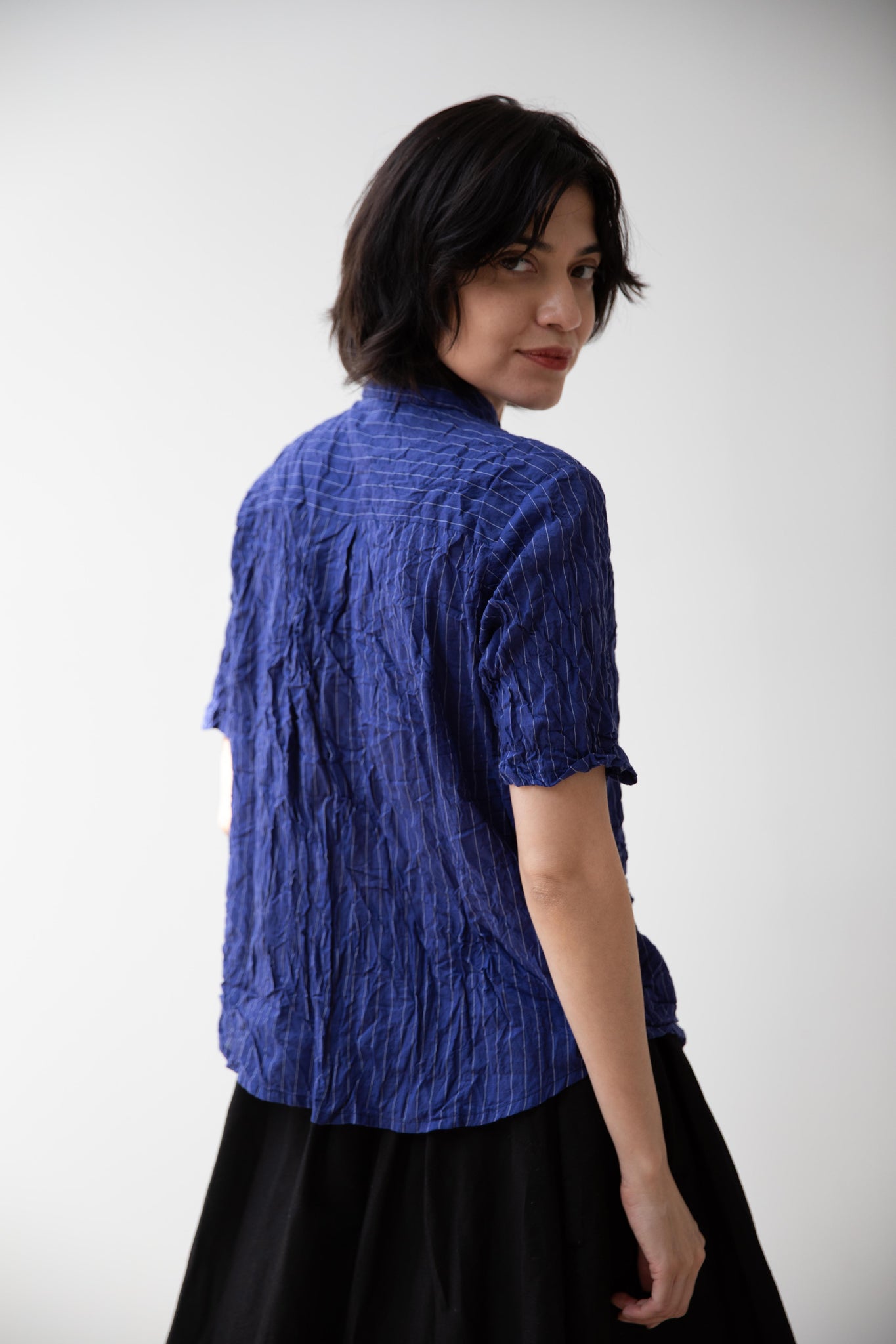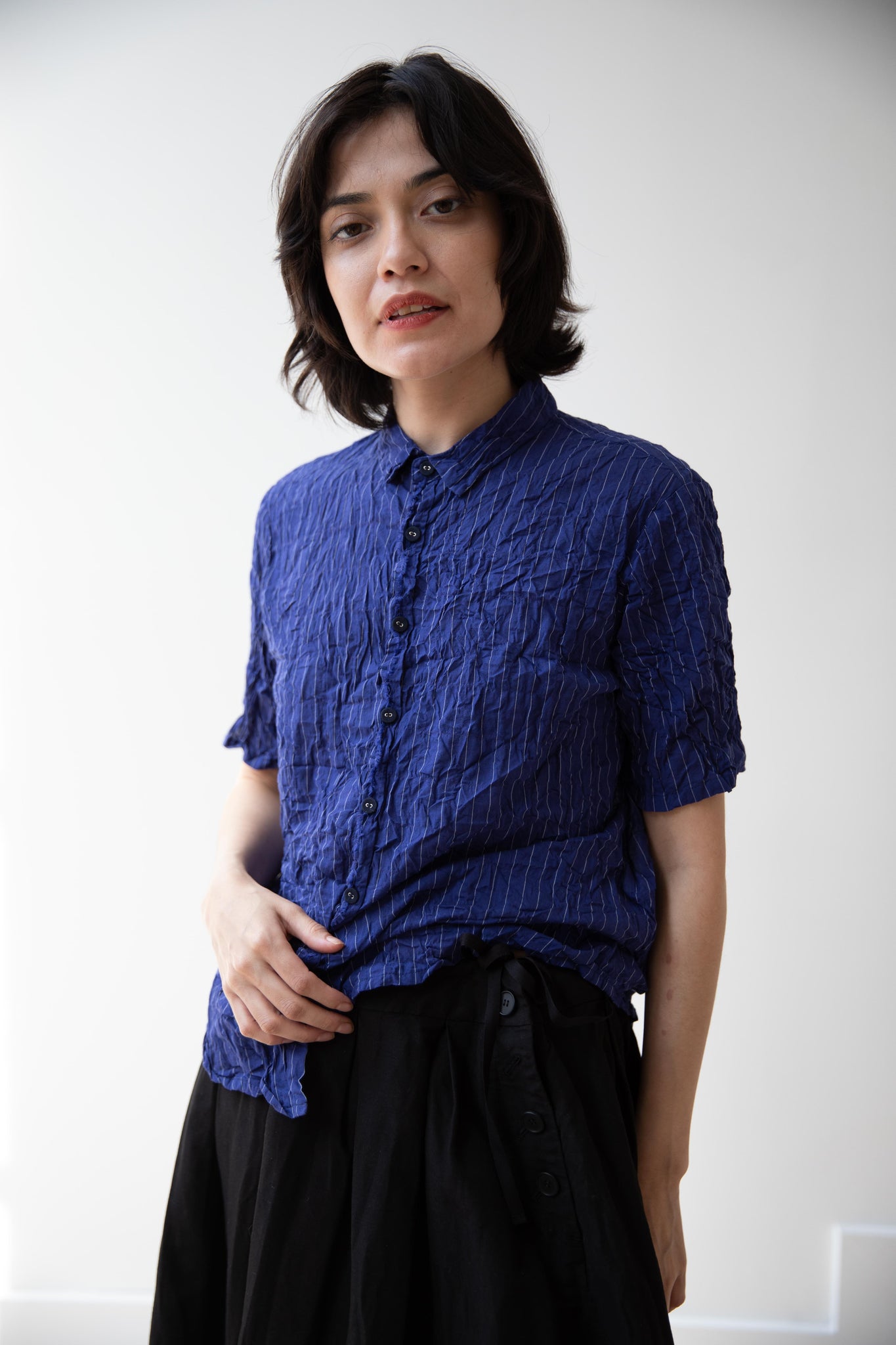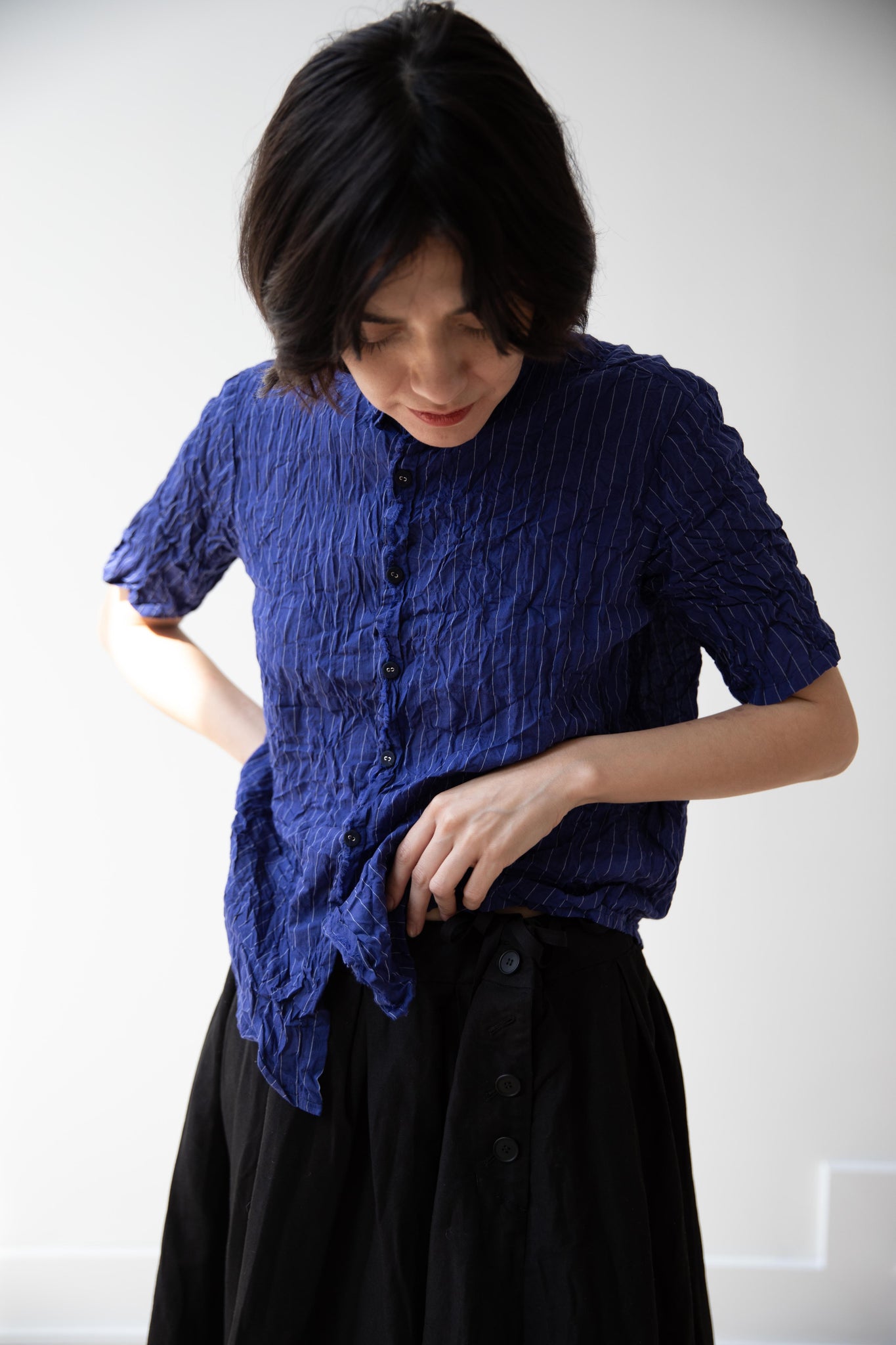 Pas de Calais | Shirring Stripe Short Sleeve Blouse in Navy