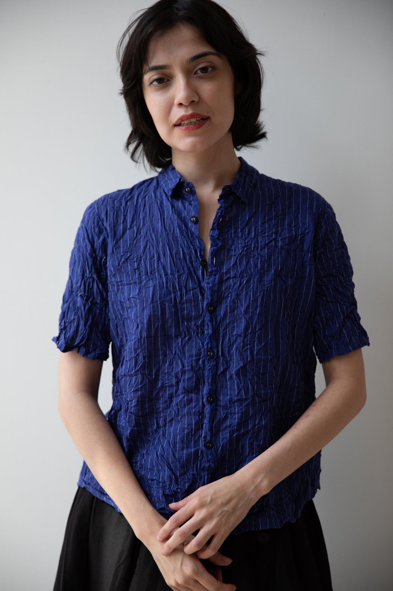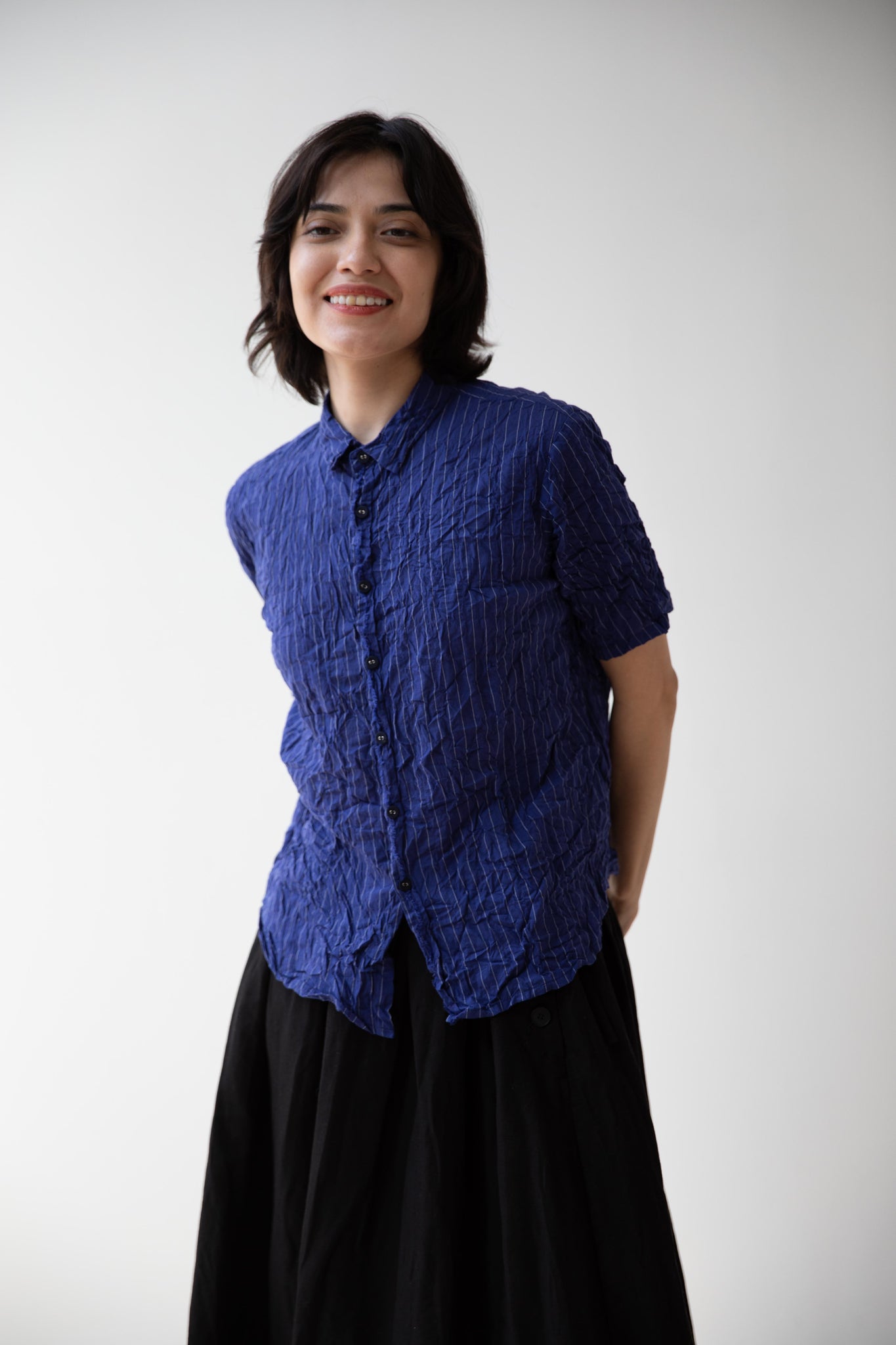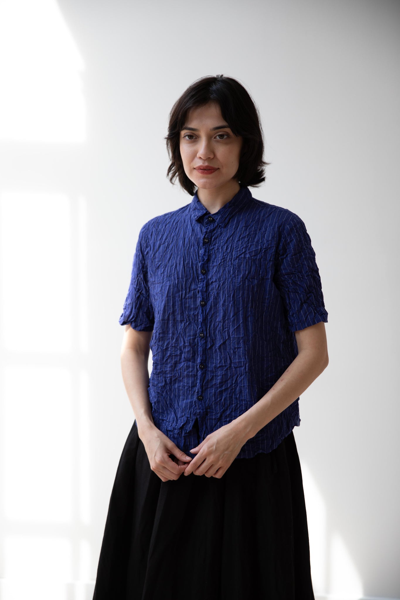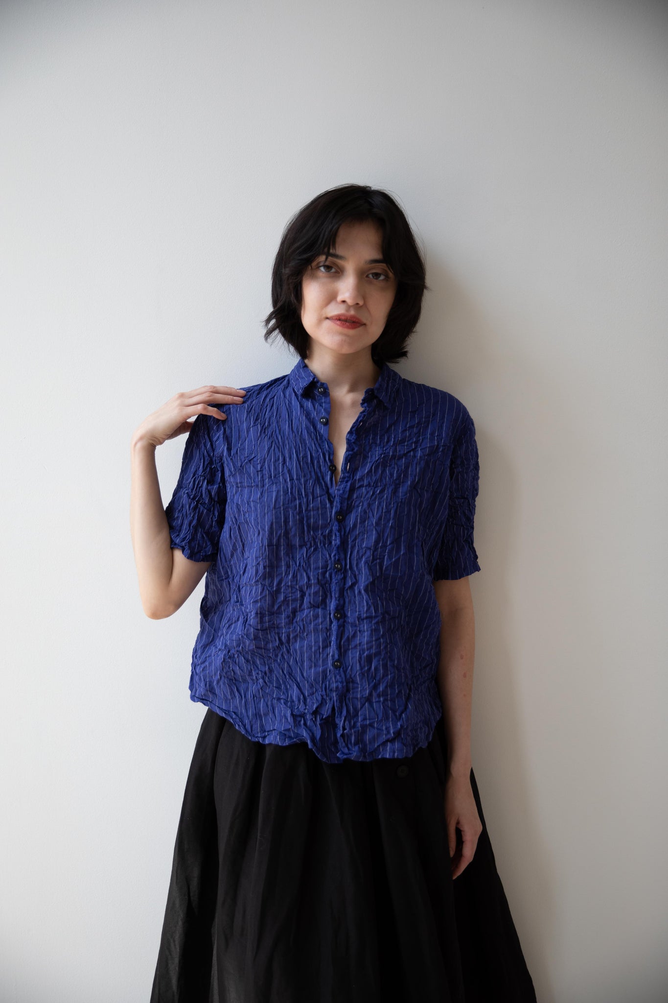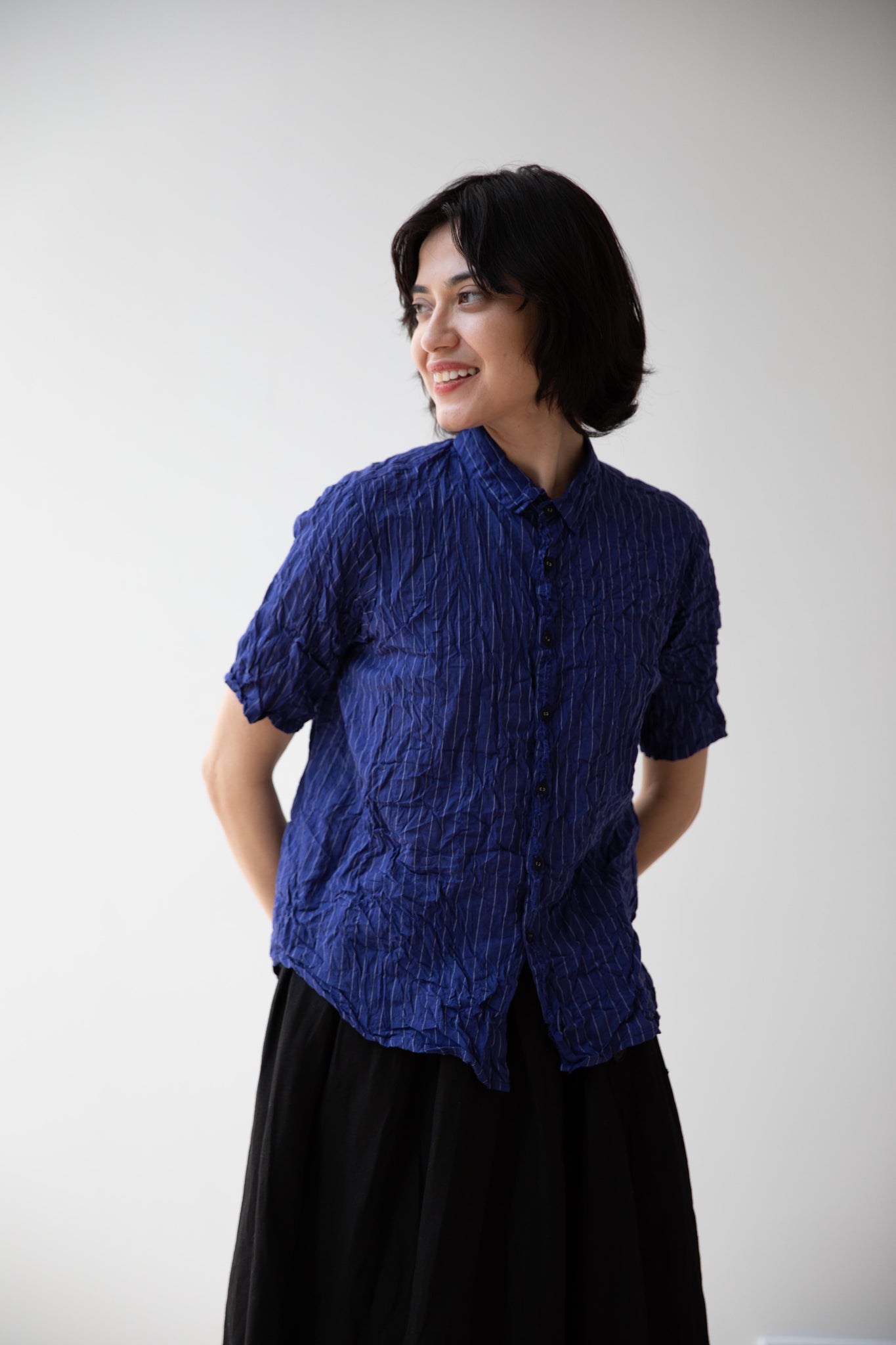Pas de Calais | Shirring Stripe Short Sleeve Blouse in Navy