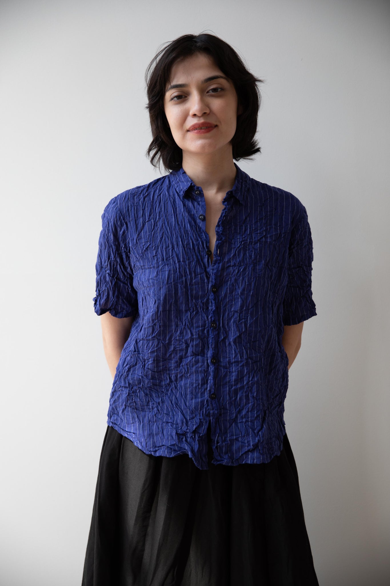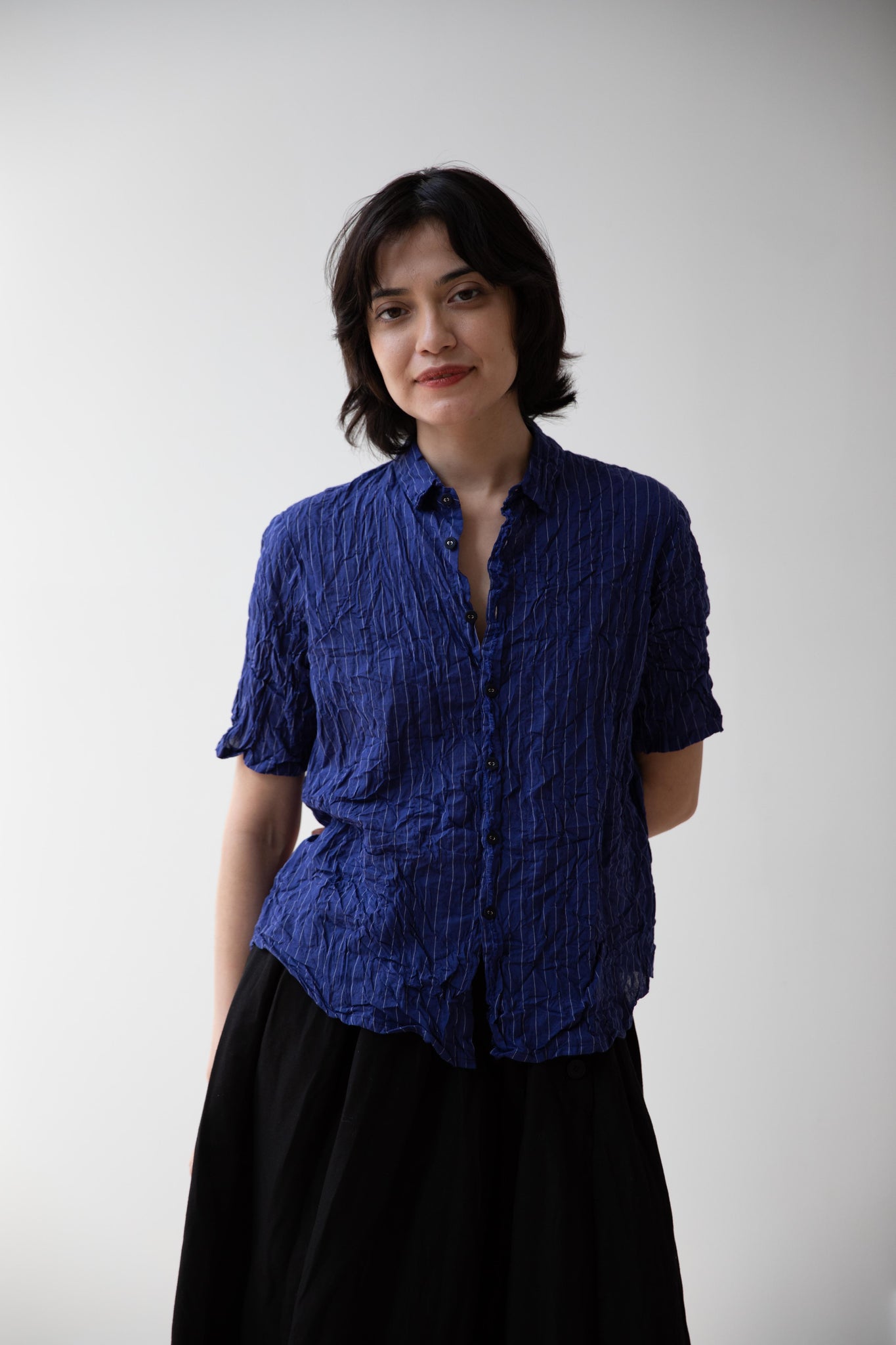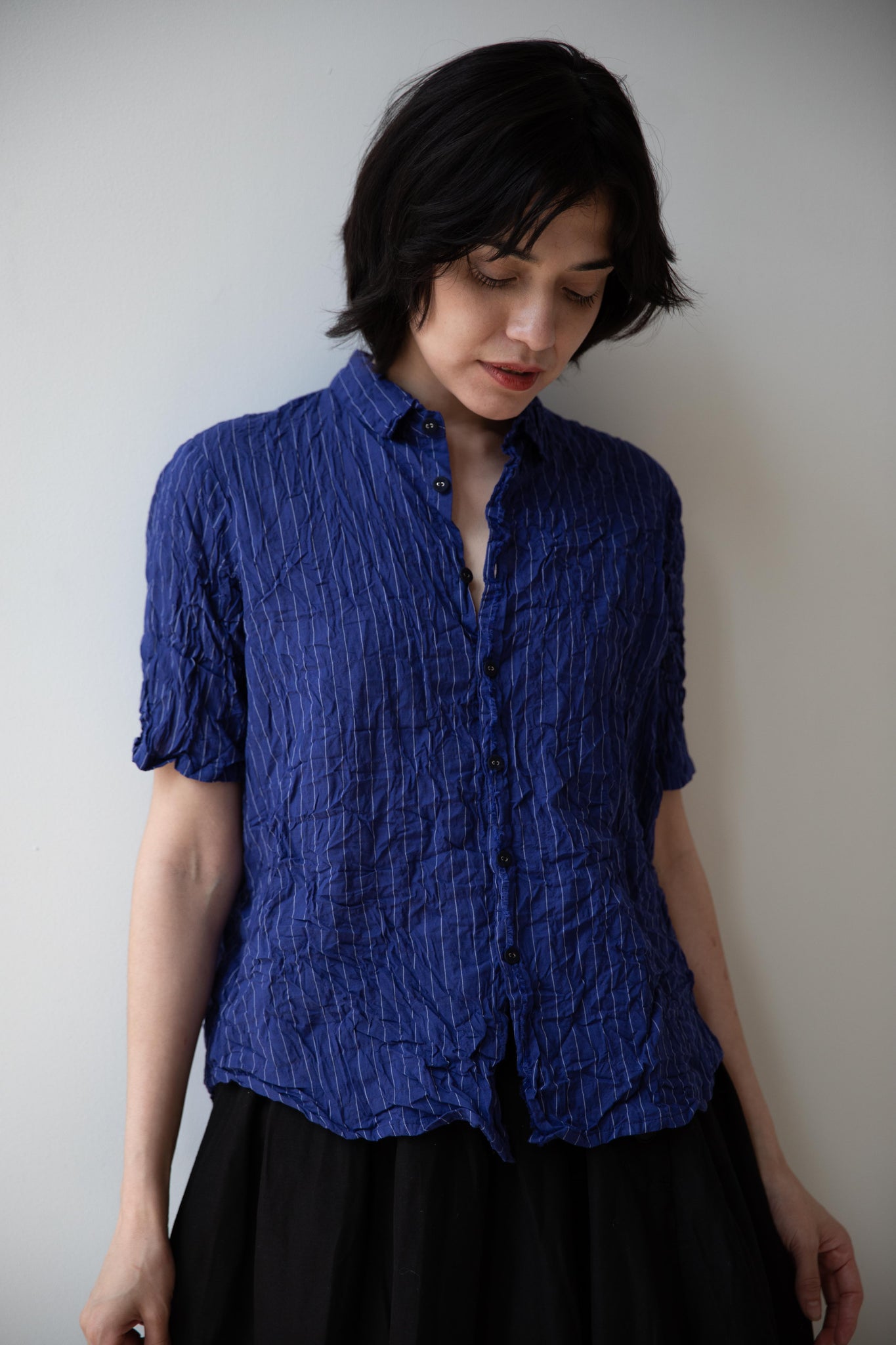 These short sleeve shirts from Pas de Calais are the best!  Made from a lightweight crinkly striped cotton, there is a button up front and petite collar.  There is a subtle raw edge detail down the button placket.