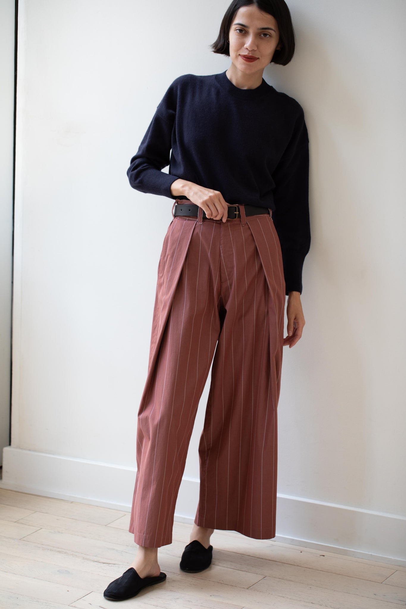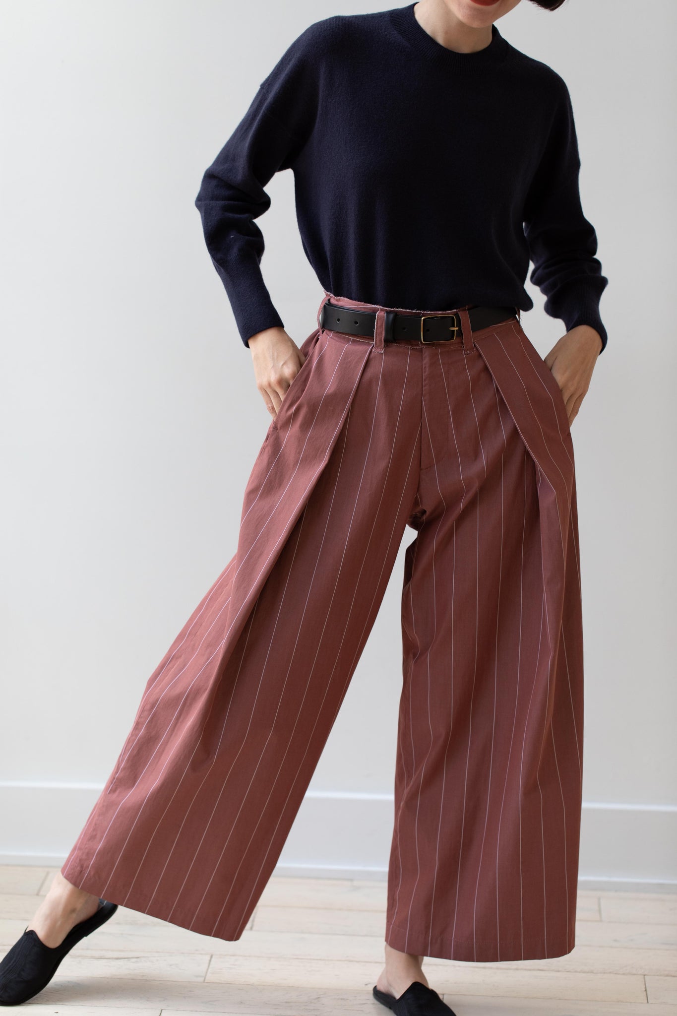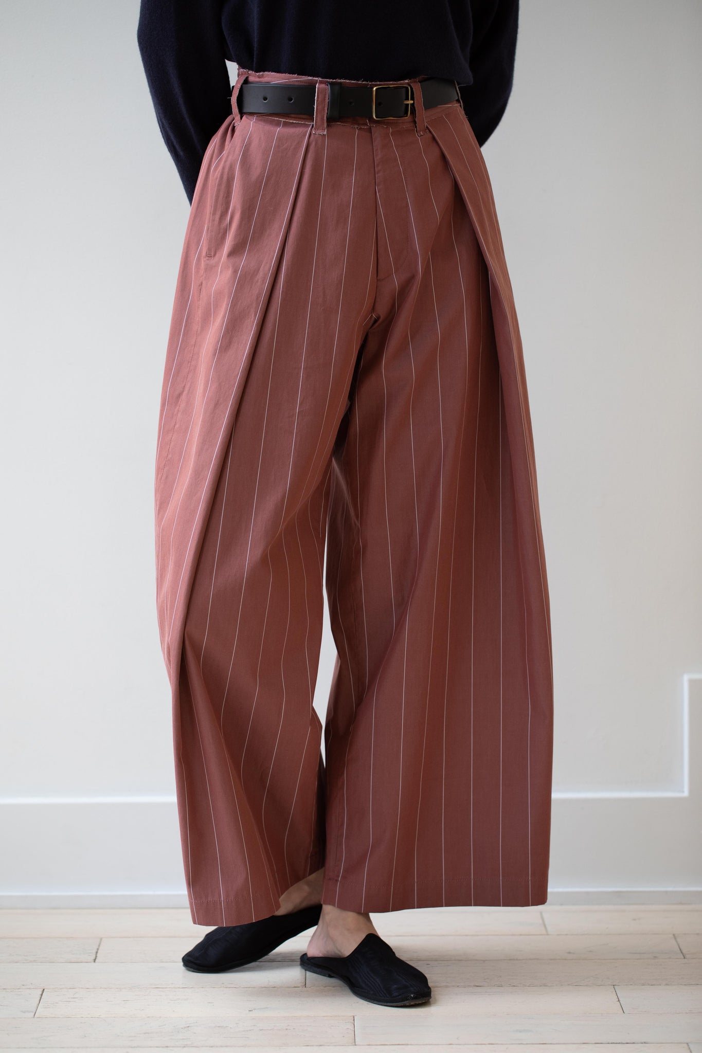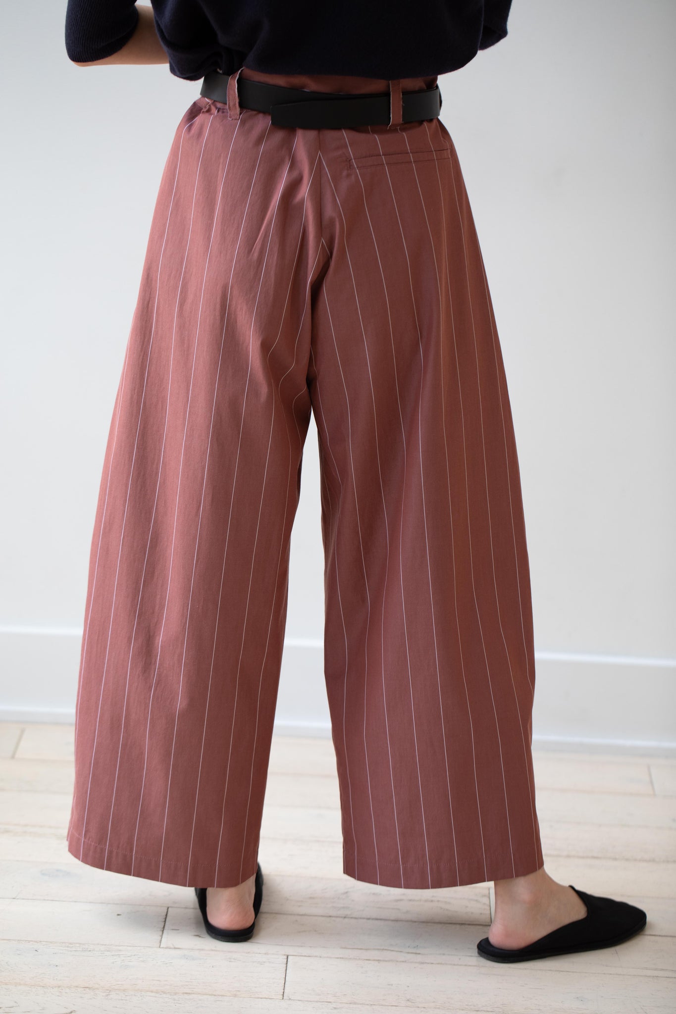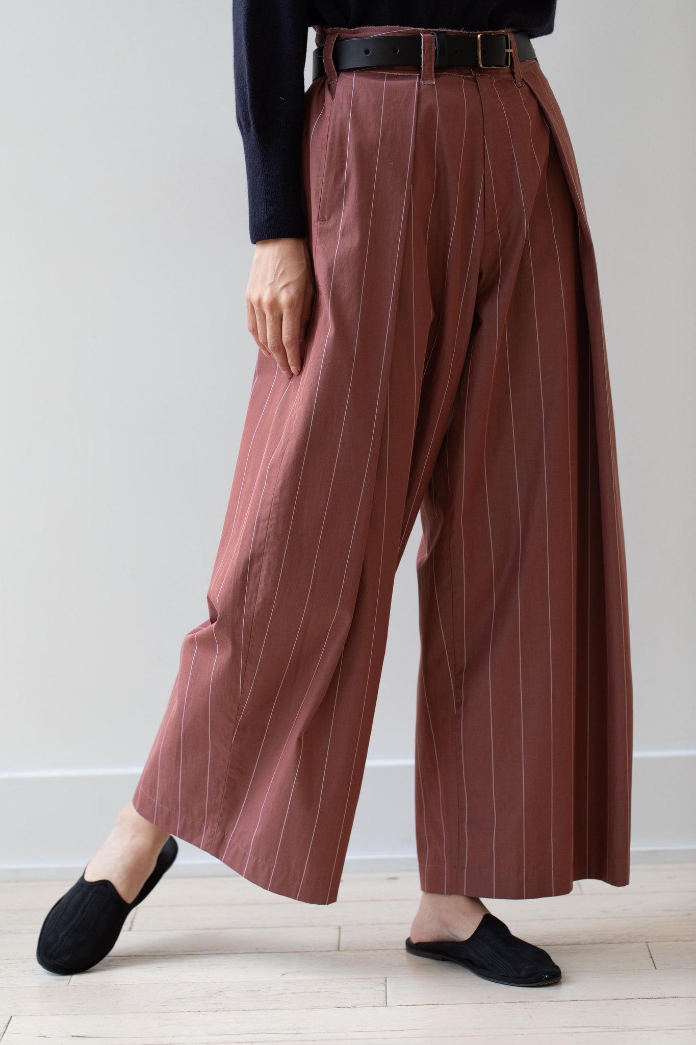 These trousers have an elegant and elongated wide leg.  They have a raw waist band and belt loops, two side pockets and a back pocket too.  Made from a soft yet crisp cotton, the reddish clay color is quite striking and has a thin light pin stripe running through it.