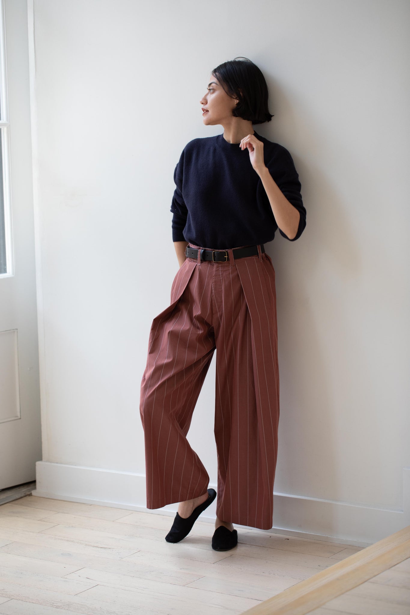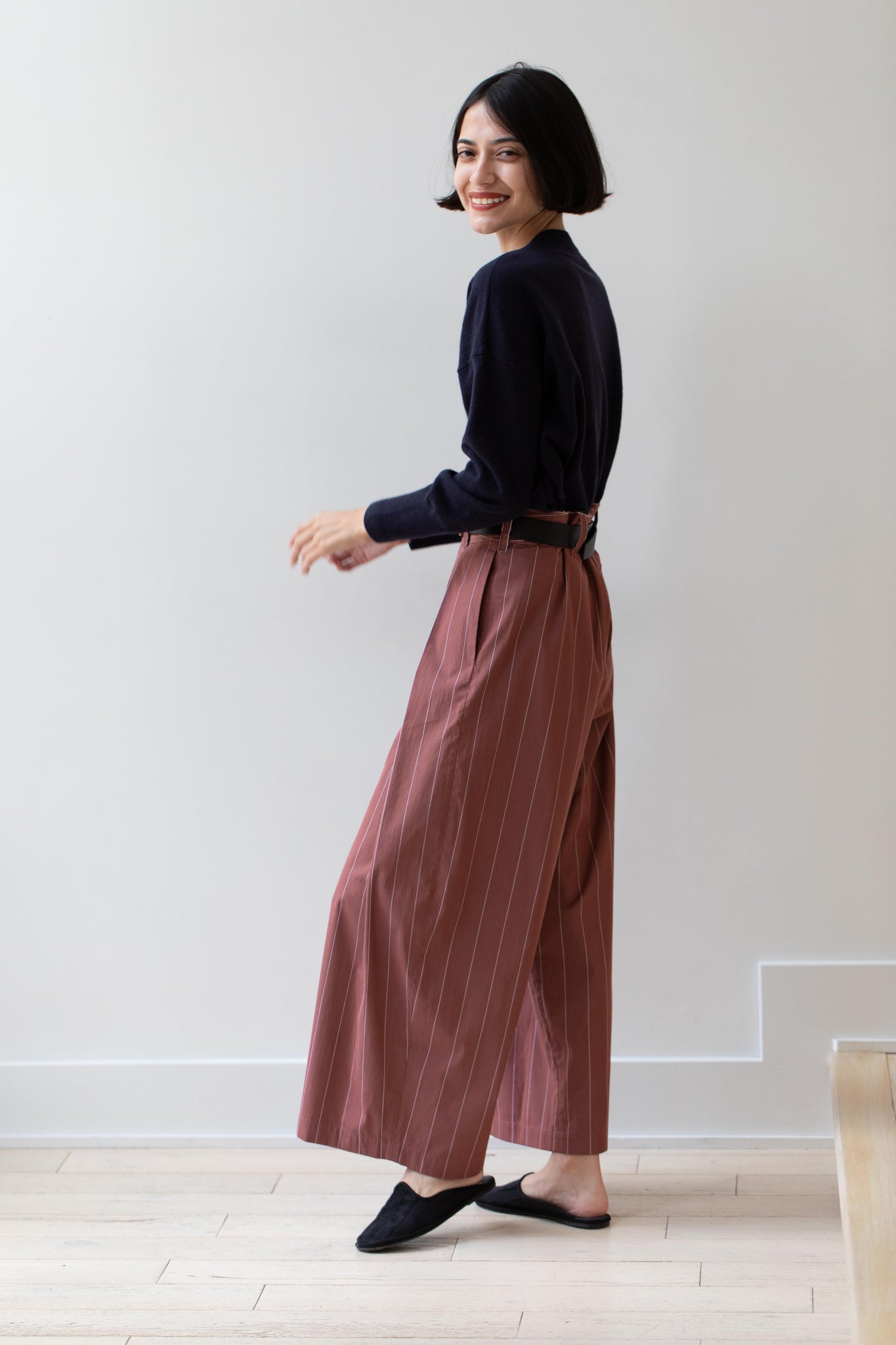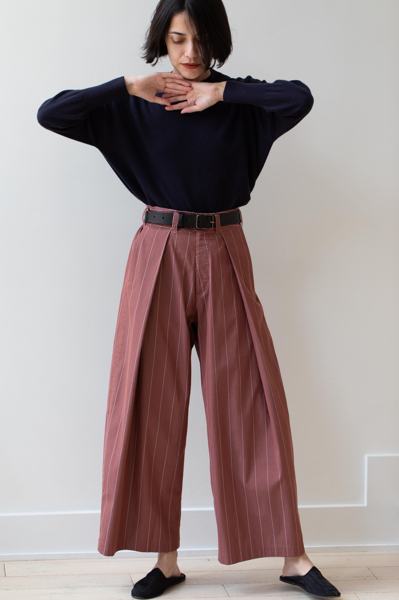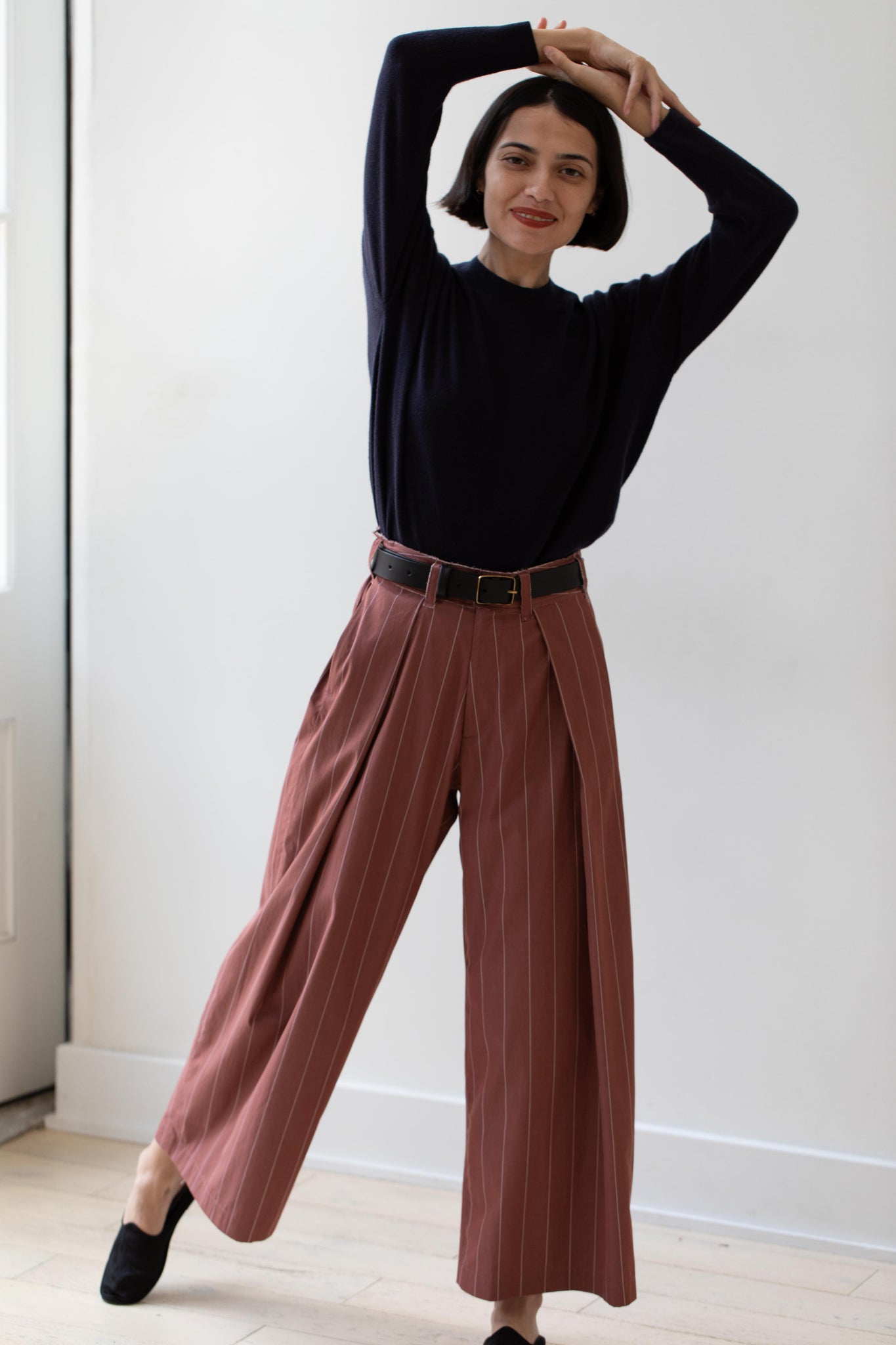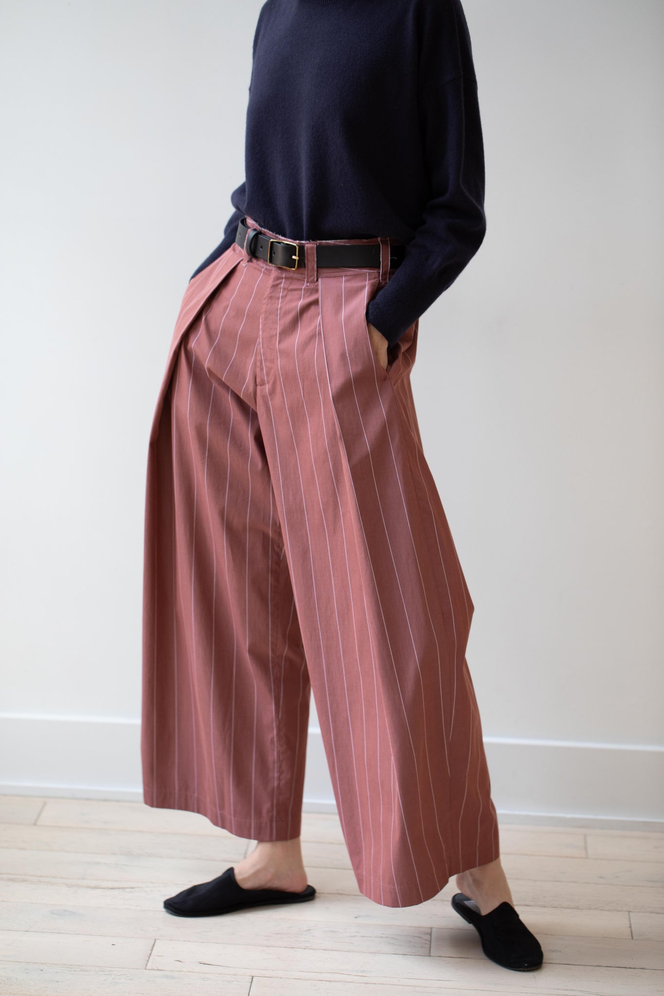These trousers have an elegant and elongated wide leg.  They have a raw waist band and belt loops, two side pockets and a back pocket too.  Made from a soft yet crisp cotton, the reddish clay color is quite striking and has a thin light pin stripe running through it.