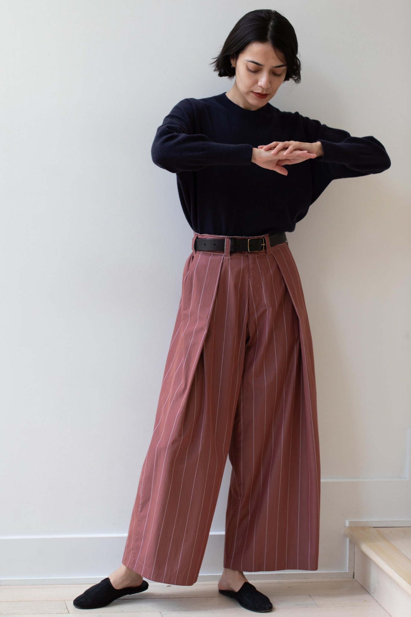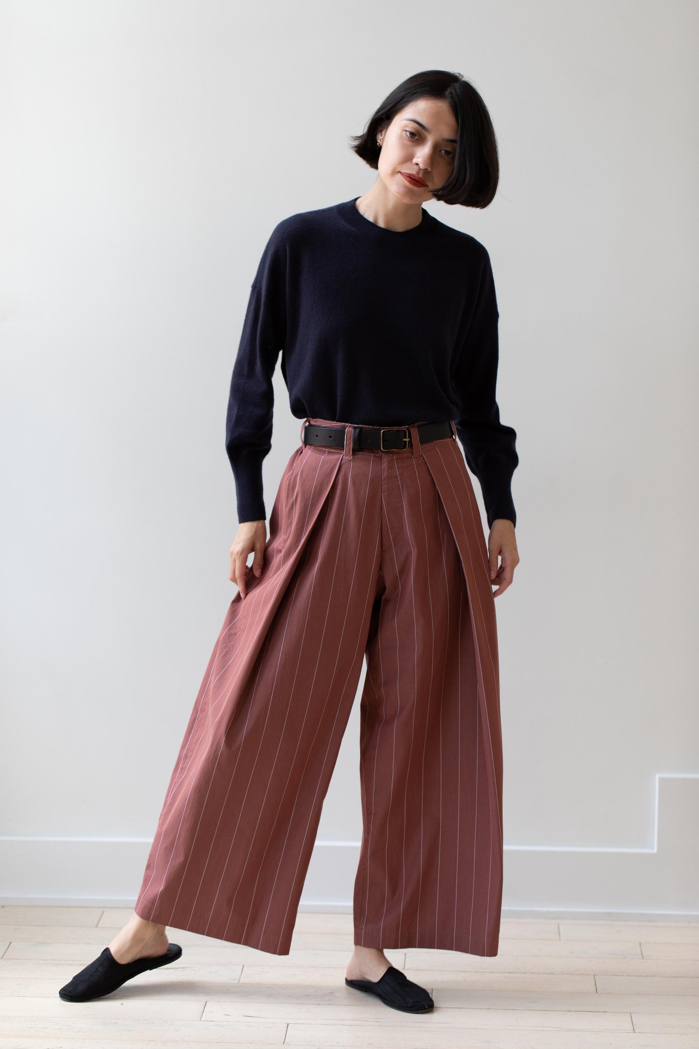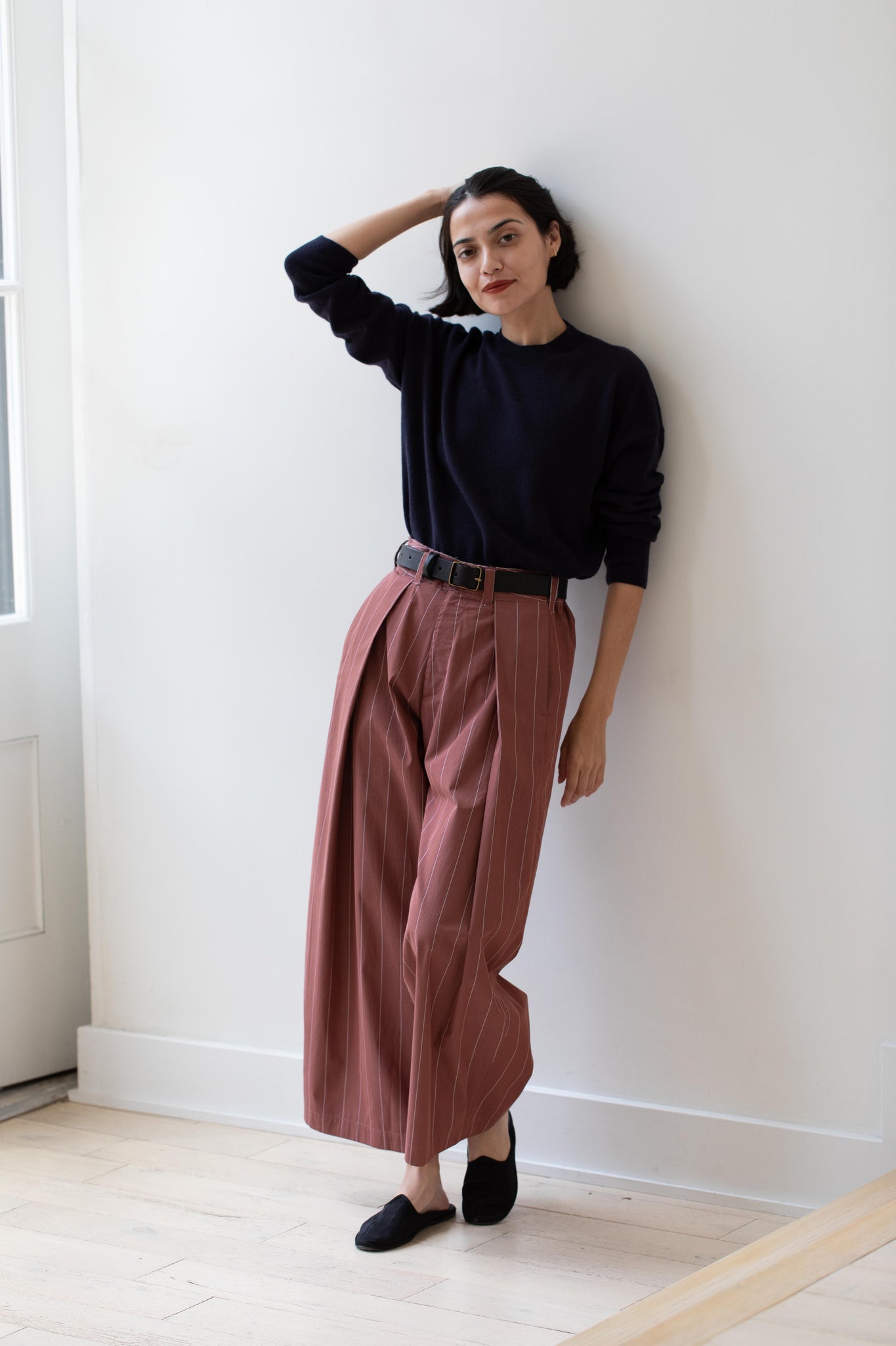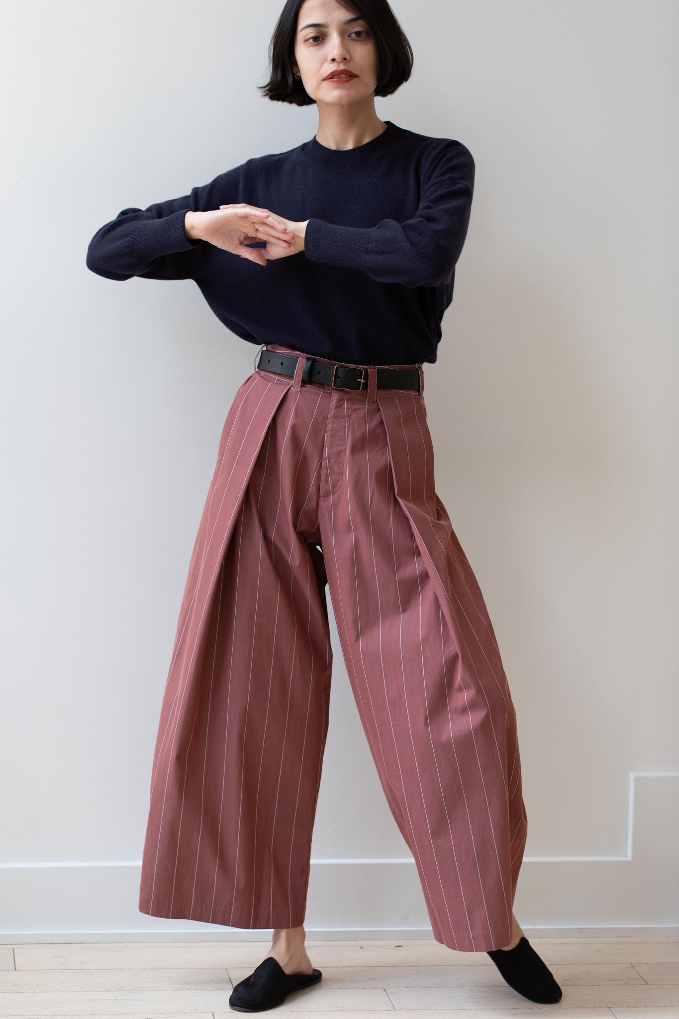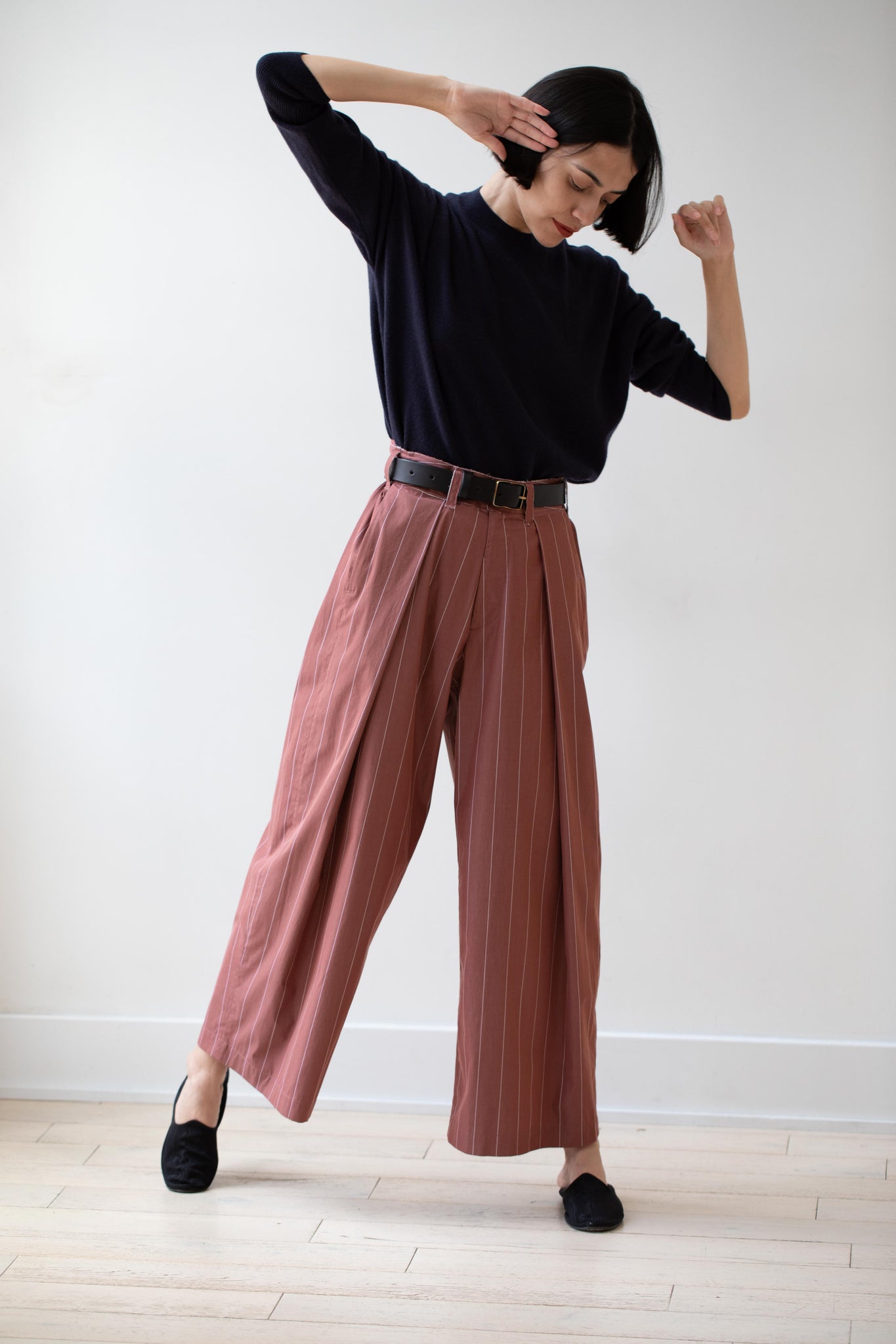 These trousers have an elegant and elongated wide leg.  They have a raw waist band and belt loops, two side pockets and a back pocket too.  Made from a soft yet crisp cotton, the reddish clay color is quite striking and has a thin light pin stripe running through it.