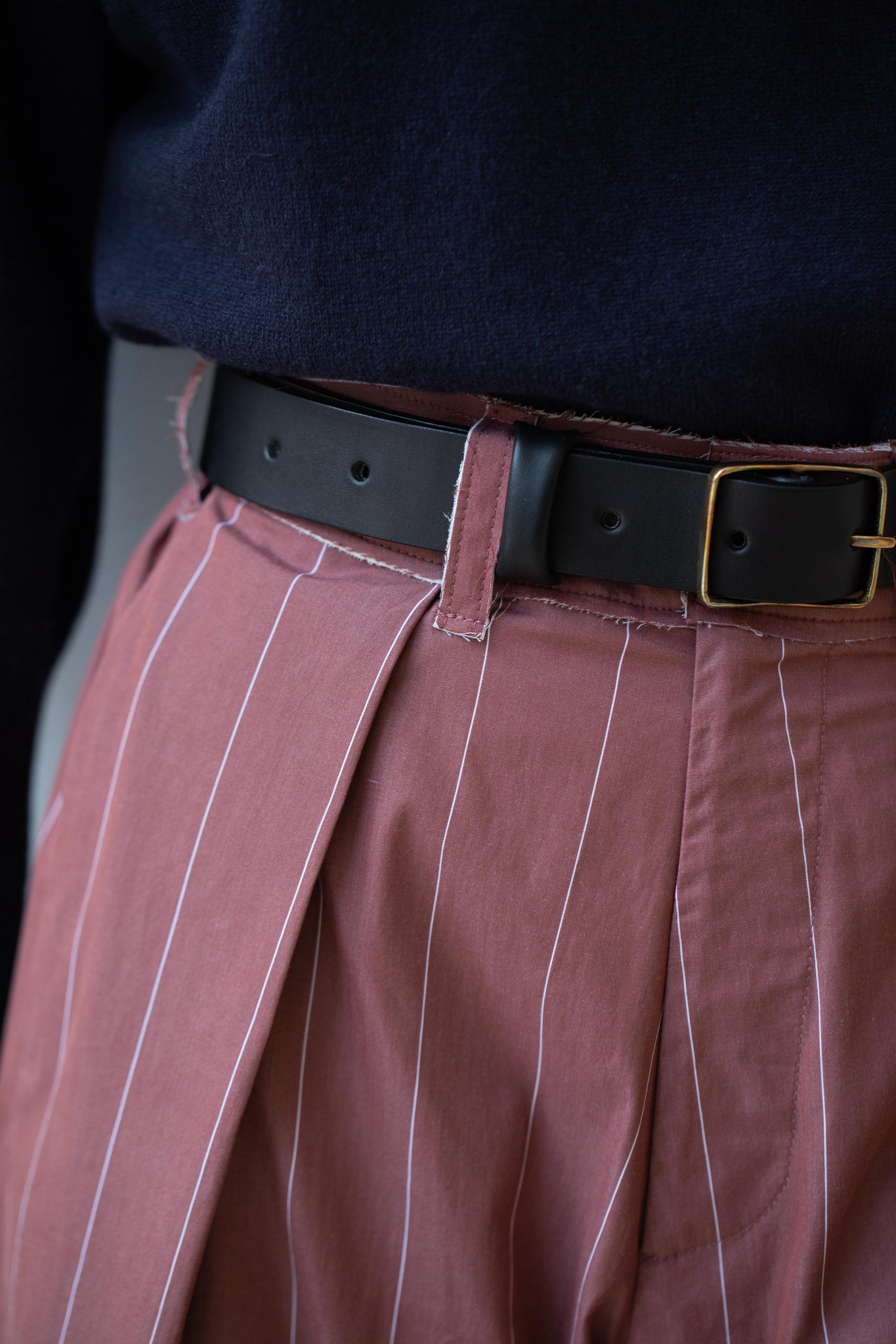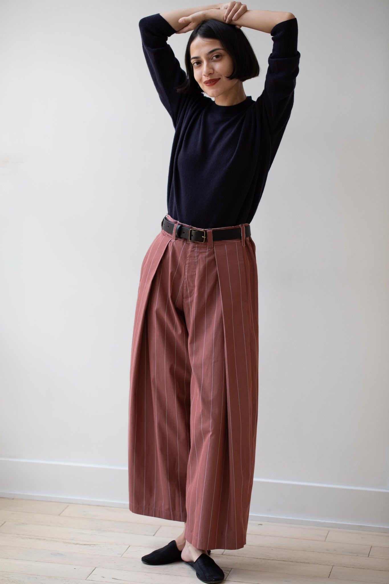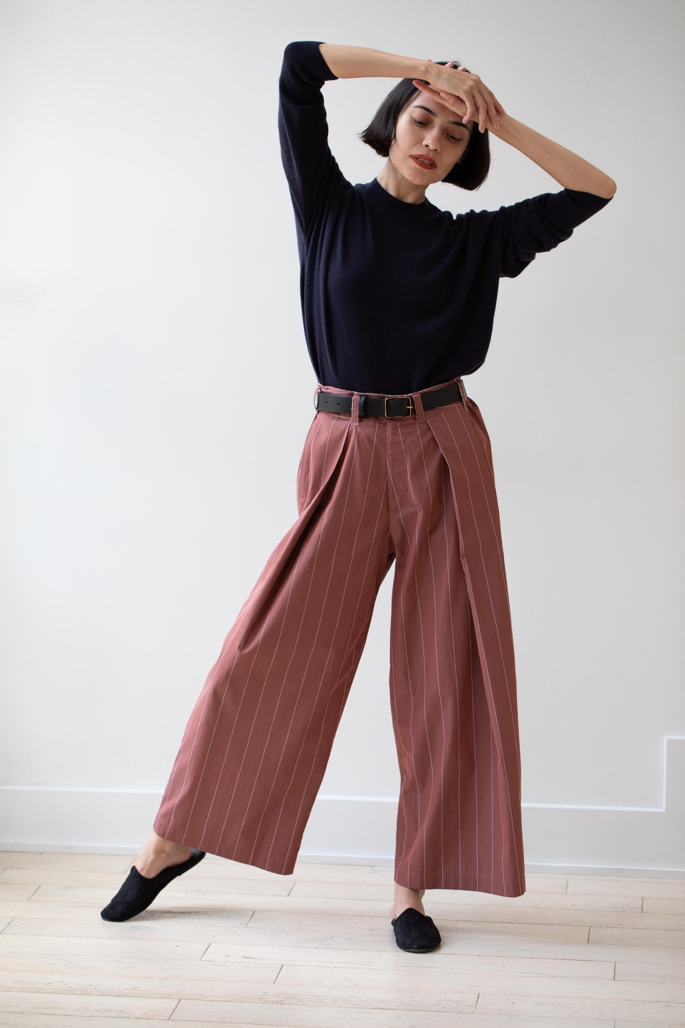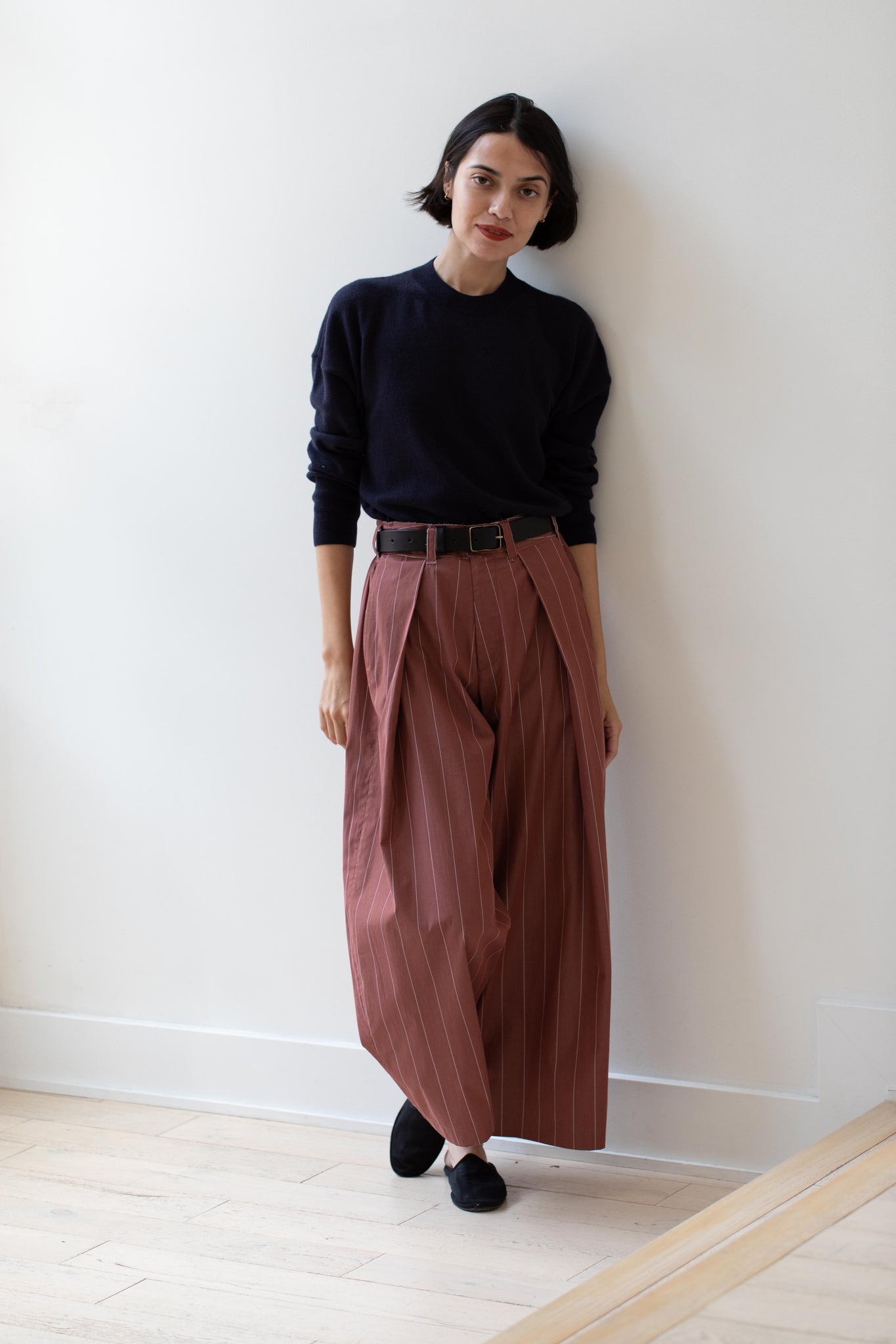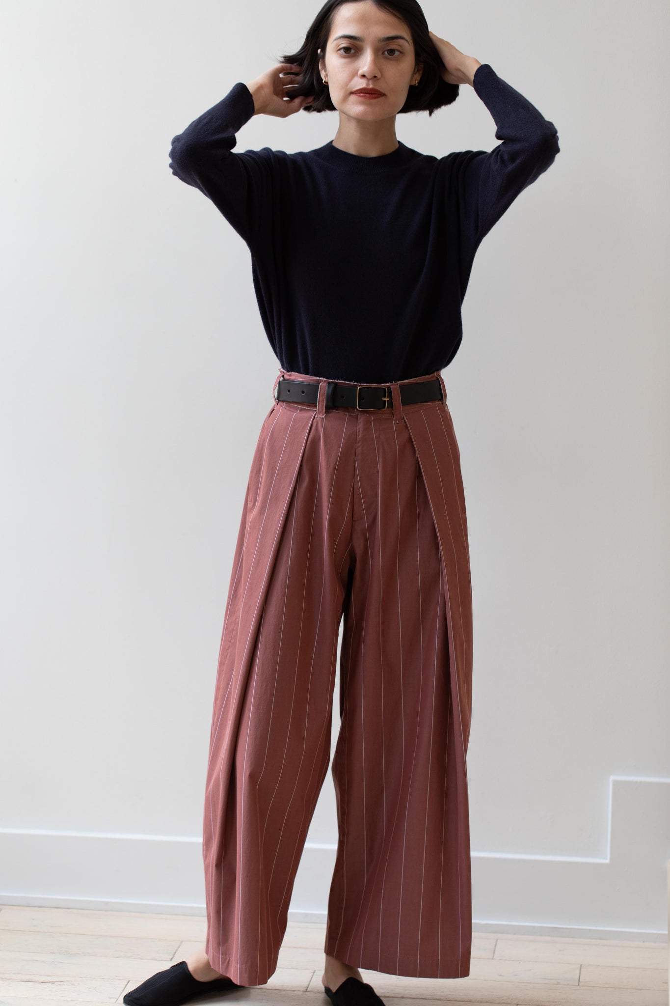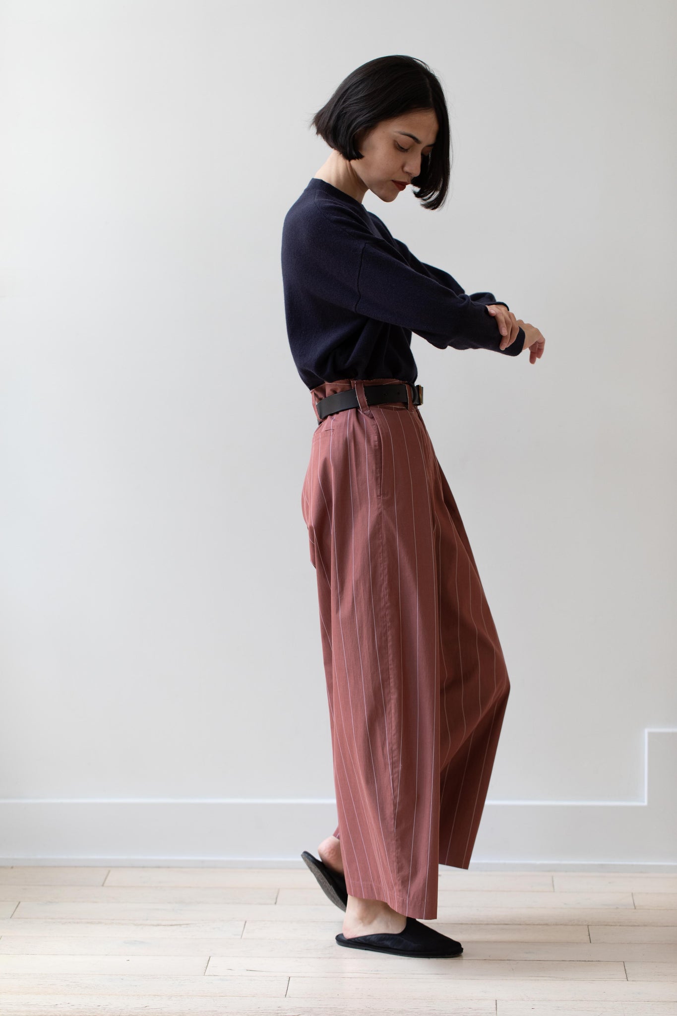 These trousers have an elegant and elongated wide leg.  They have a raw waist band and belt loops, two side pockets and a back pocket too.  Made from a soft yet crisp cotton, the reddish clay color is quite striking and has a thin light pin stripe running through it.