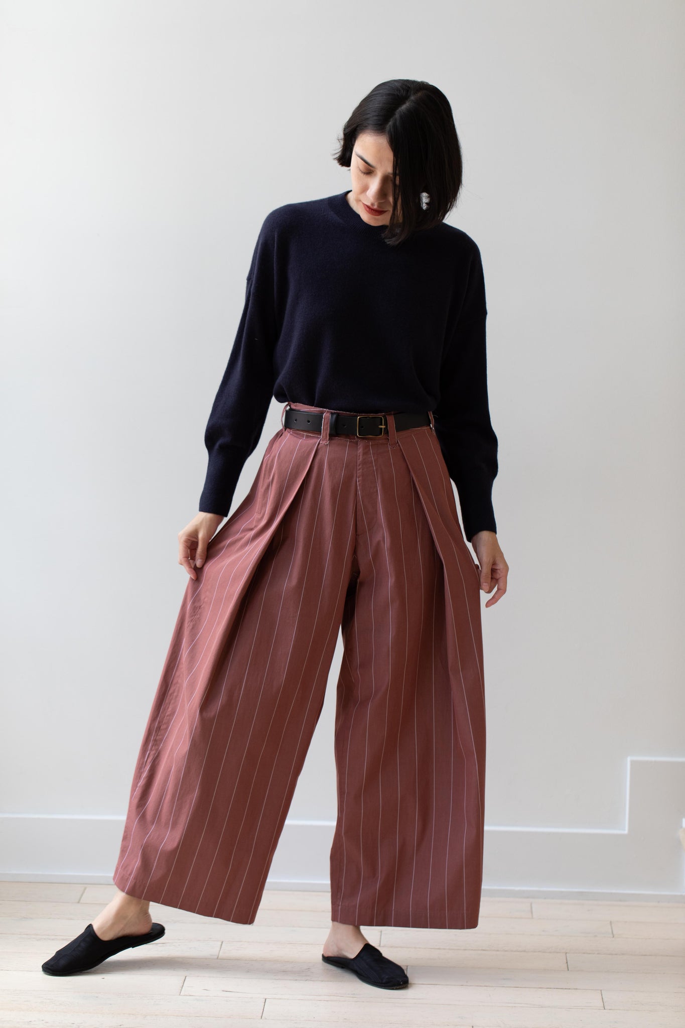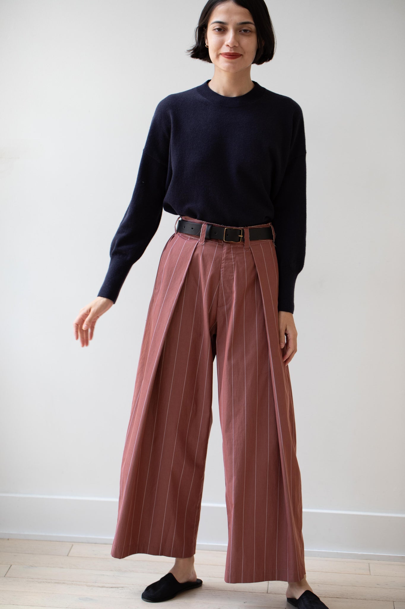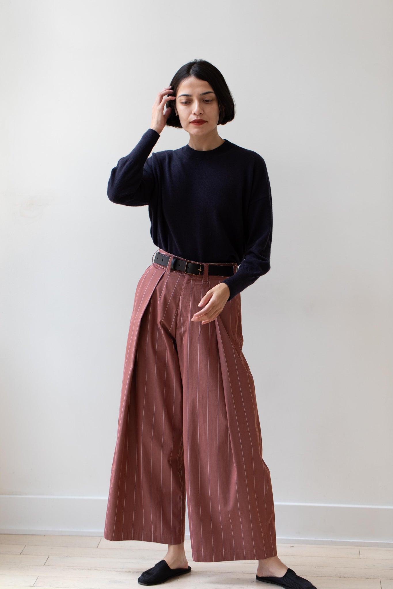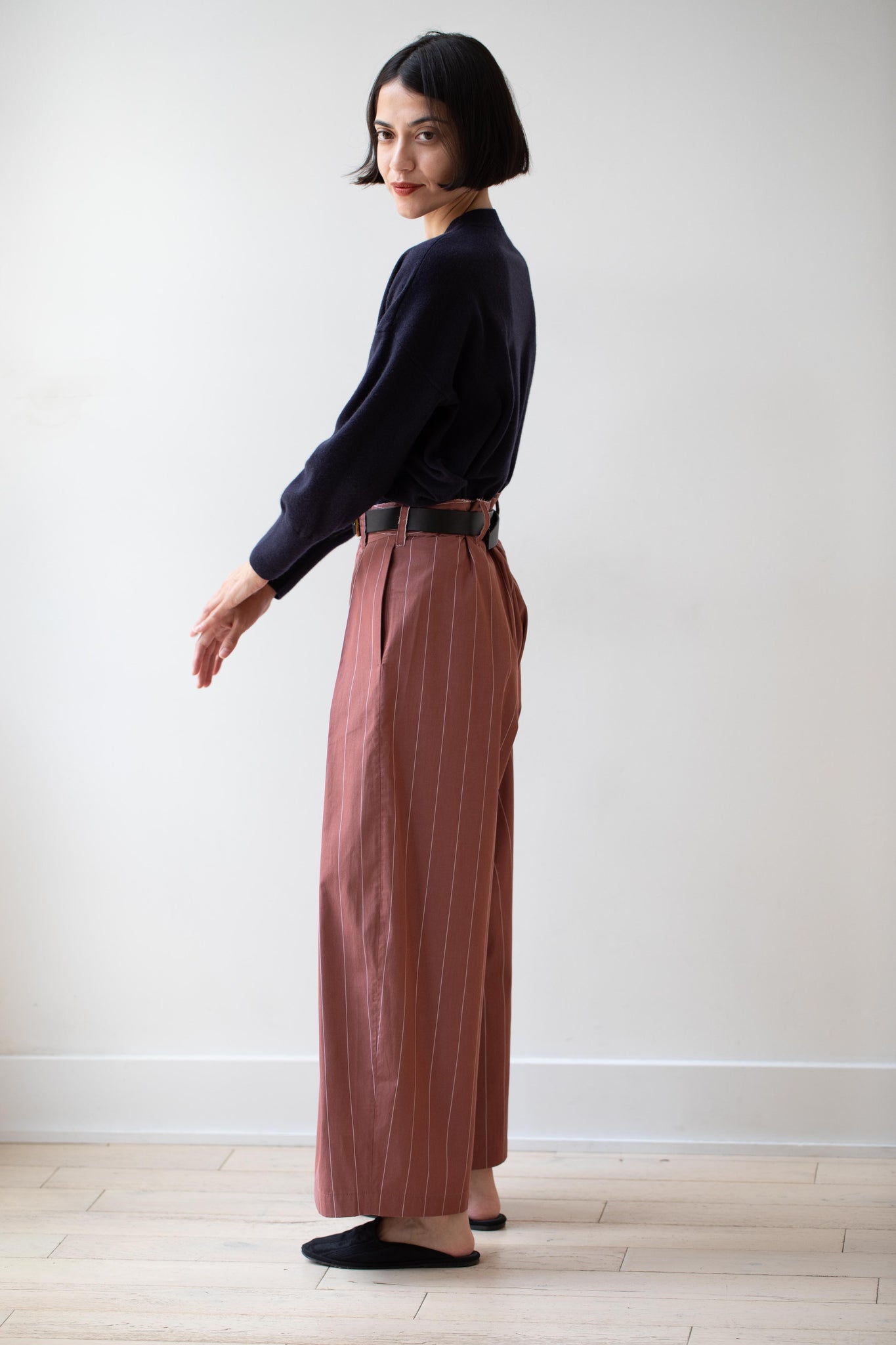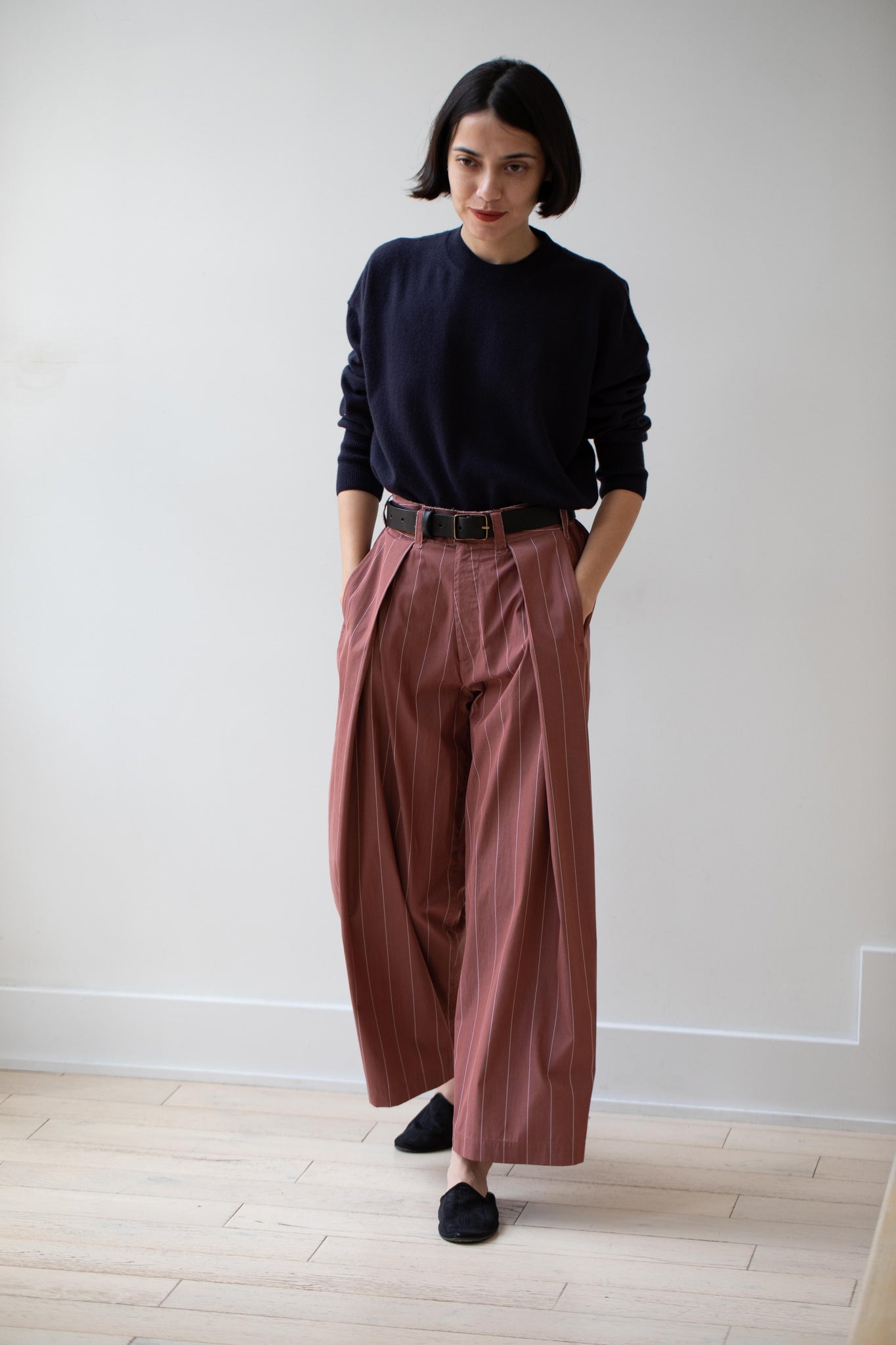 These trousers have an elegant and elongated wide leg.  They have a raw waist band and belt loops, two side pockets and a back pocket too.  Made from a soft yet crisp cotton, the reddish clay color is quite striking and has a thin light pin stripe running through it.
