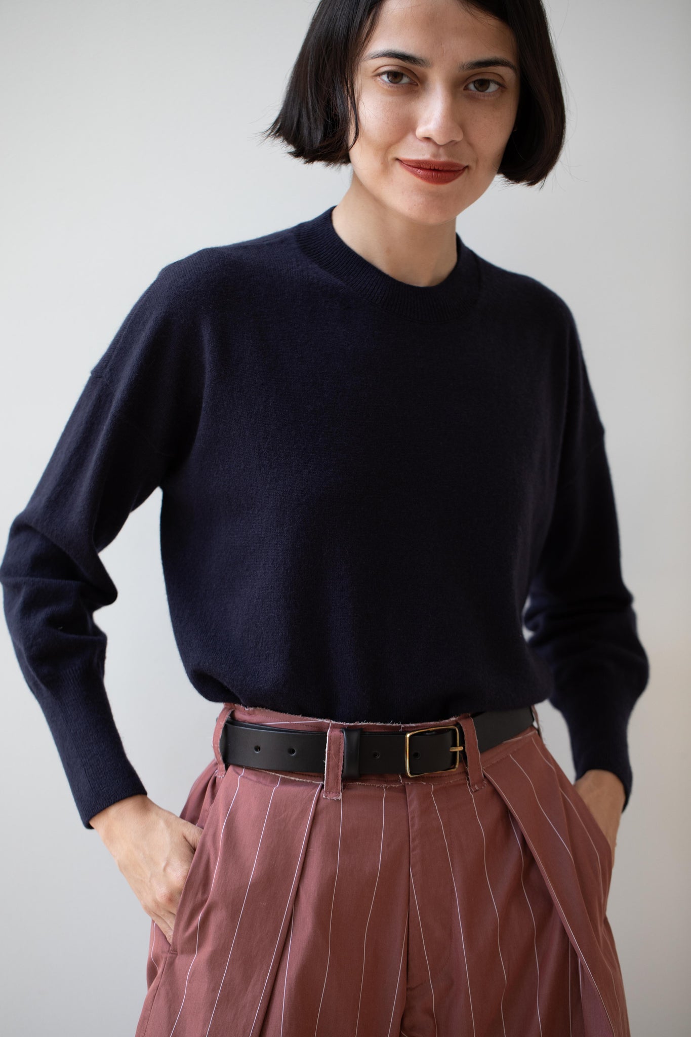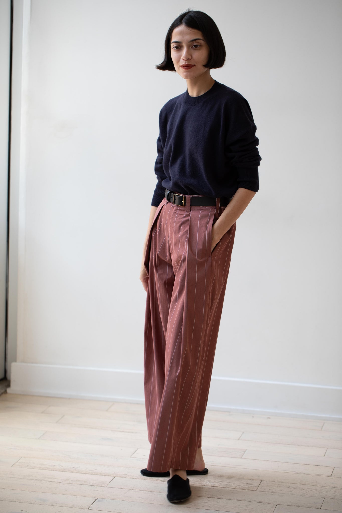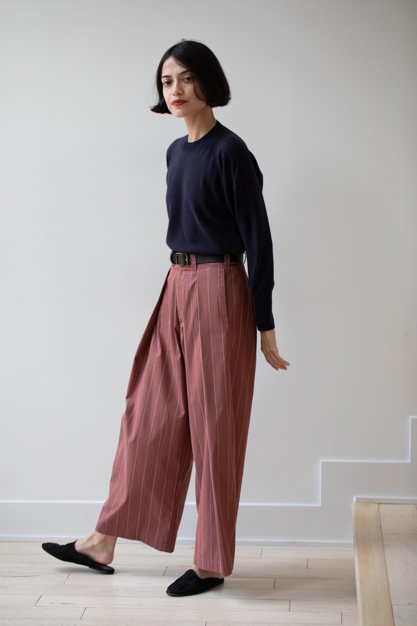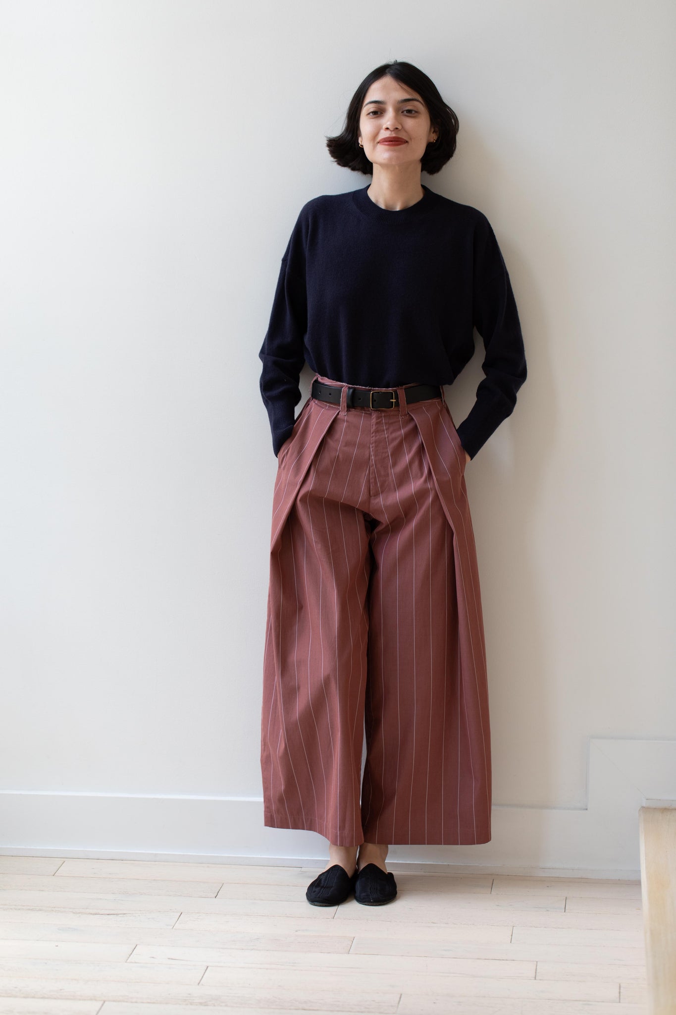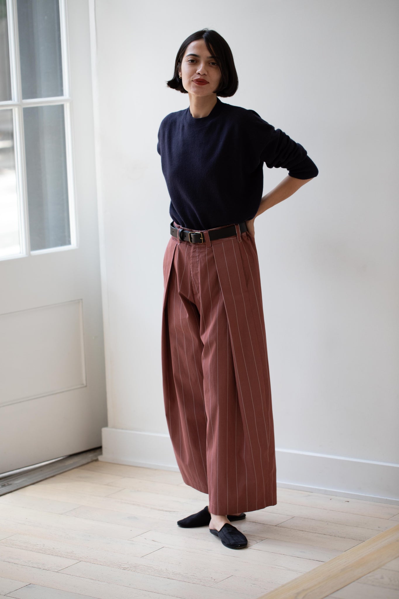 These trousers have an elegant and elongated wide leg.  They have a raw waist band and belt loops, two side pockets and a back pocket too.  Made from a soft yet crisp cotton, the reddish clay color is quite striking and has a thin light pin stripe running through it.